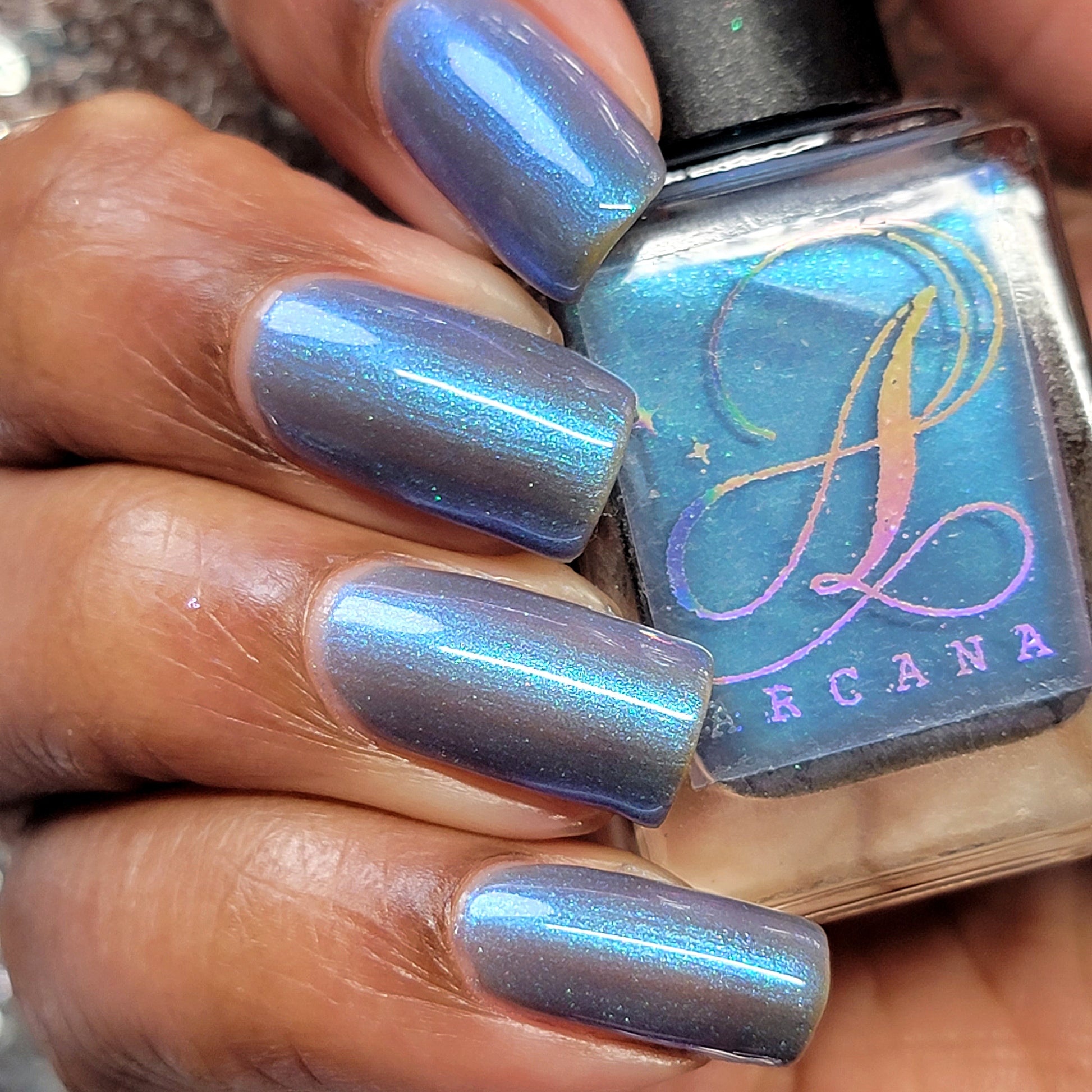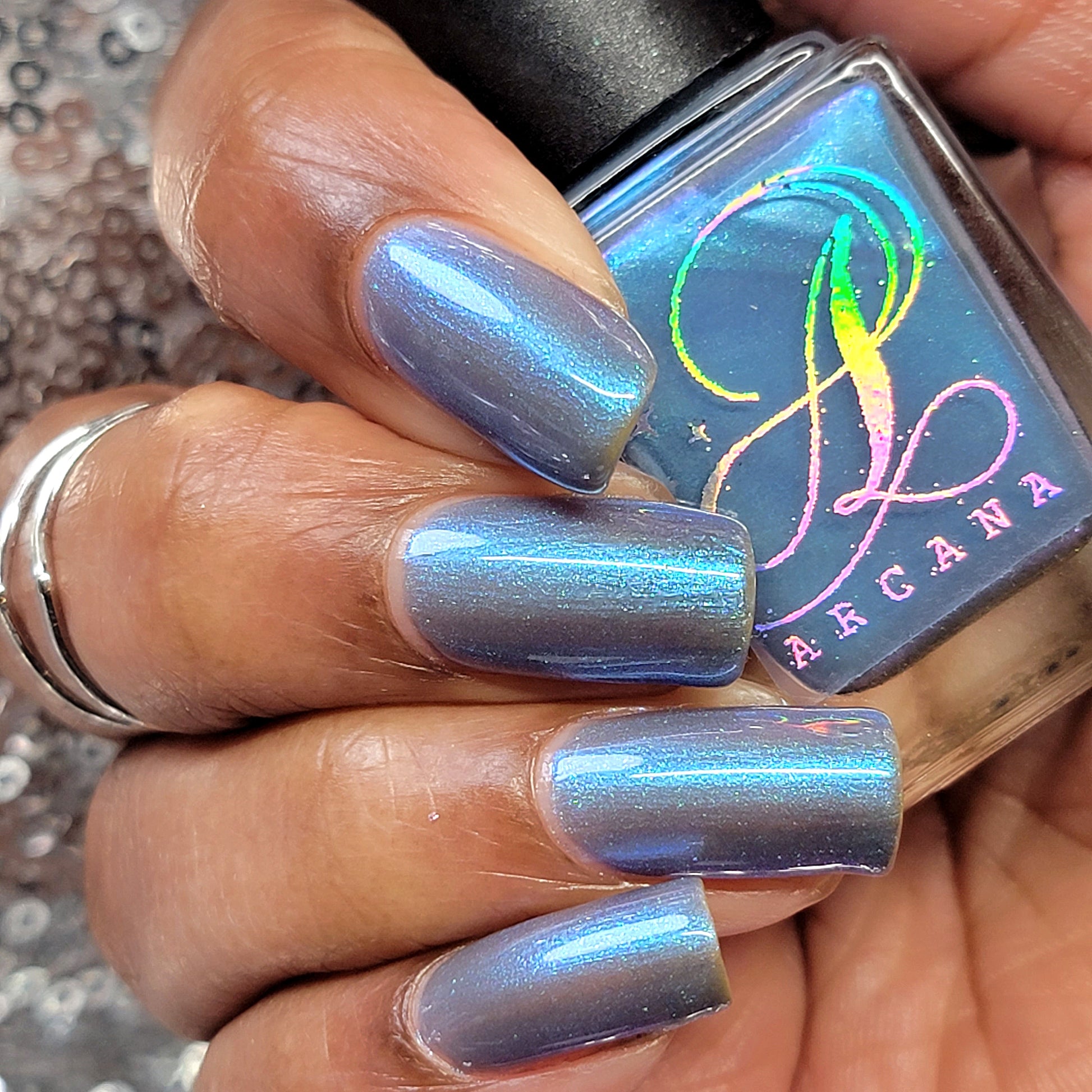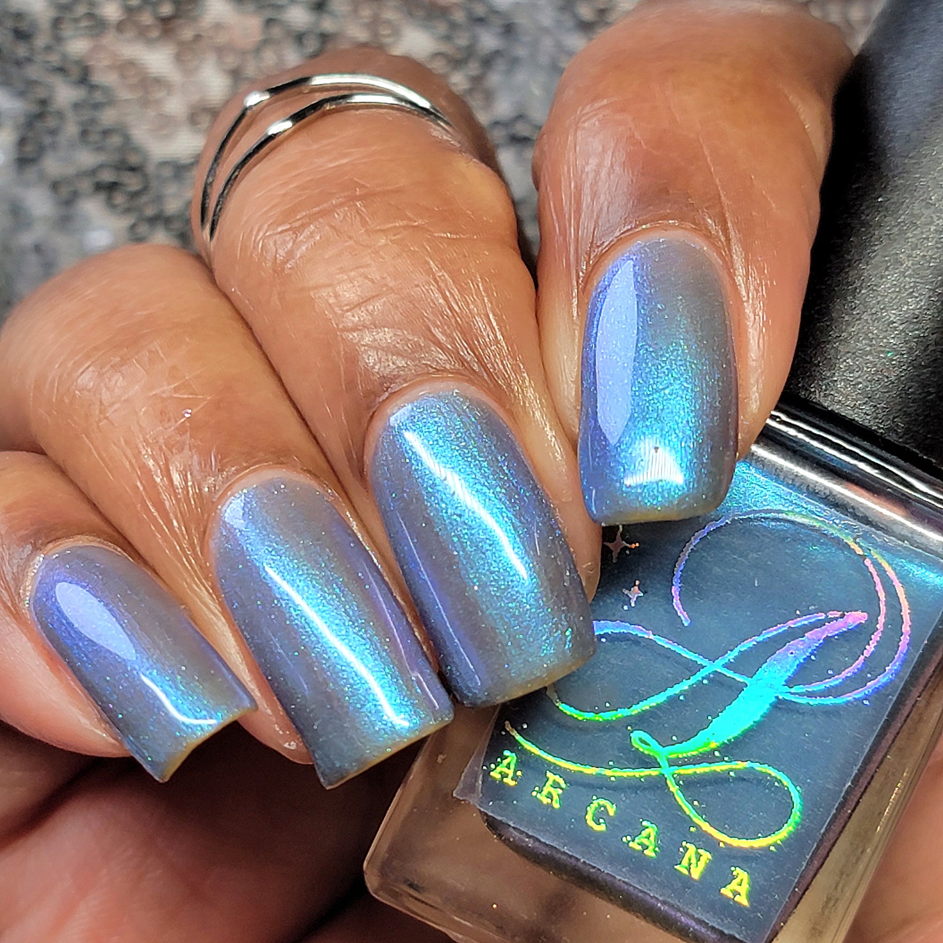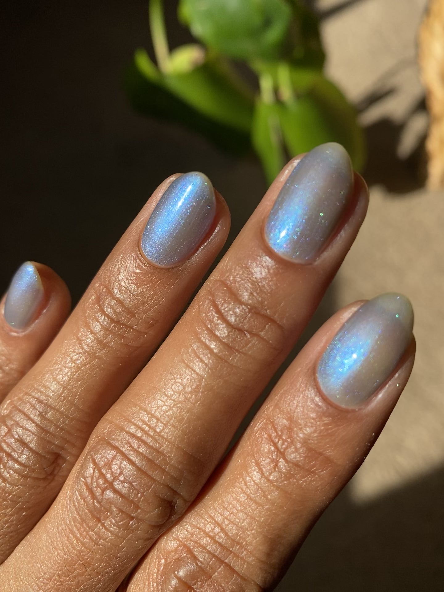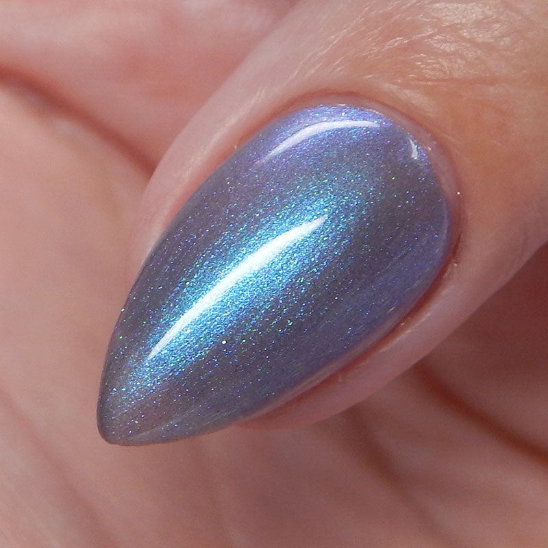Midnight Mist has a gray jelly base with a shifty blue-purple pearl effect that glows bright blue in direct light.