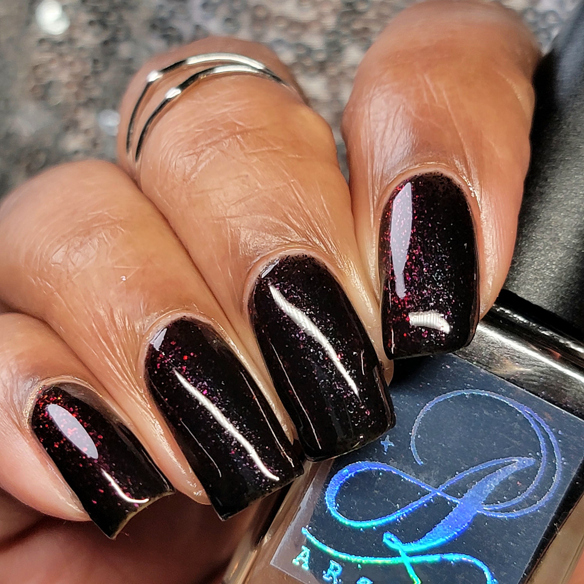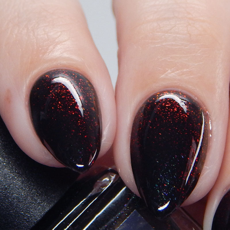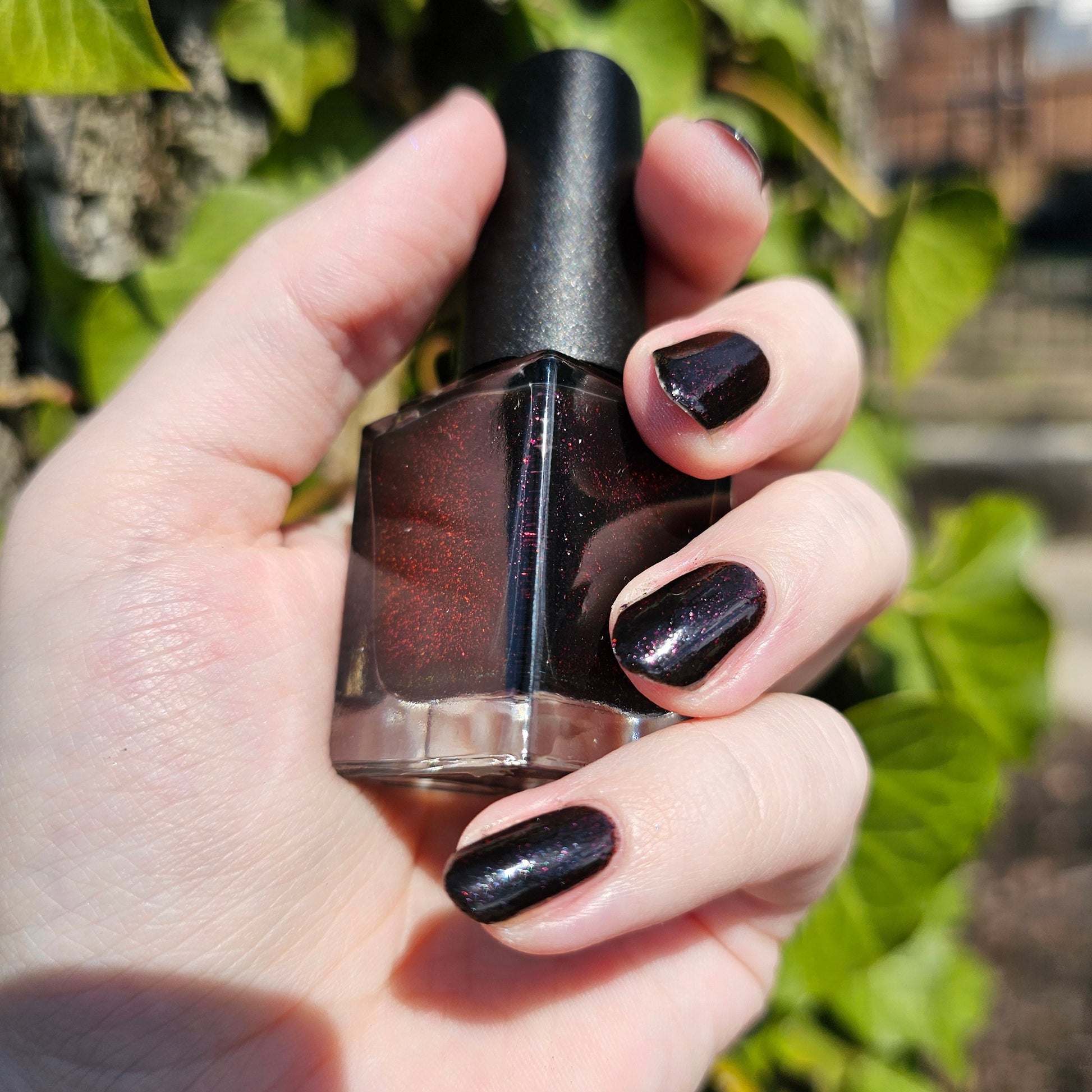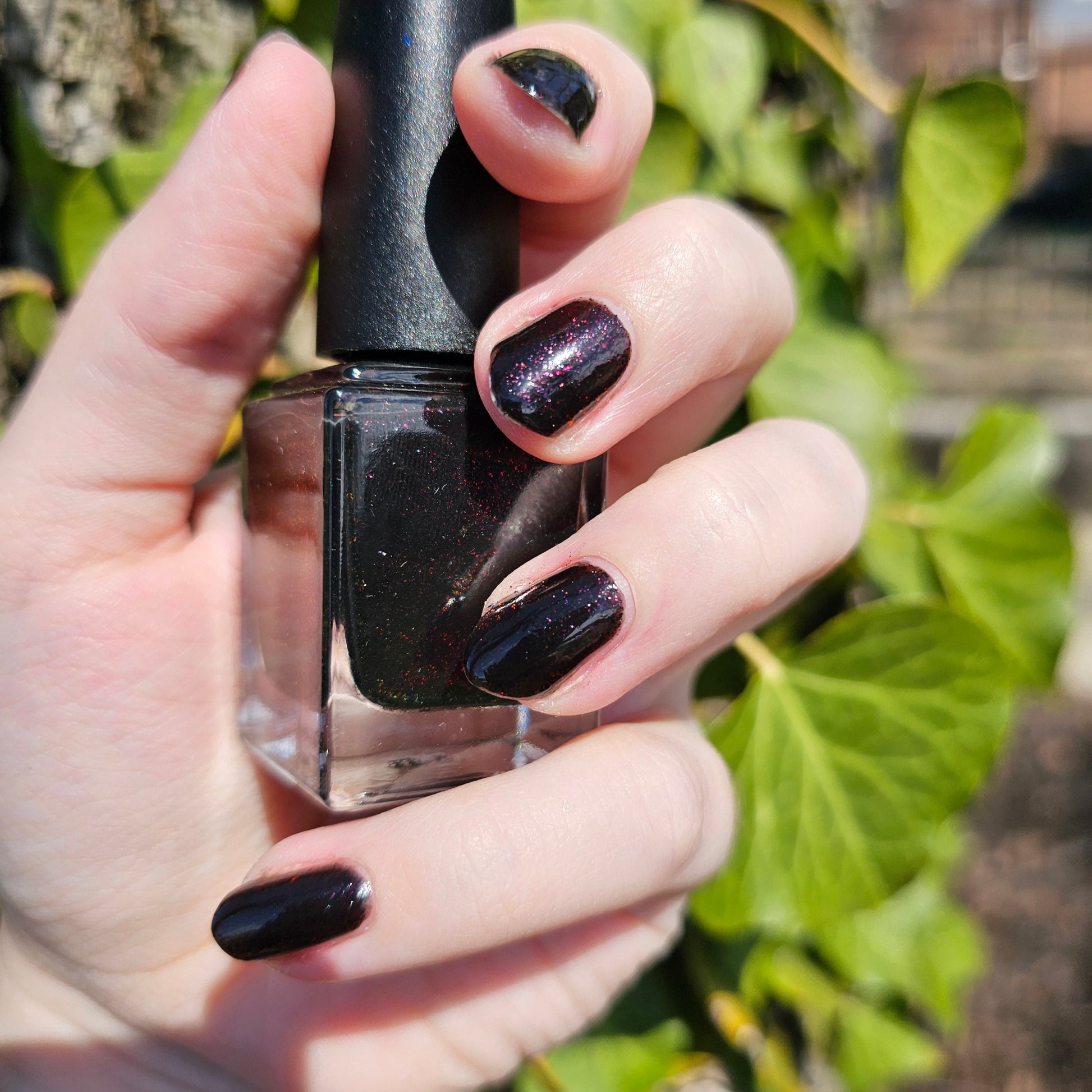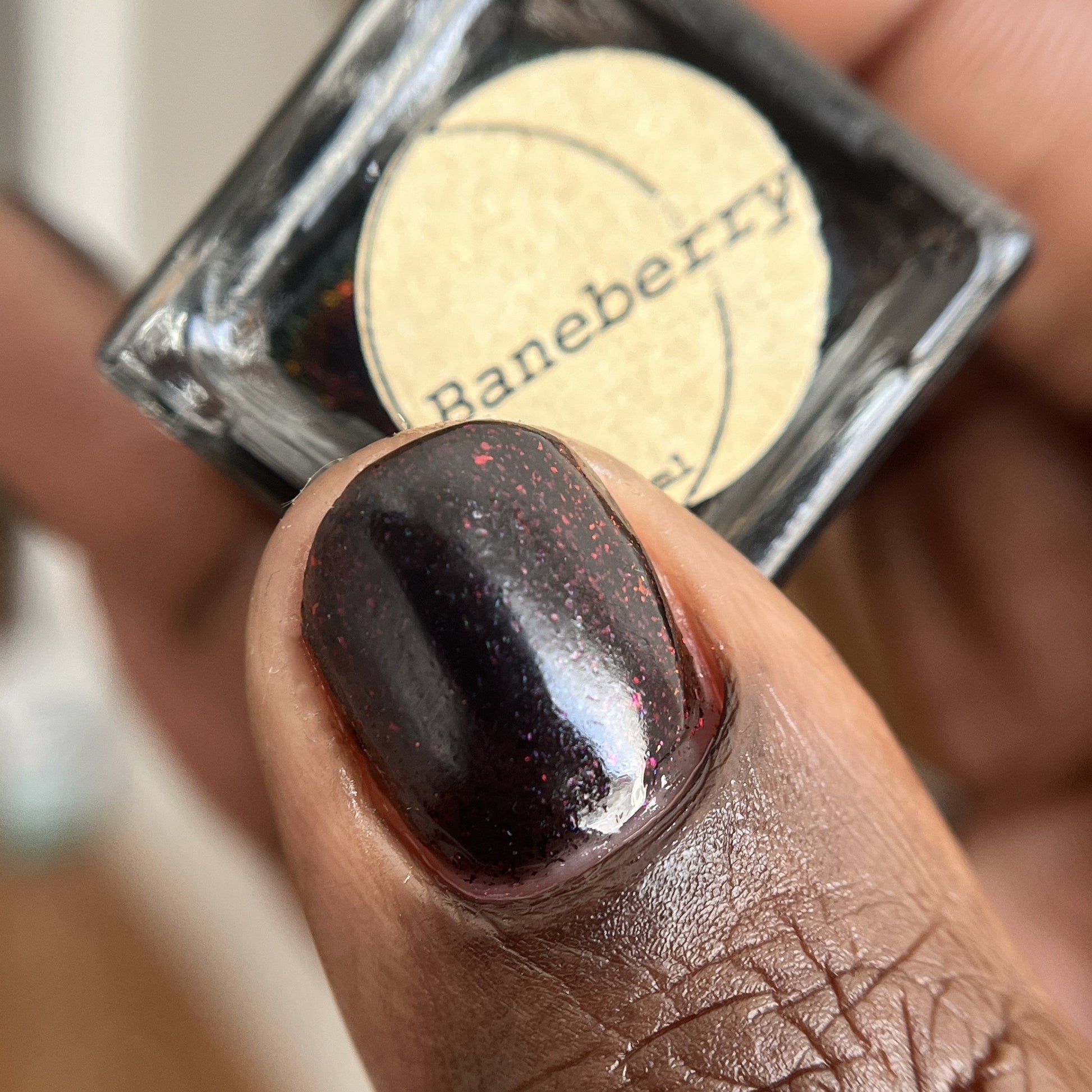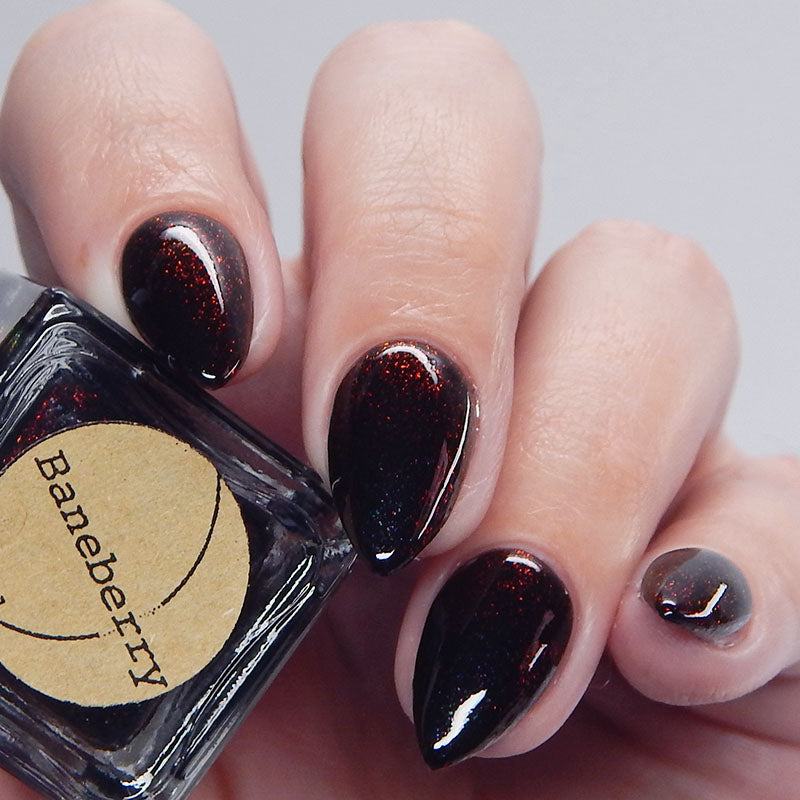 Baneberry features a black jelly base with red to black shimmer. This polish becomes very opaque with only two coats and creates a hidden sparkle of red in direct light and when held at an angle.