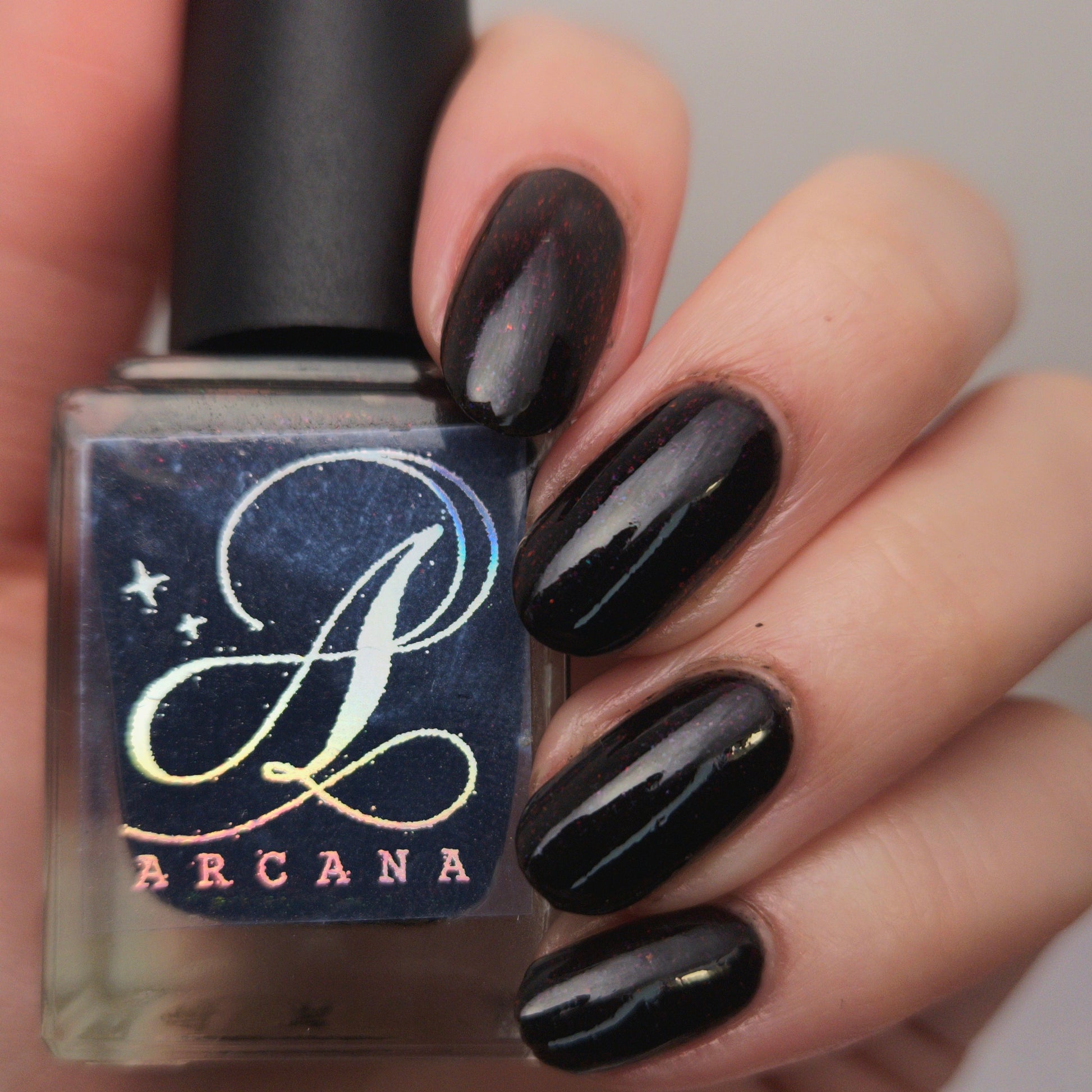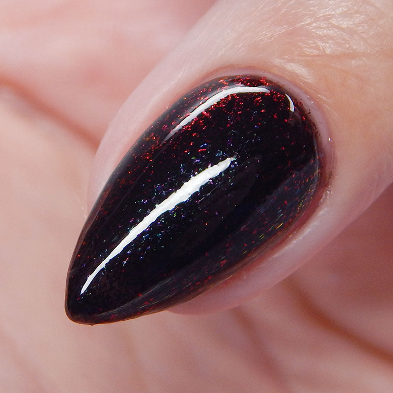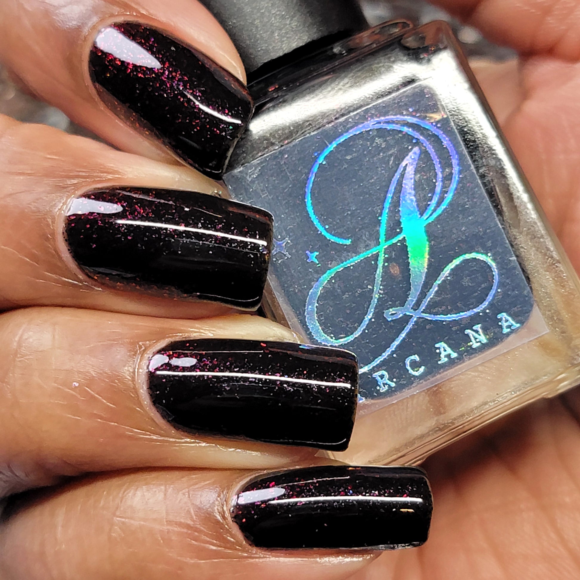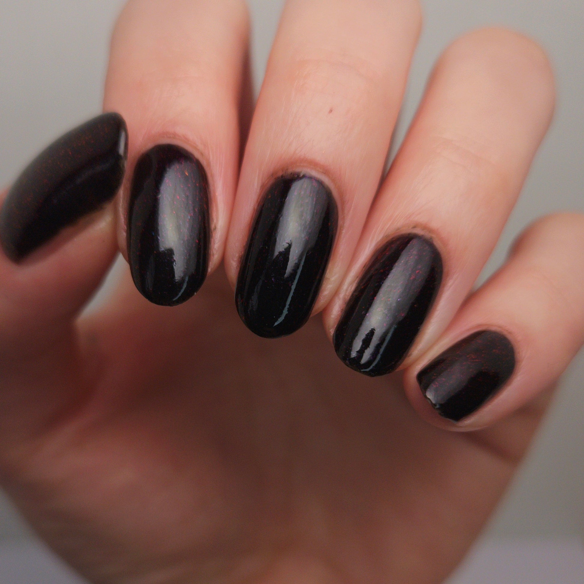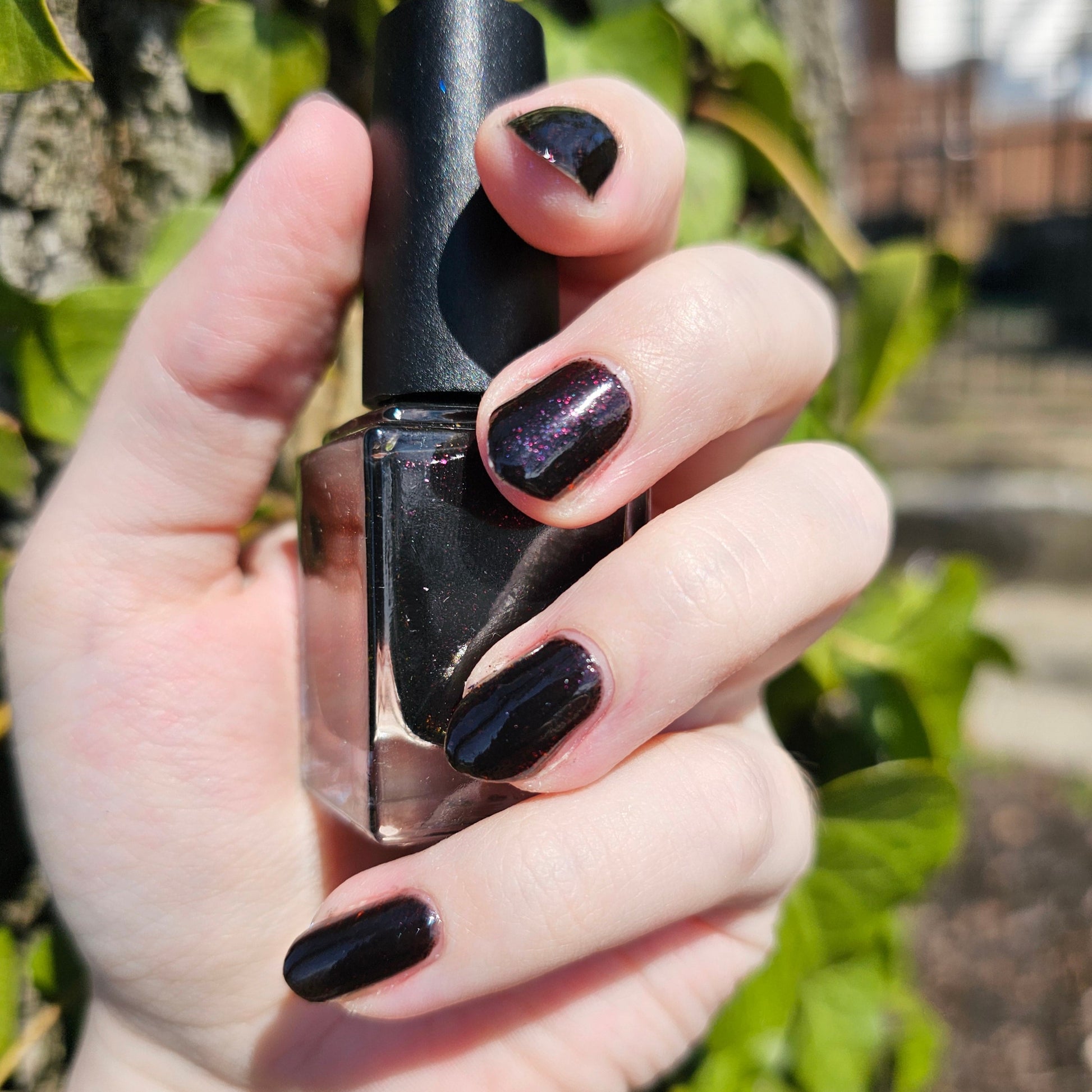 Baneberry features a black jelly base with red to black shimmer. This polish becomes very opaque with only two coats and creates a hidden sparkle of red in direct light and when held at an angle.