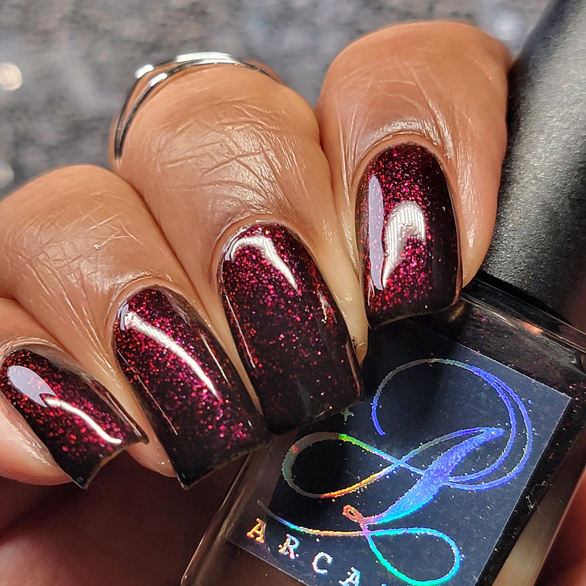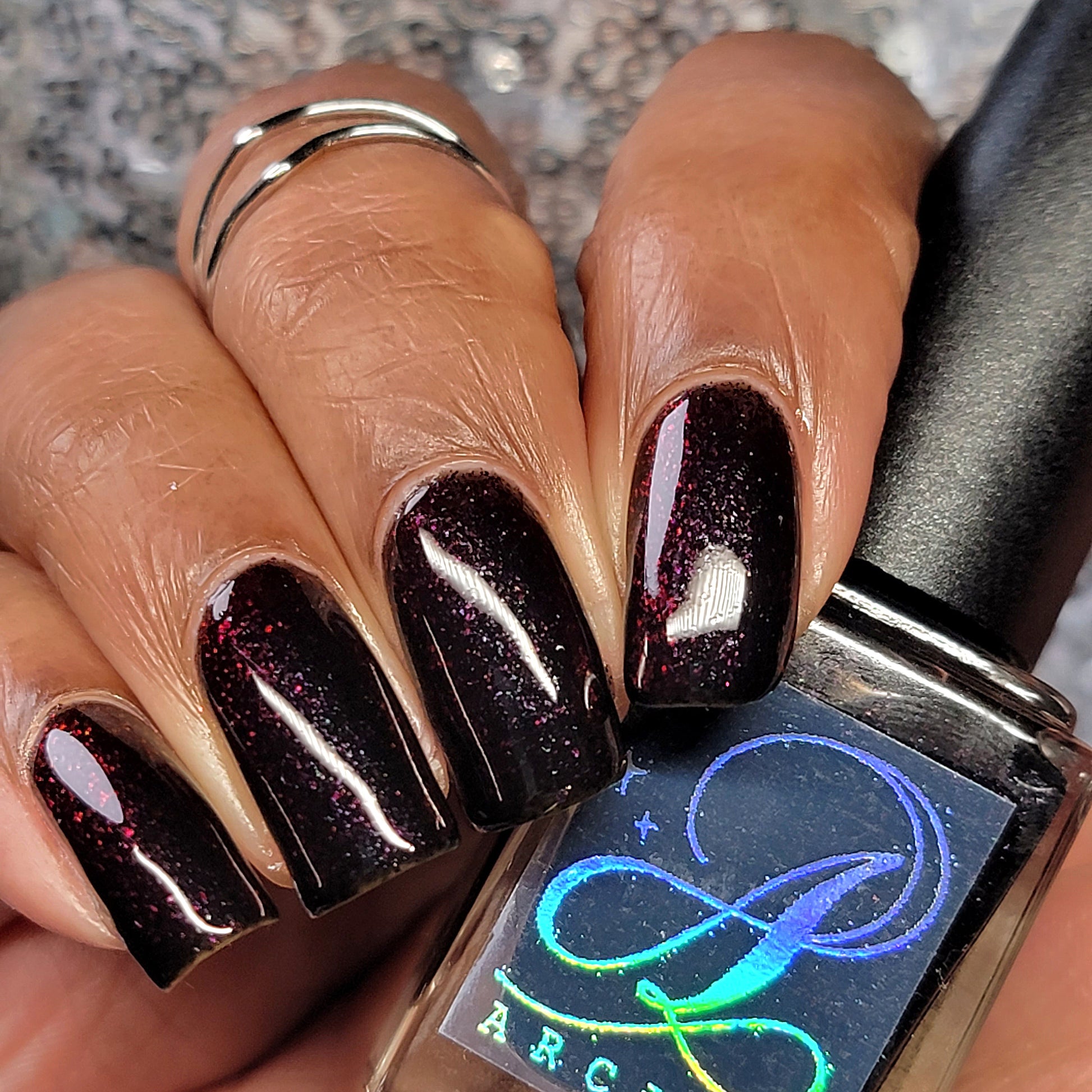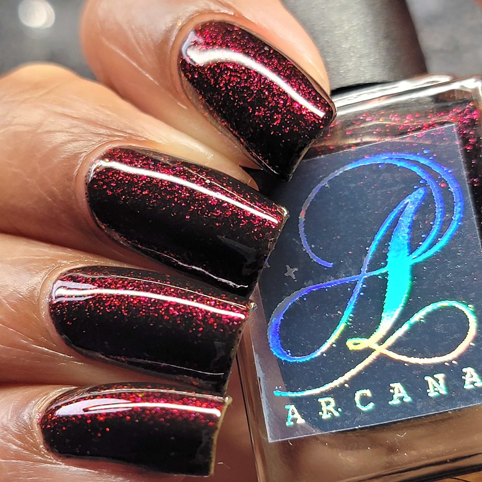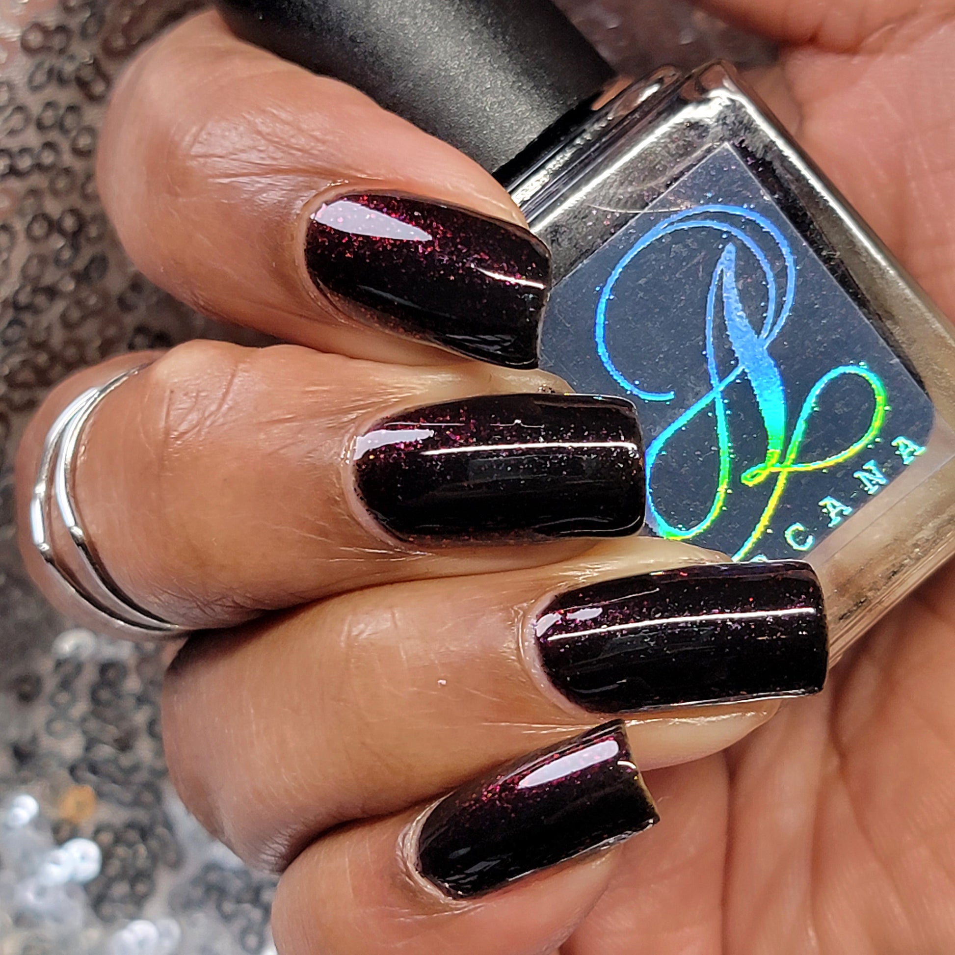 Baneberry features a black jelly base with red to black shimmer. This polish becomes very opaque with only two coats and creates a hidden sparkle of red in direct light and when held at an angle.