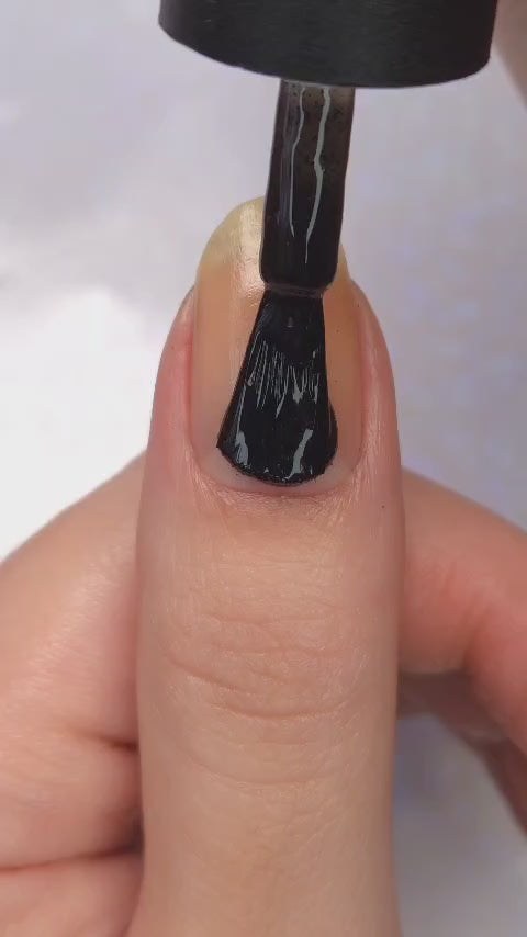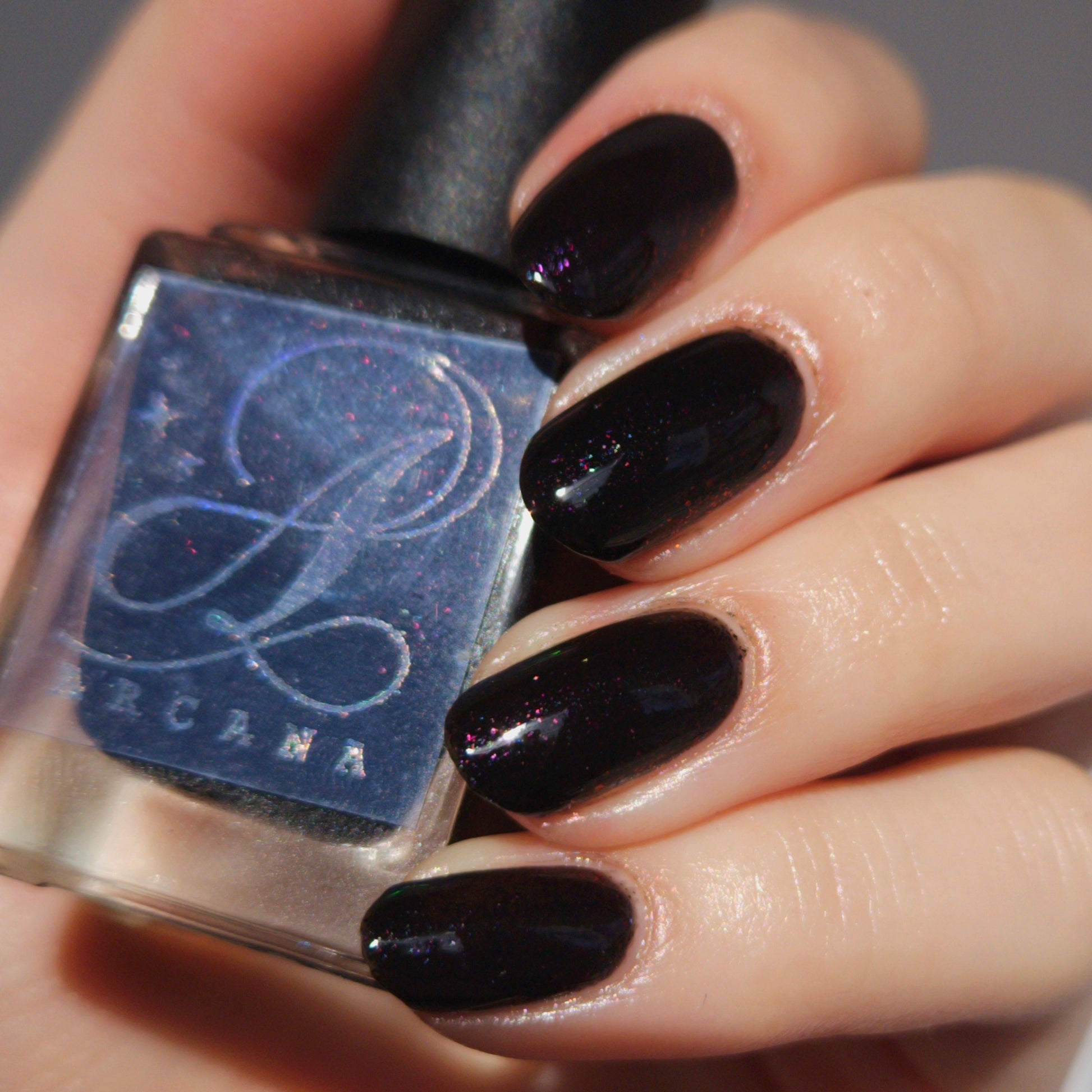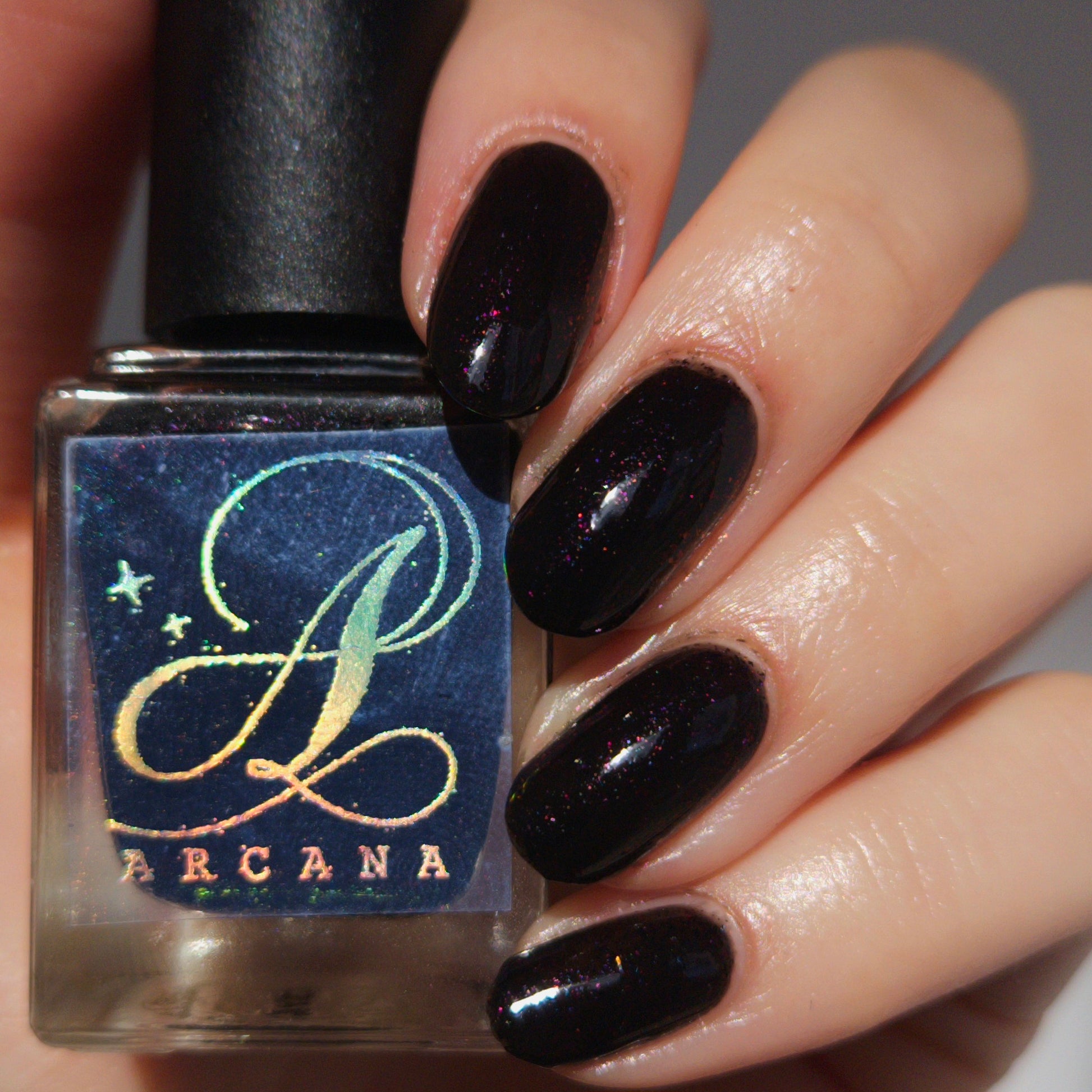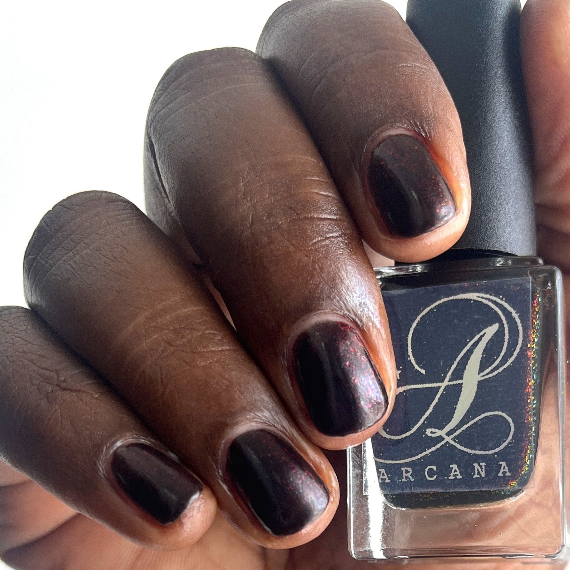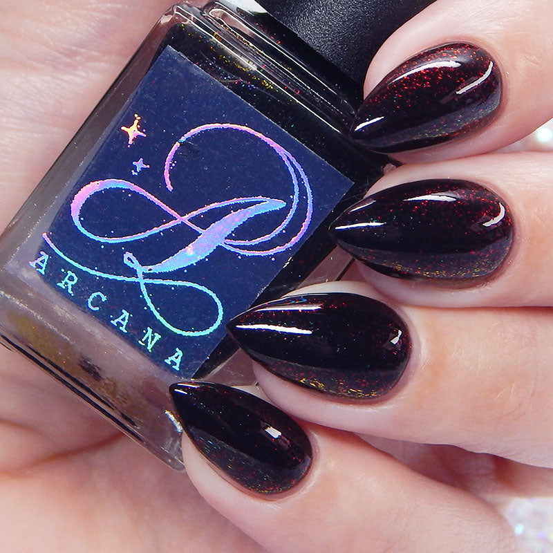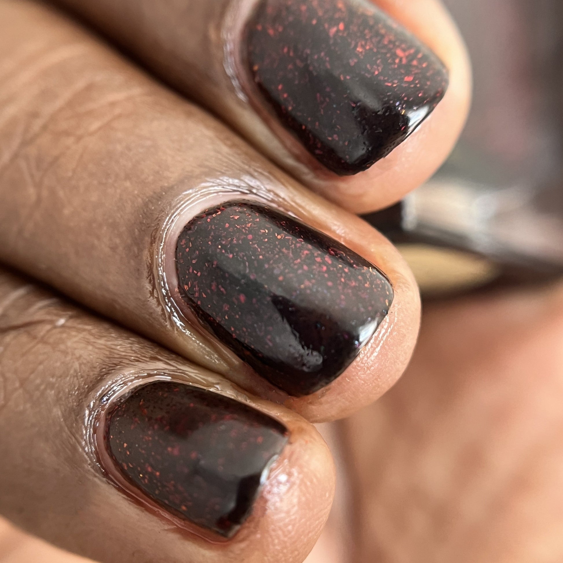Baneberry features a black jelly base with red to black shimmer. This polish becomes very opaque with only two coats and creates a hidden sparkle of red in direct light and when held at an angle.