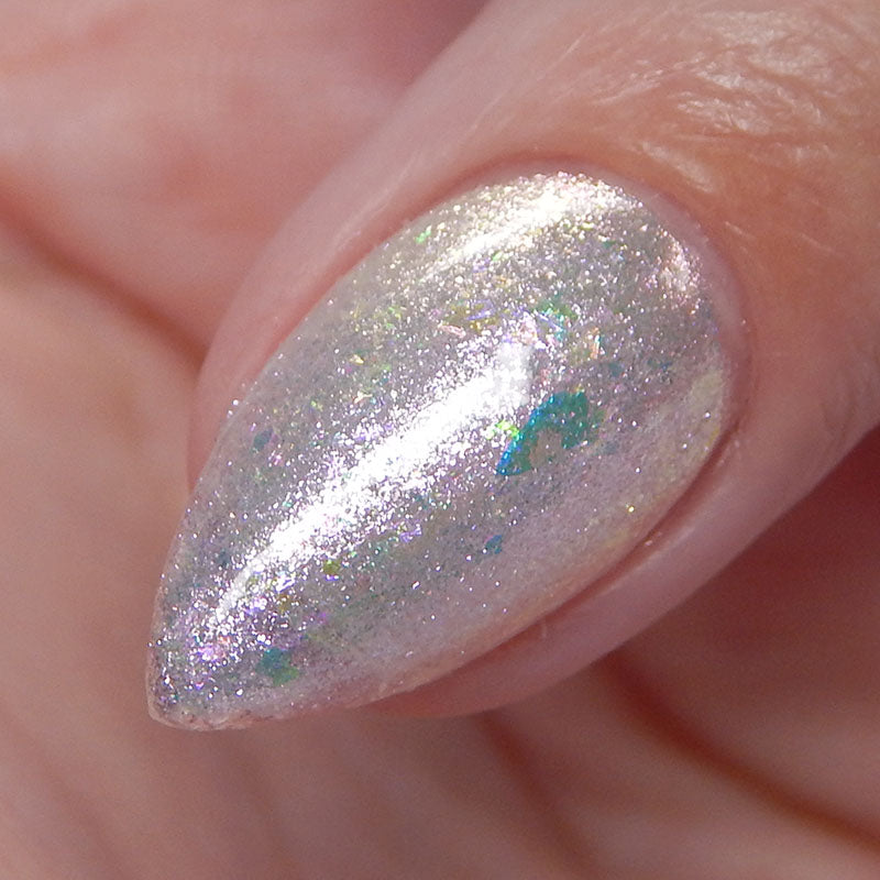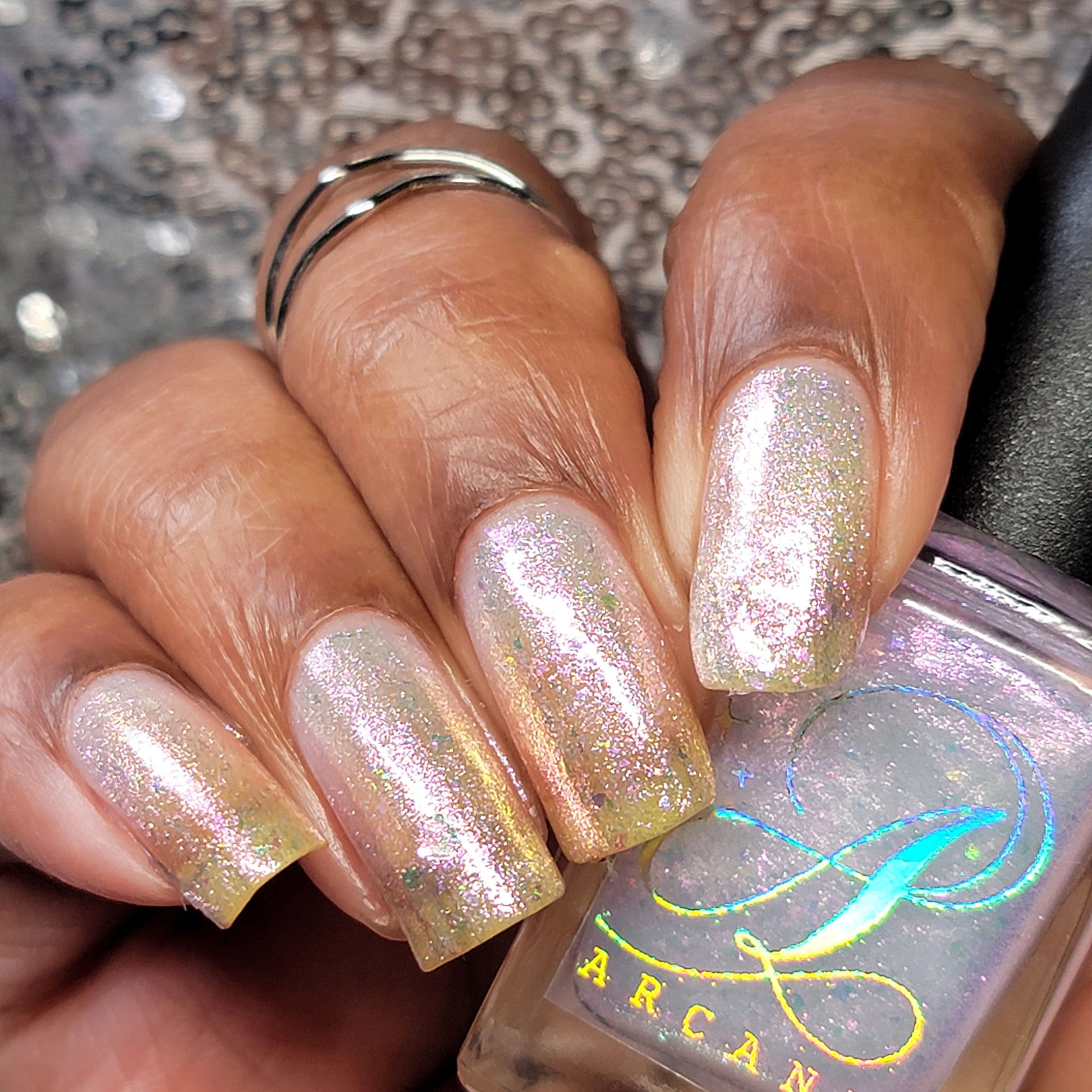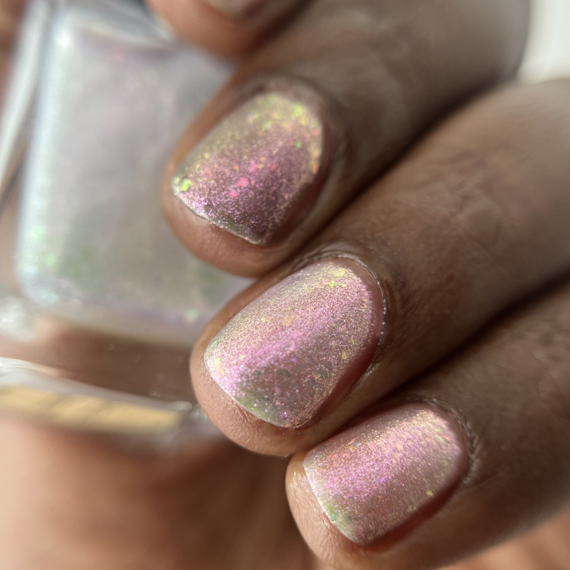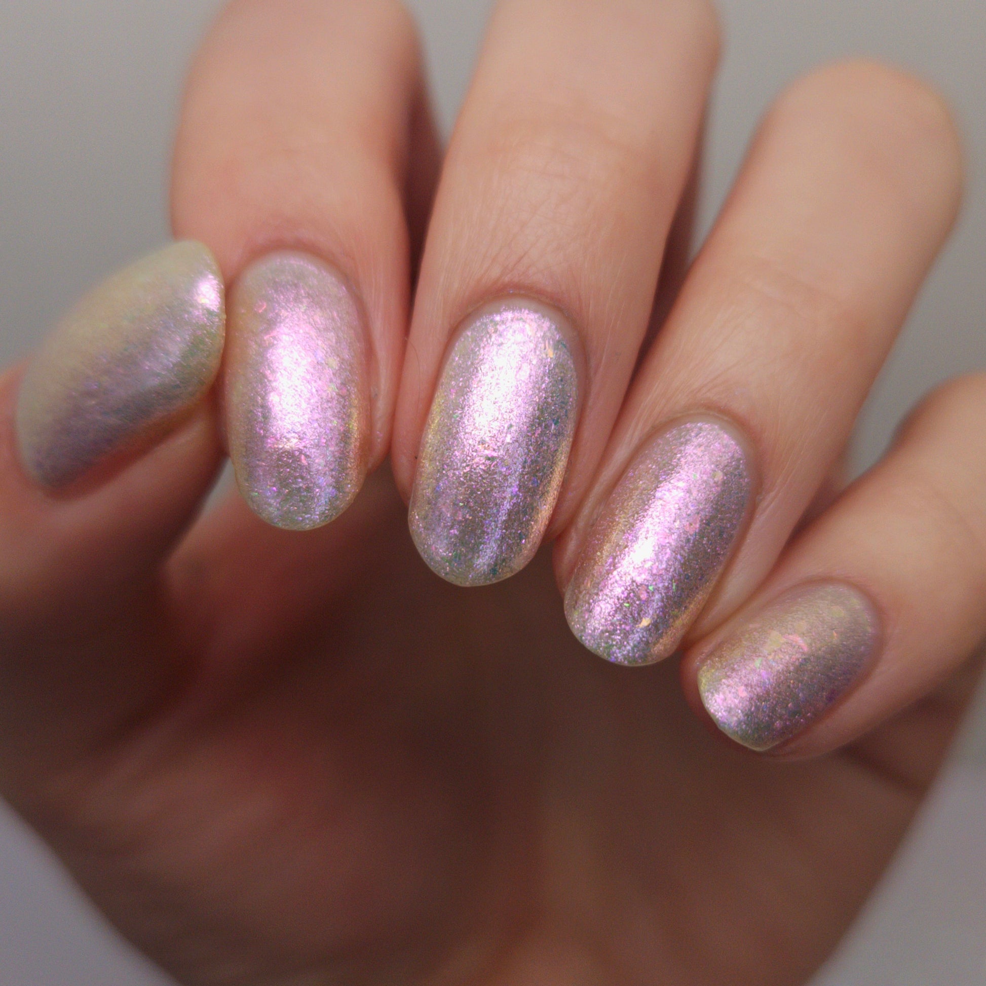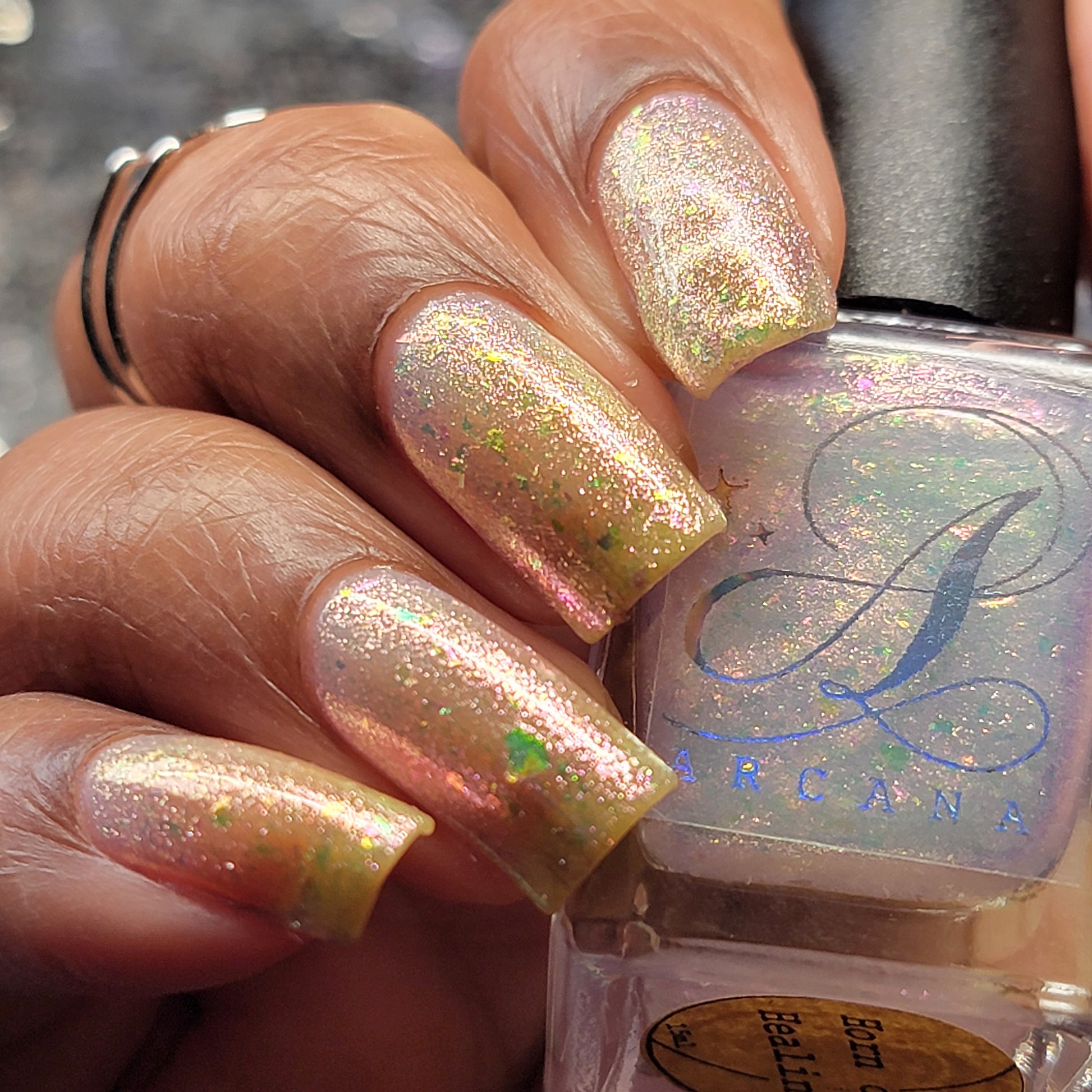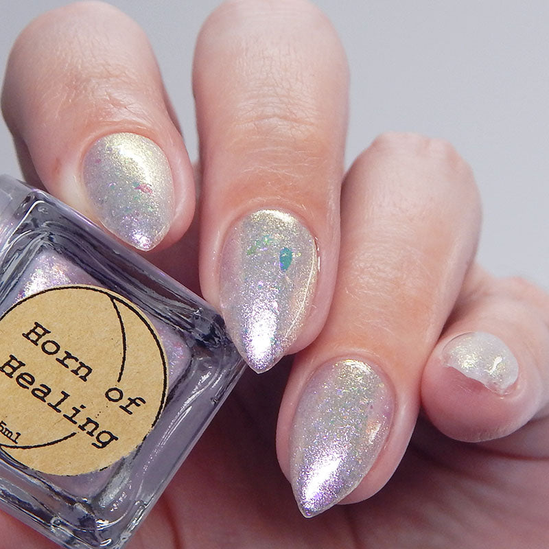Horn of Healing features a clear base with small iridescent flakies and pink to gold shimmer. This polish can be worn in three coats on its own or as a topper in one coat!
