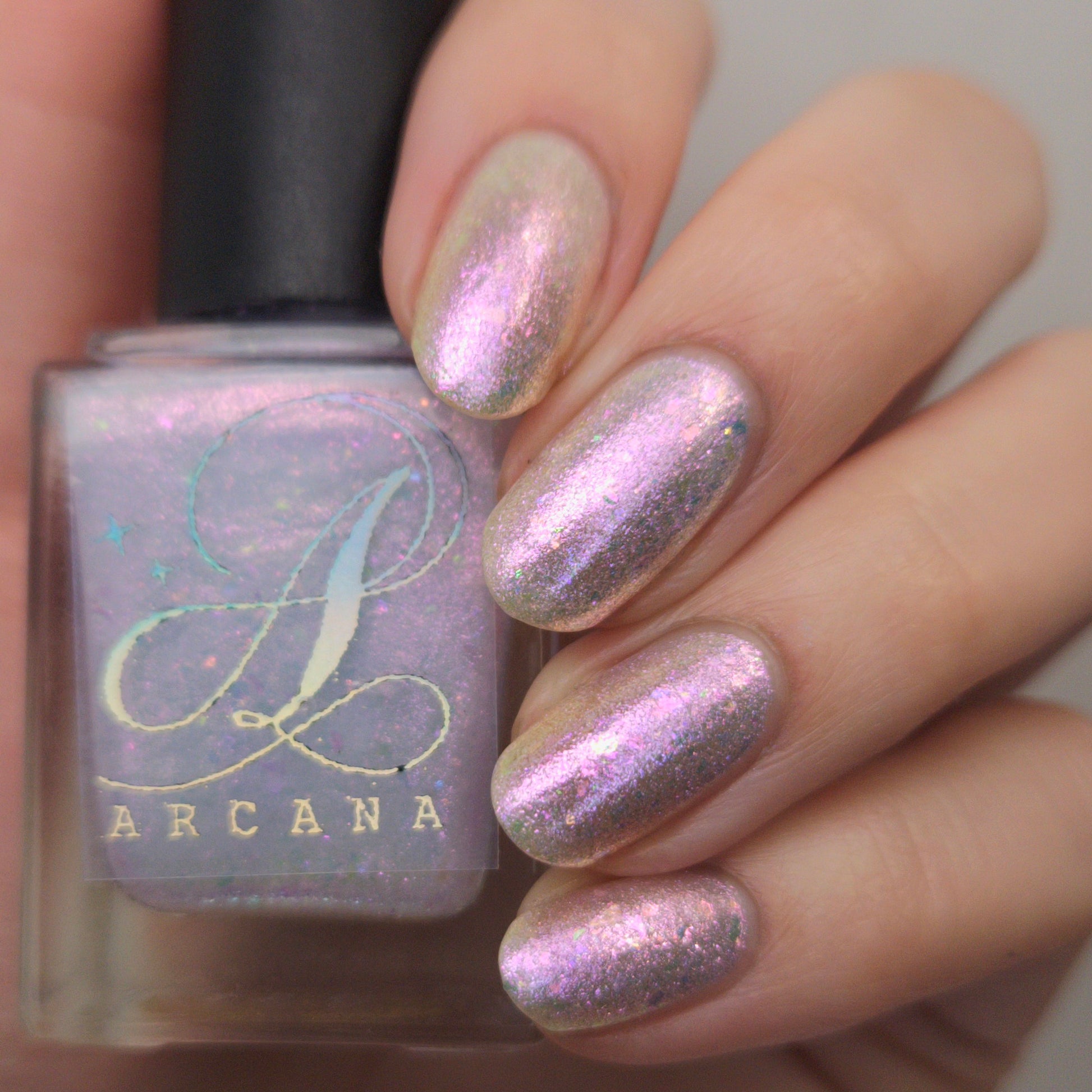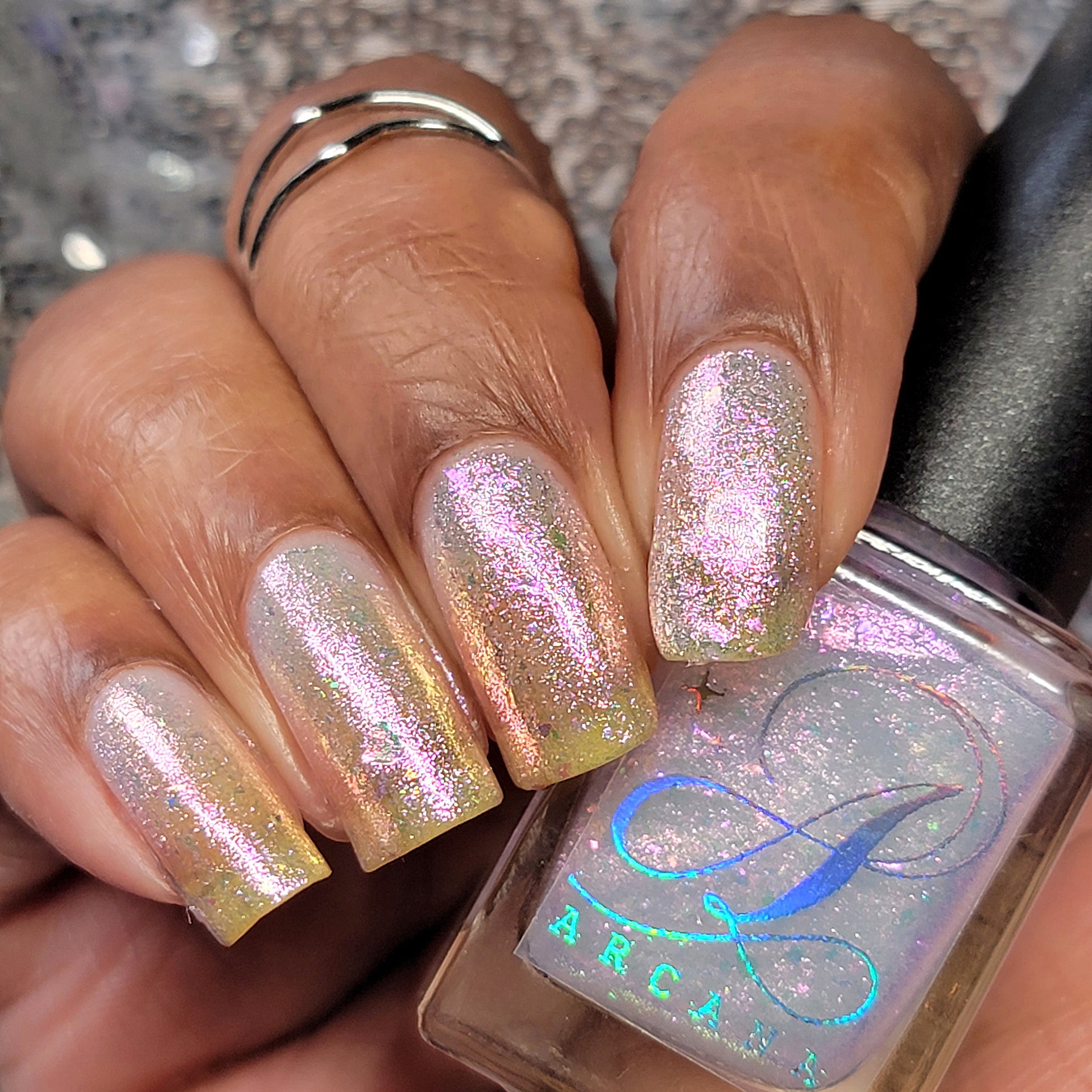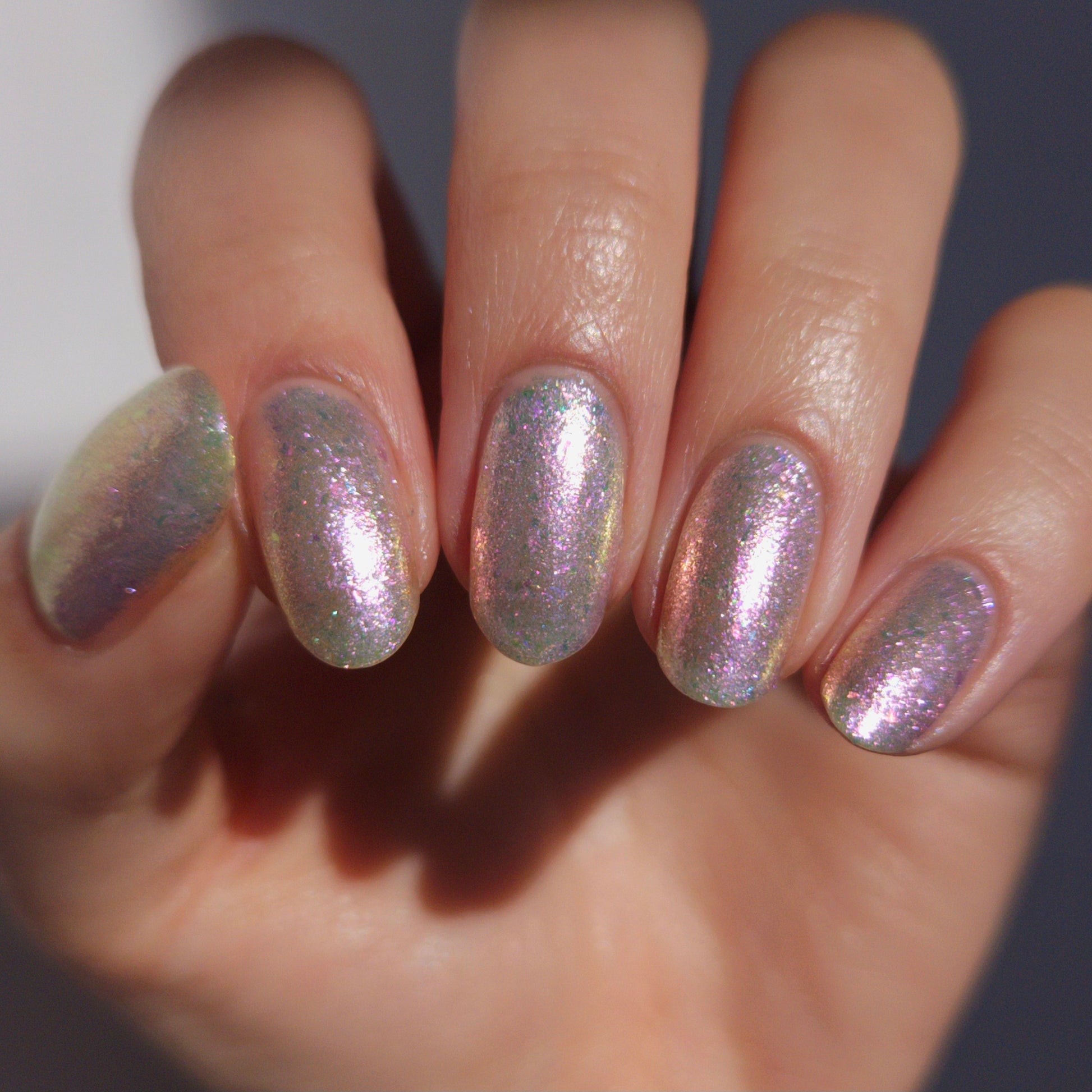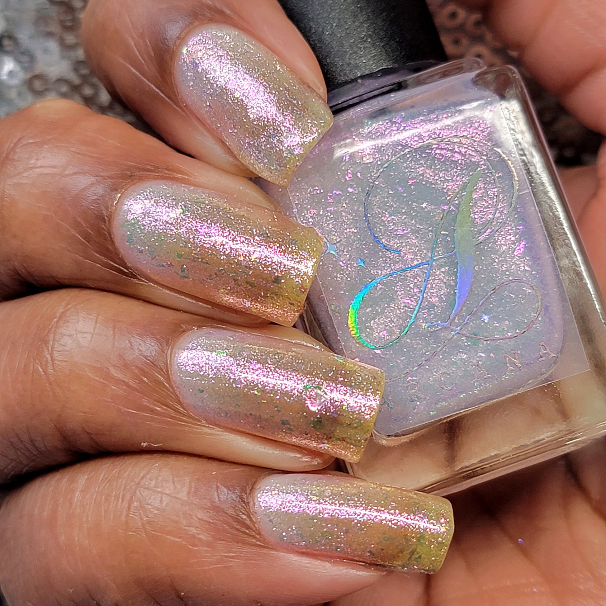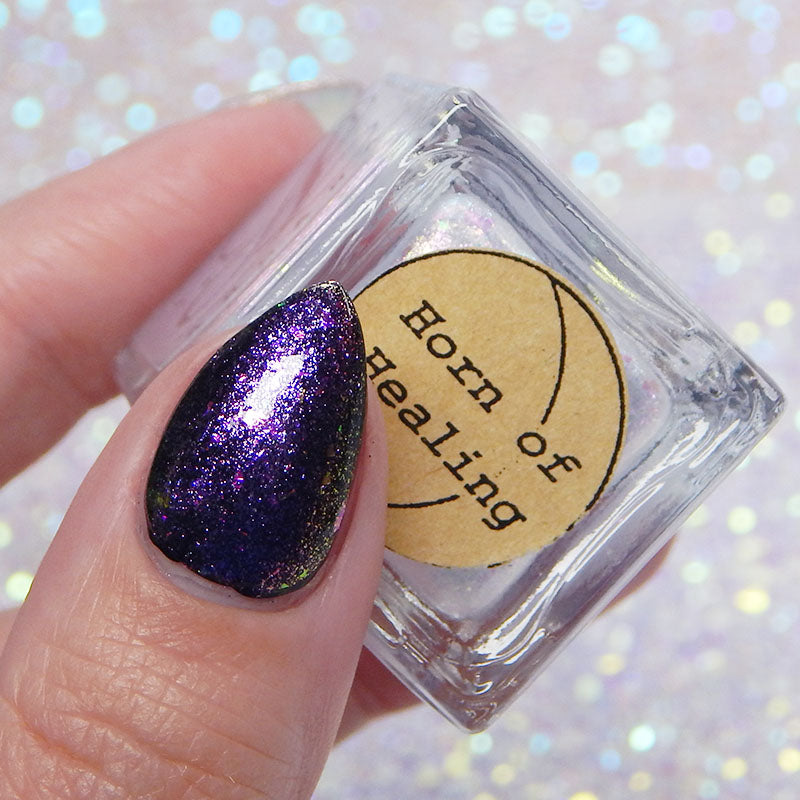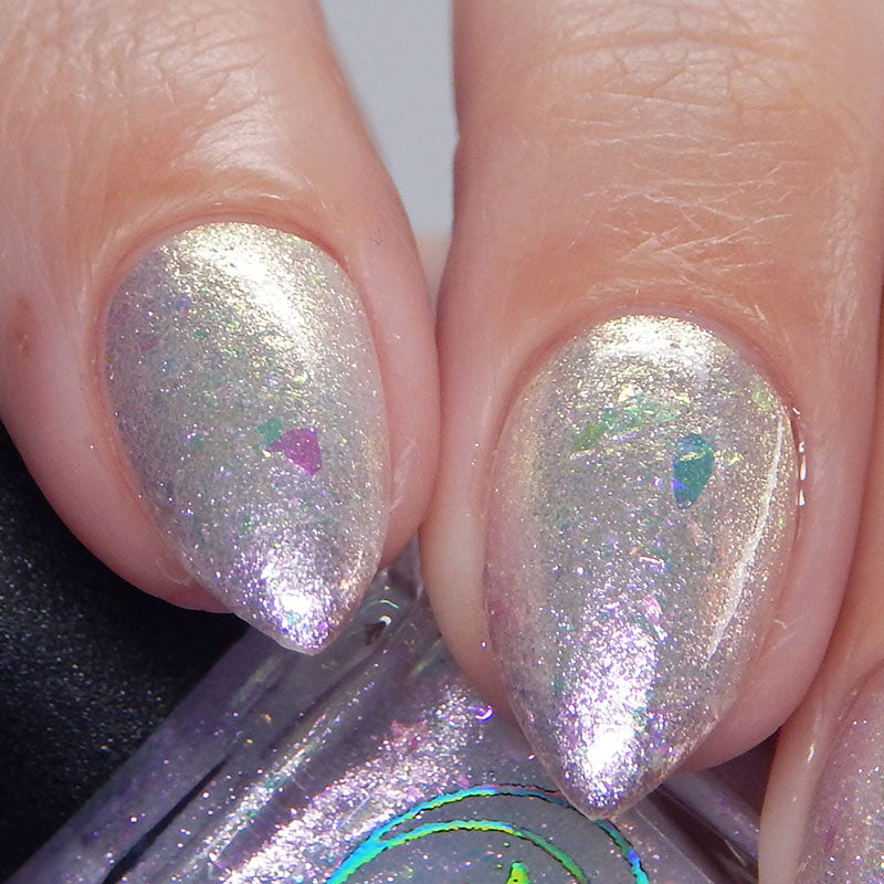 Horn of Healing features a clear base with small iridescent flakies and pink to gold shimmer. This polish can be worn in three coats on its own or as a topper in one coat!