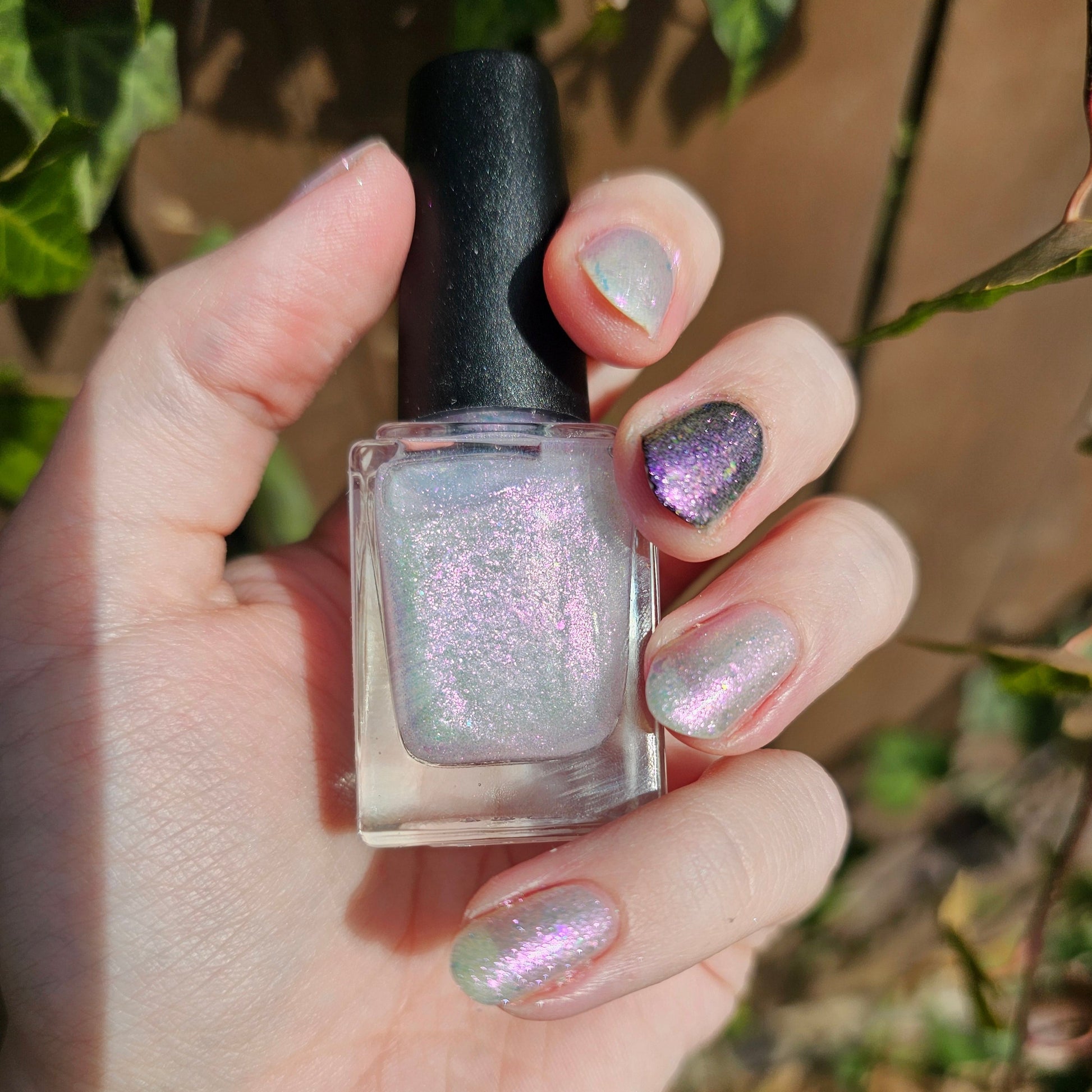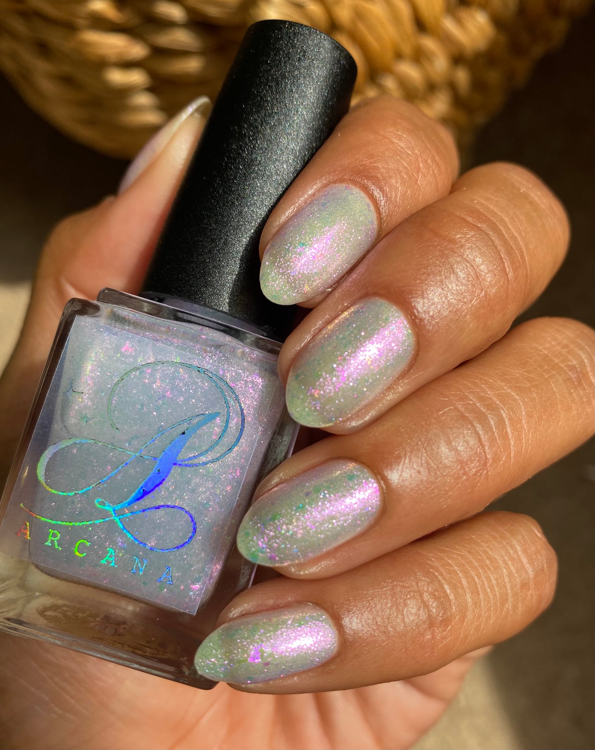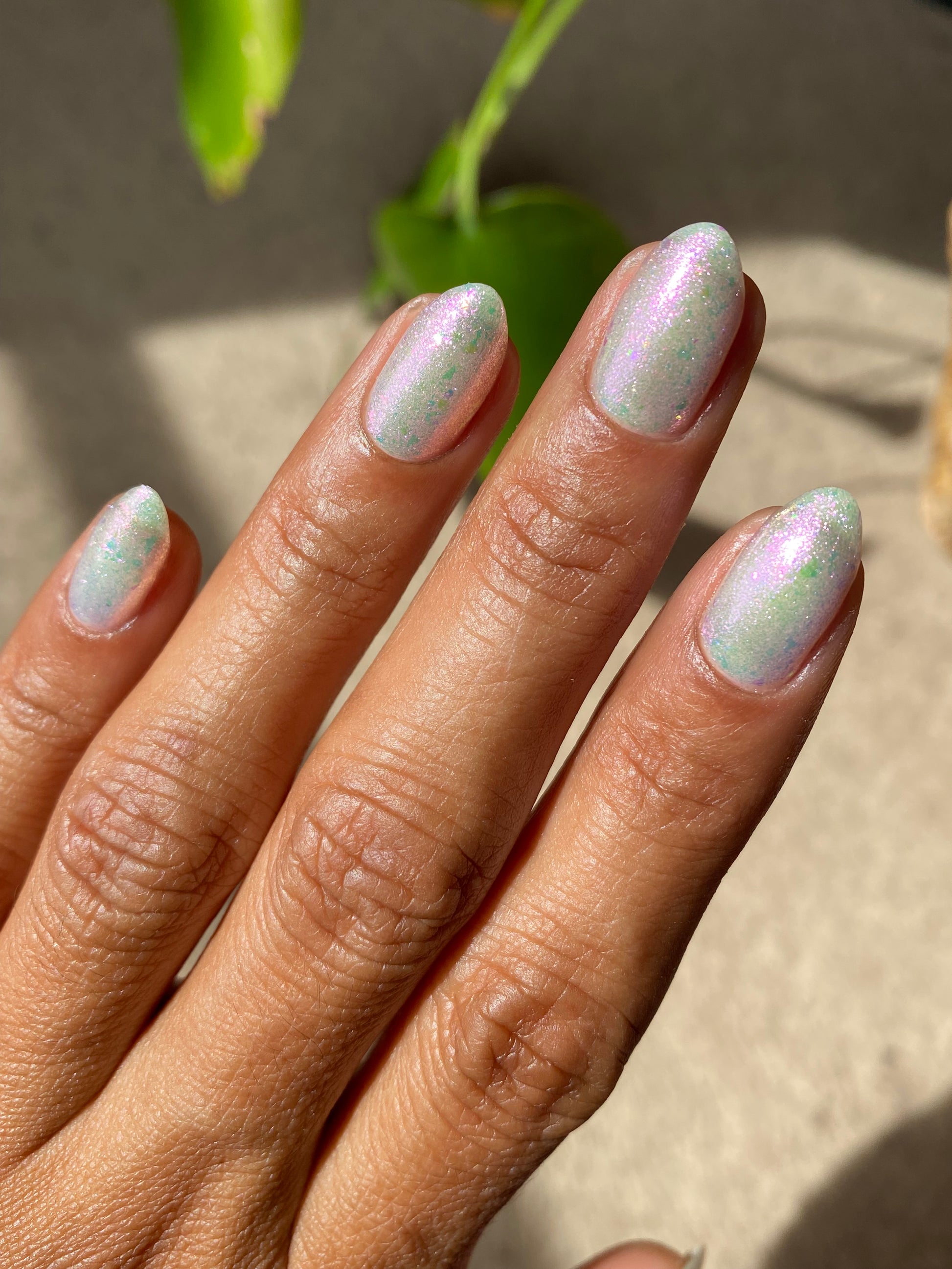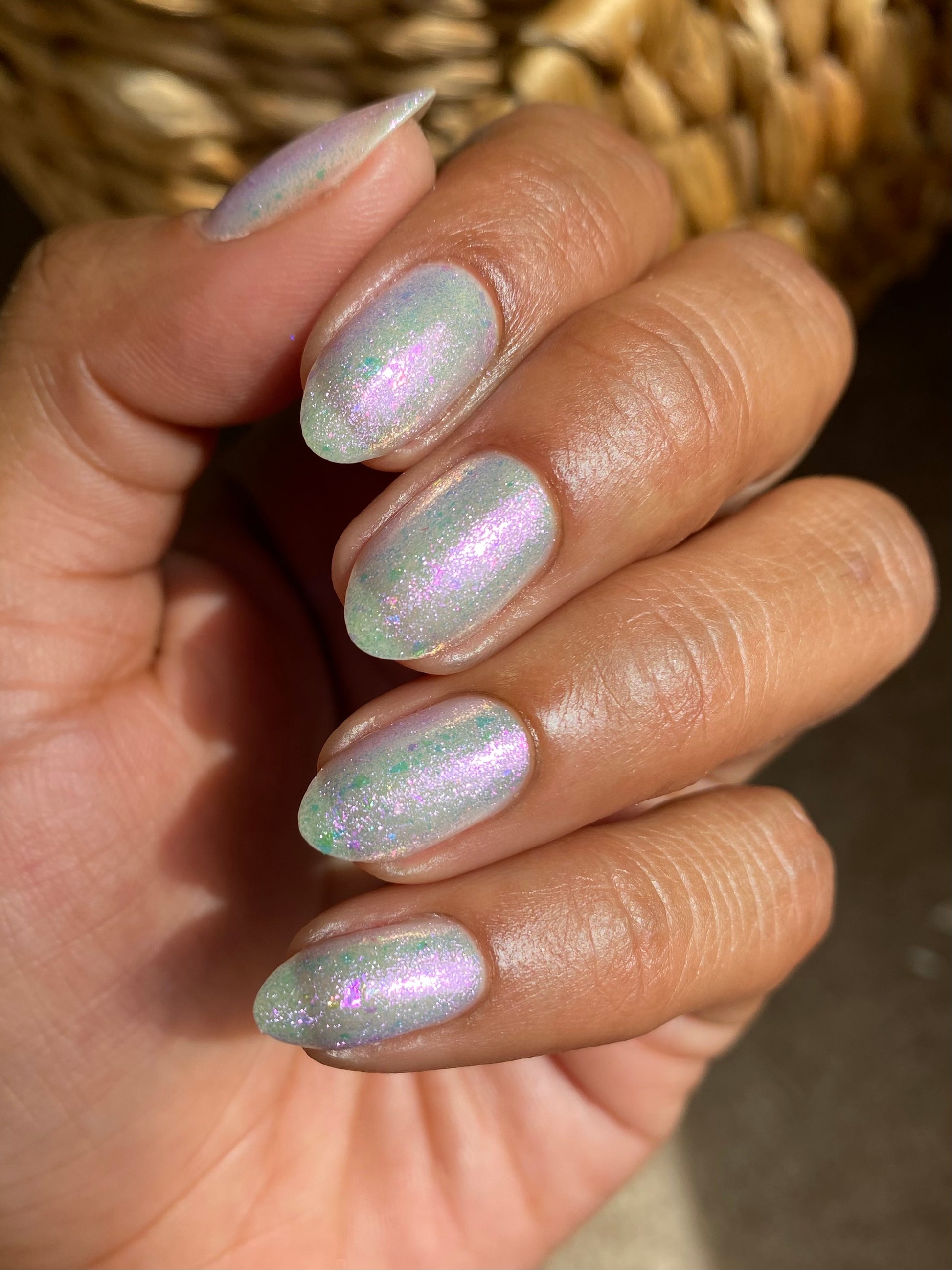 Horn of Healing features a clear base with small iridescent flakies and pink to gold shimmer. This polish can be worn in three coats on its own or as a topper in one coat!