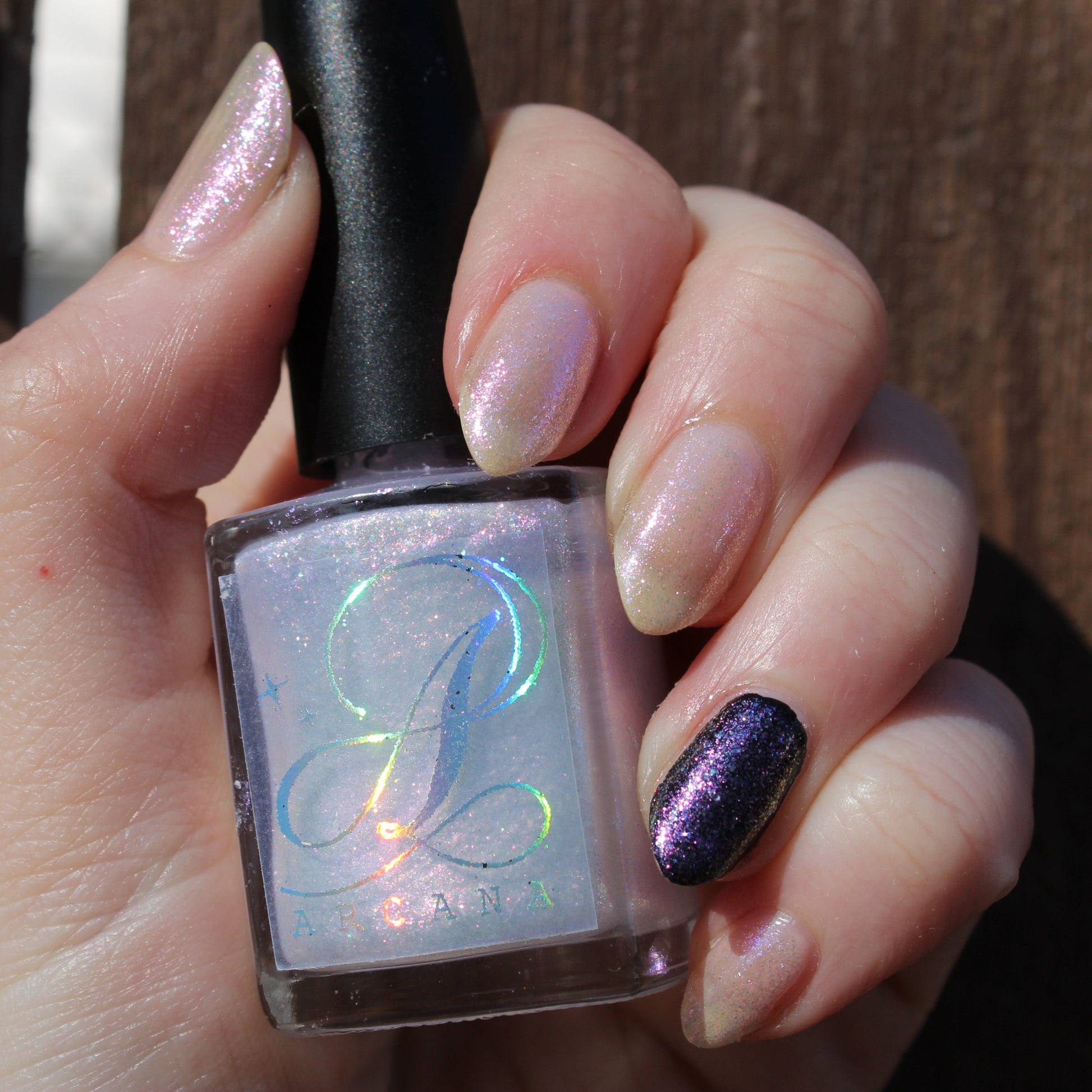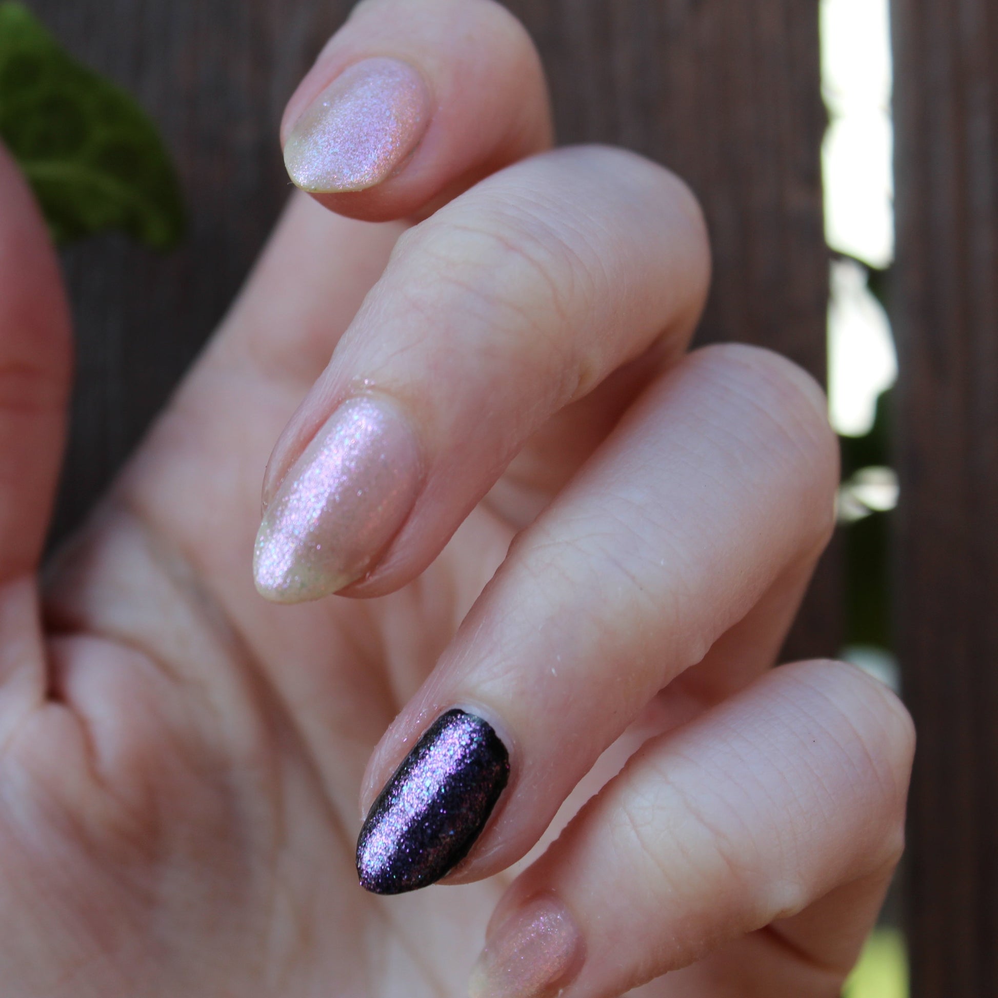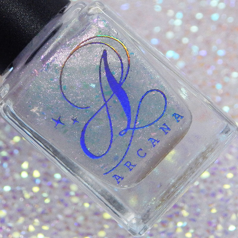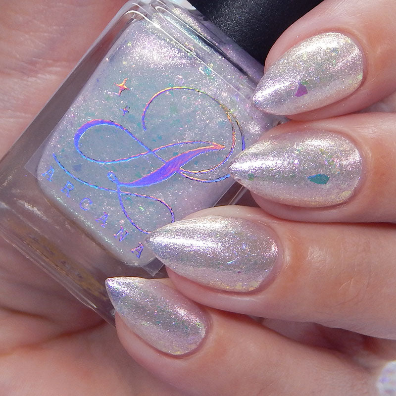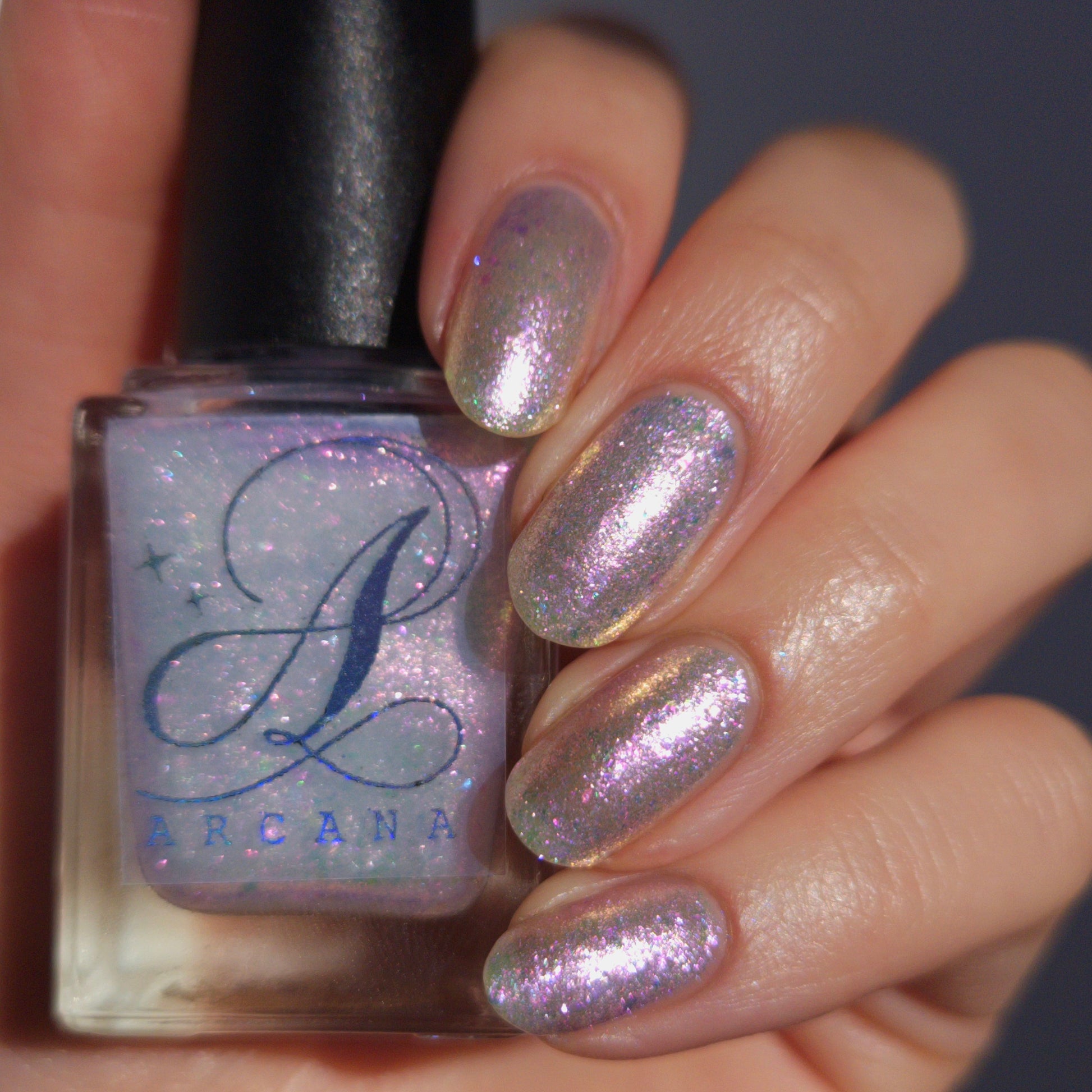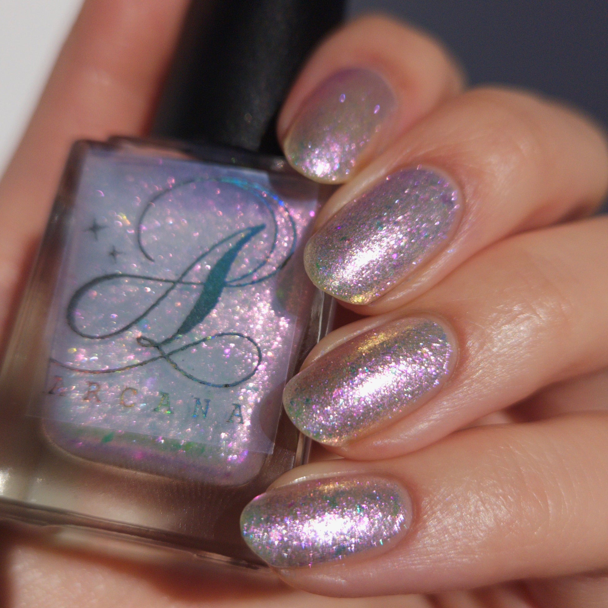 Horn of Healing features a clear base with small iridescent flakies and pink to gold shimmer. This polish can be worn in three coats on its own or as a topper in one coat!