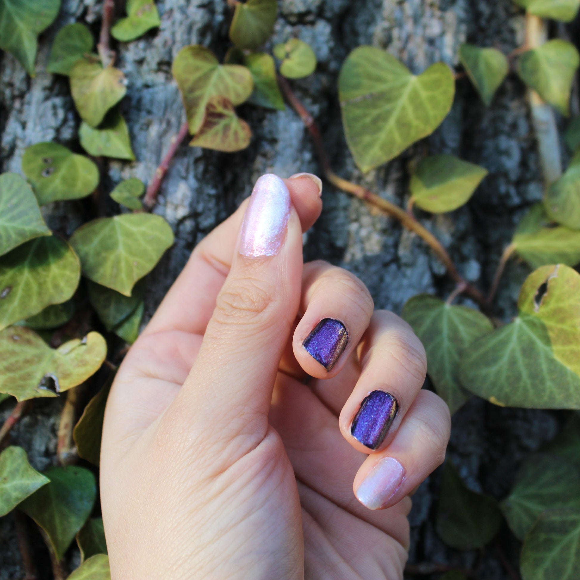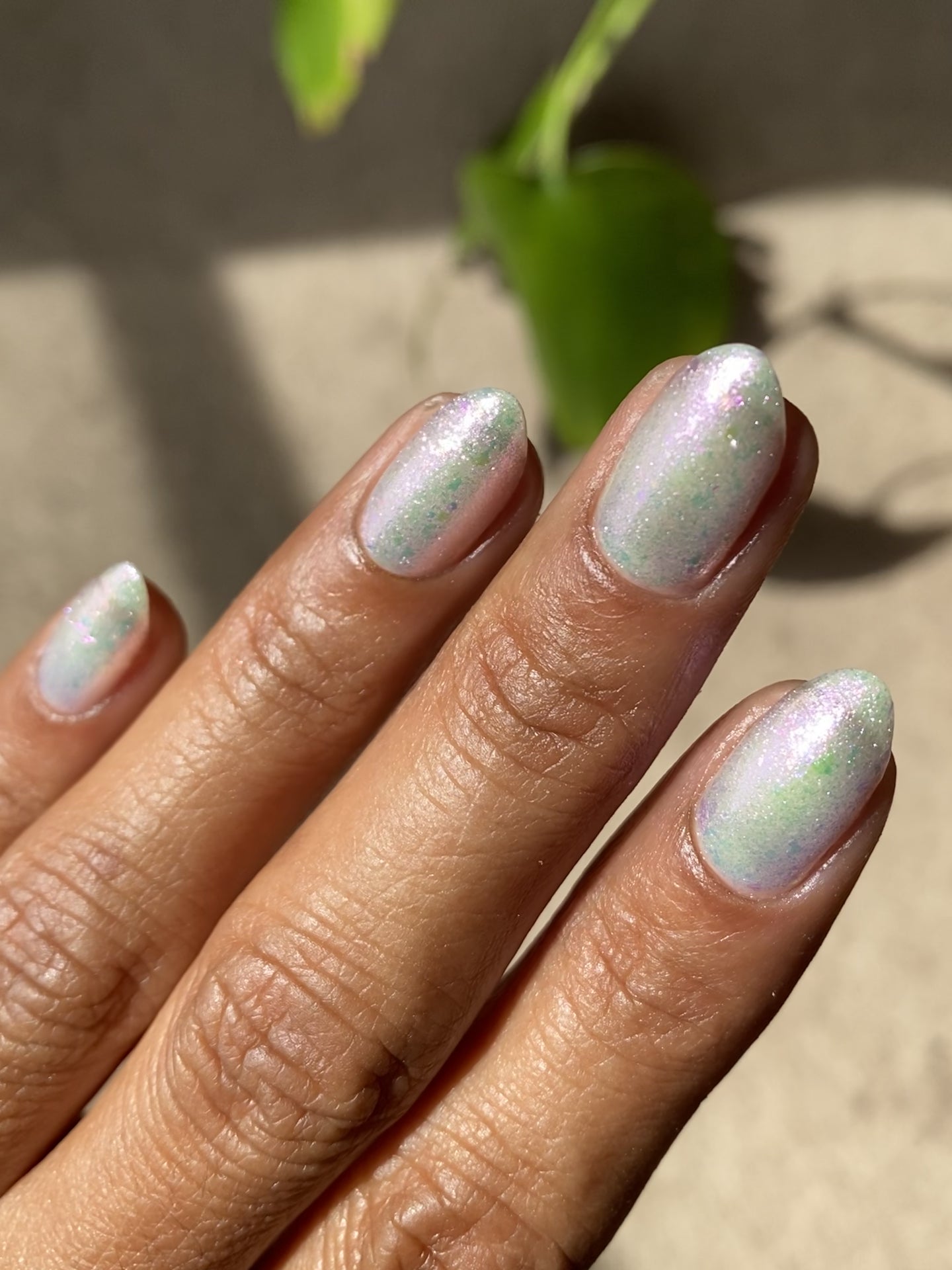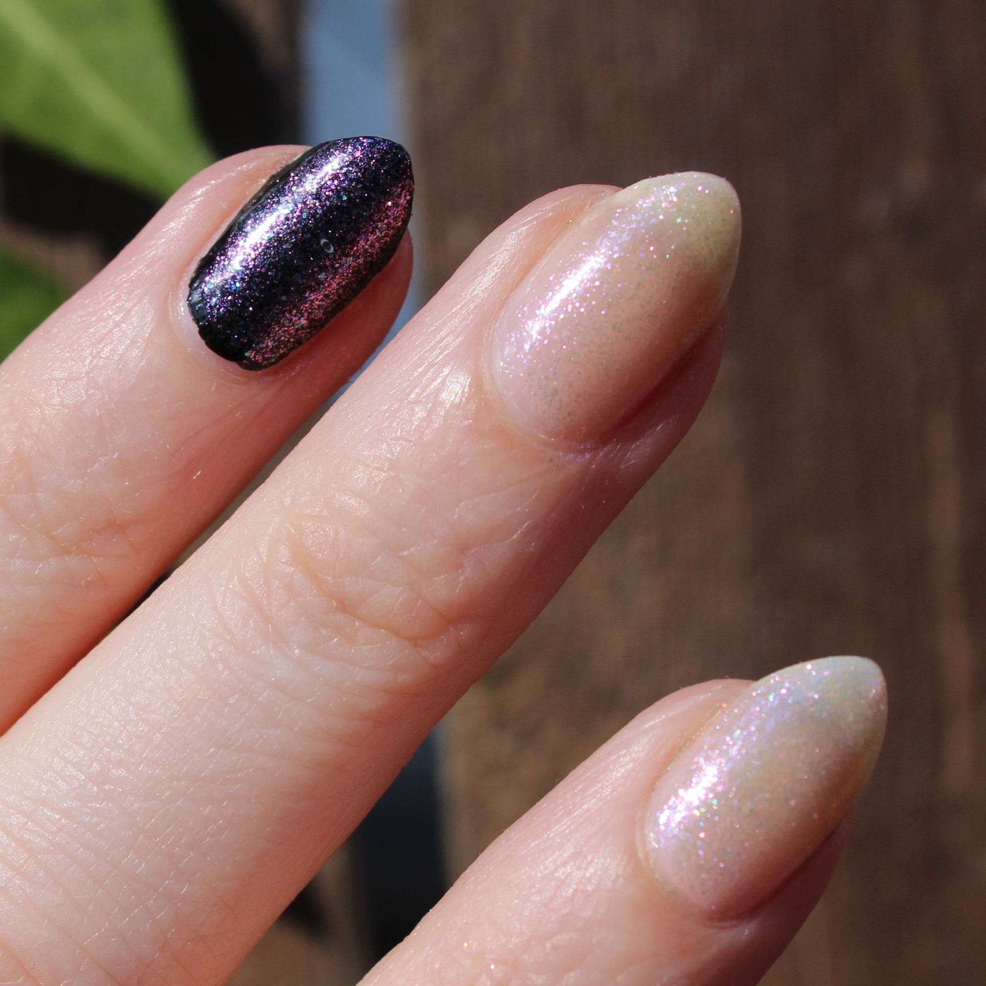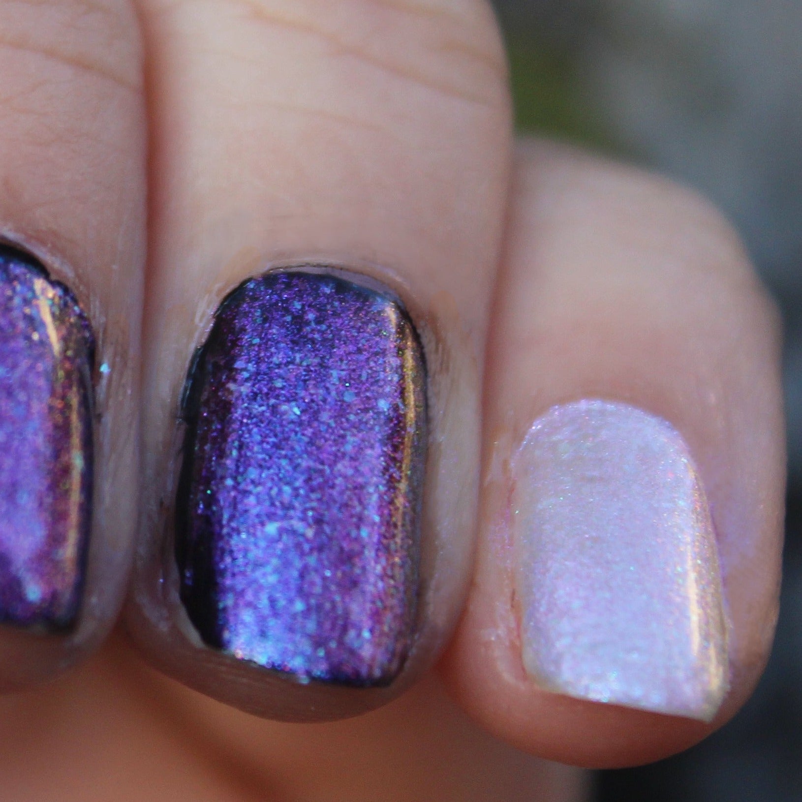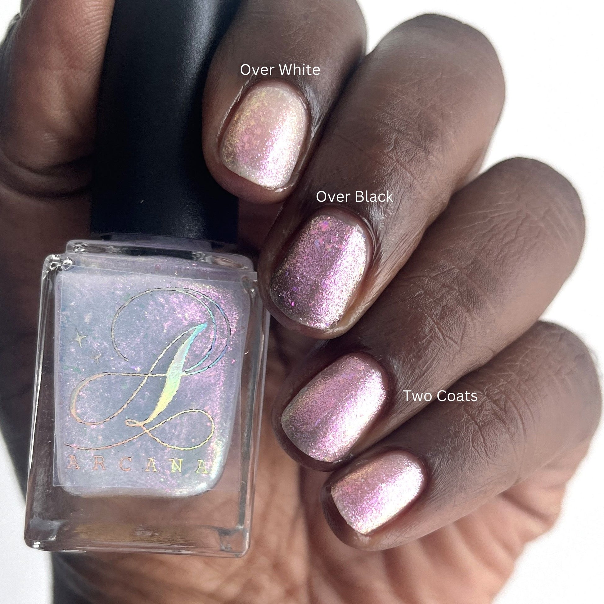 Horn of Healing features a clear base with small iridescent flakies and pink to gold shimmer. This polish can be worn in three coats on its own or as a topper in one coat!