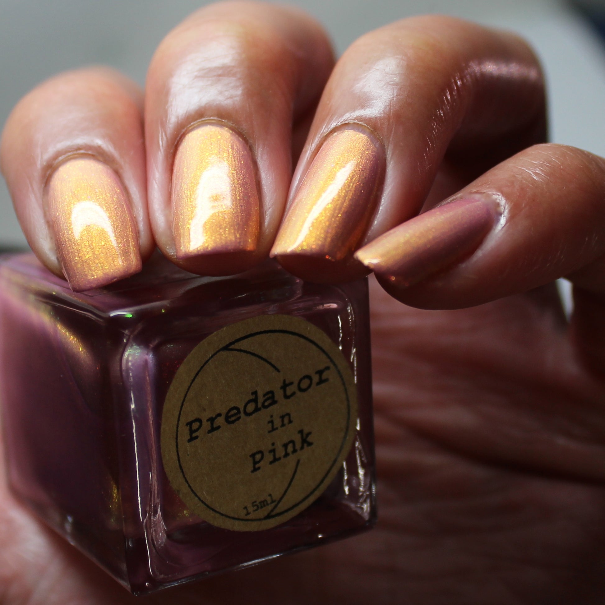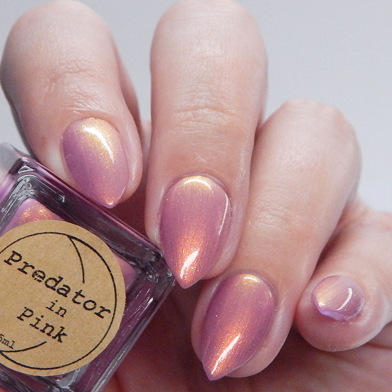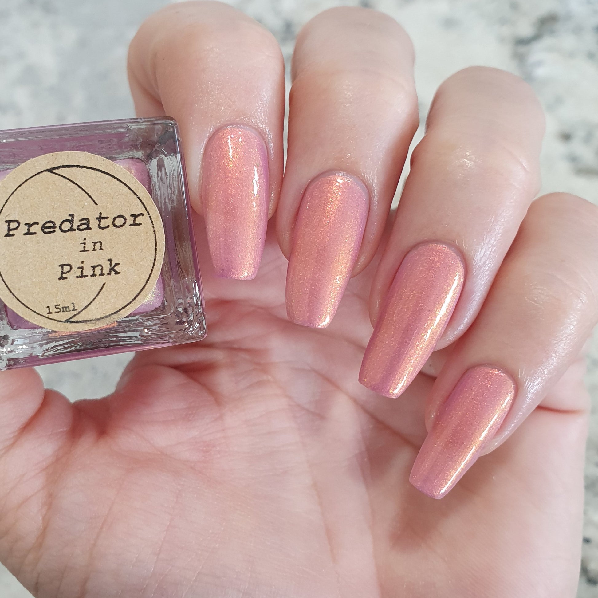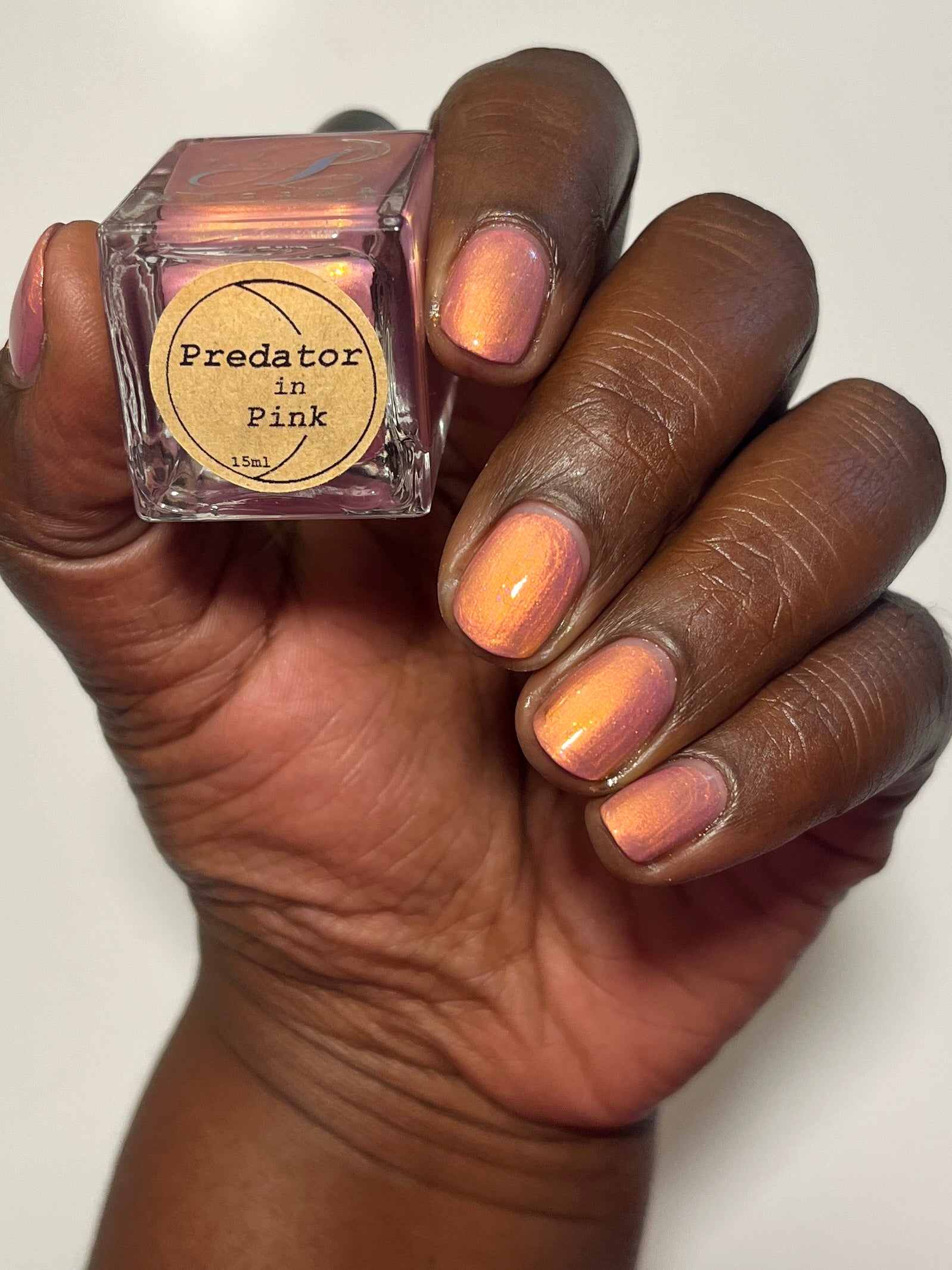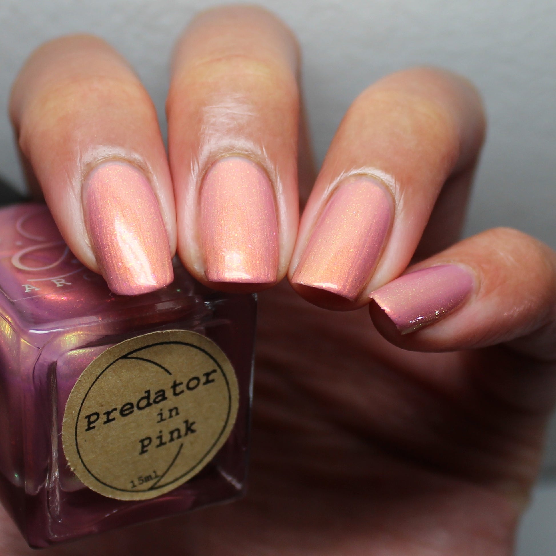 Predator in Pink has a muted coral base with a strong yellow to orange pearlescent shimmer and yellow-pink microflakes!