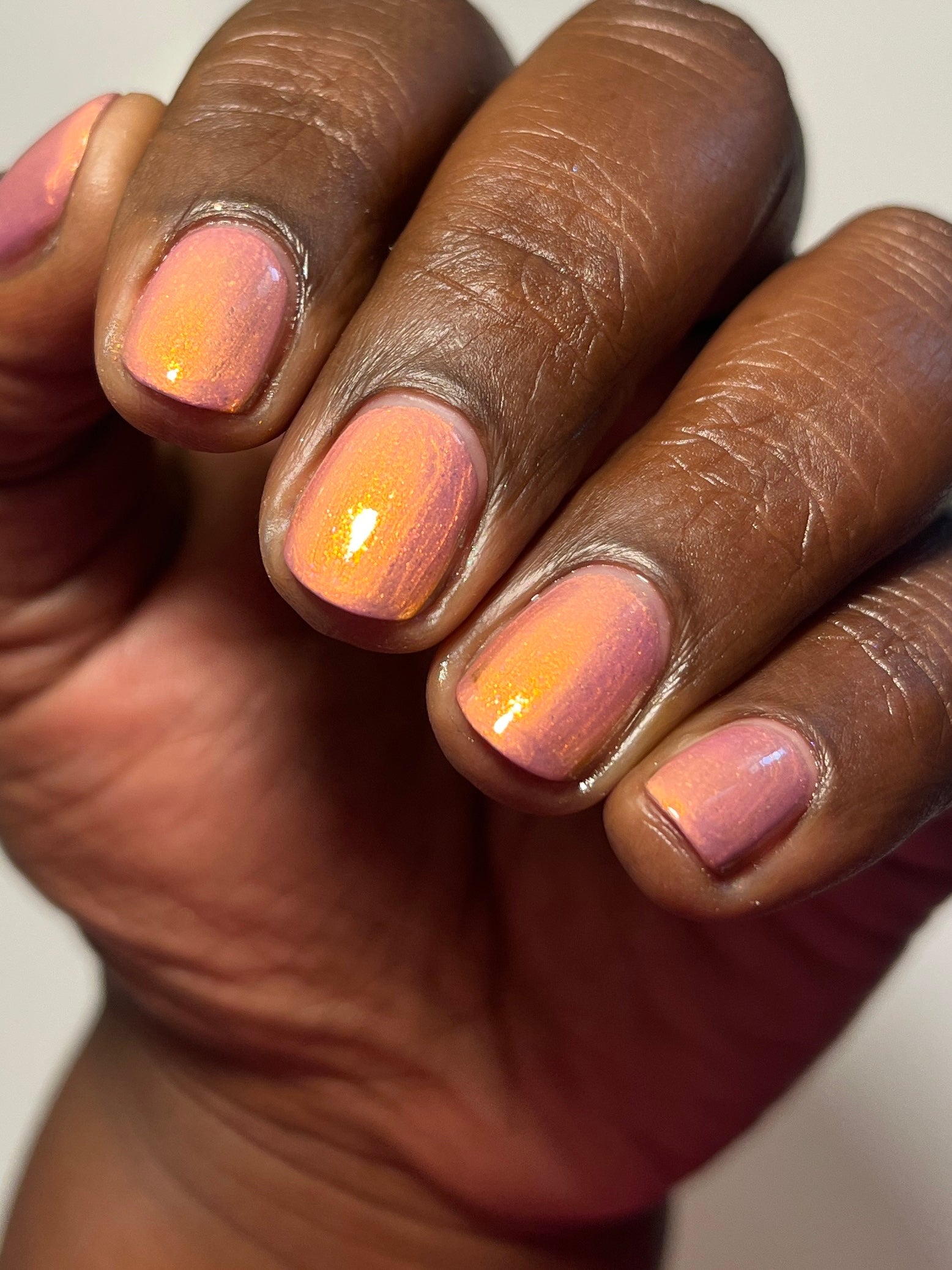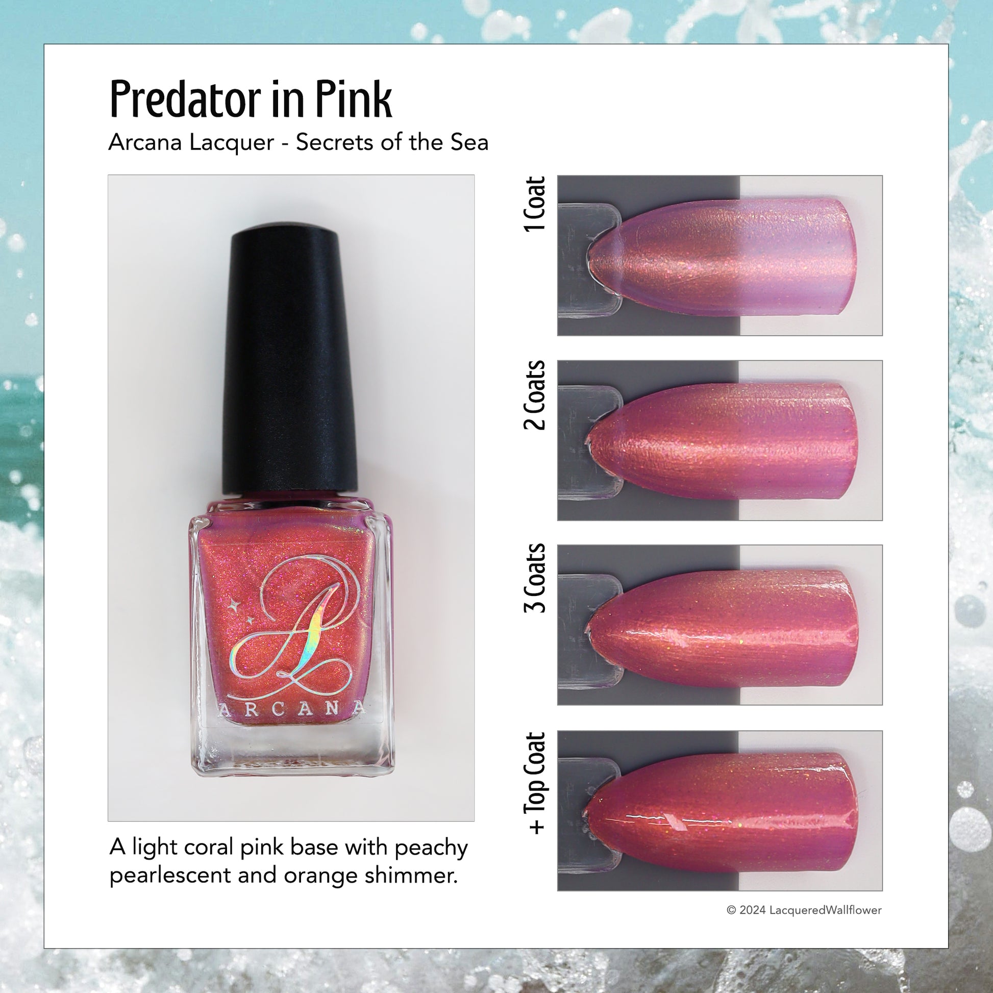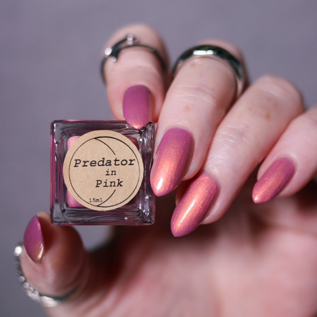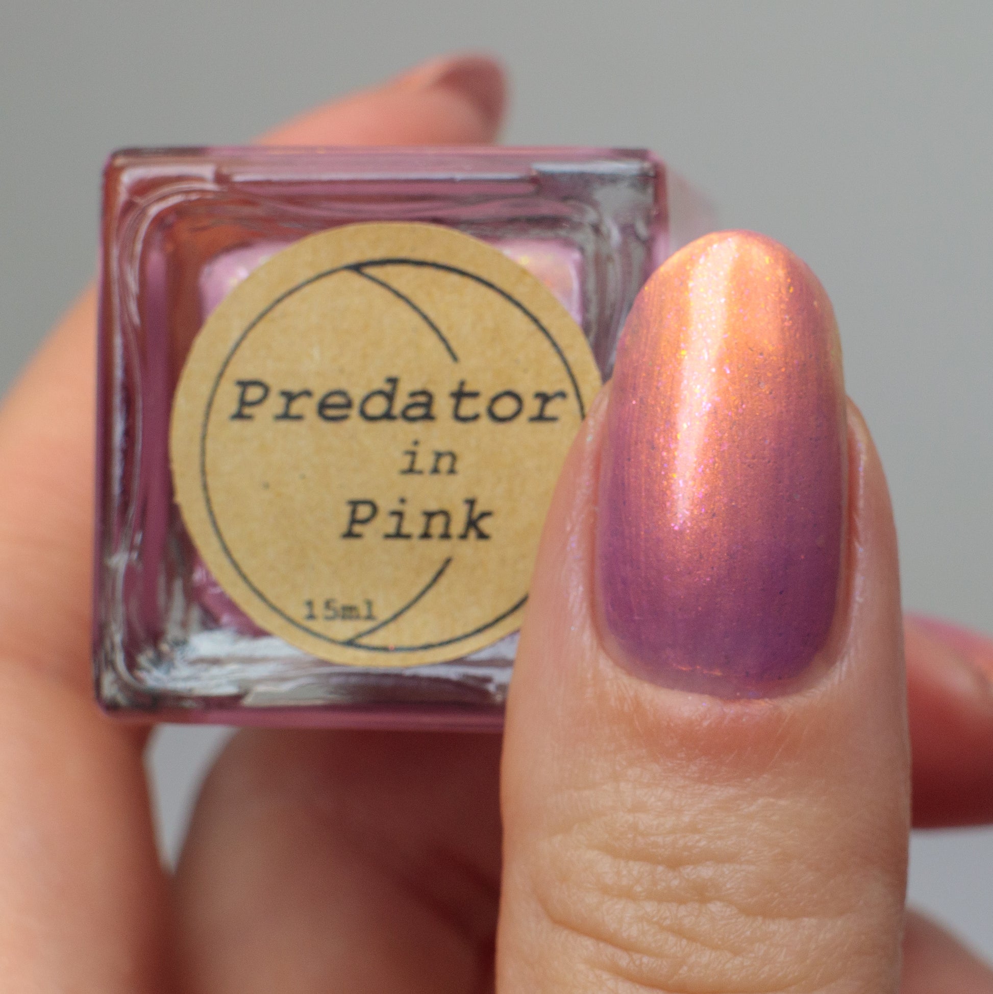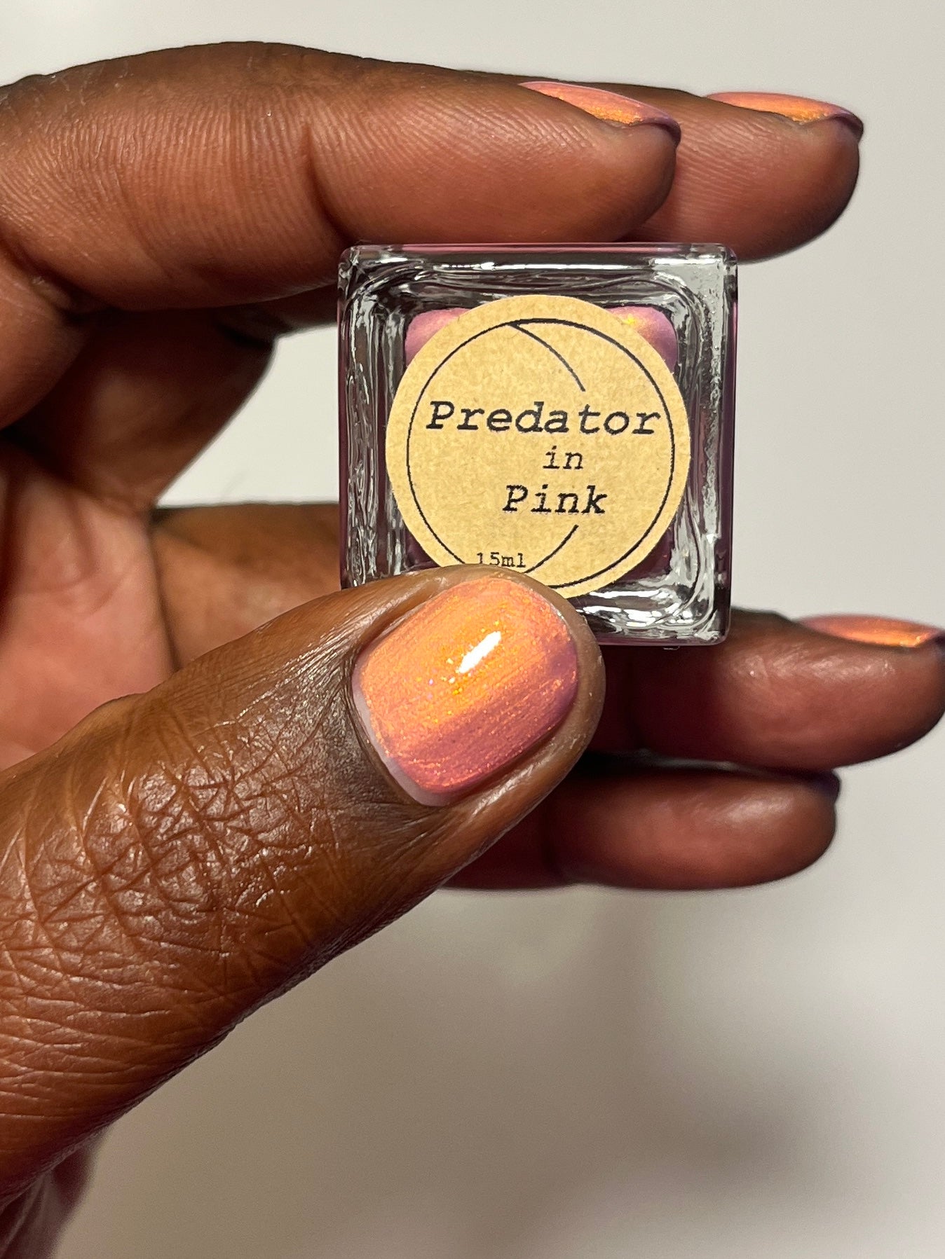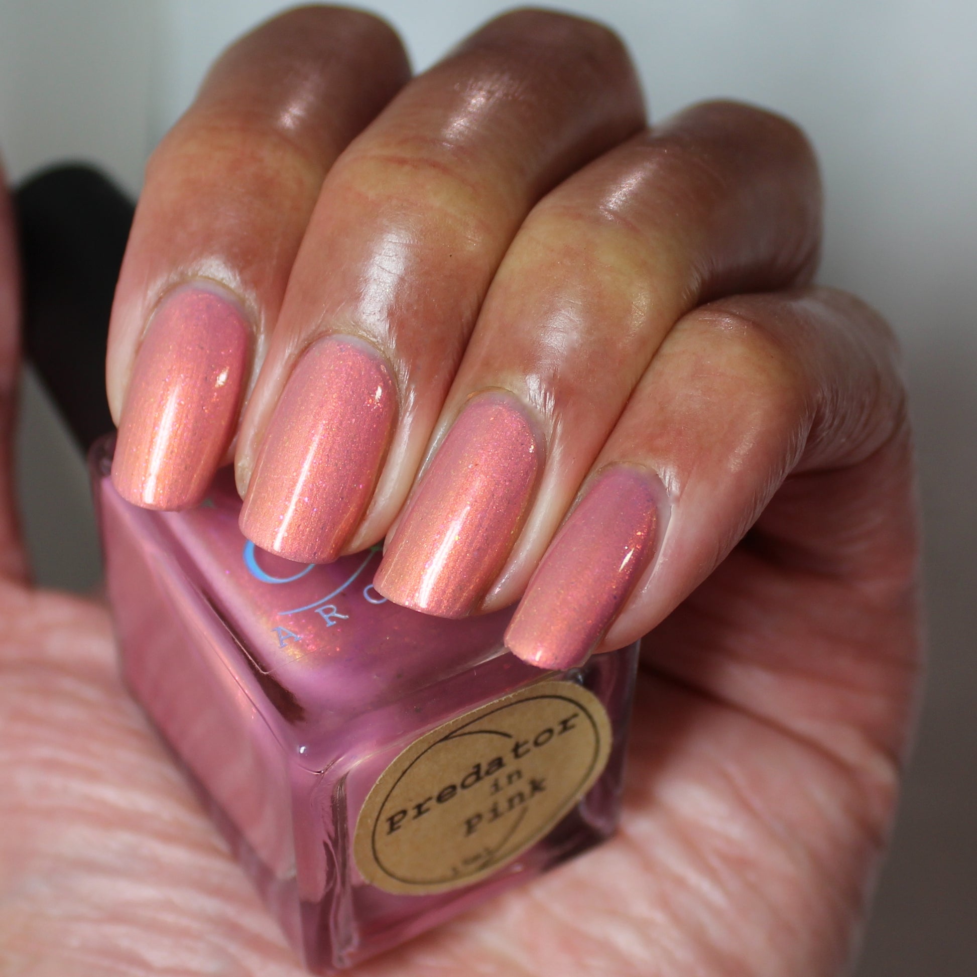 Predator in Pink has a muted coral base with a strong yellow to orange pearlescent shimmer and yellow-pink microflakes!