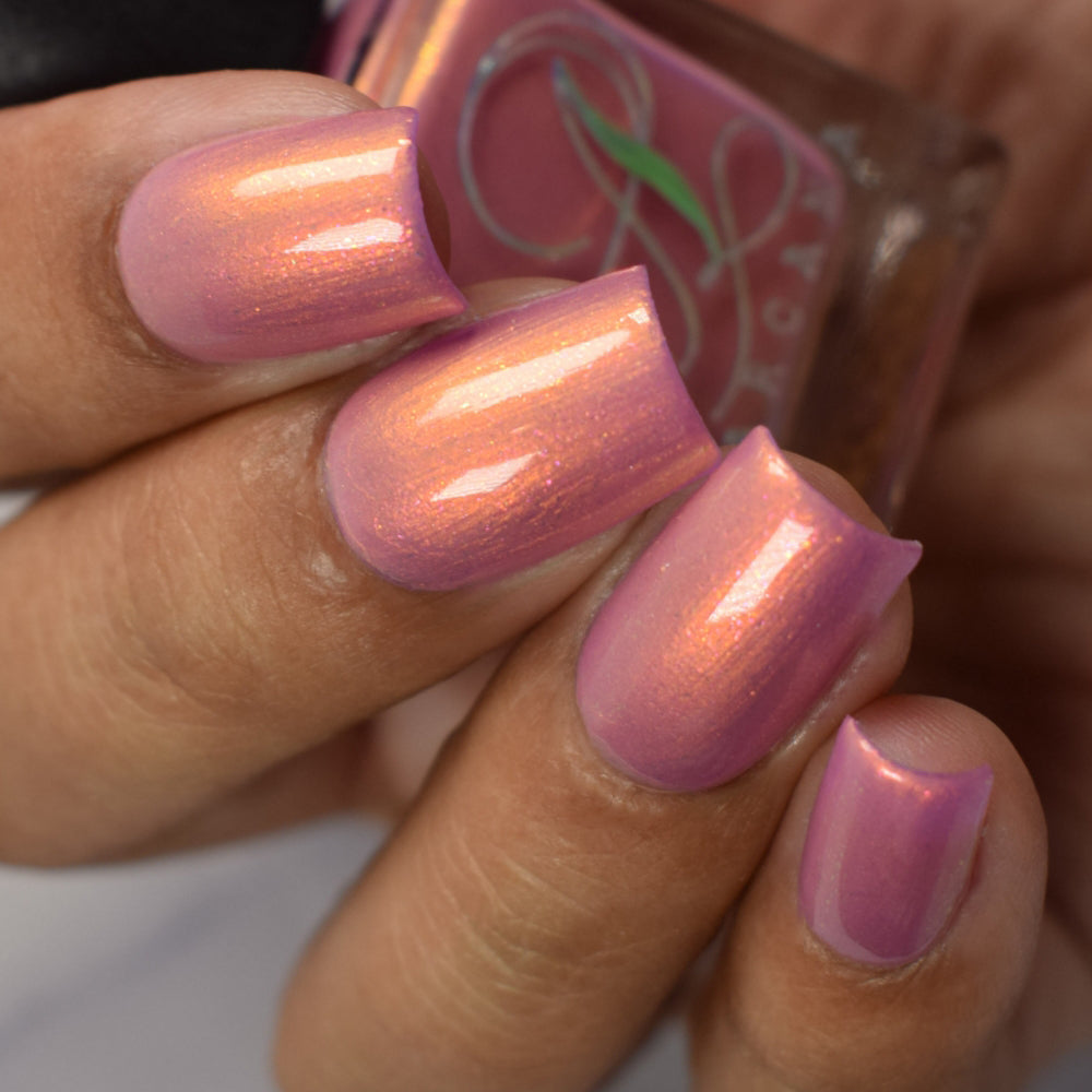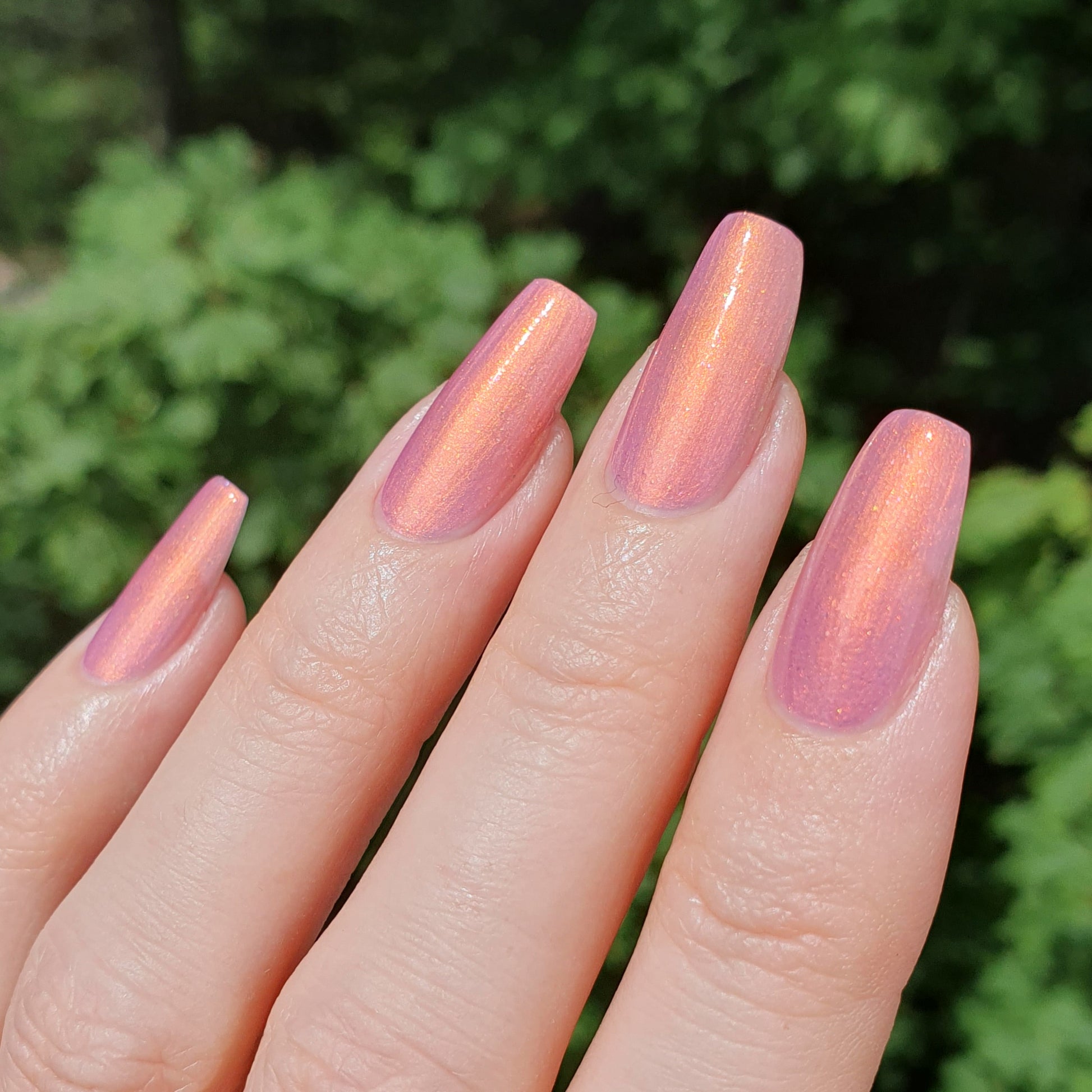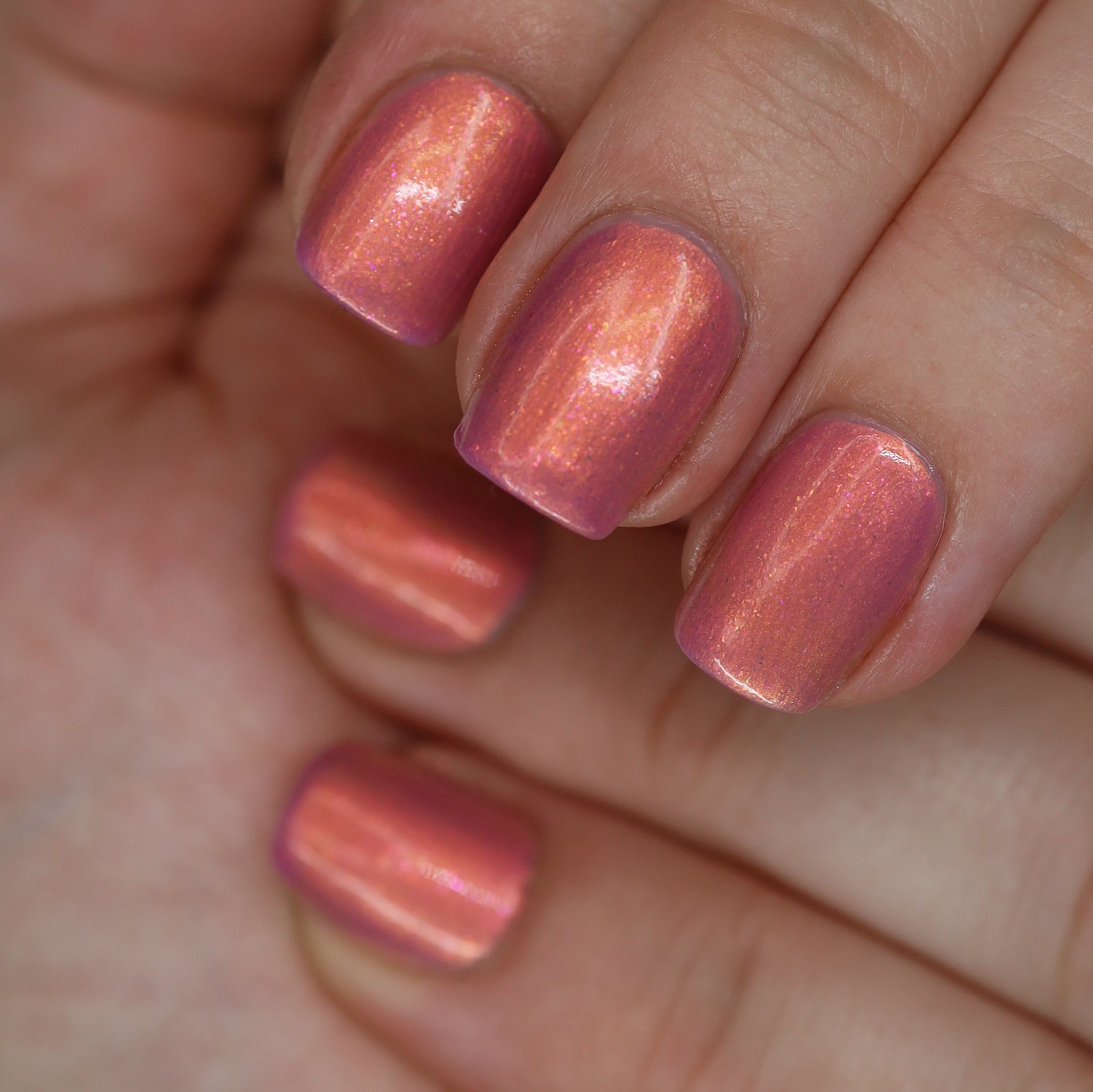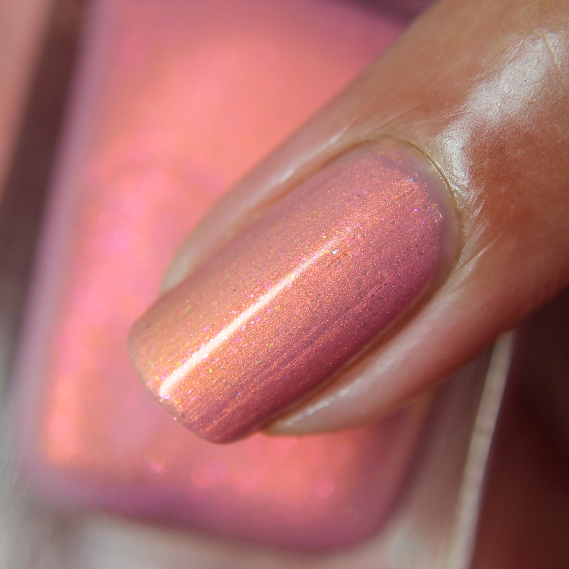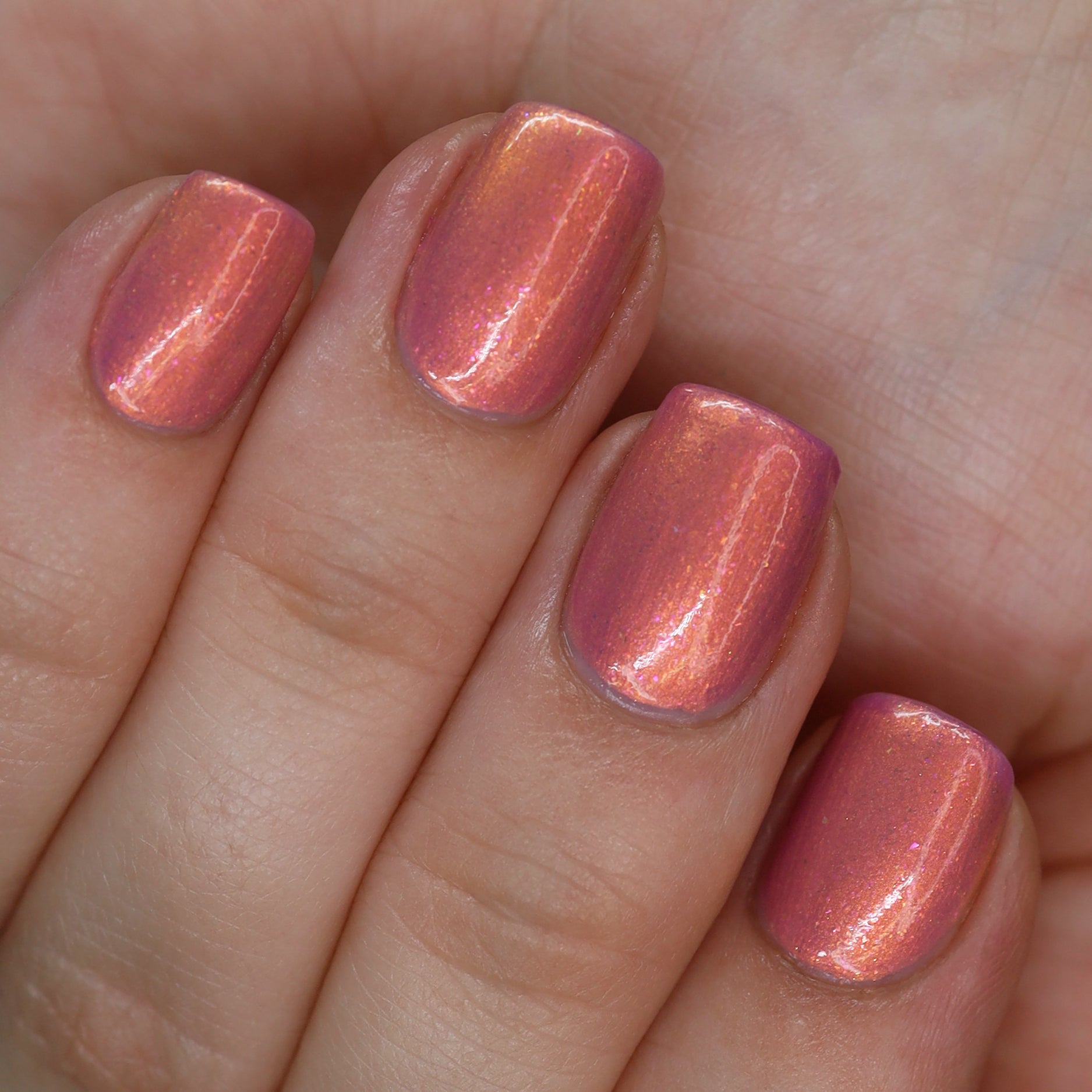 Predator in Pink has a muted coral base with a strong yellow to orange pearlescent shimmer and yellow-pink microflakes!