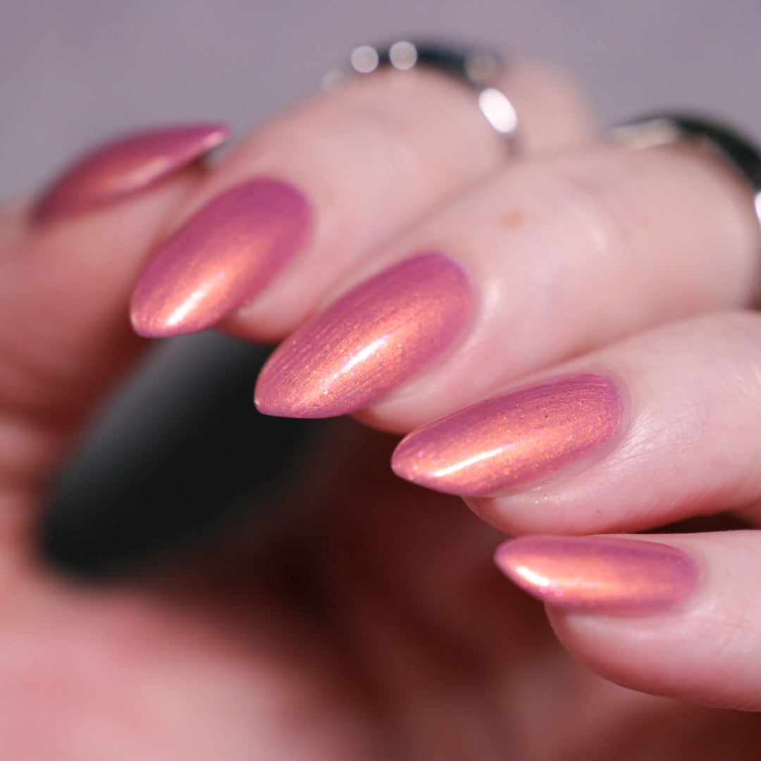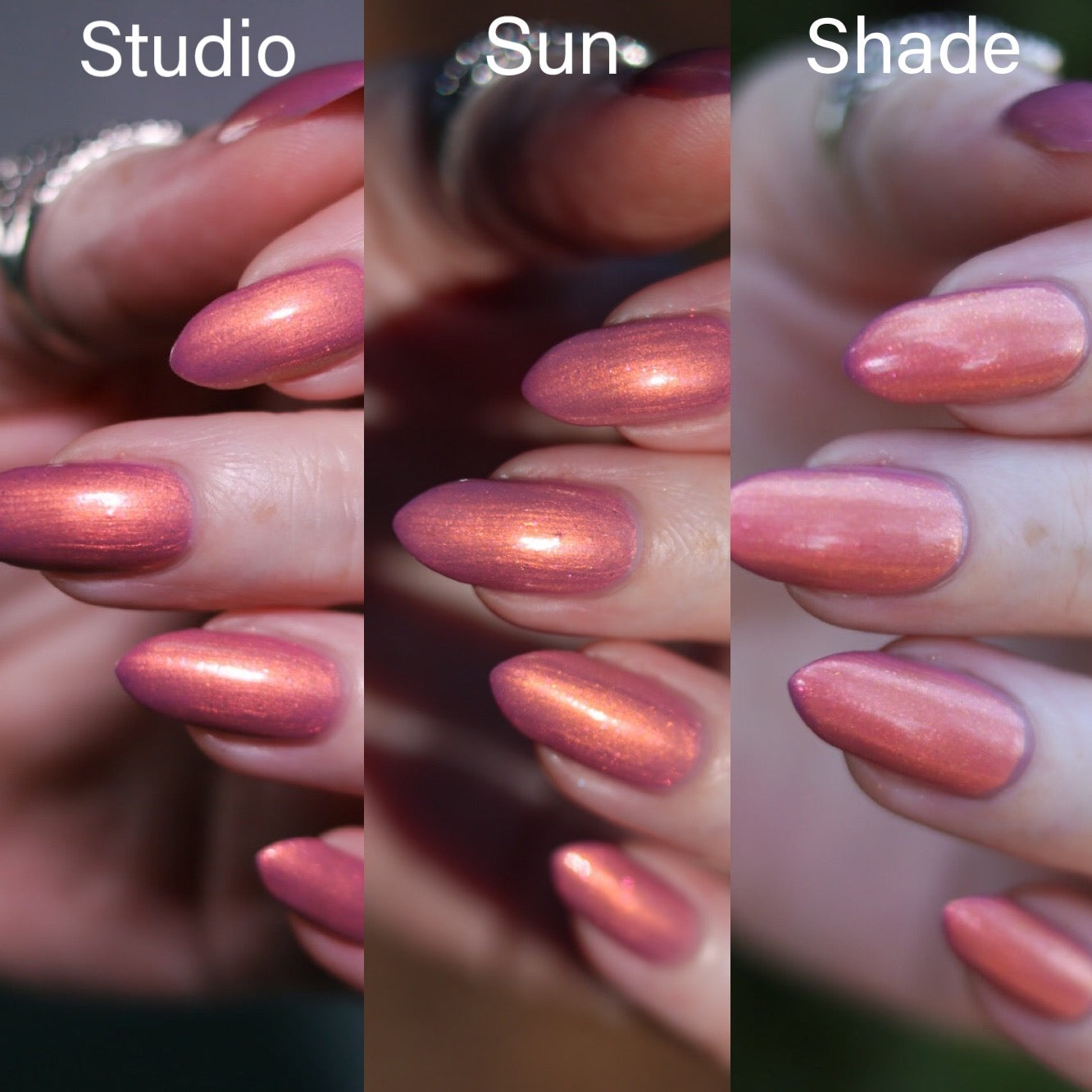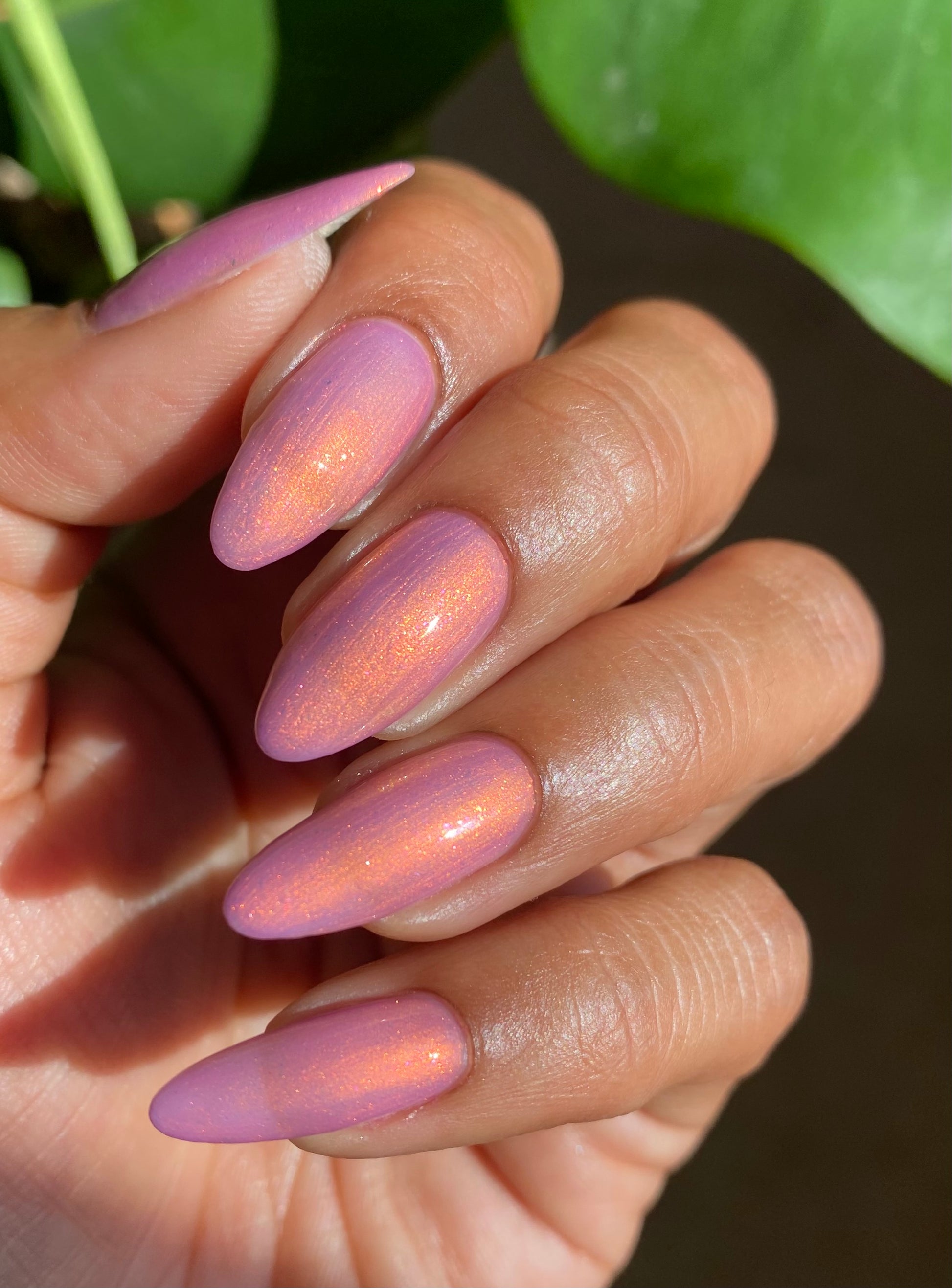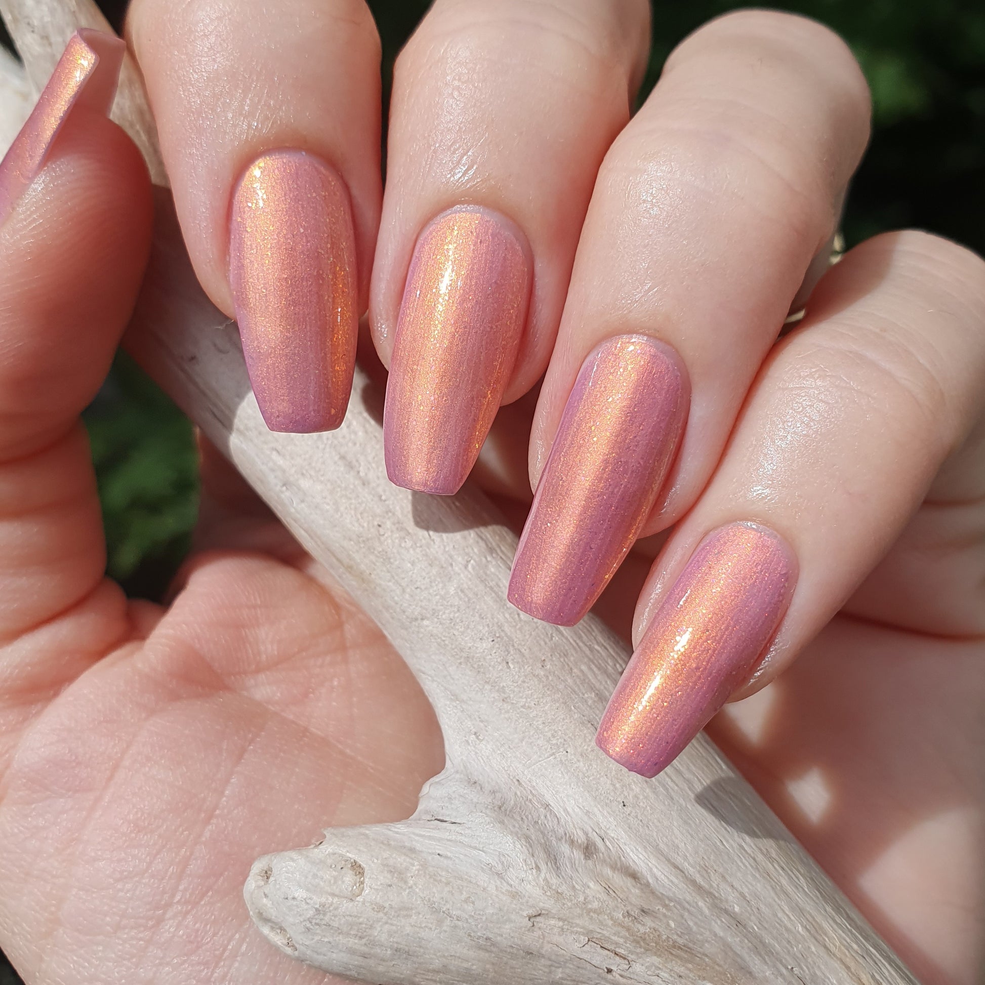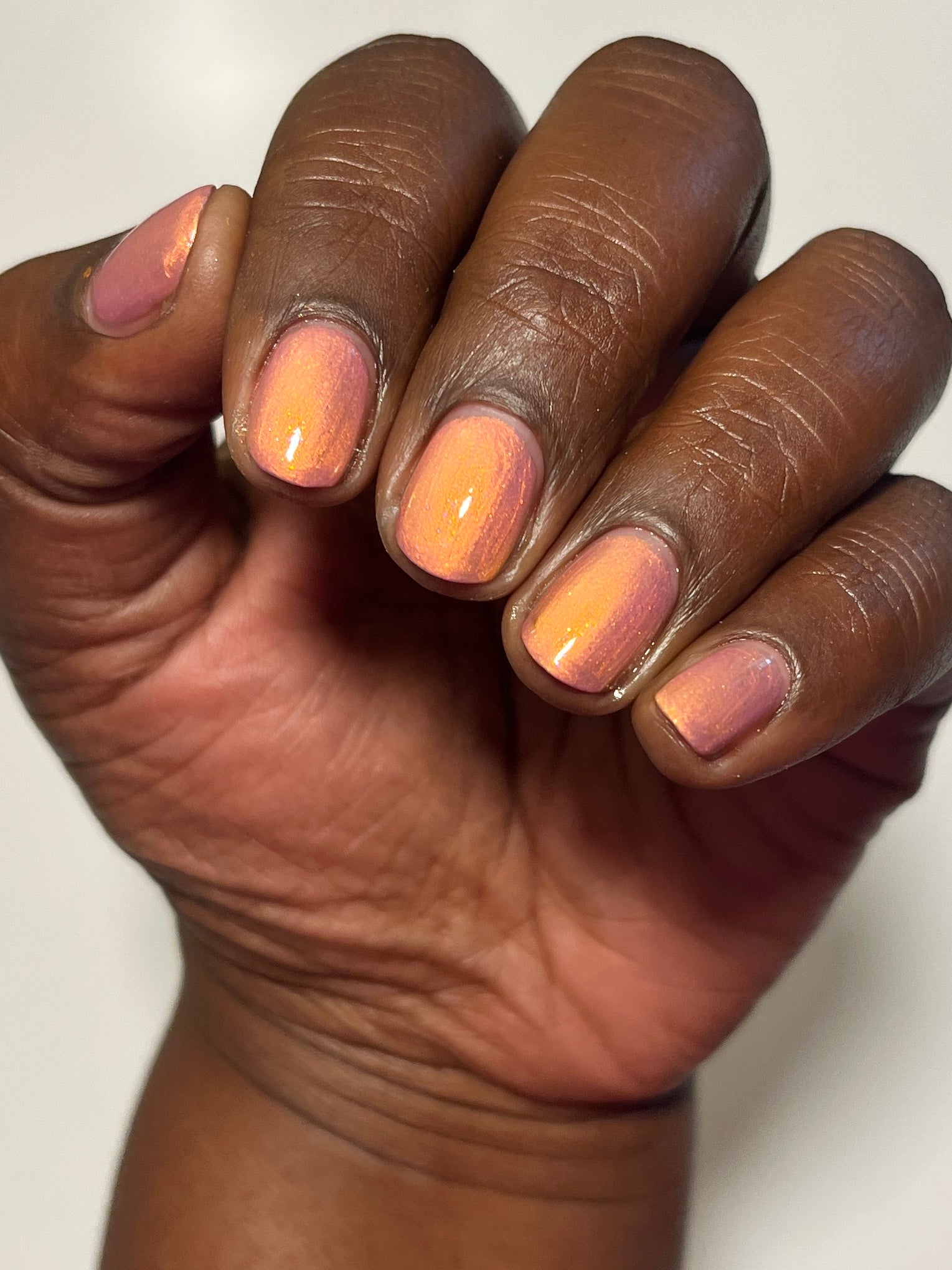 Predator in Pink has a muted coral base with a strong yellow to orange pearlescent shimmer and yellow-pink microflakes!