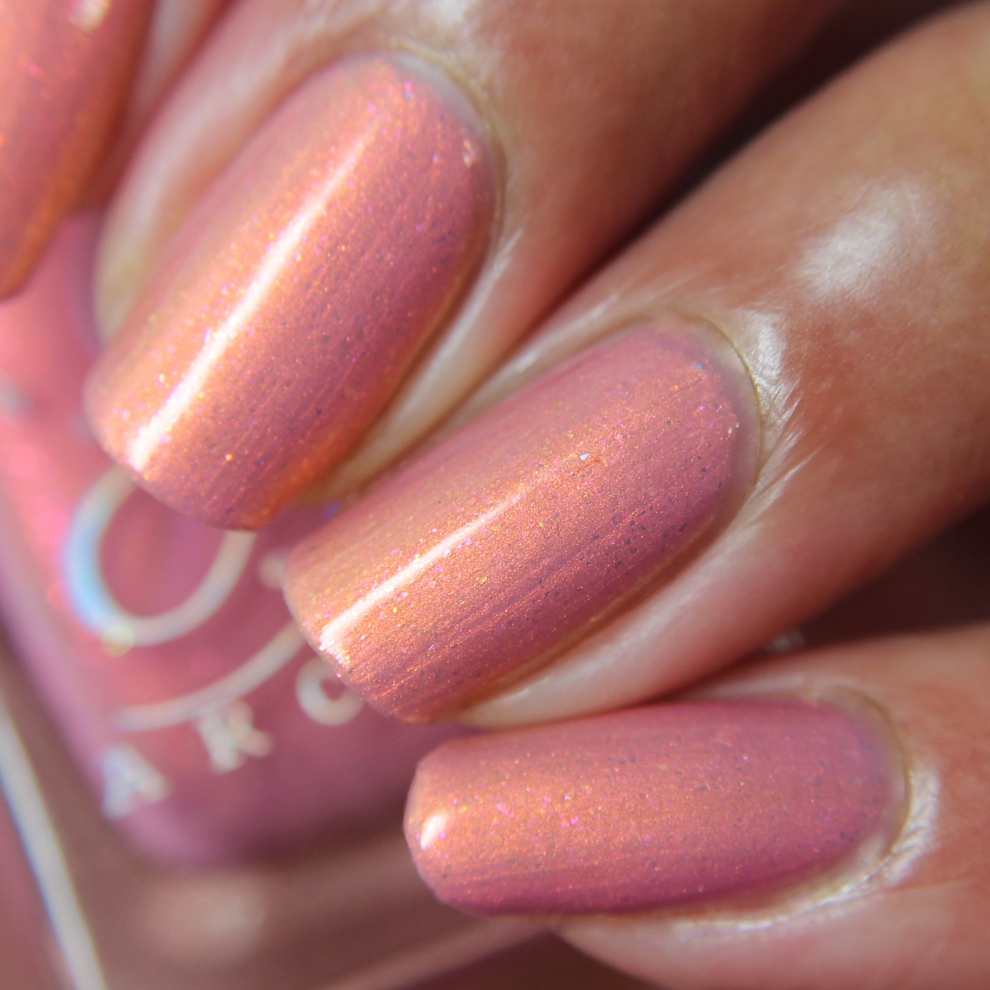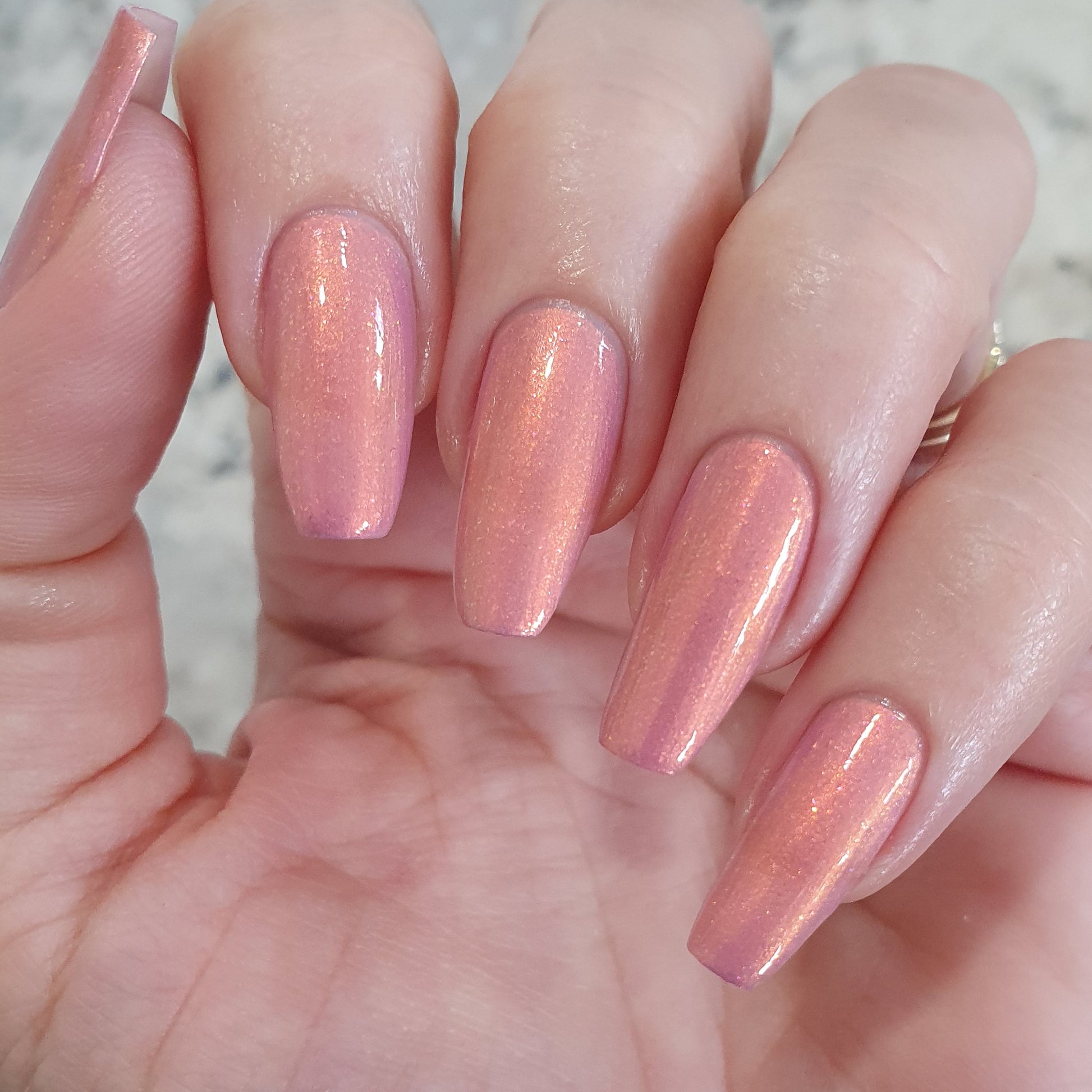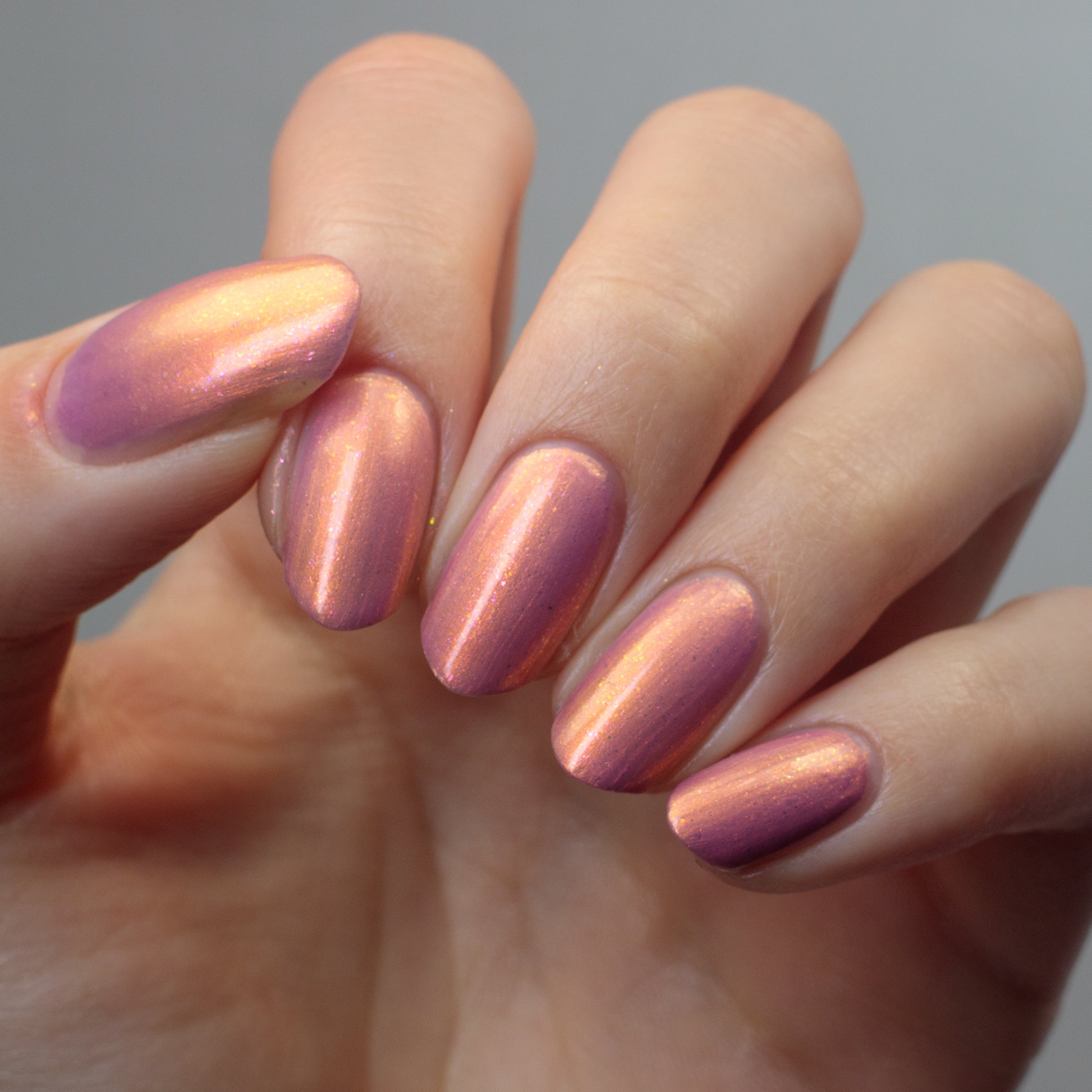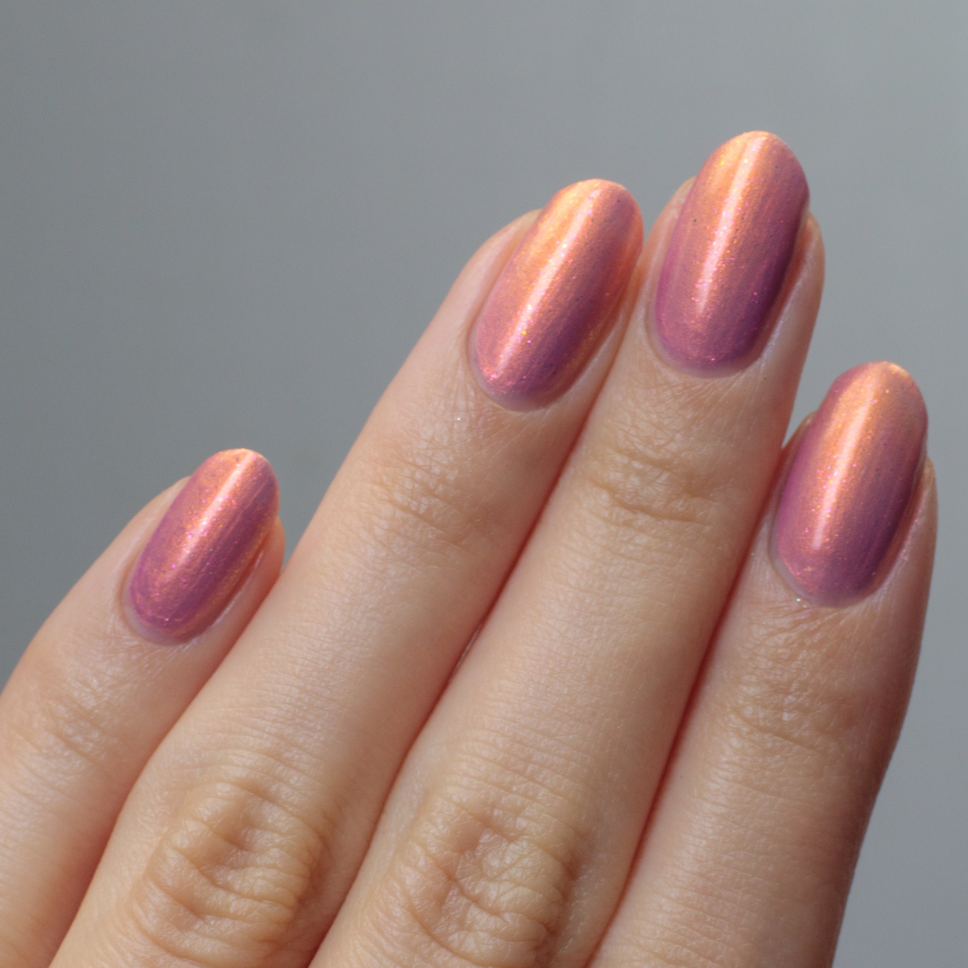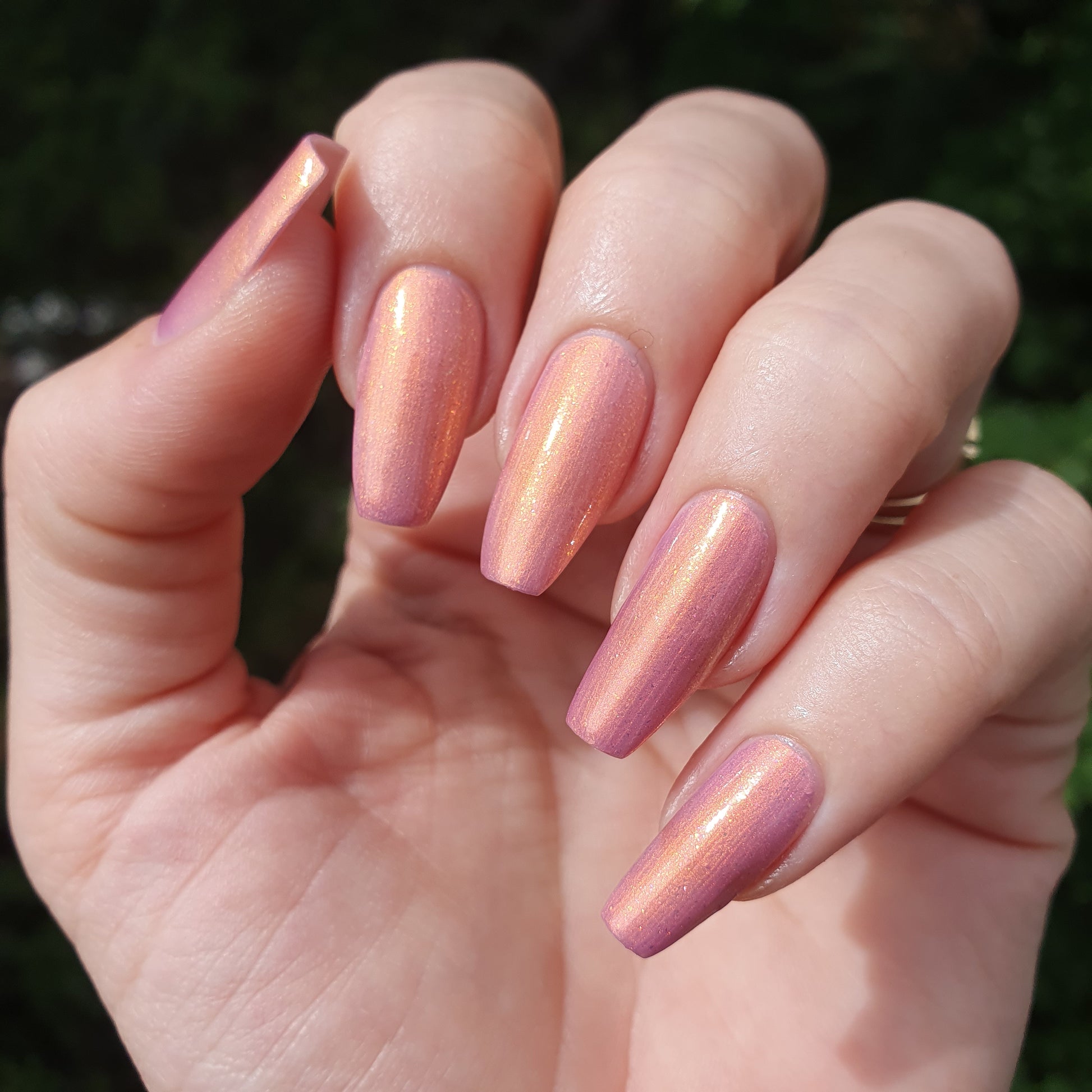 Predator in Pink has a muted coral base with a strong yellow to orange pearlescent shimmer and yellow-pink microflakes!