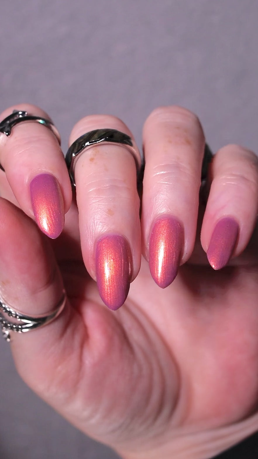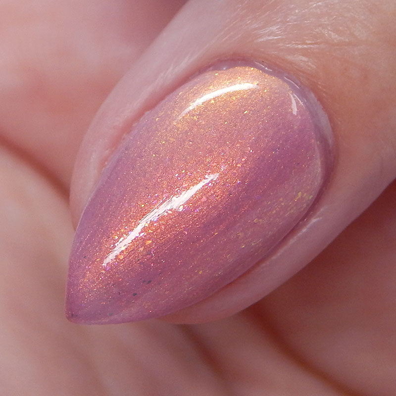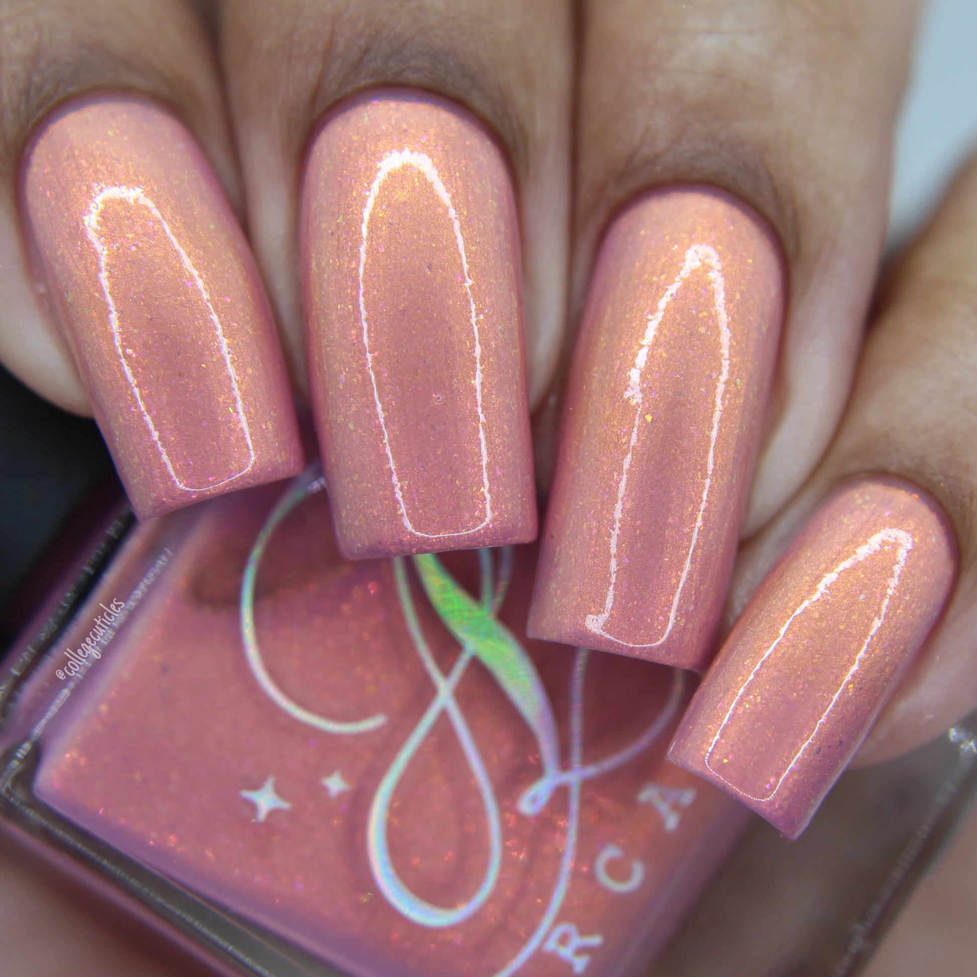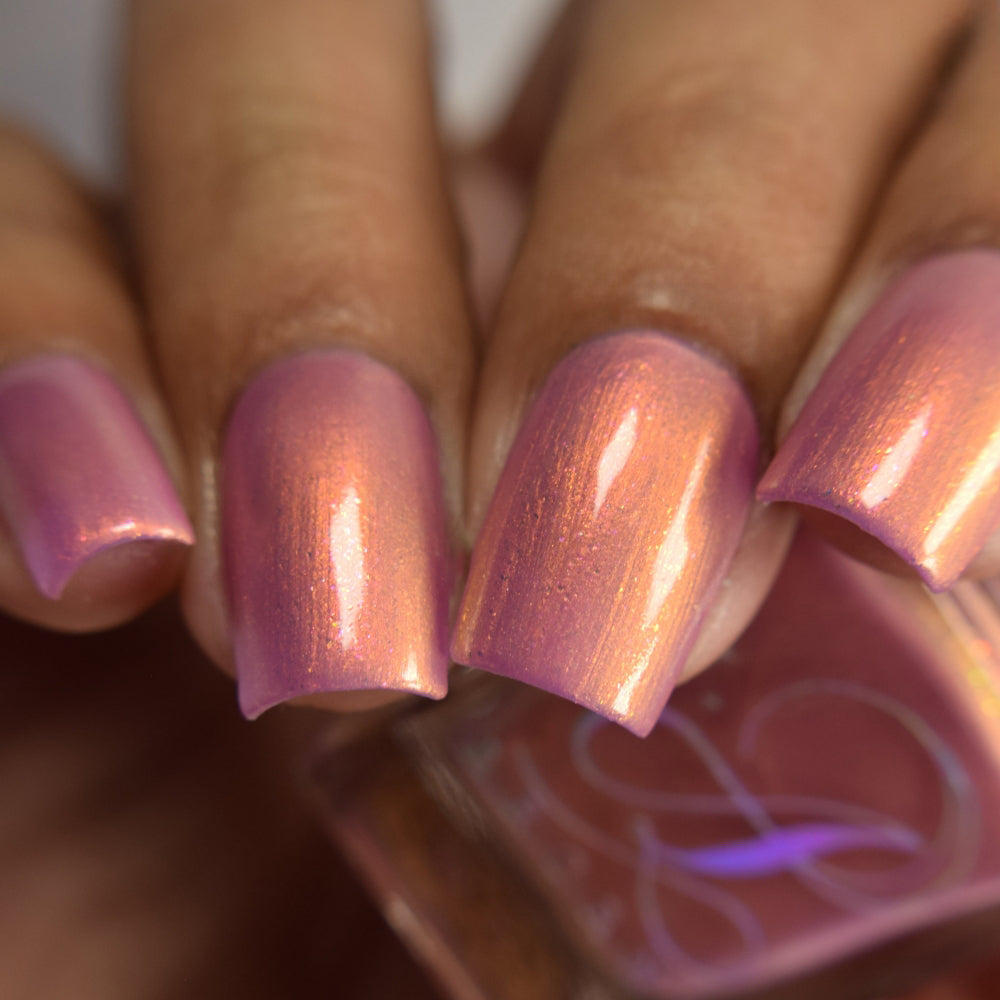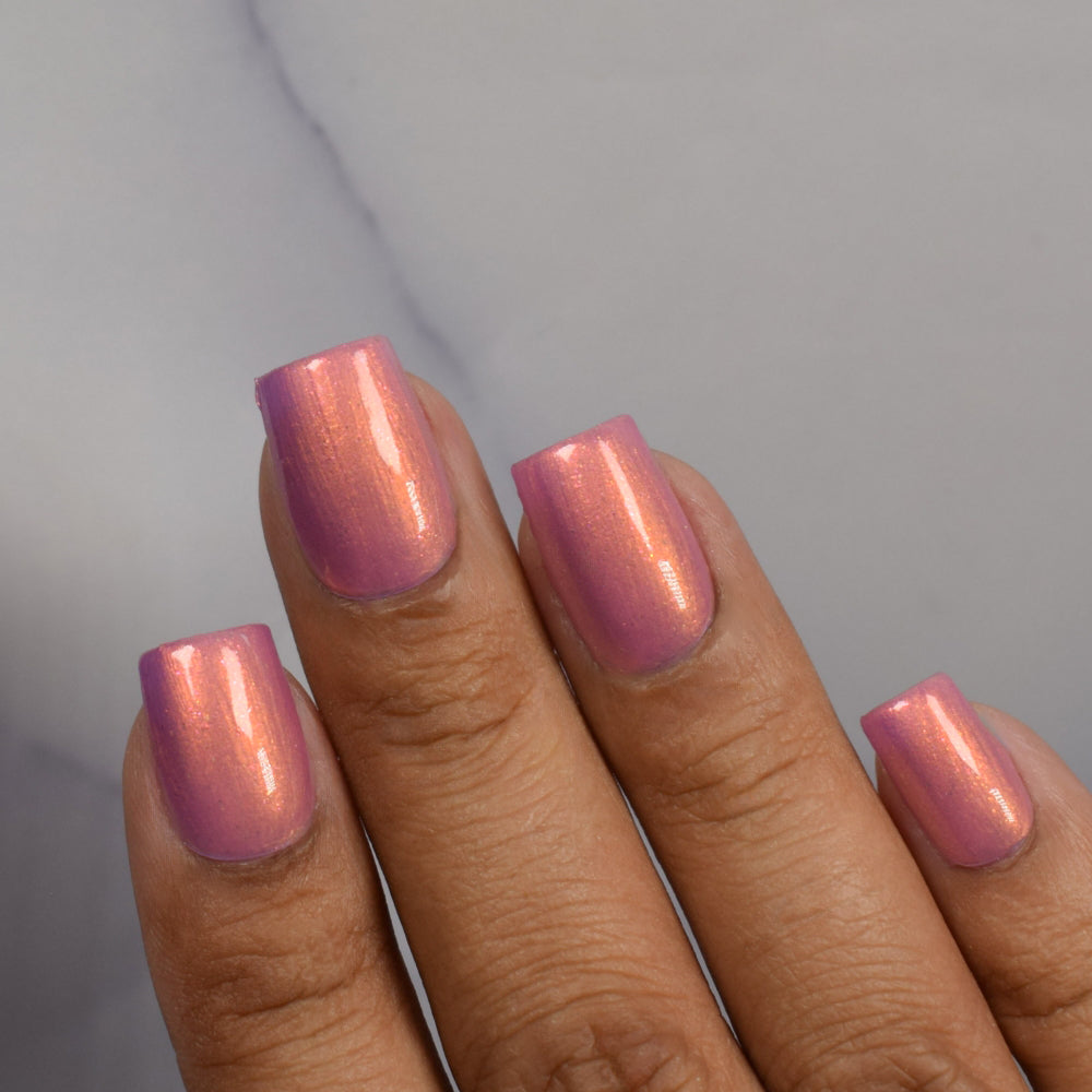 Predator in Pink has a muted coral base with a strong yellow to orange pearlescent shimmer and yellow-pink microflakes!