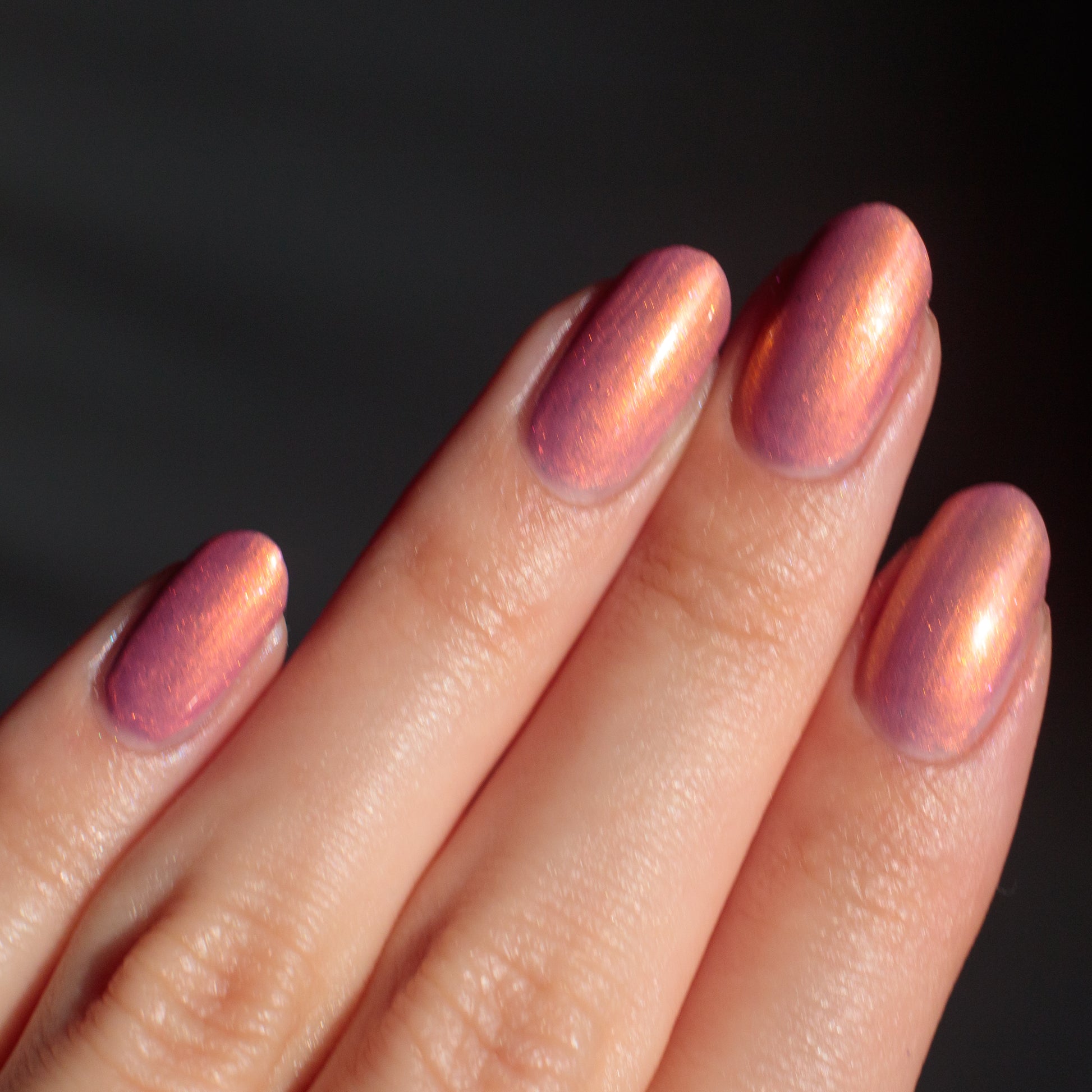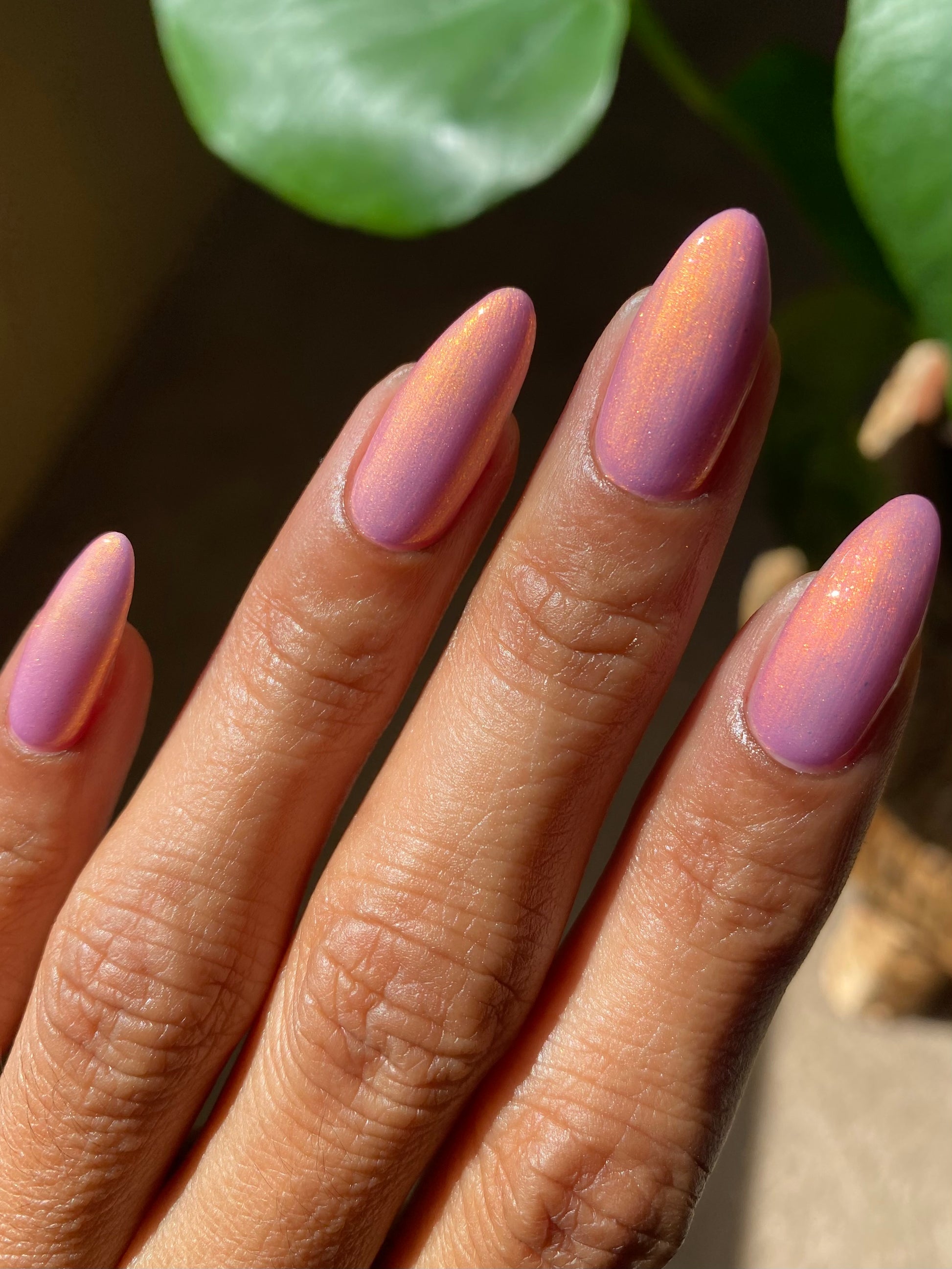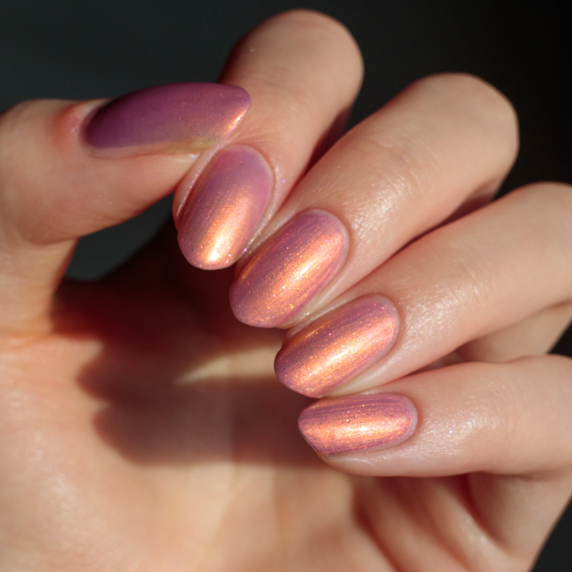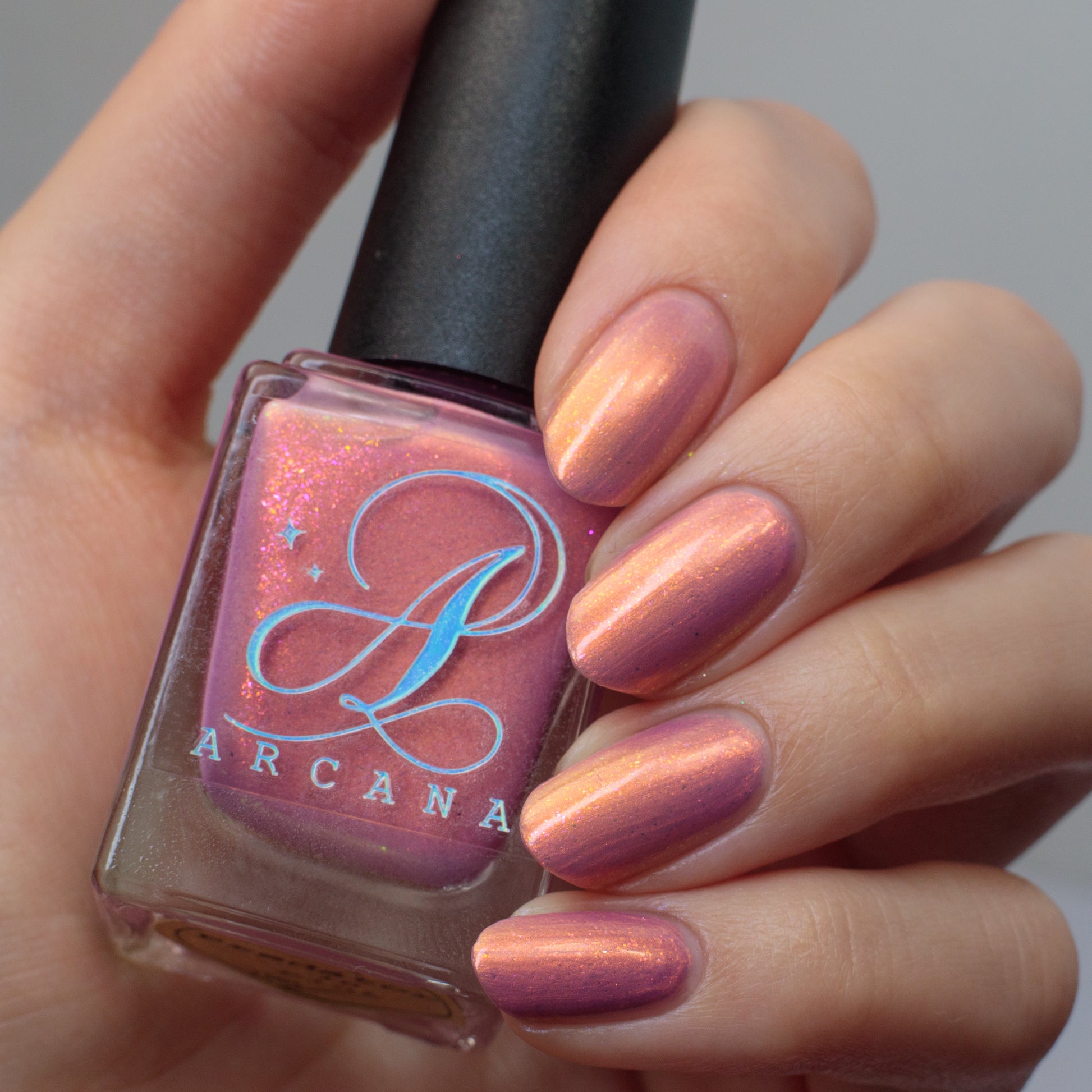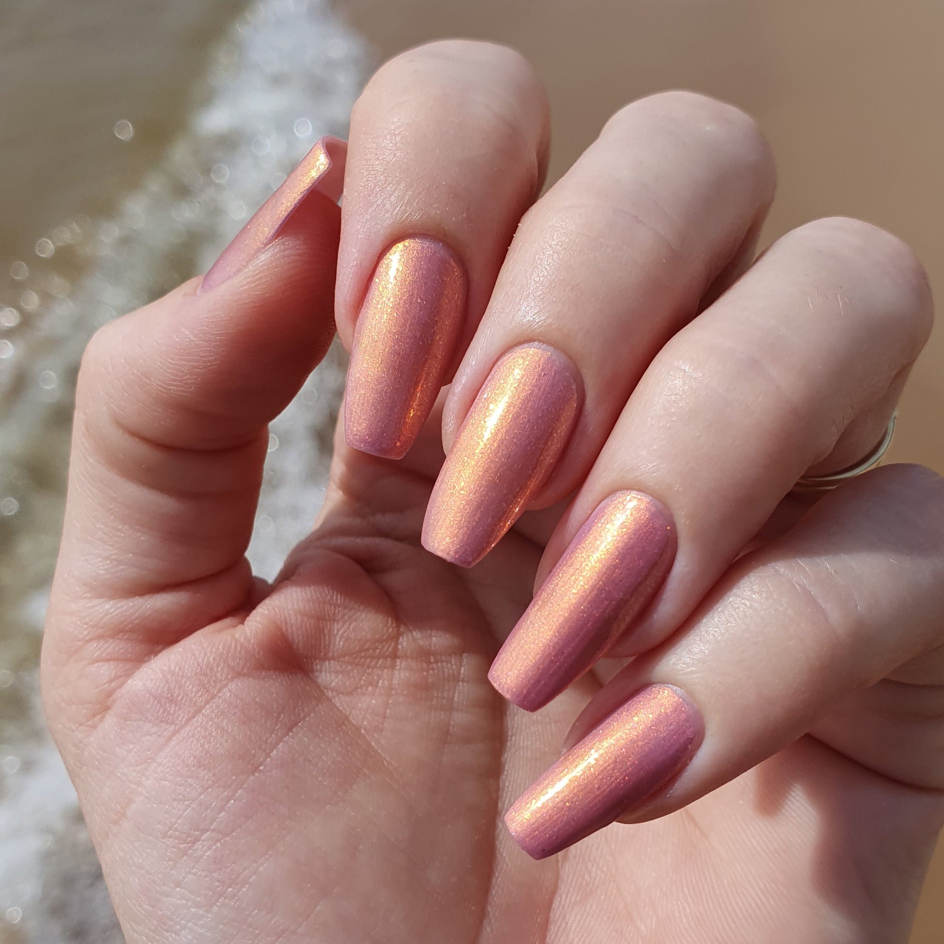 Predator in Pink has a muted coral base with a strong yellow to orange pearlescent shimmer and yellow-pink microflakes!