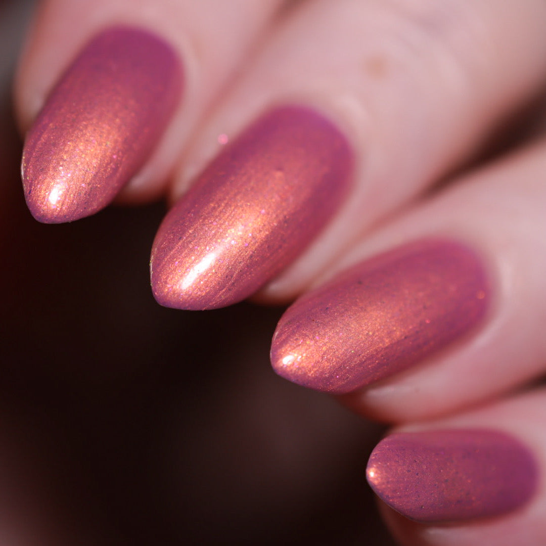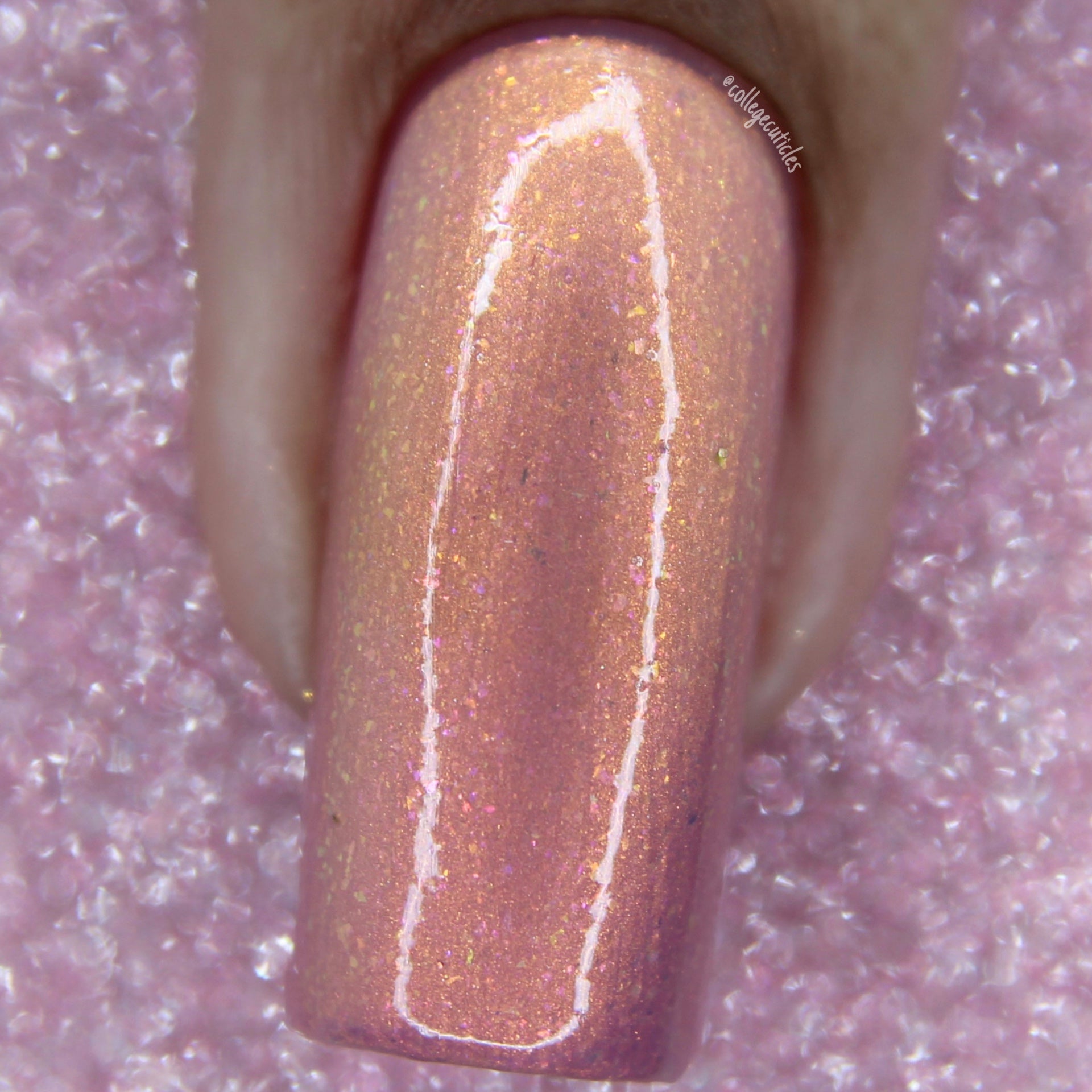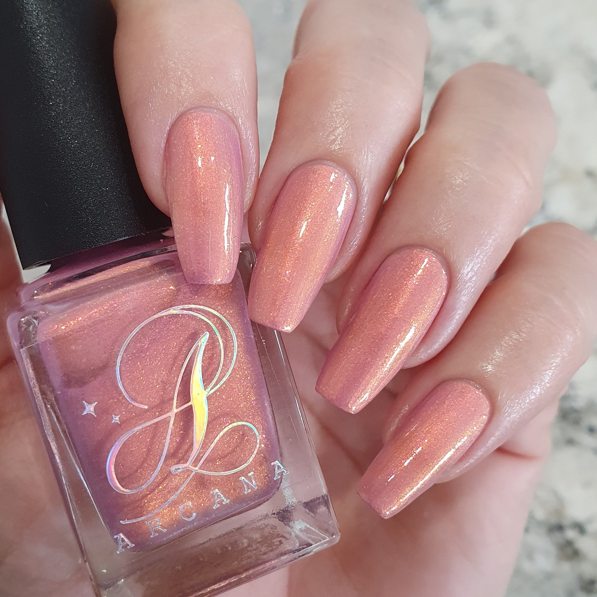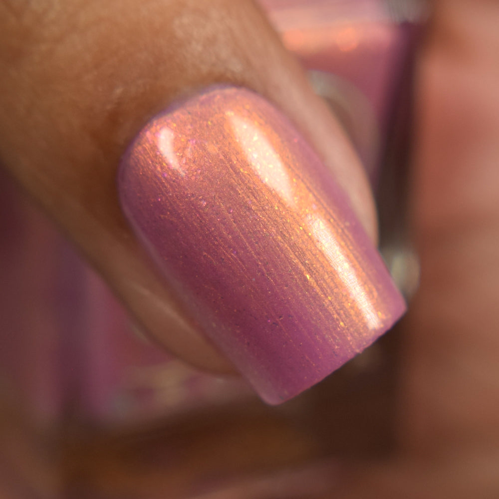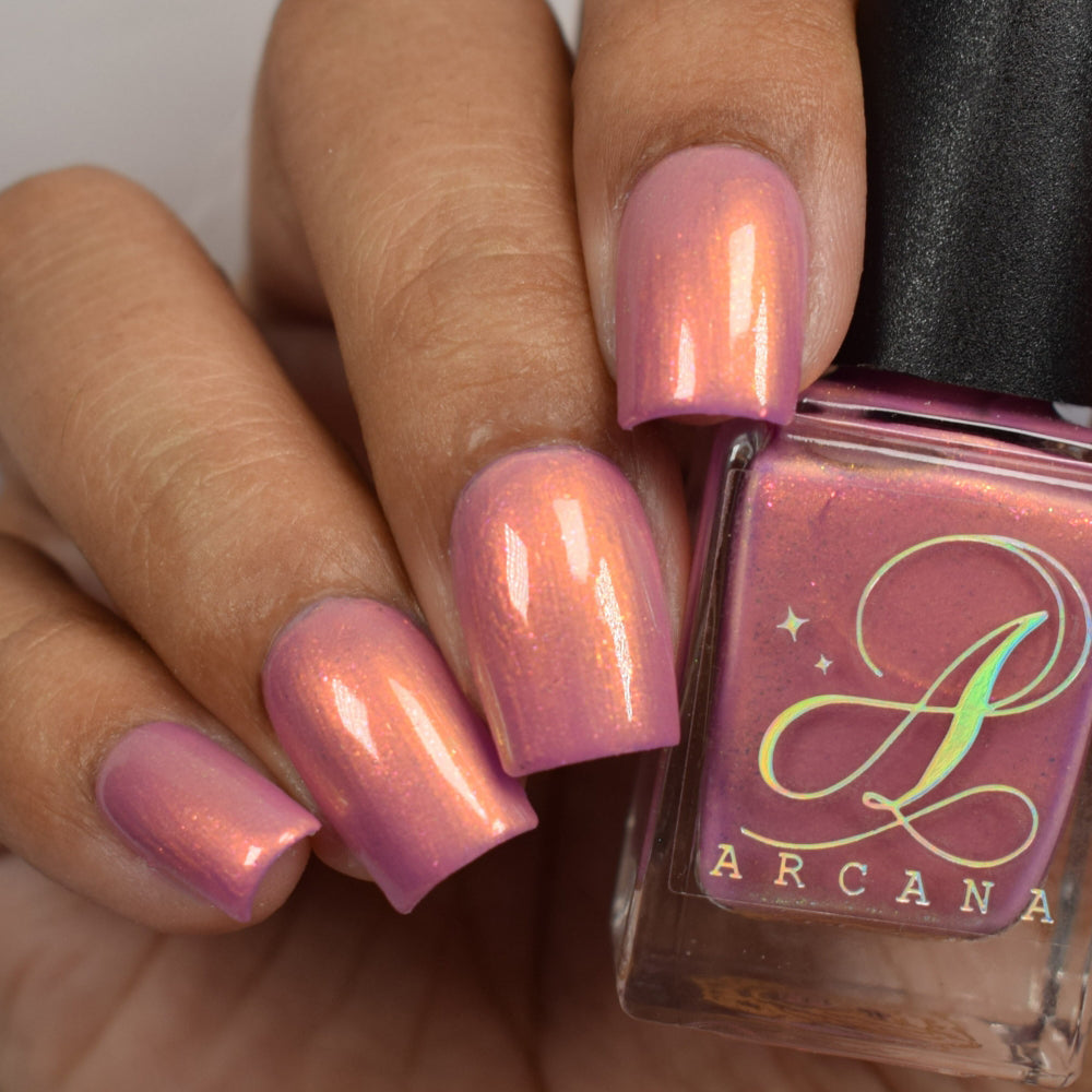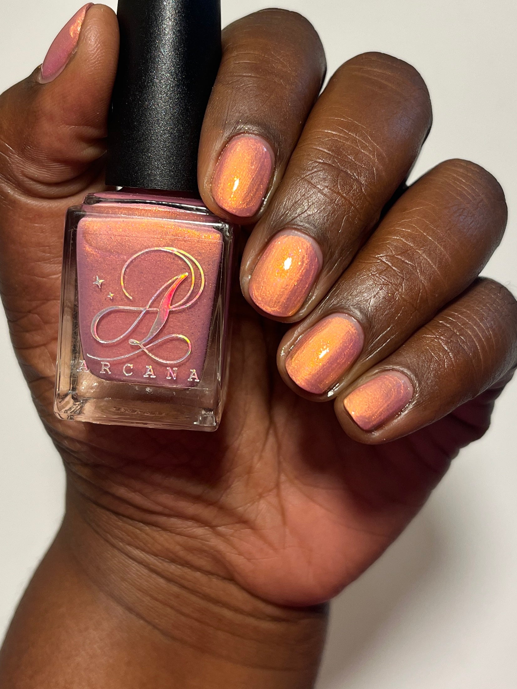 Predator in Pink has a muted coral base with a strong yellow to orange pearlescent shimmer and yellow-pink microflakes!