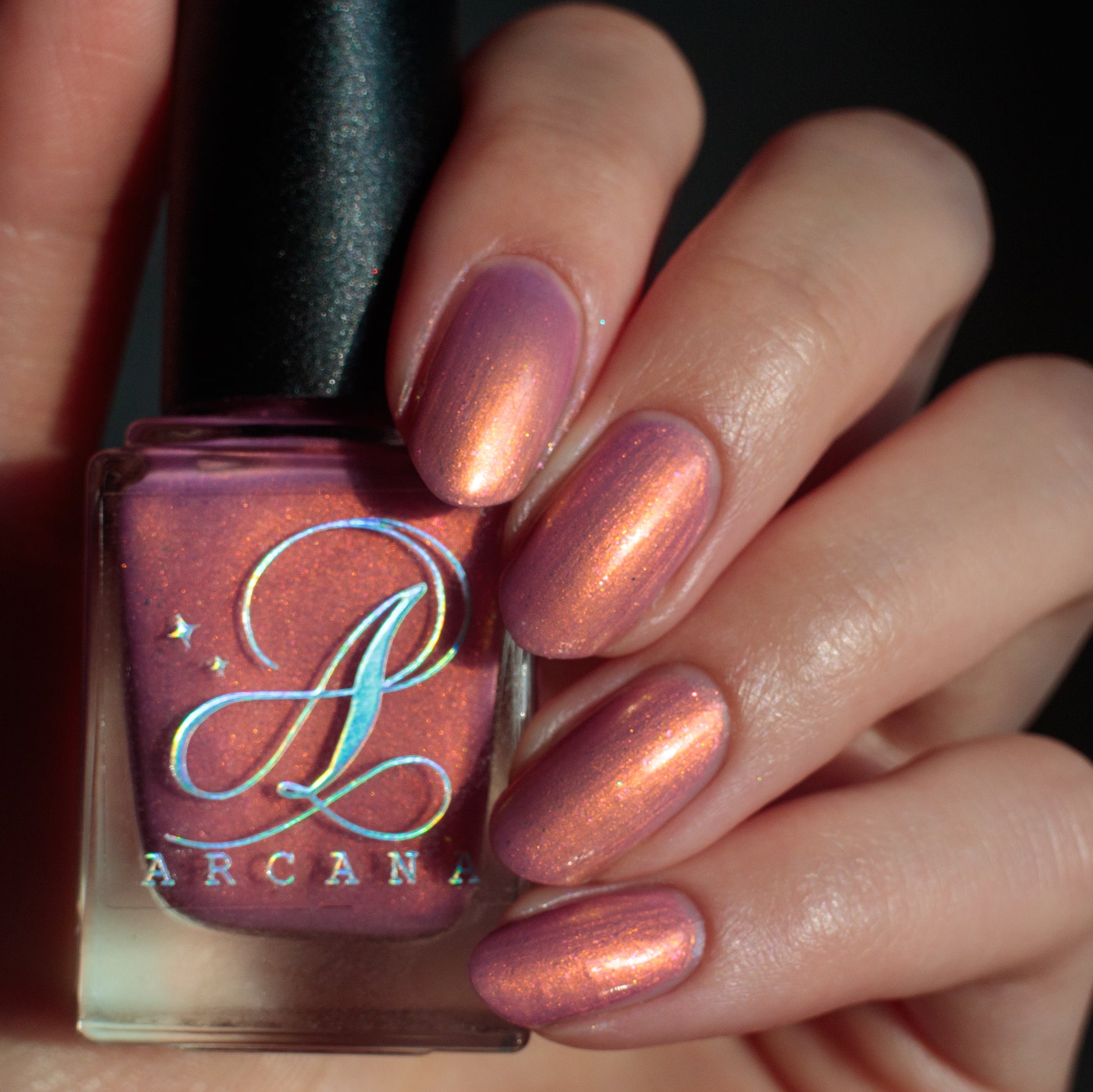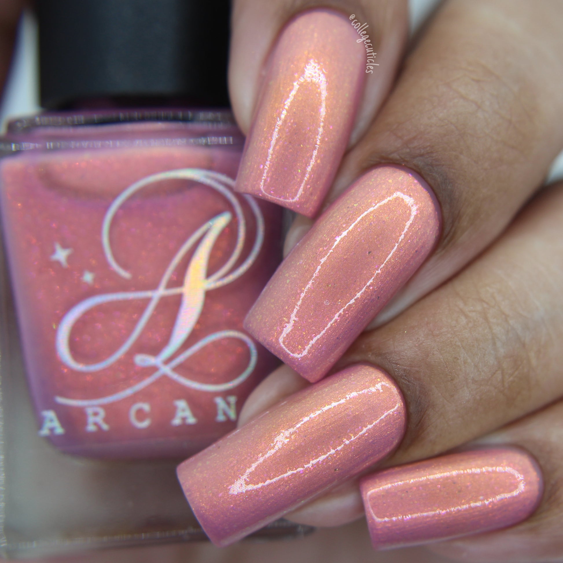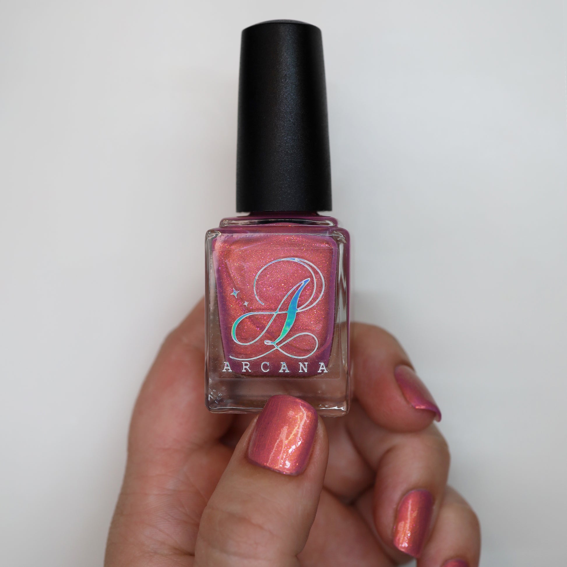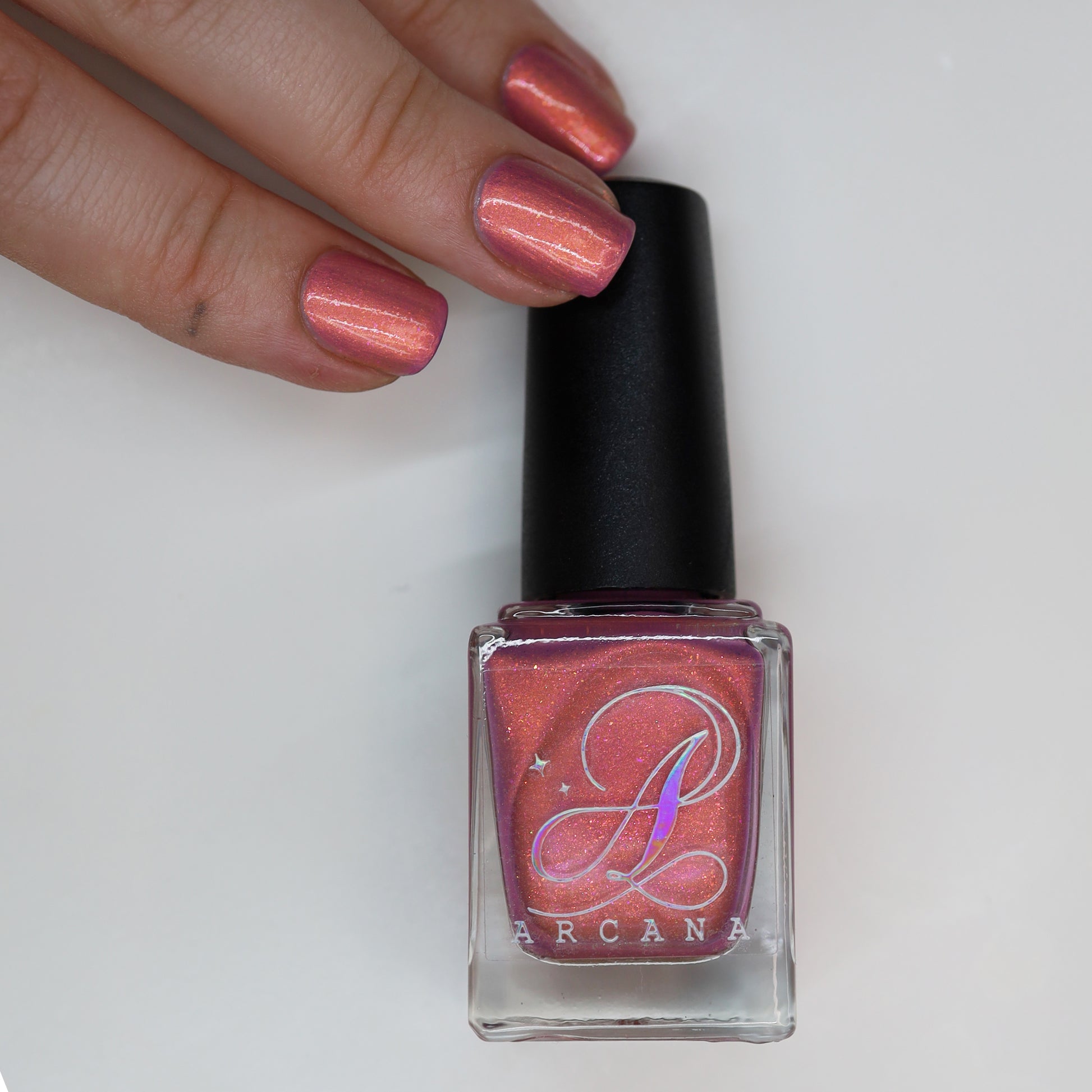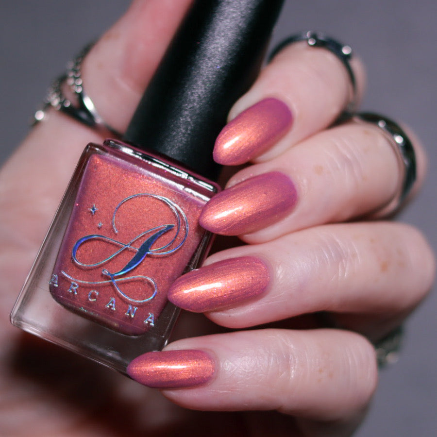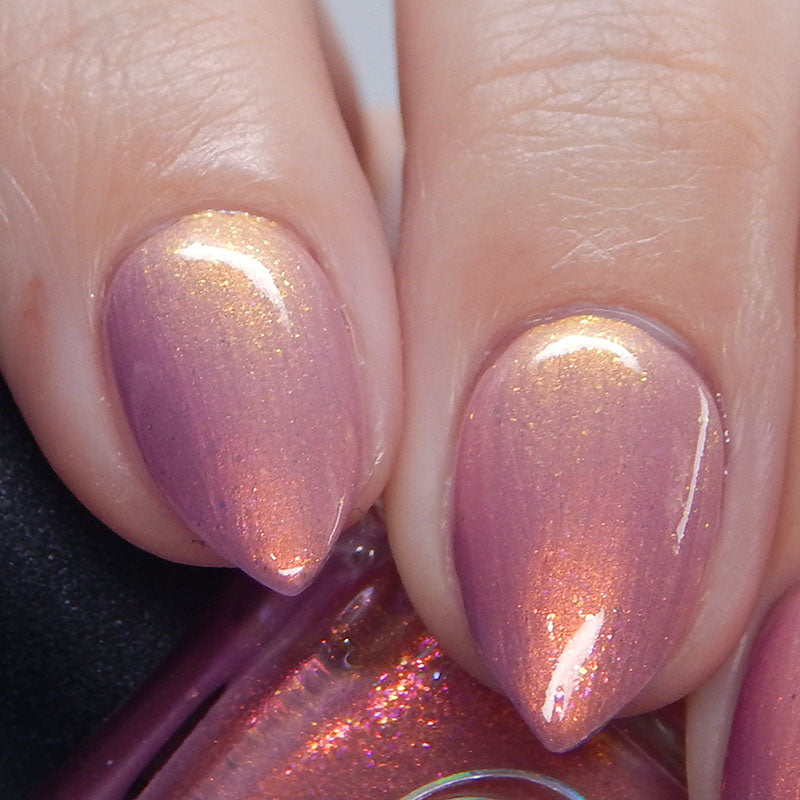 Predator in Pink has a muted coral base with a strong yellow to orange pearlescent shimmer and yellow-pink microflakes!