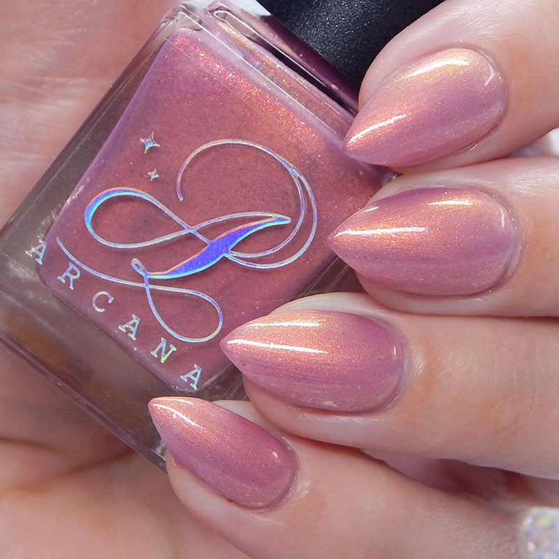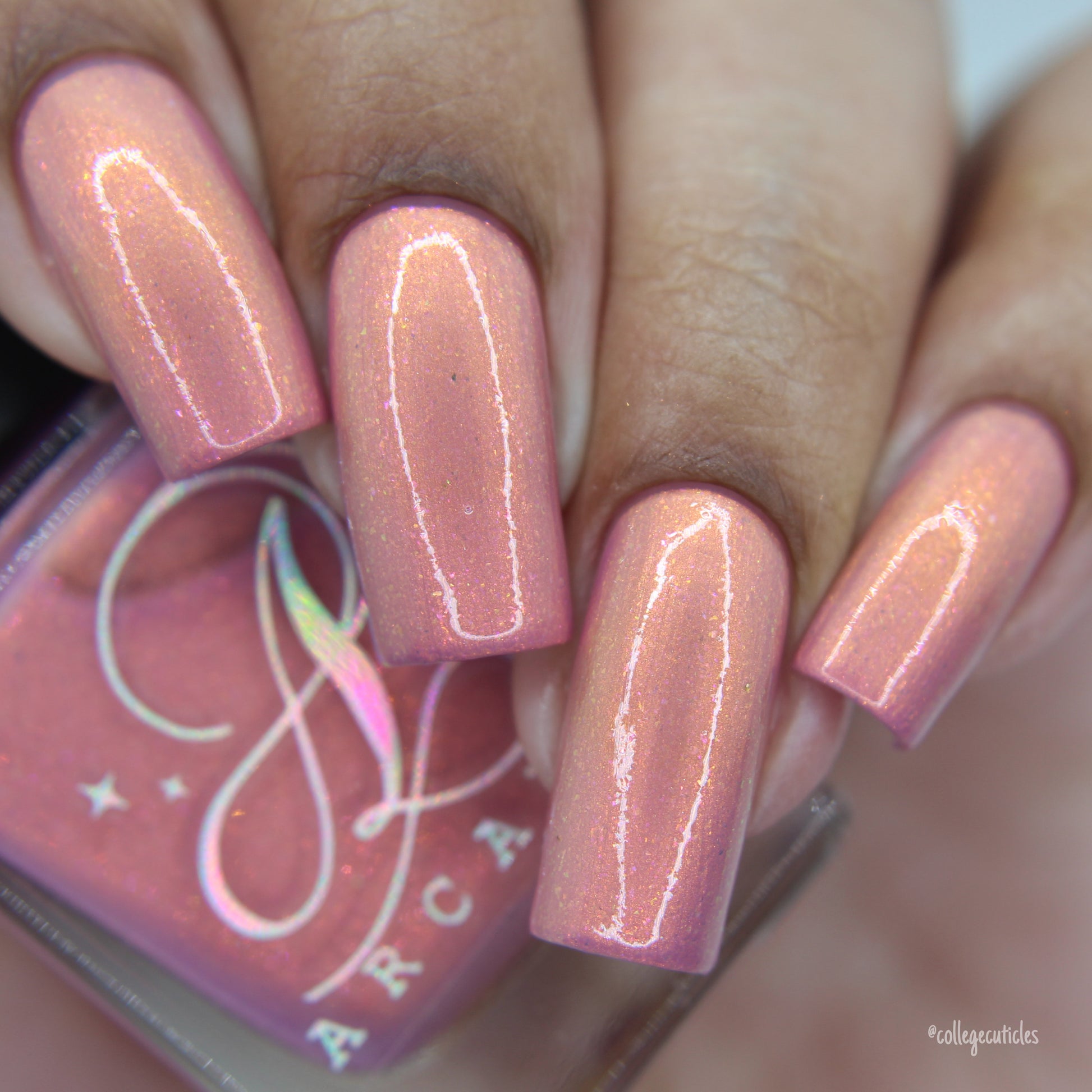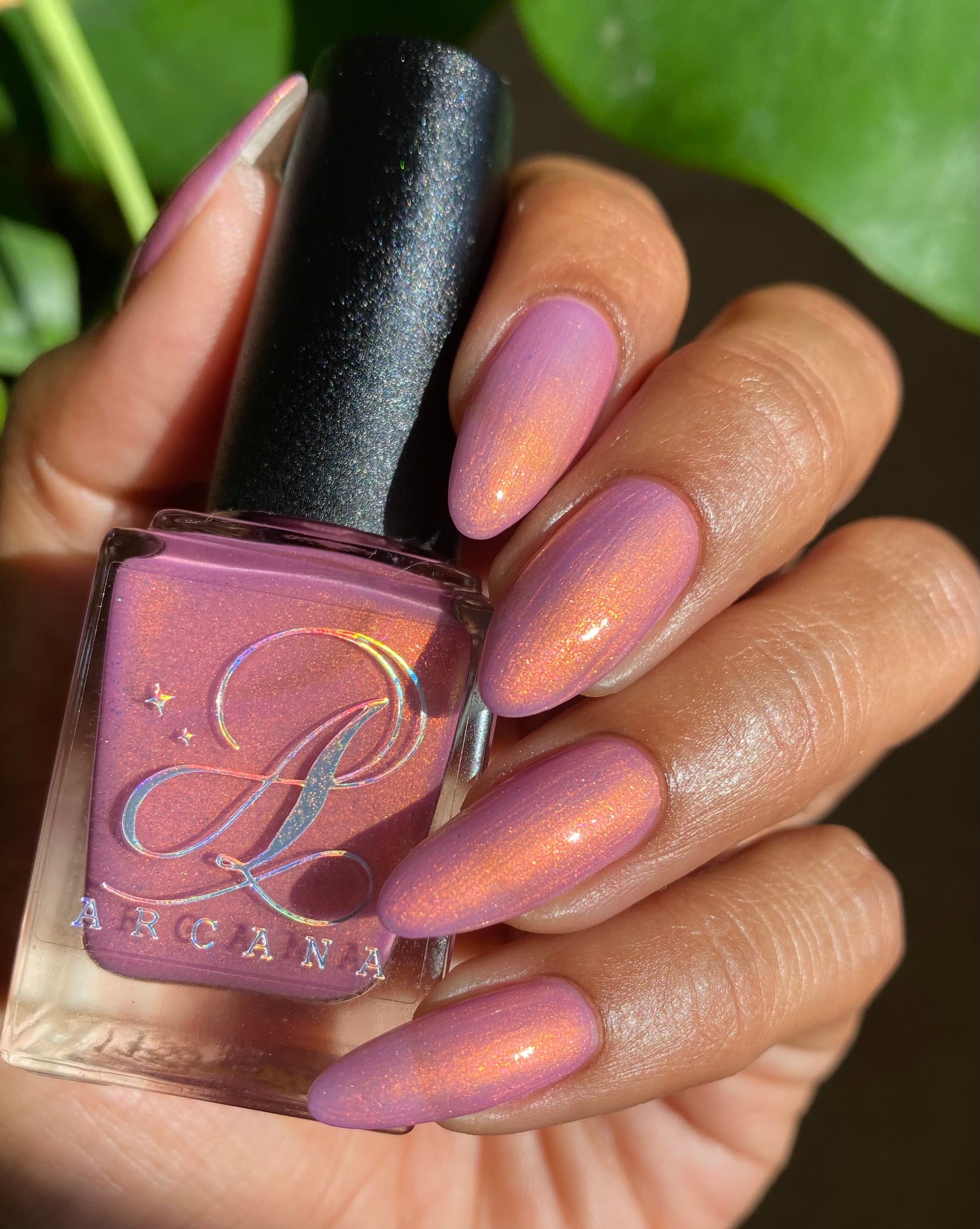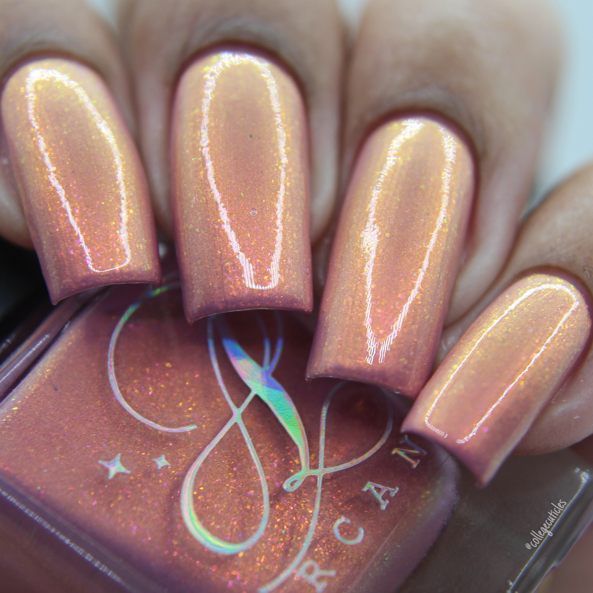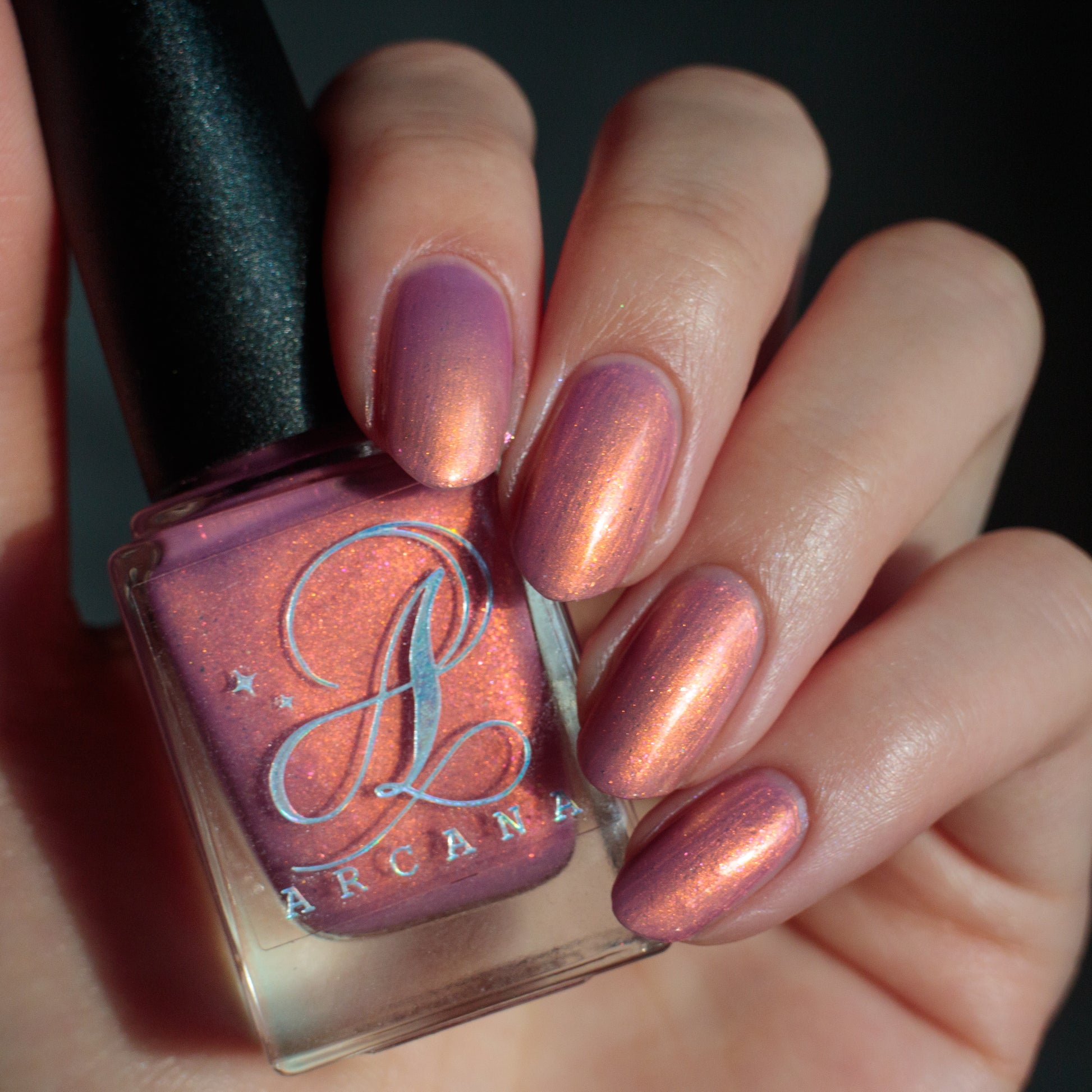 Predator in Pink has a muted coral base with a strong yellow to orange pearlescent shimmer and yellow-pink microflakes!