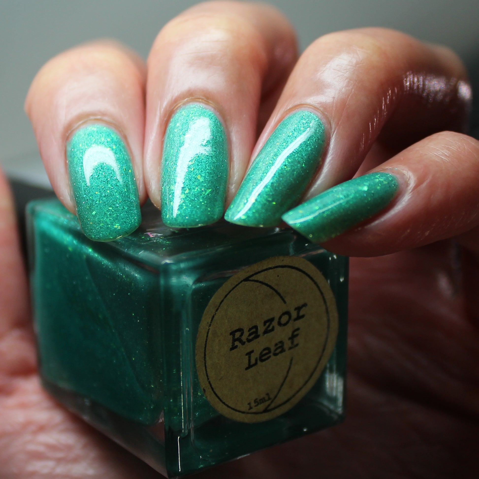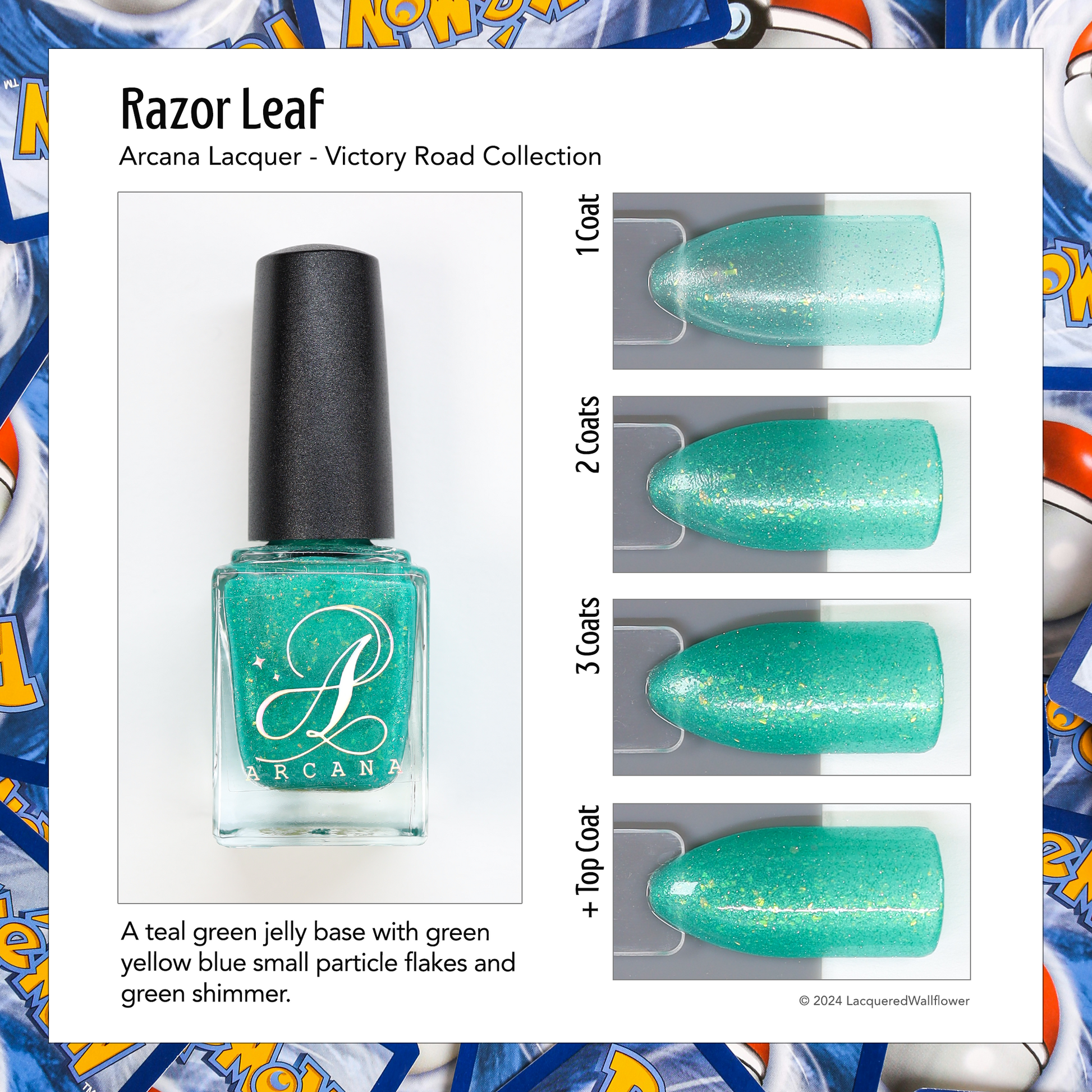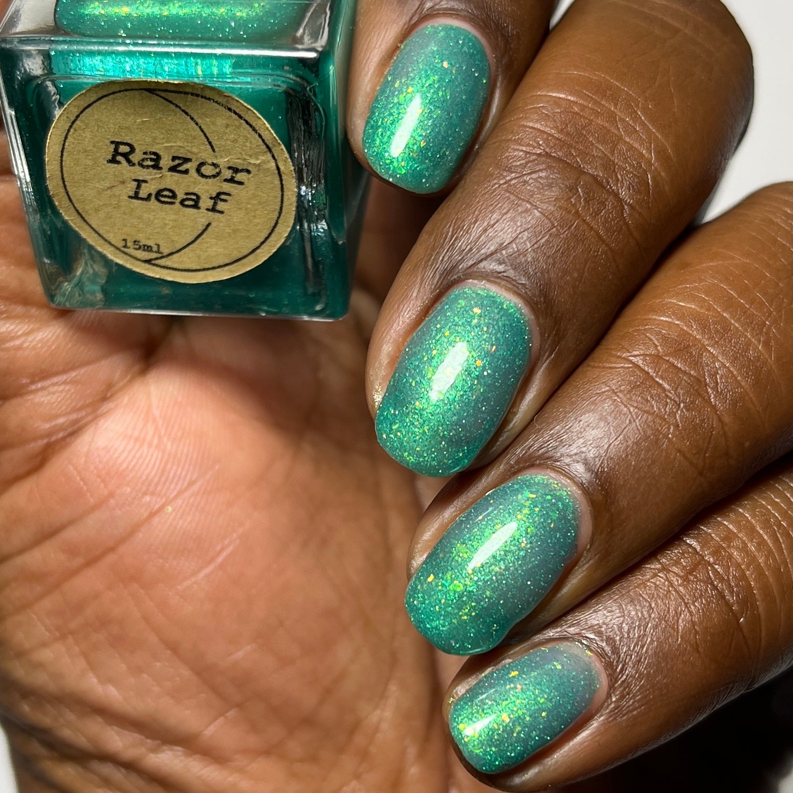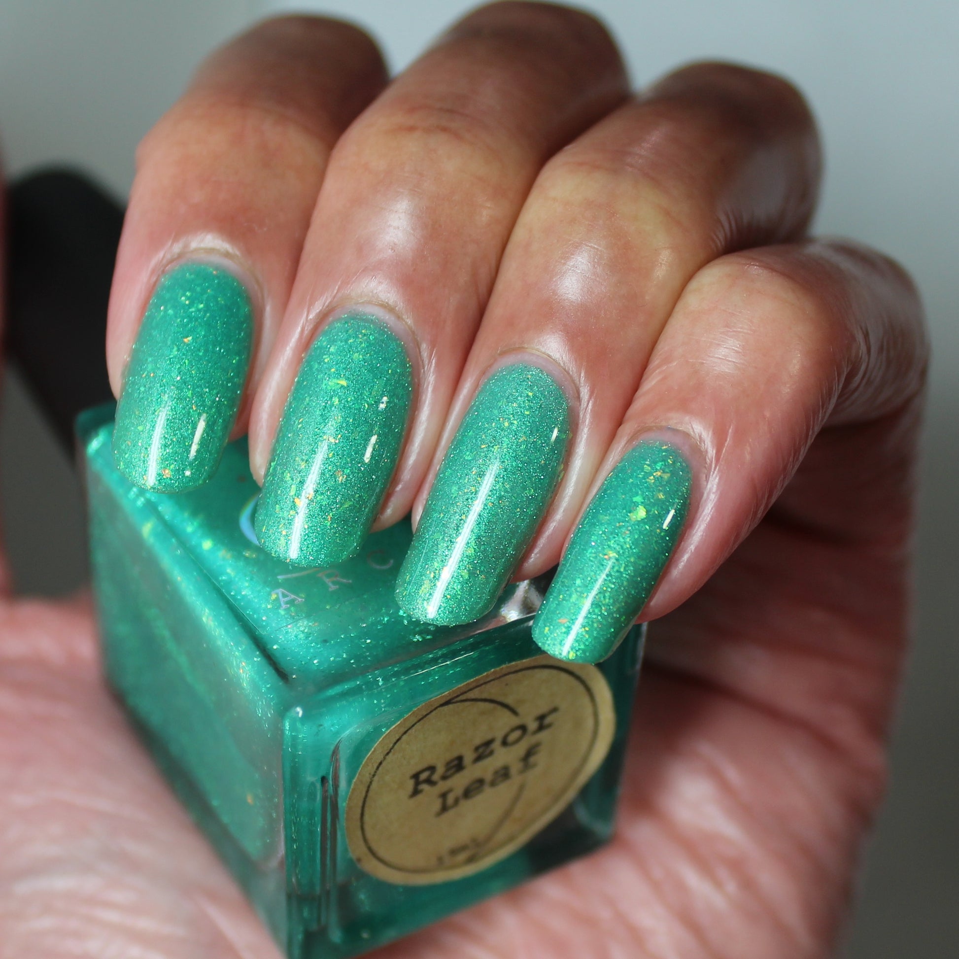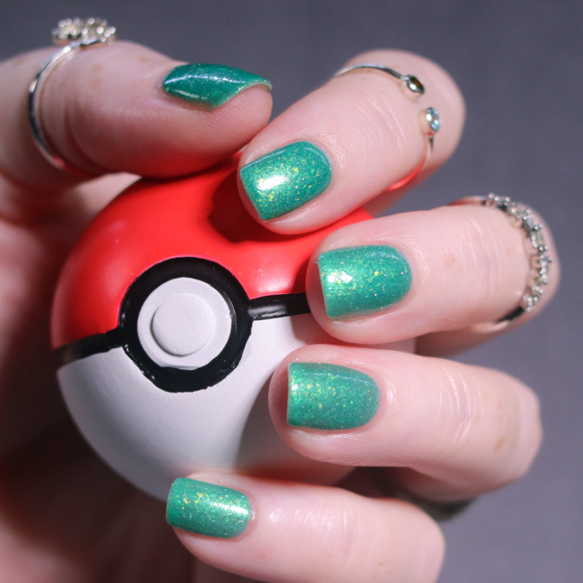 Razor Leaf has a teal base with green to blue to yellow metallic shimmer, green to yellow flakes, and green reflective glitter! This polish is inspired by Bulbasaur!
