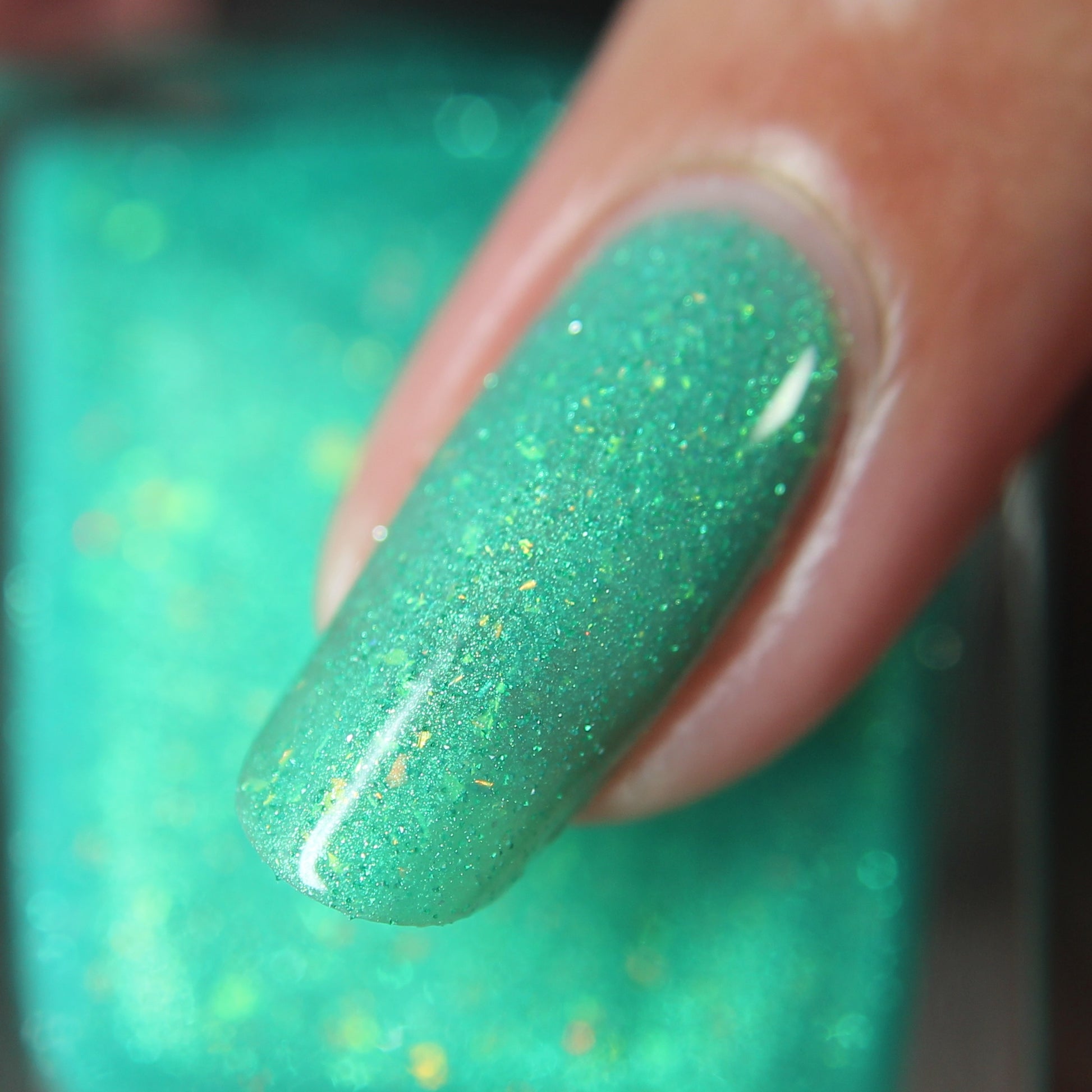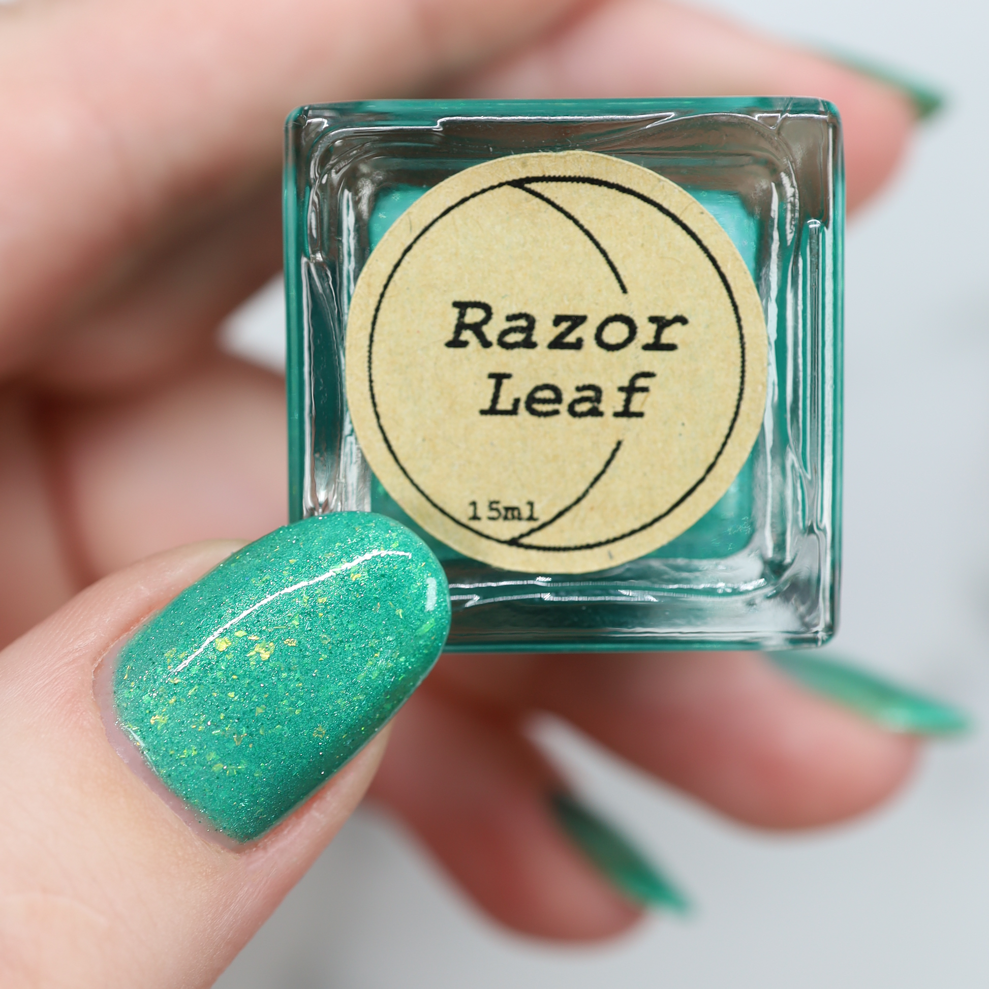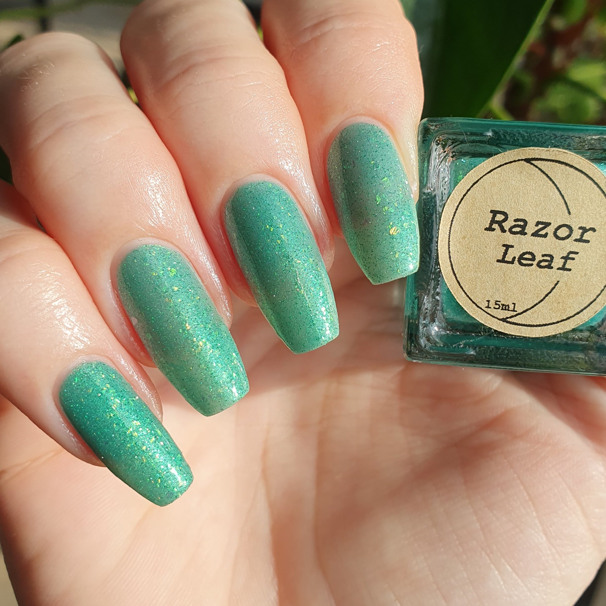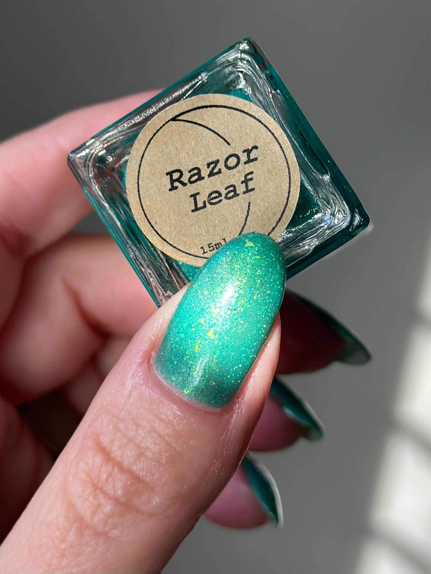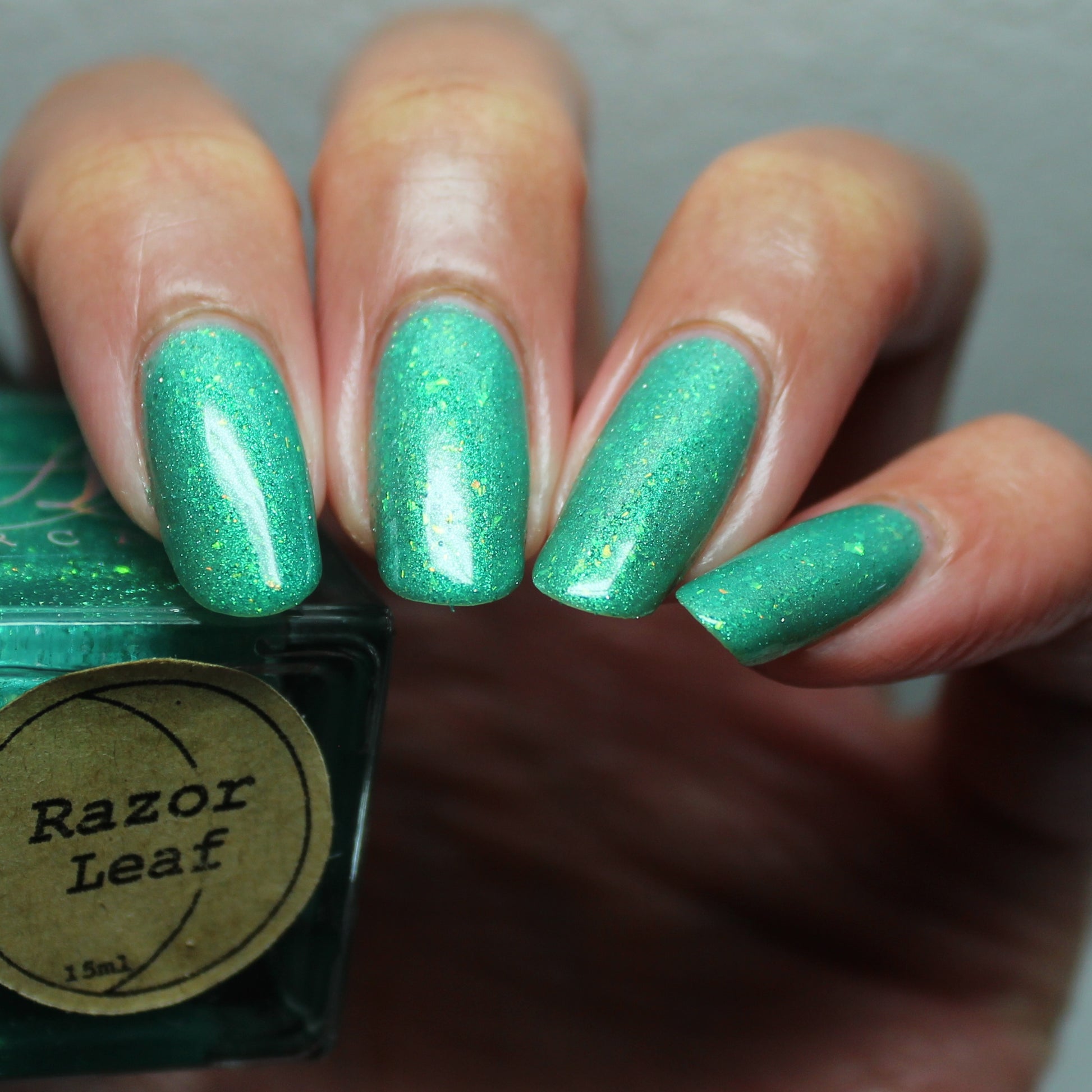 Razor Leaf has a teal base with green to blue to yellow metallic shimmer, green to yellow flakes, and green reflective glitter! This polish is inspired by Bulbasaur!