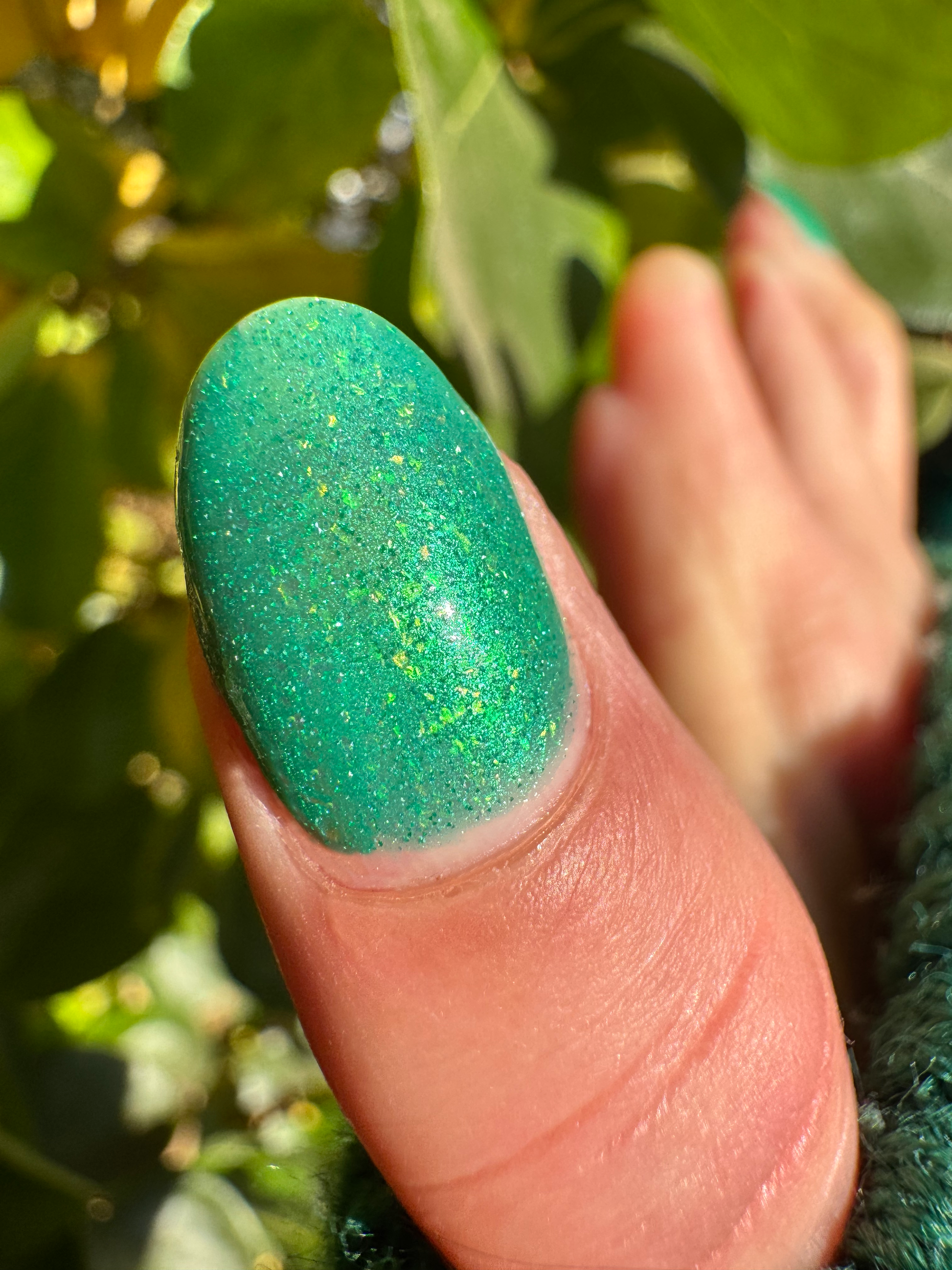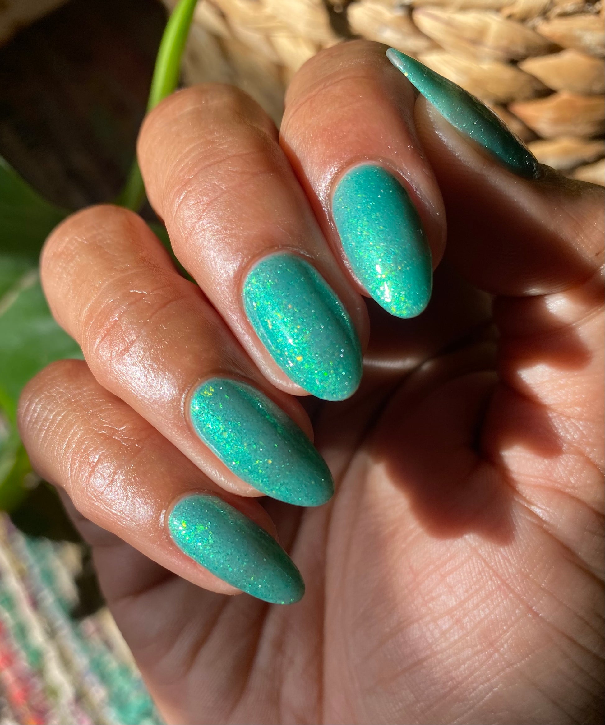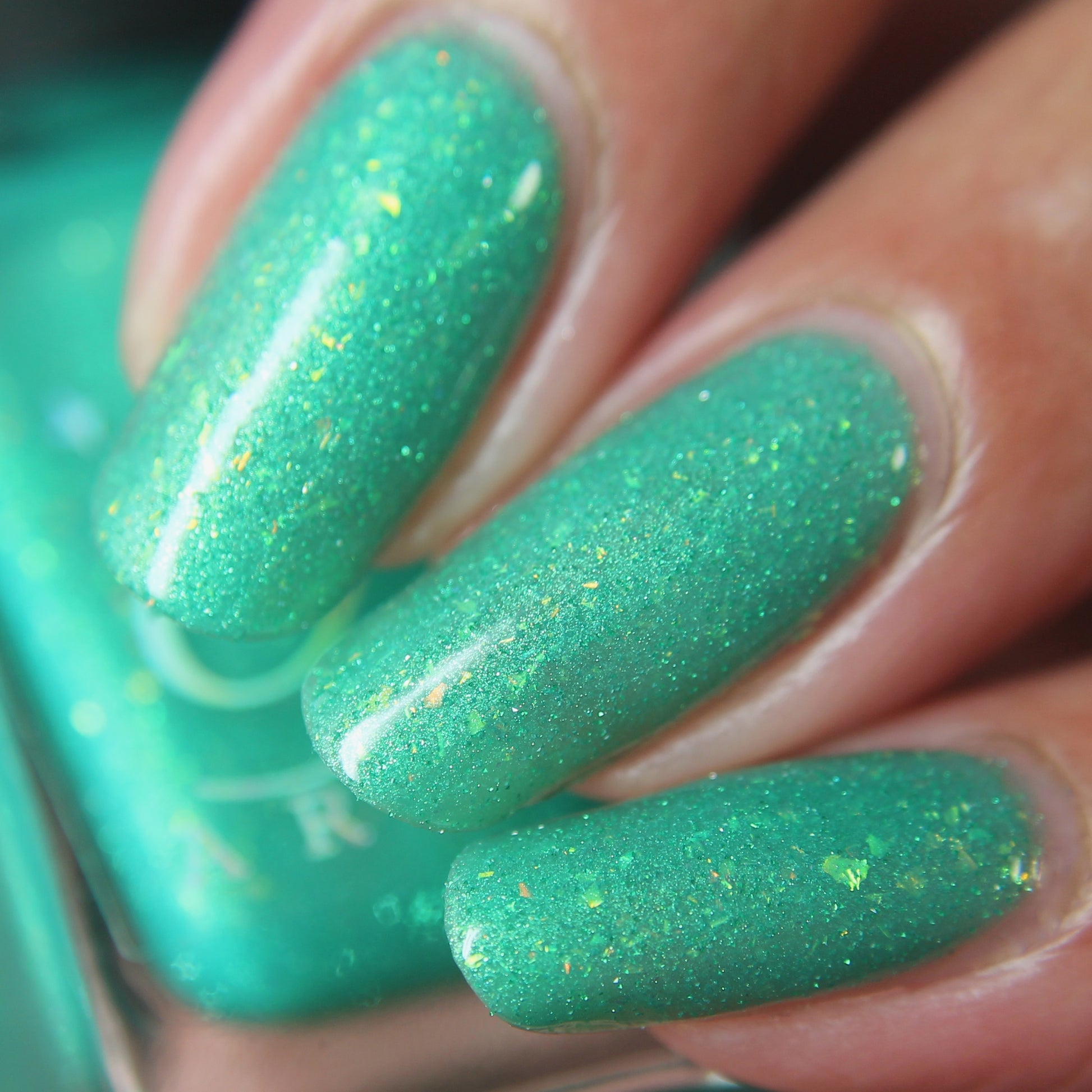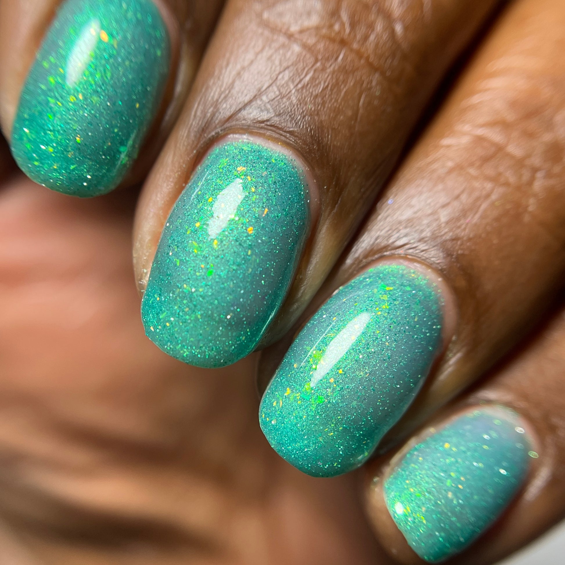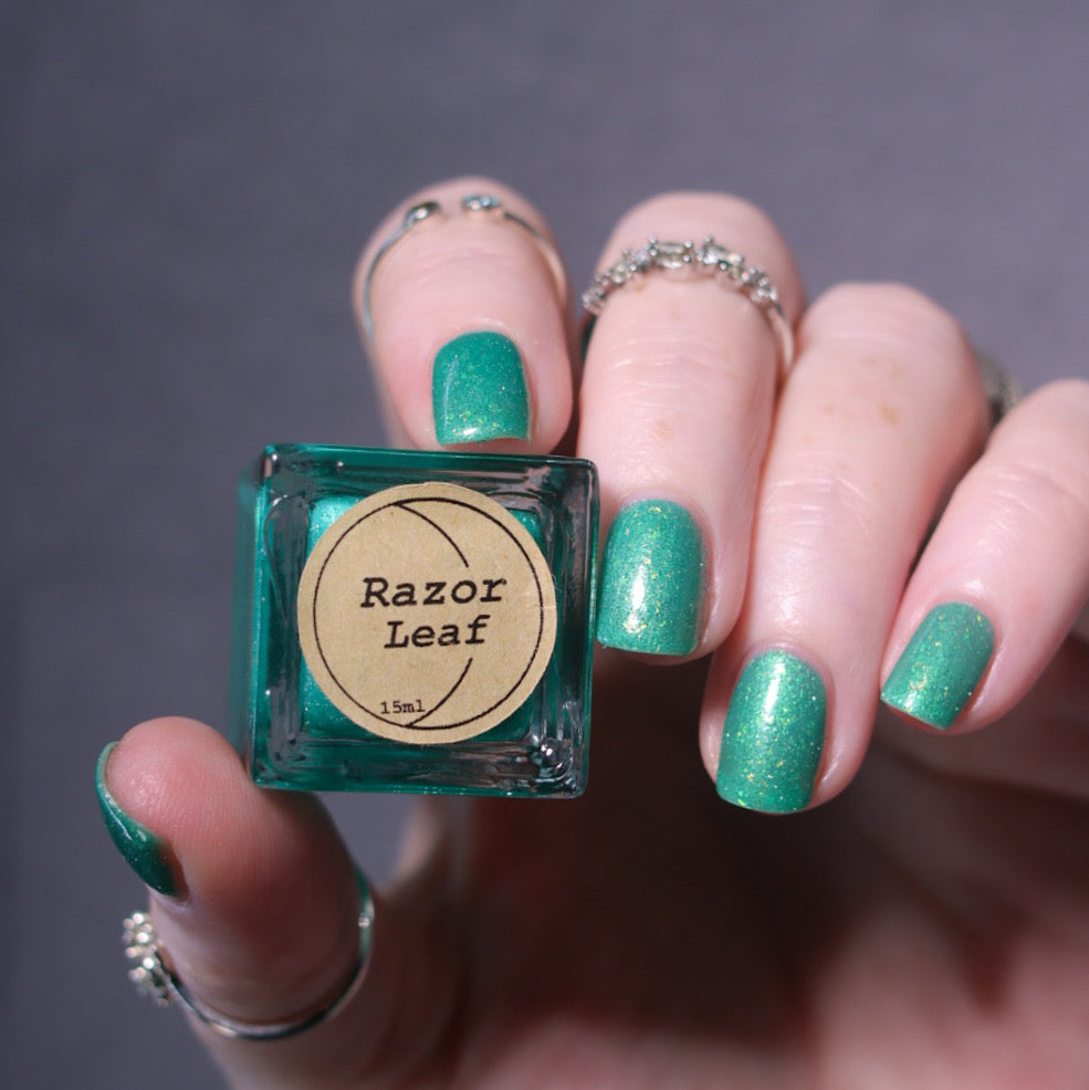 Razor Leaf has a teal base with green to blue to yellow metallic shimmer, green to yellow flakes, and green reflective glitter! This polish is inspired by Bulbasaur!