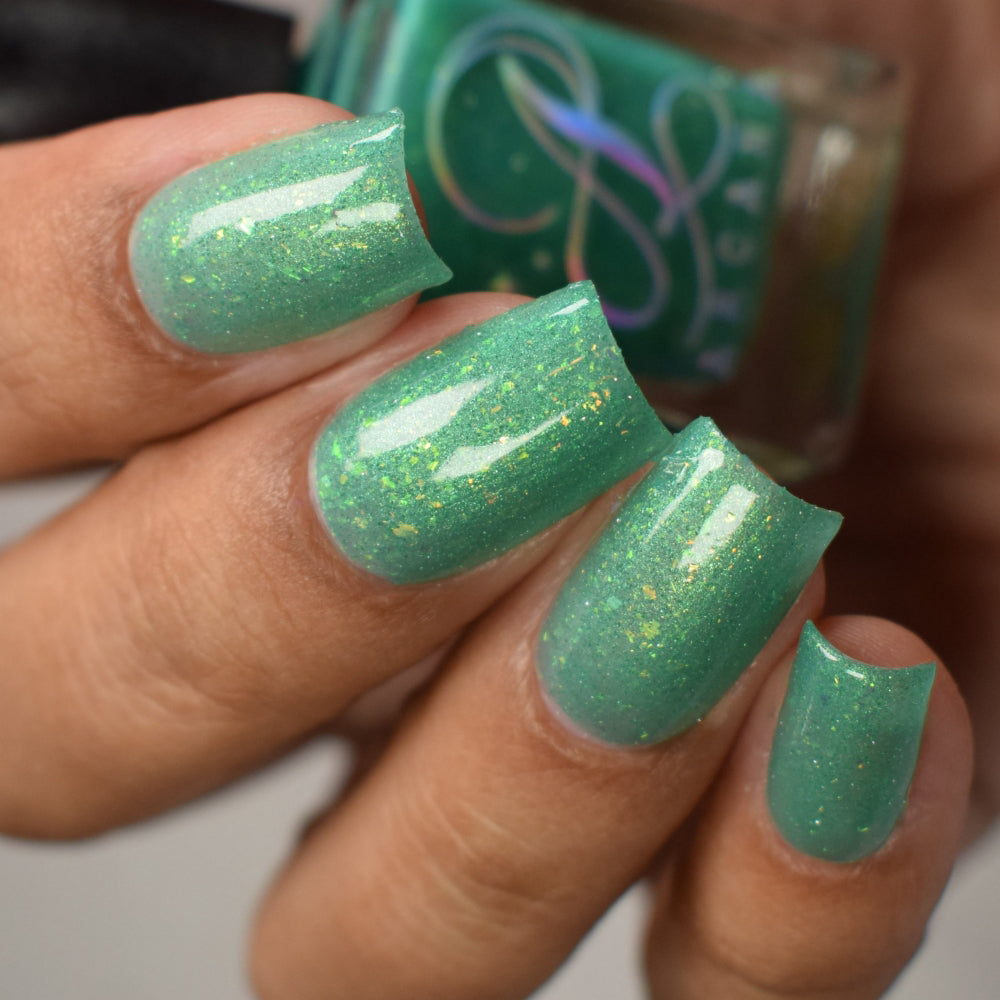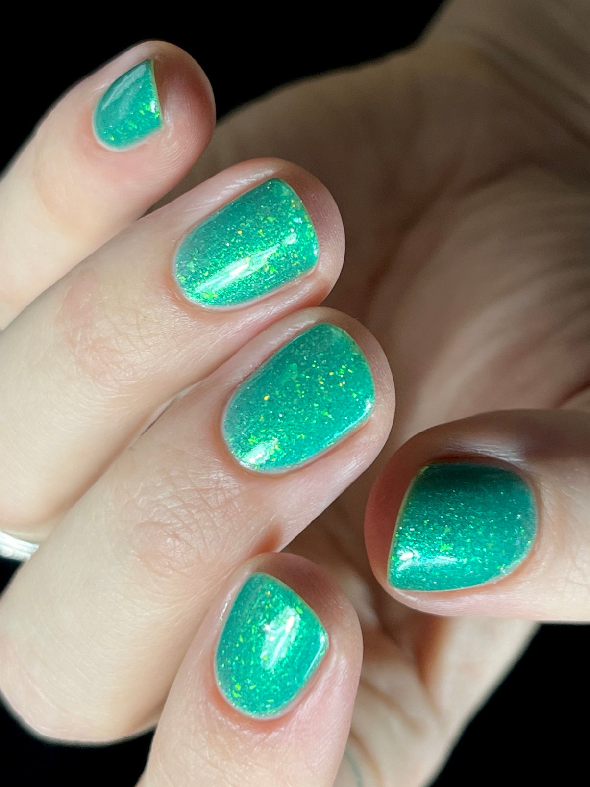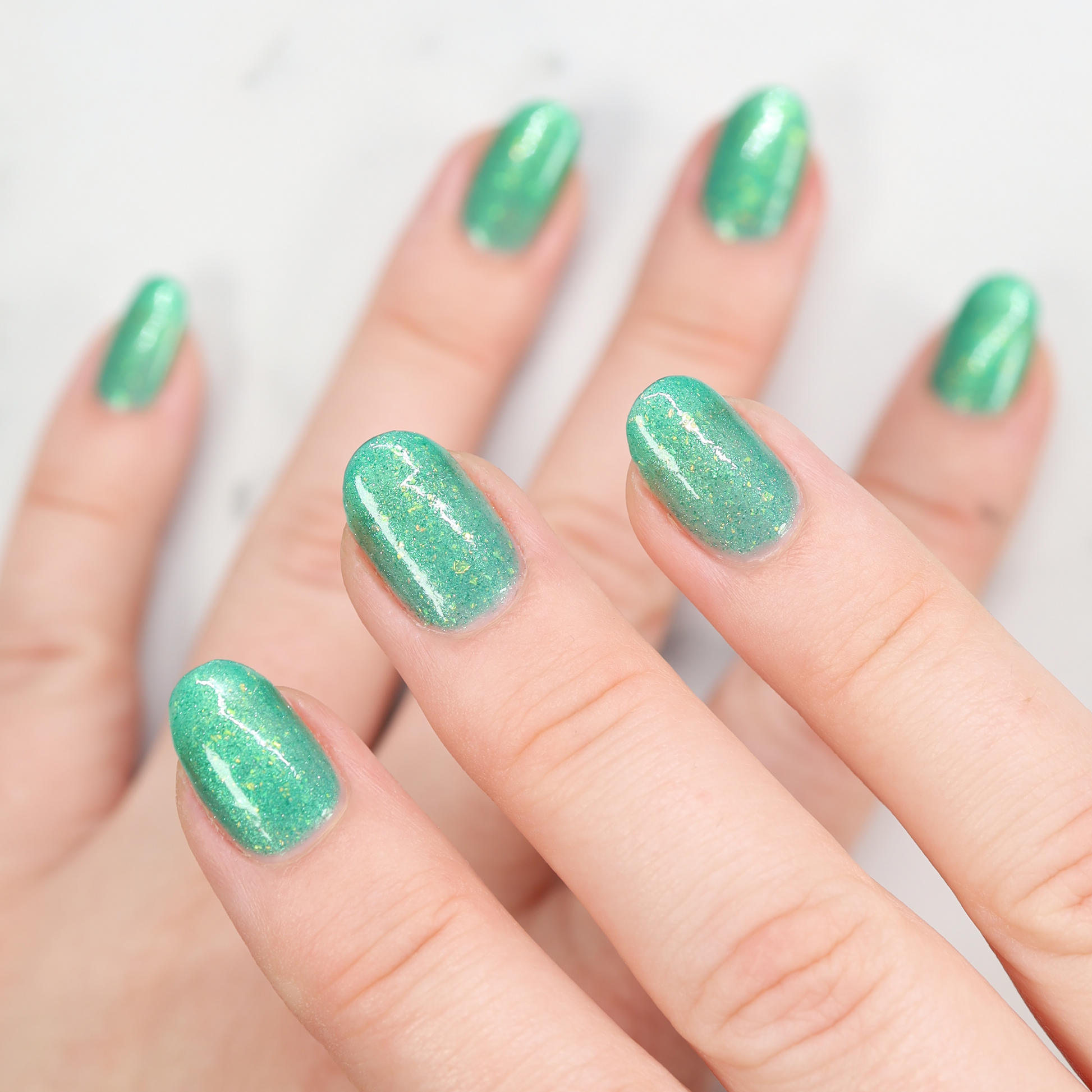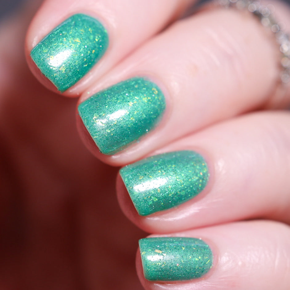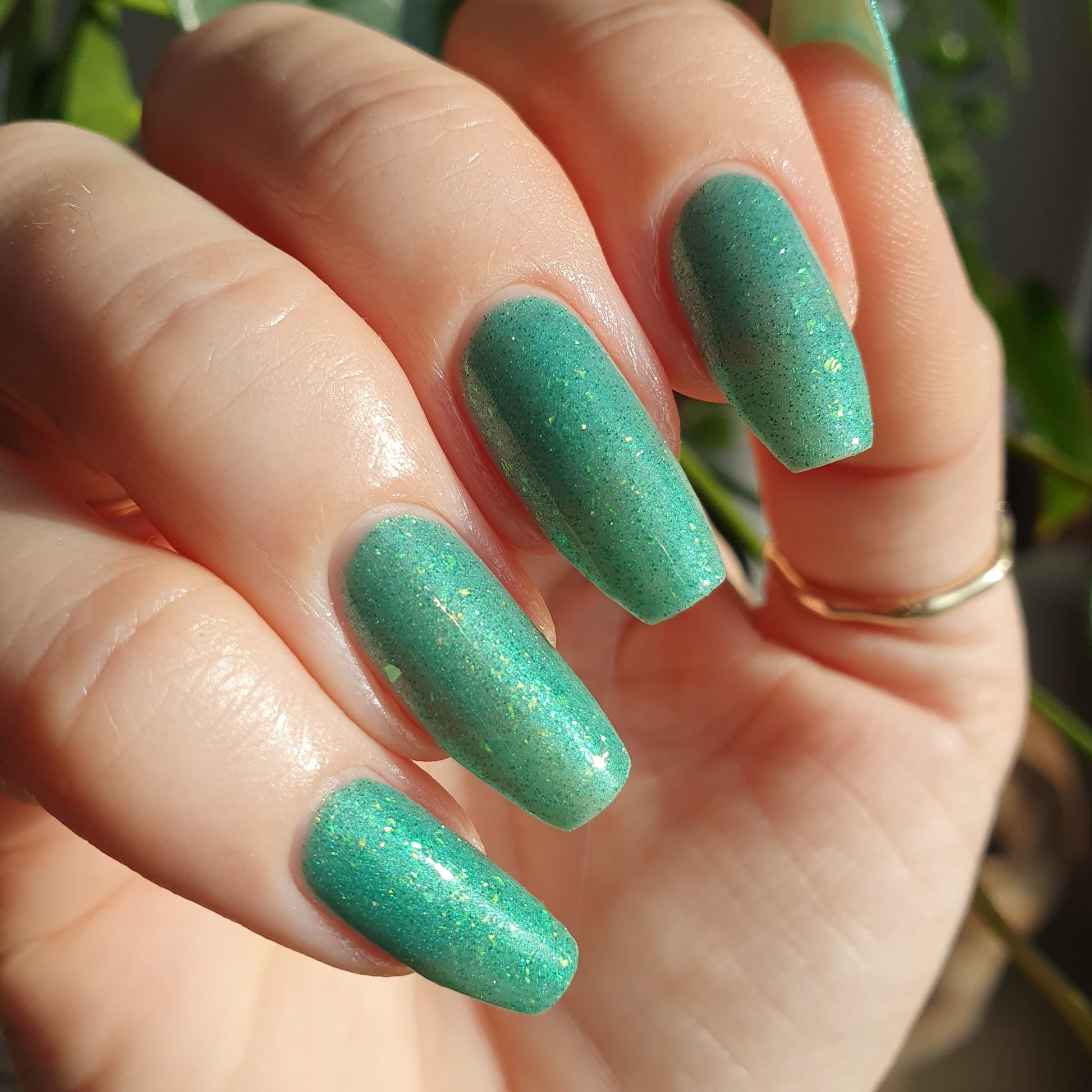 Razor Leaf has a teal base with green to blue to yellow metallic shimmer, green to yellow flakes, and green reflective glitter! This polish is inspired by Bulbasaur!