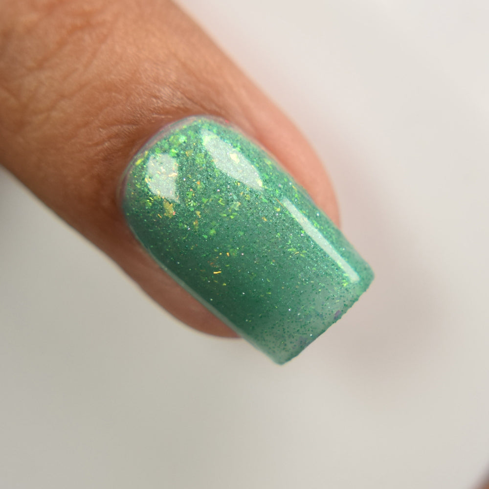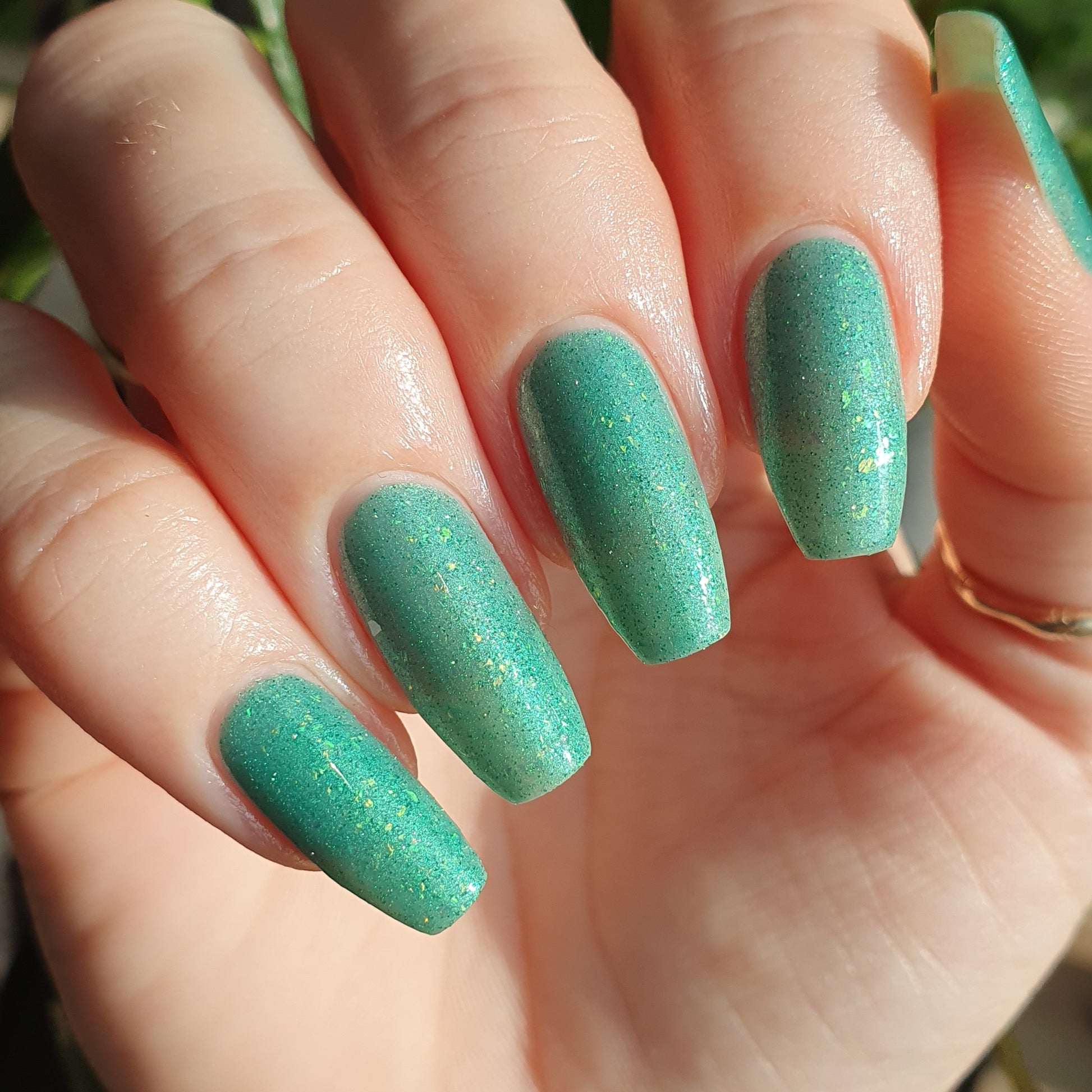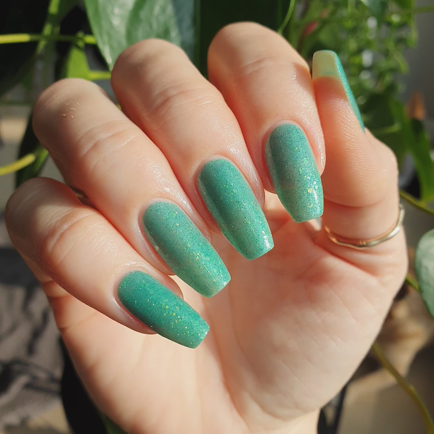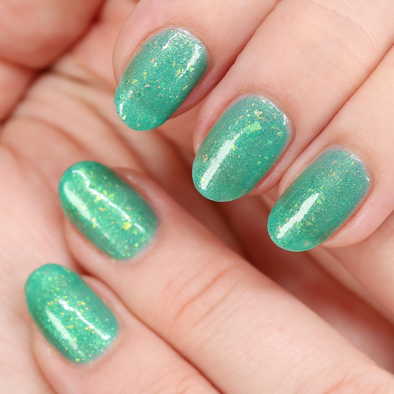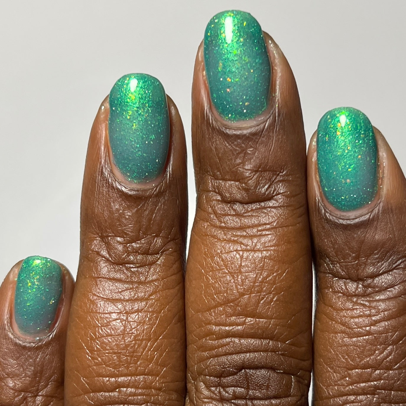 Razor Leaf has a teal base with green to blue to yellow metallic shimmer, green to yellow flakes, and green reflective glitter! This polish is inspired by Bulbasaur!