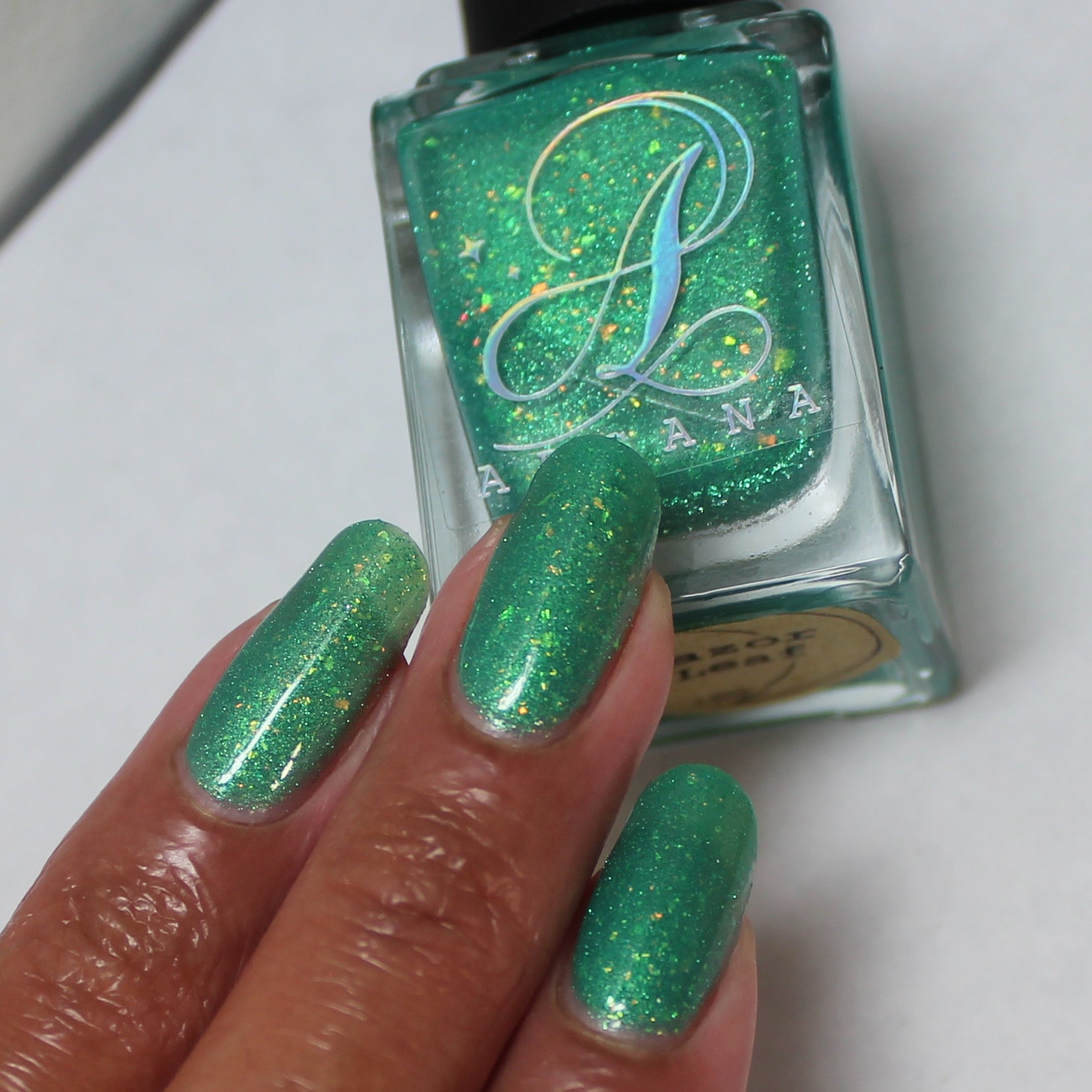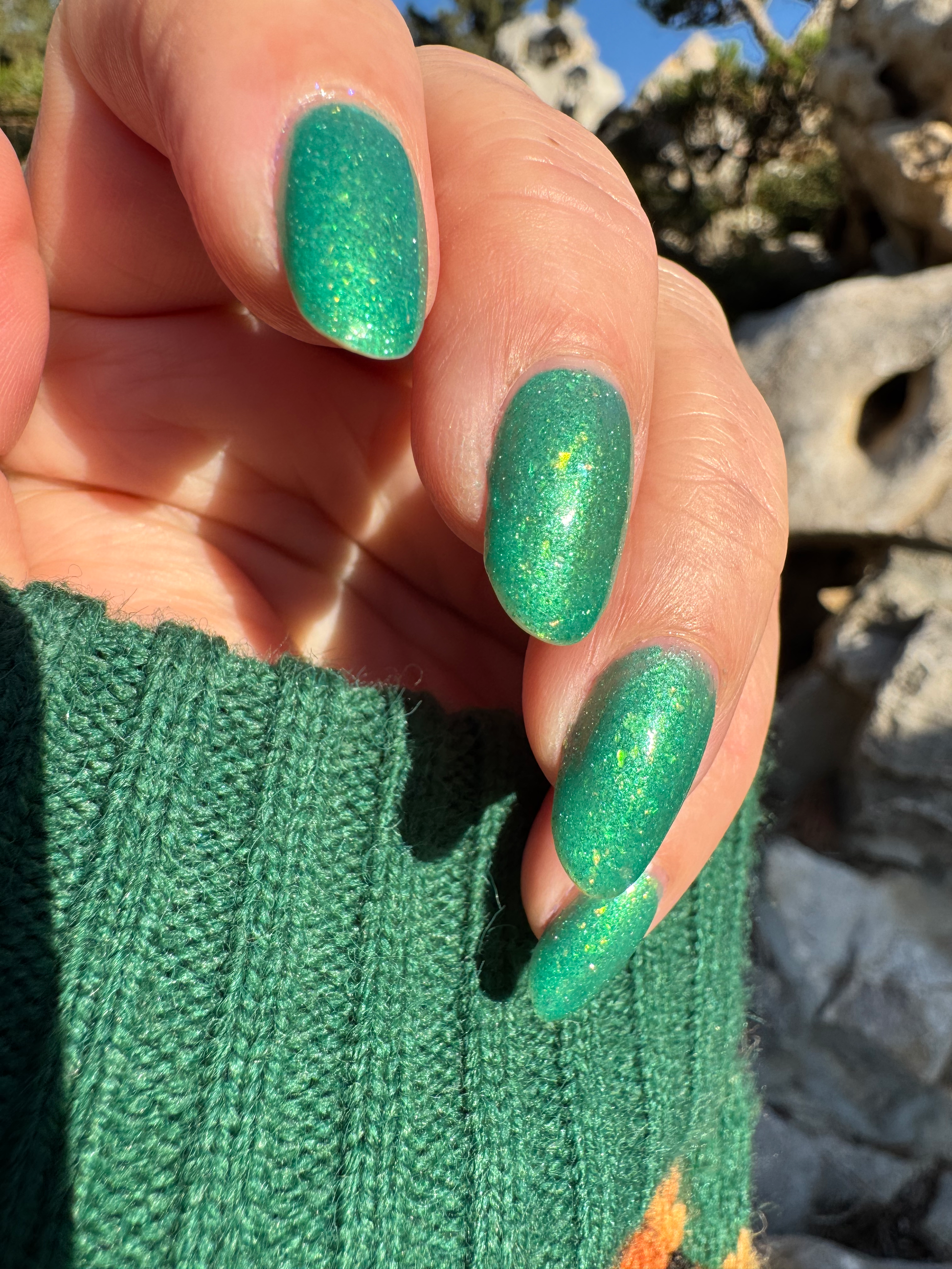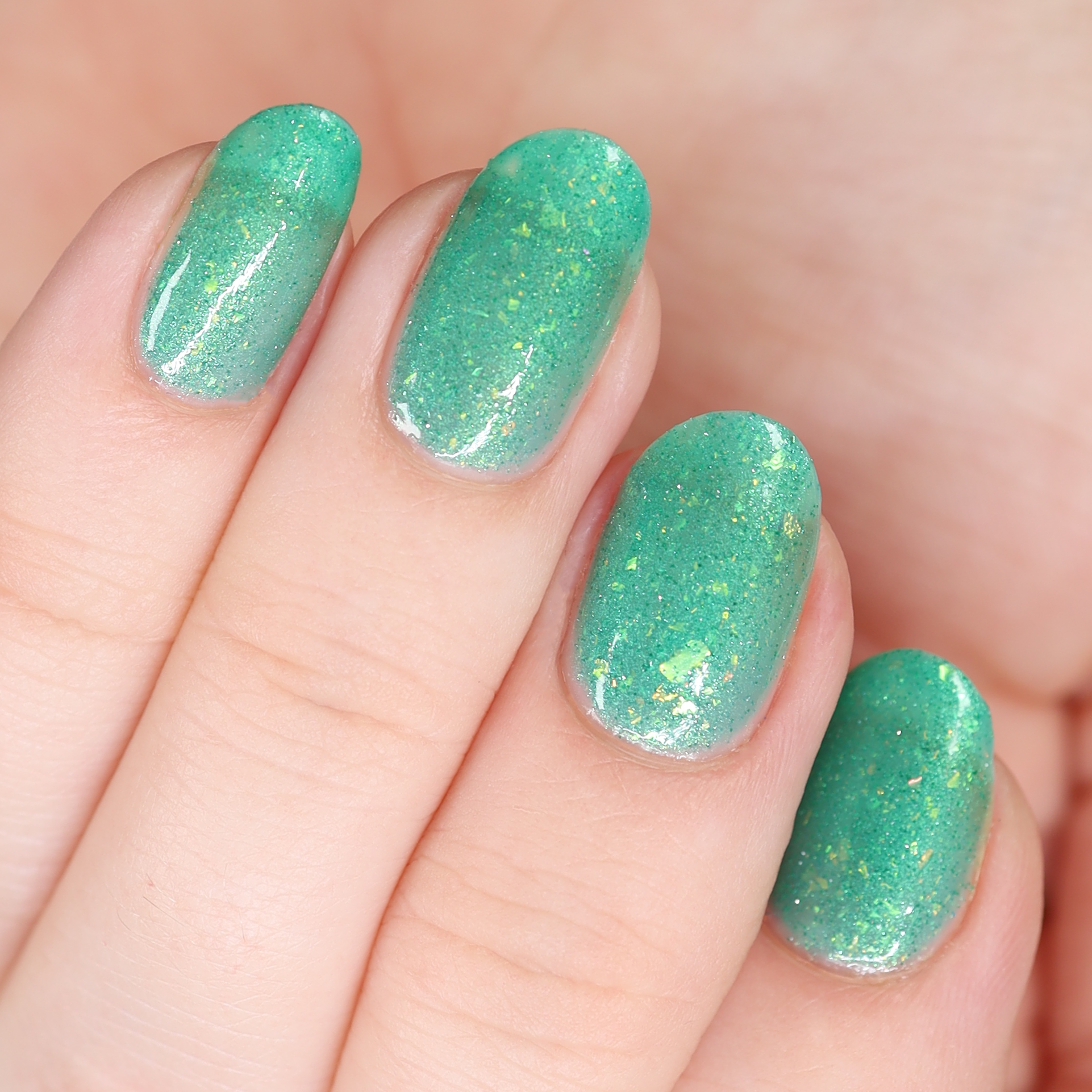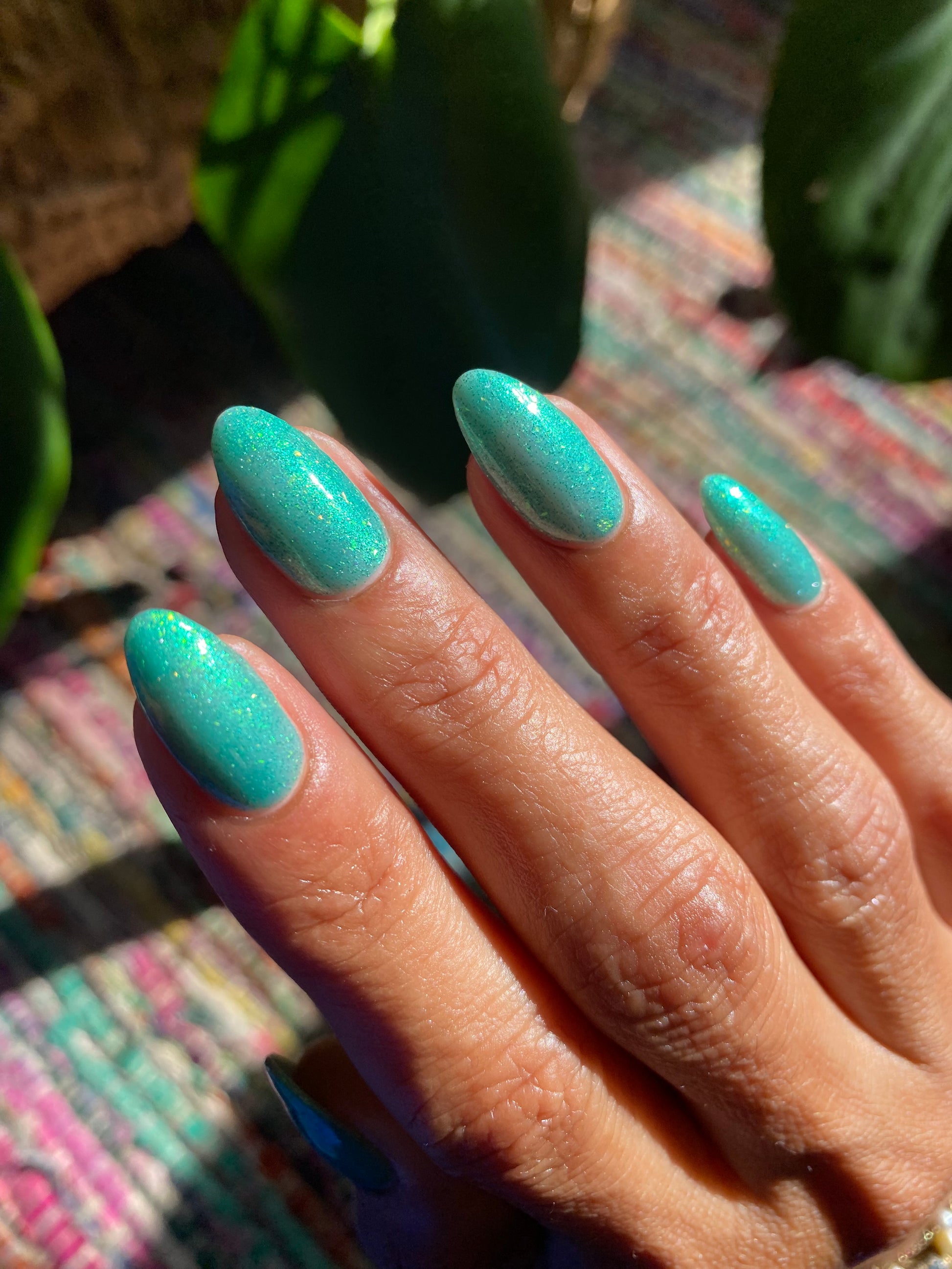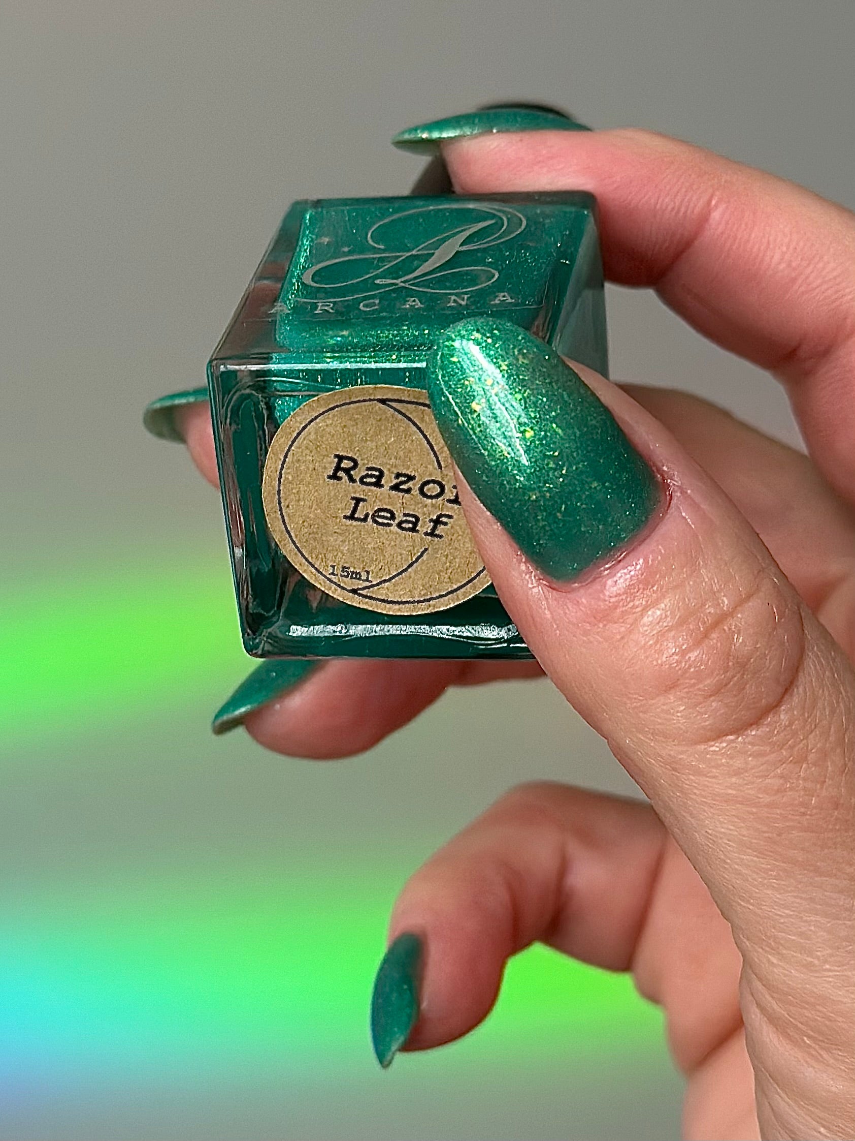 Razor Leaf has a teal base with green to blue to yellow metallic shimmer, green to yellow flakes, and green reflective glitter! This polish is inspired by Bulbasaur!