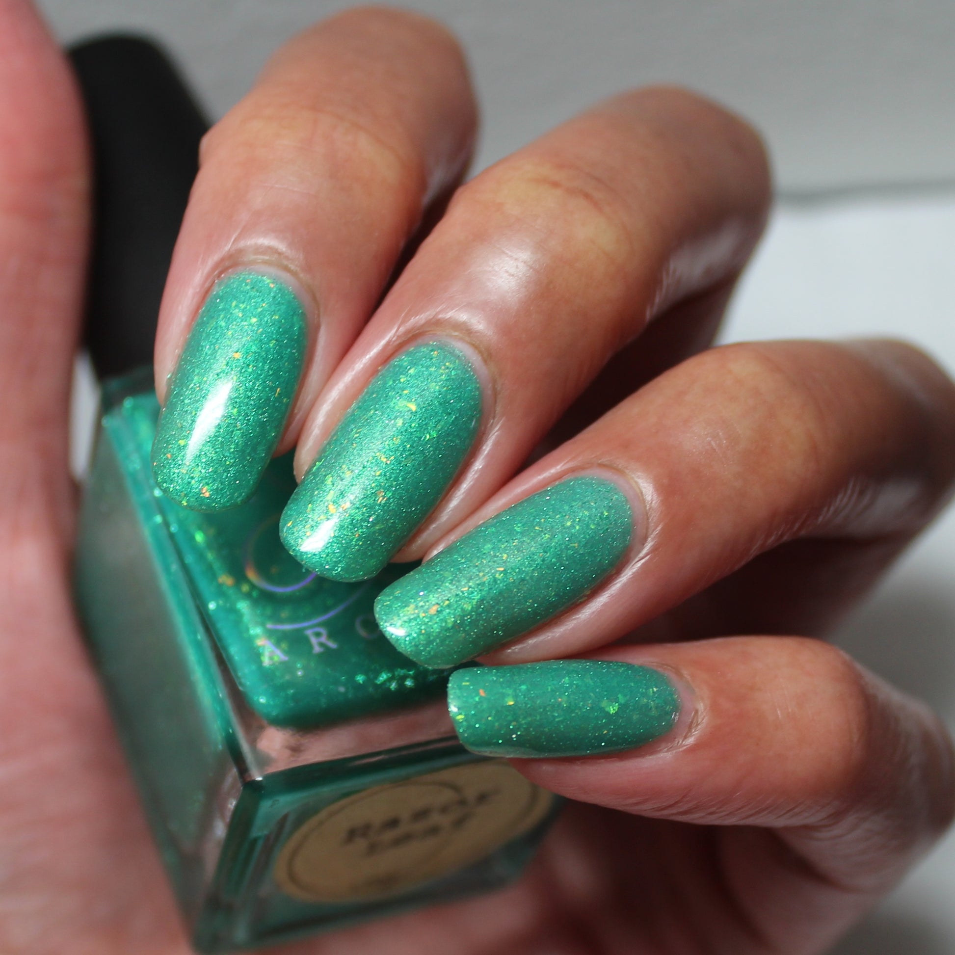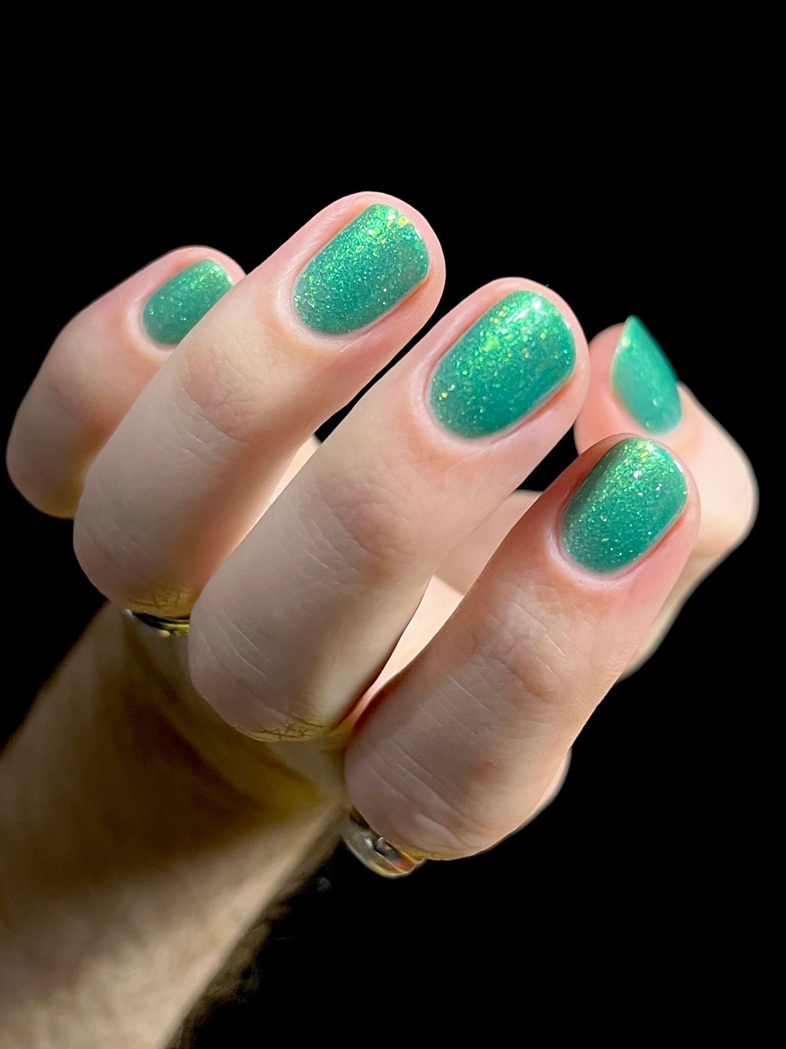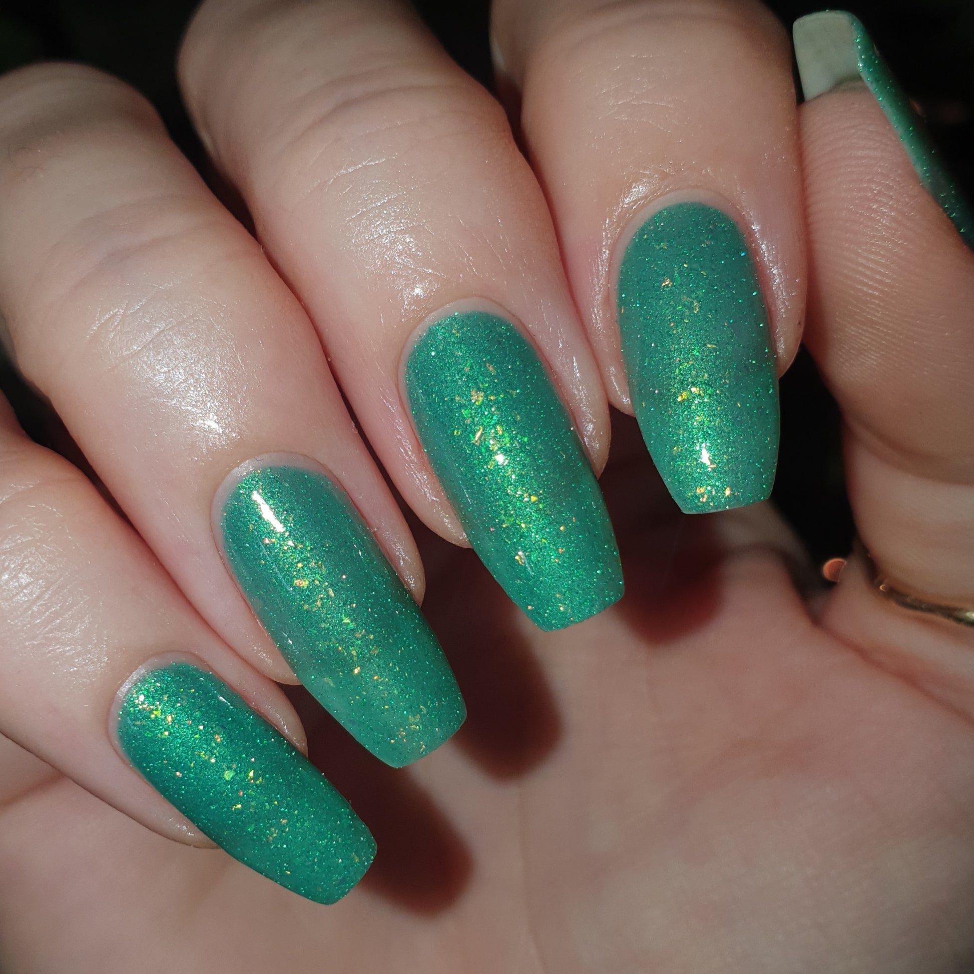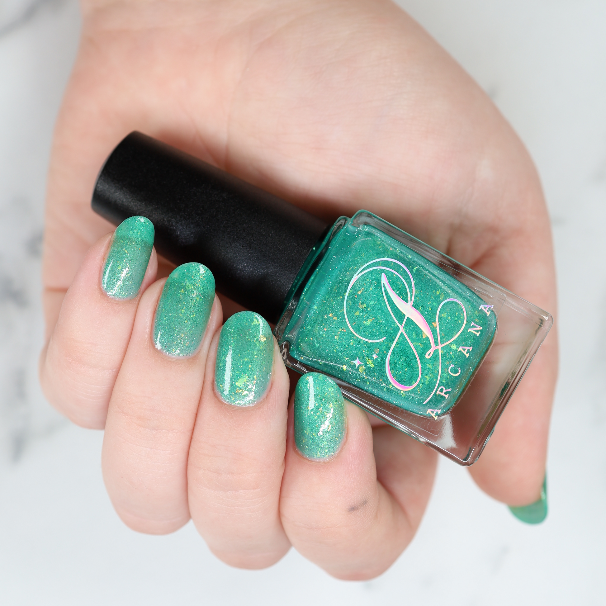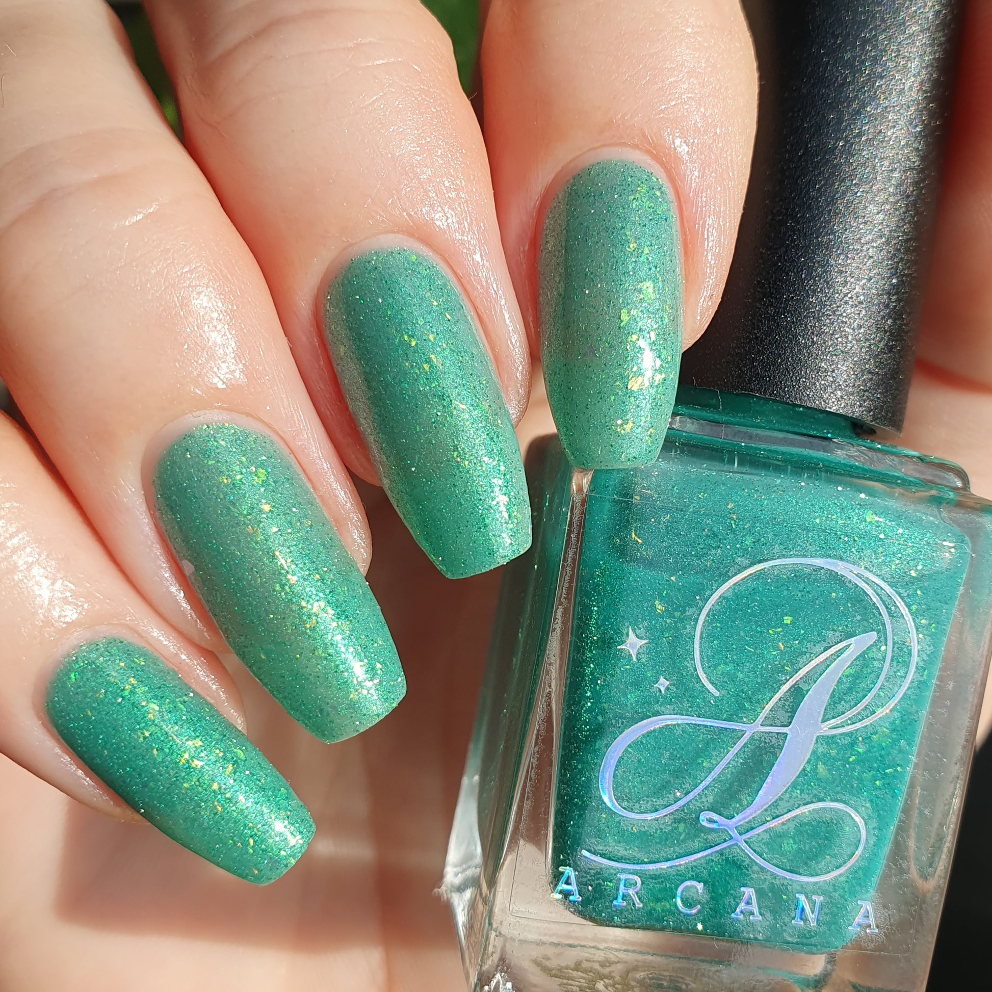 Razor Leaf has a teal base with green to blue to yellow metallic shimmer, green to yellow flakes, and green reflective glitter! This polish is inspired by Bulbasaur!