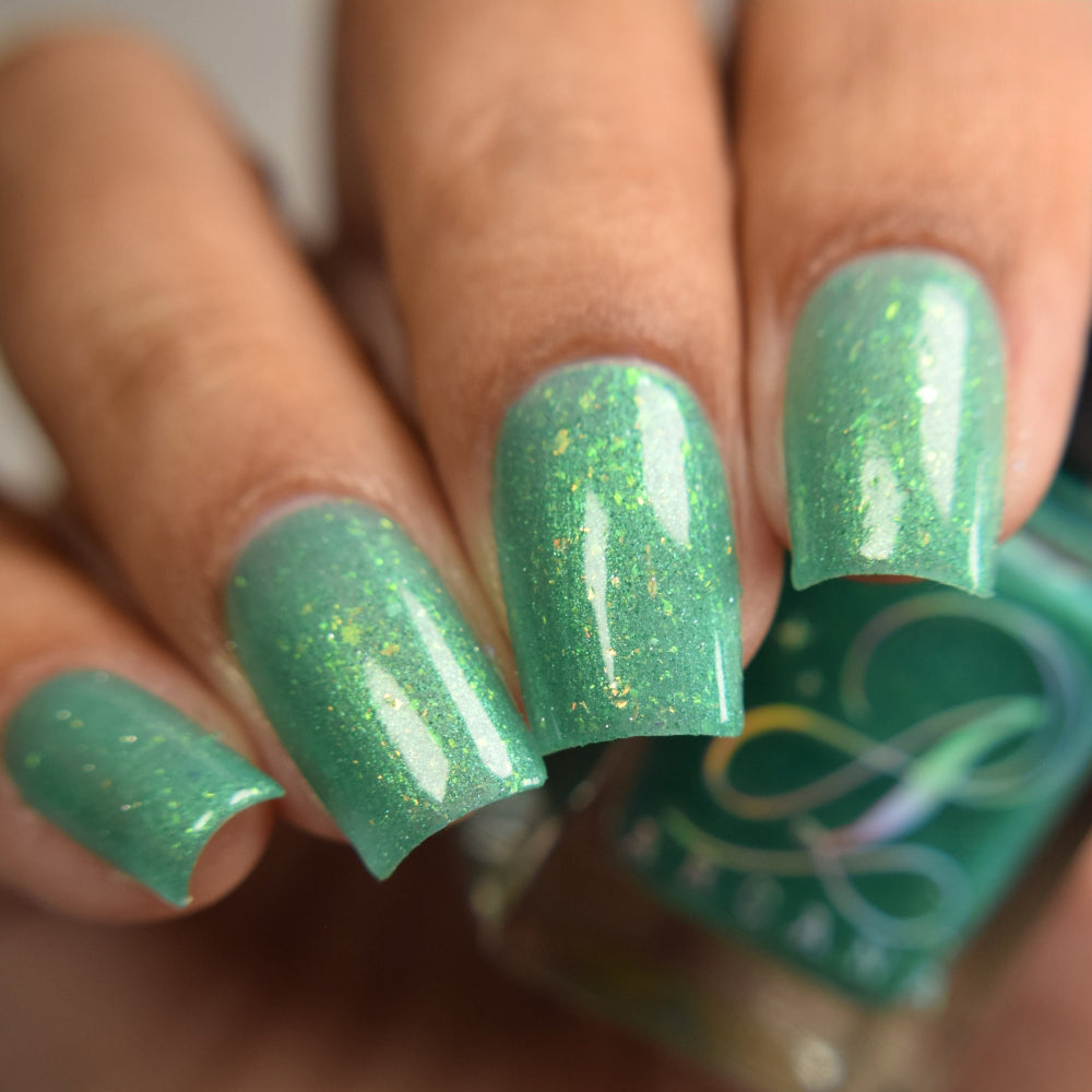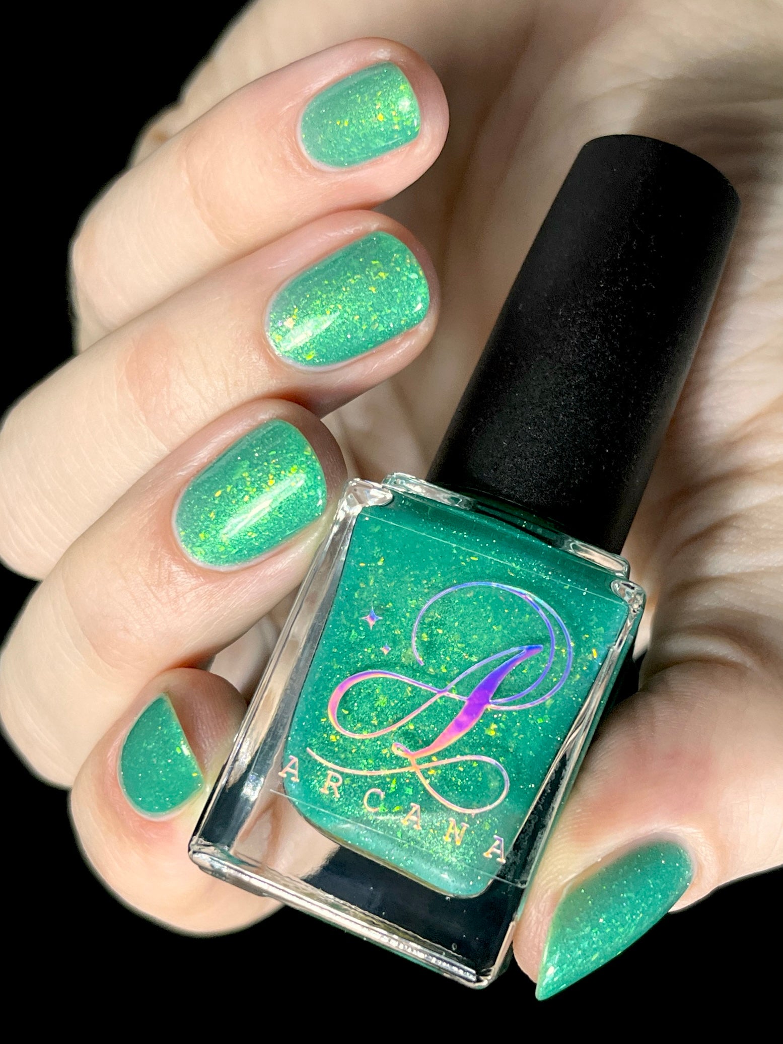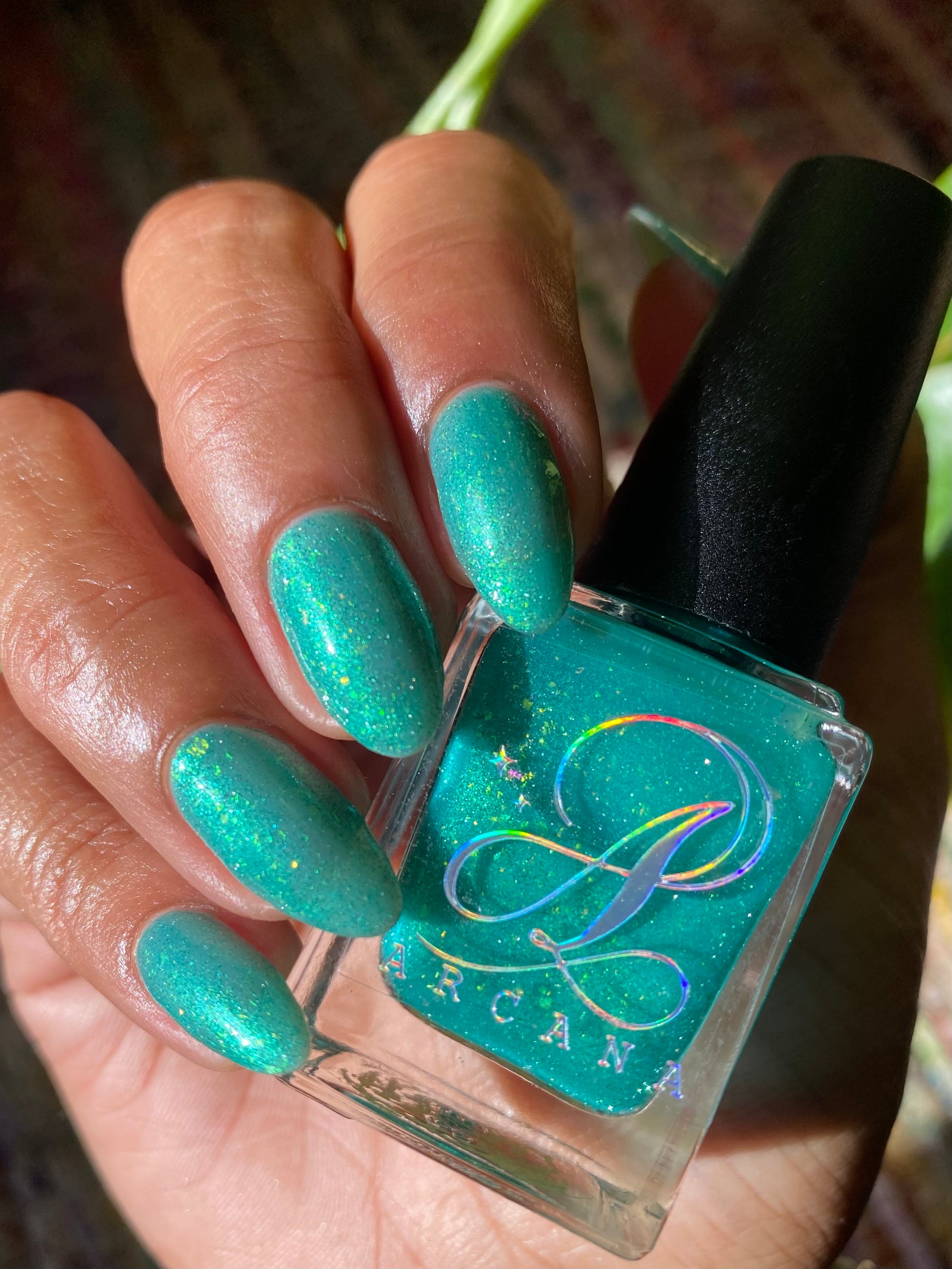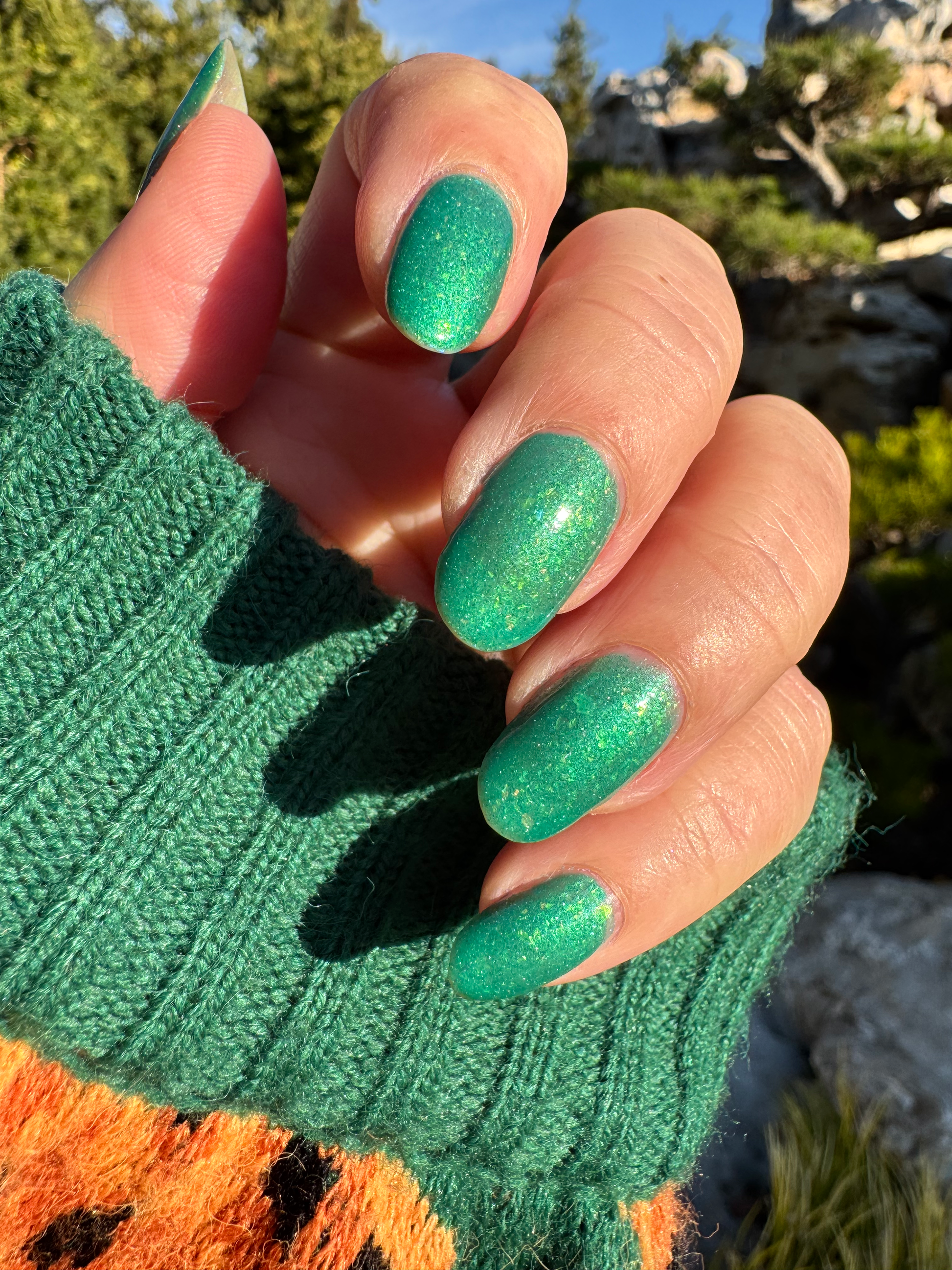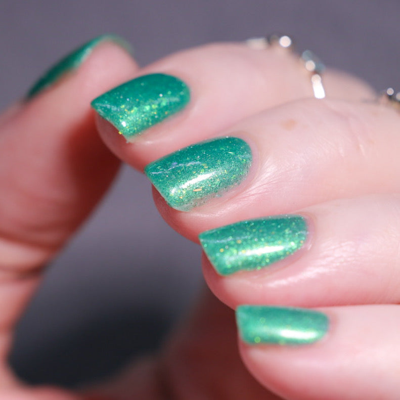 Razor Leaf has a teal base with green to blue to yellow metallic shimmer, green to yellow flakes, and green reflective glitter! This polish is inspired by Bulbasaur!