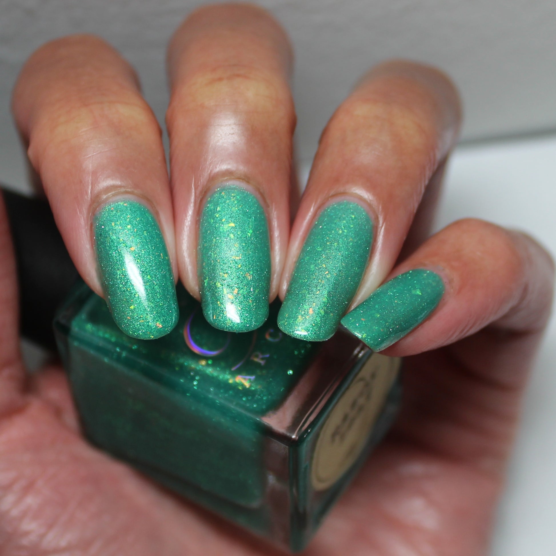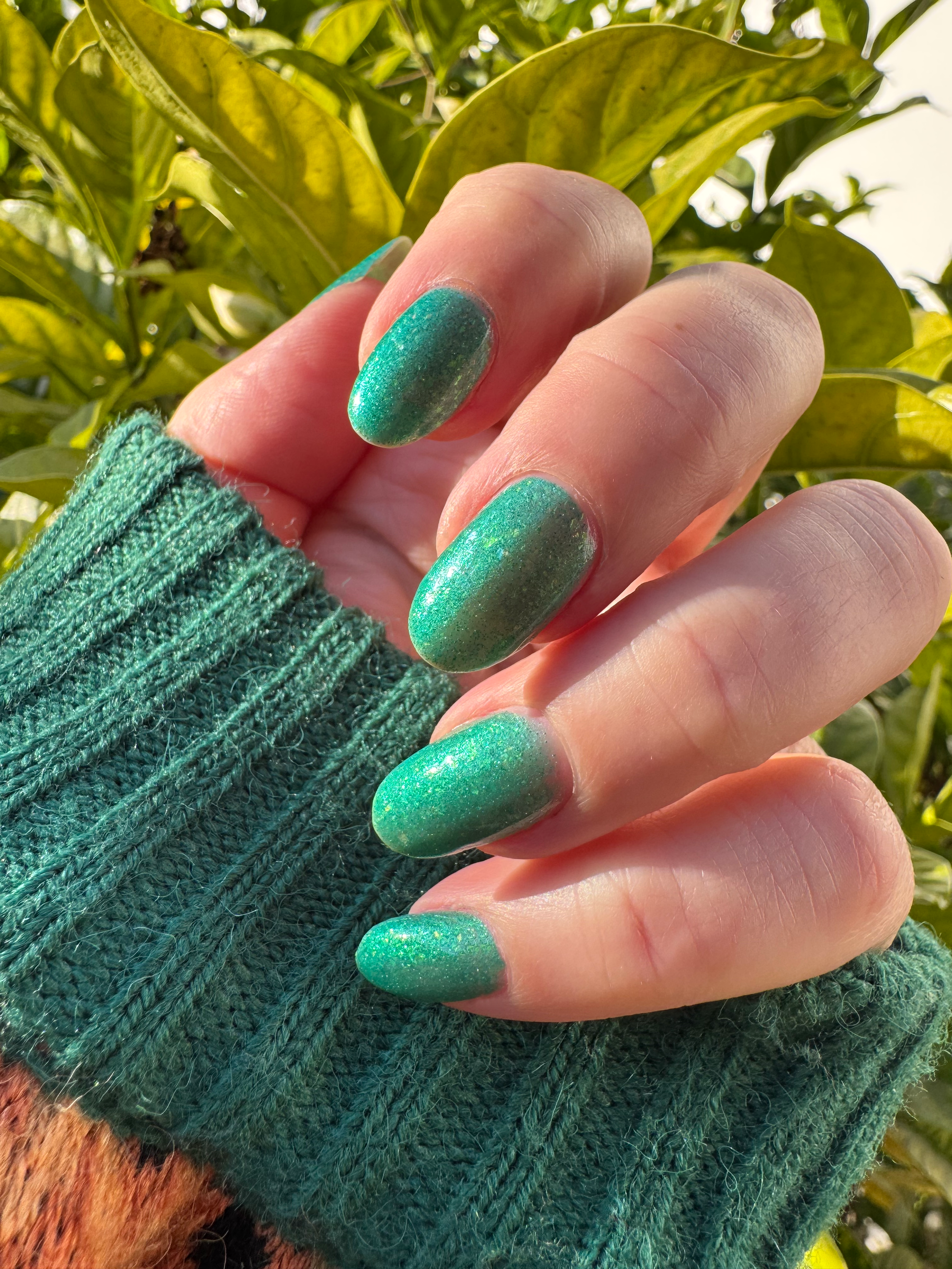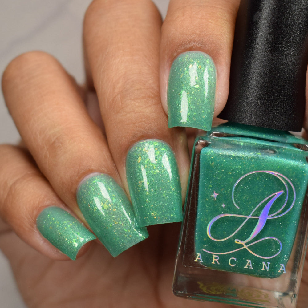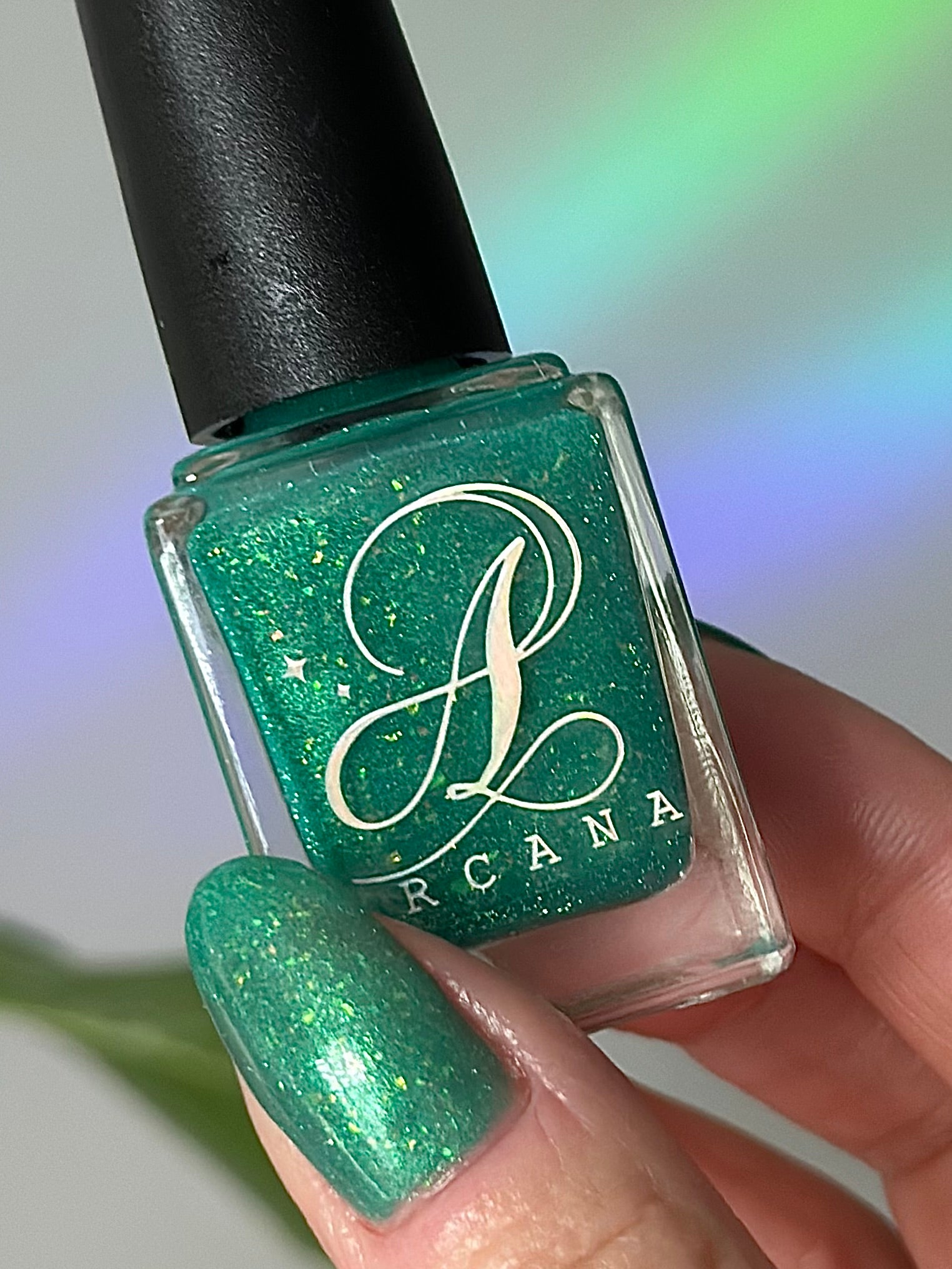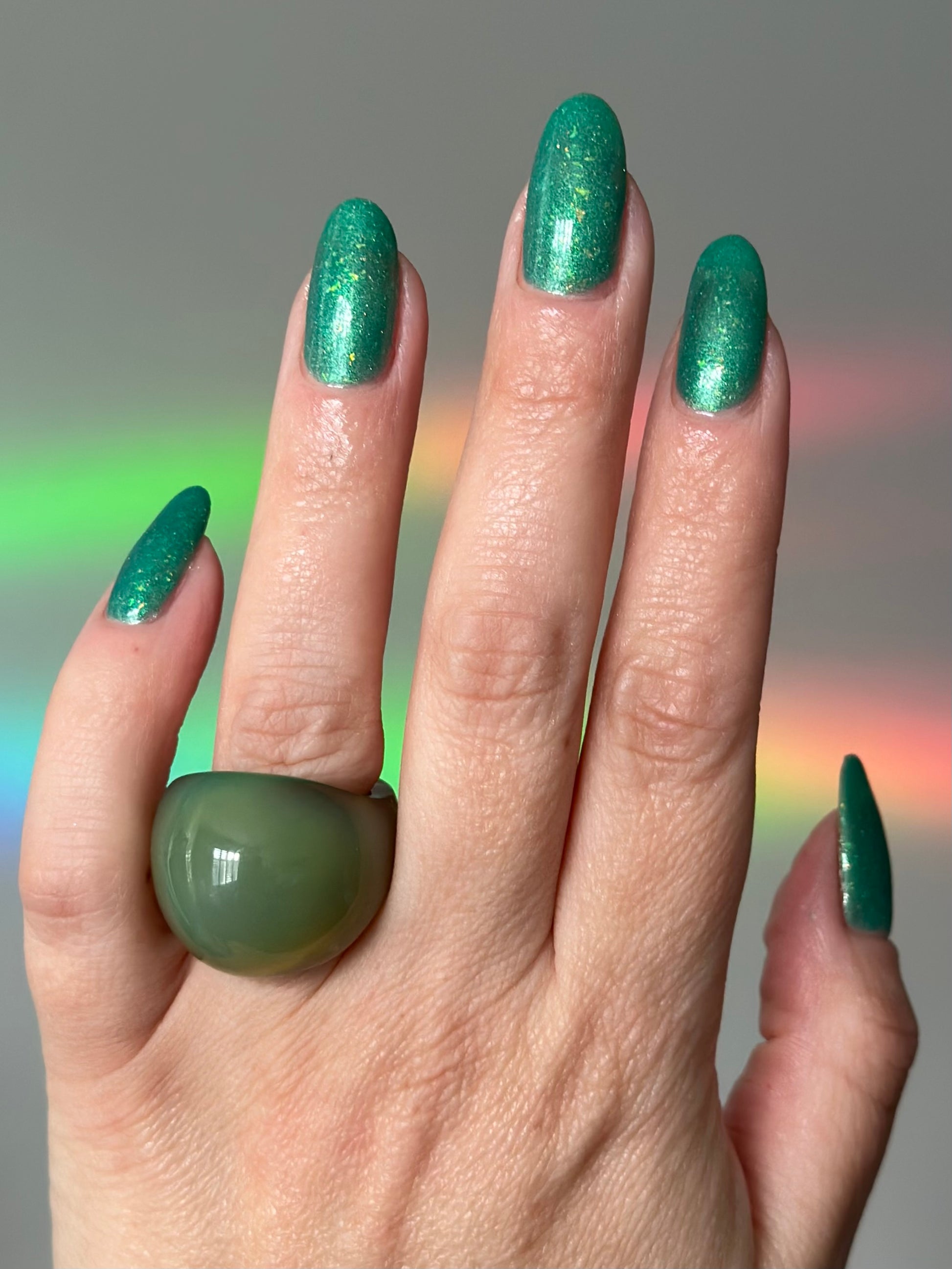 Razor Leaf has a teal base with green to blue to yellow metallic shimmer, green to yellow flakes, and green reflective glitter! This polish is inspired by Bulbasaur!