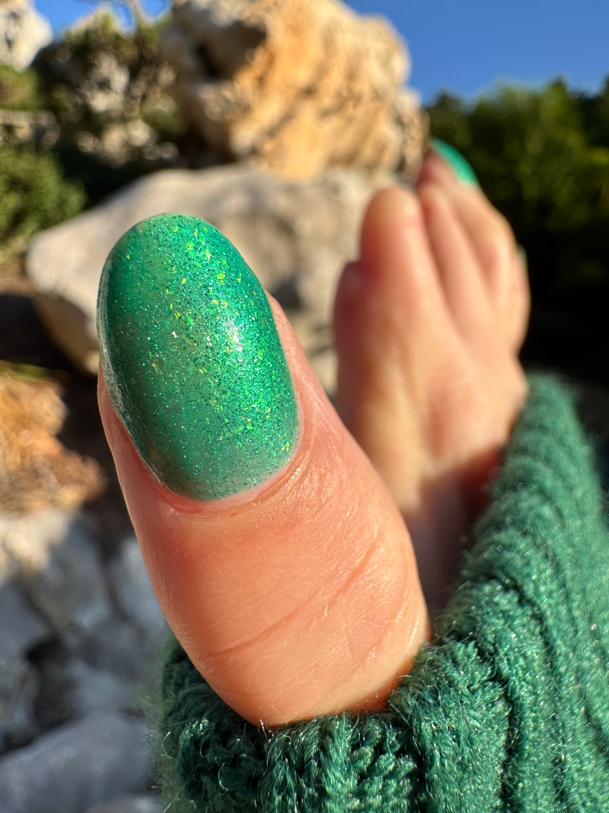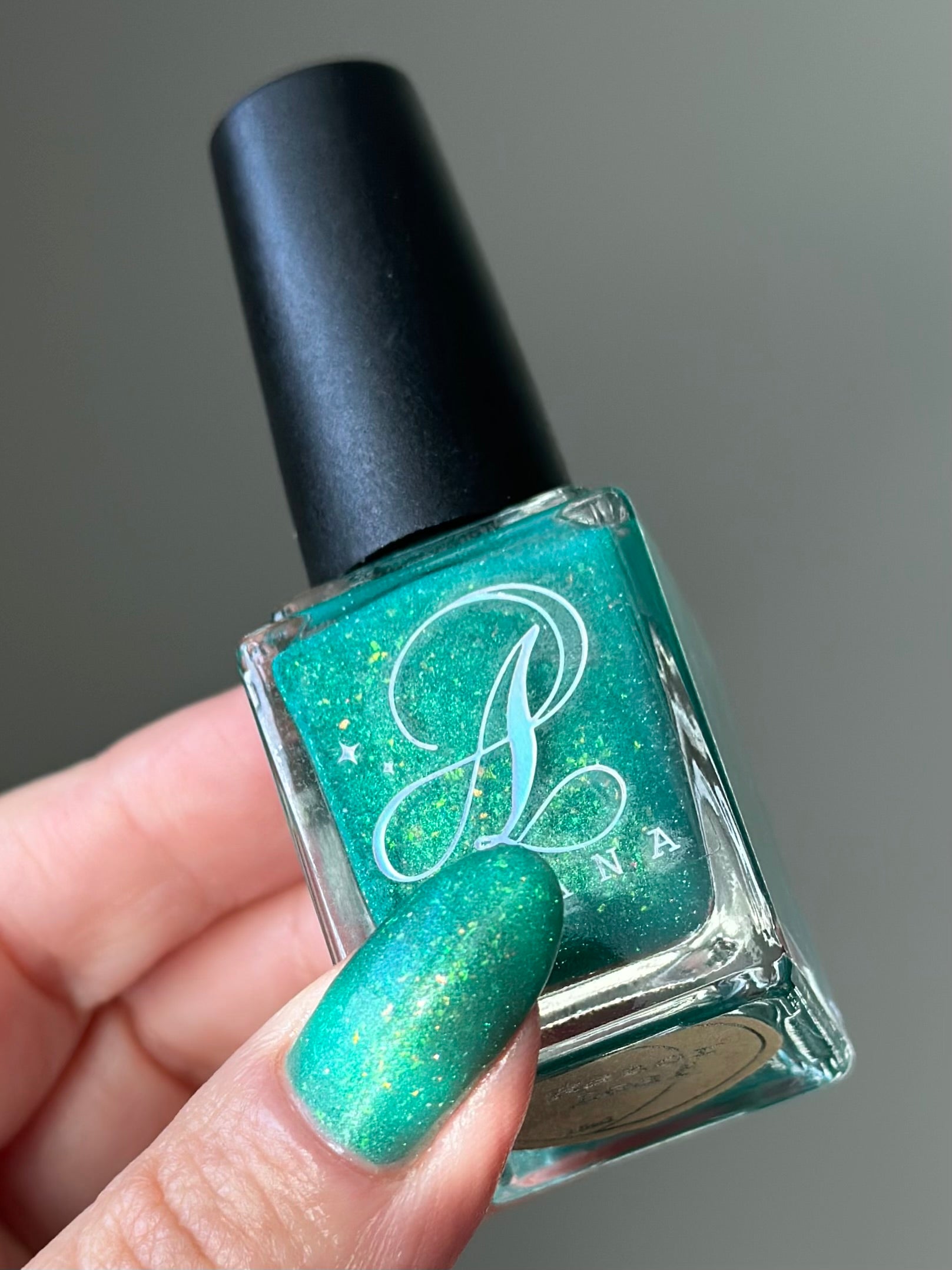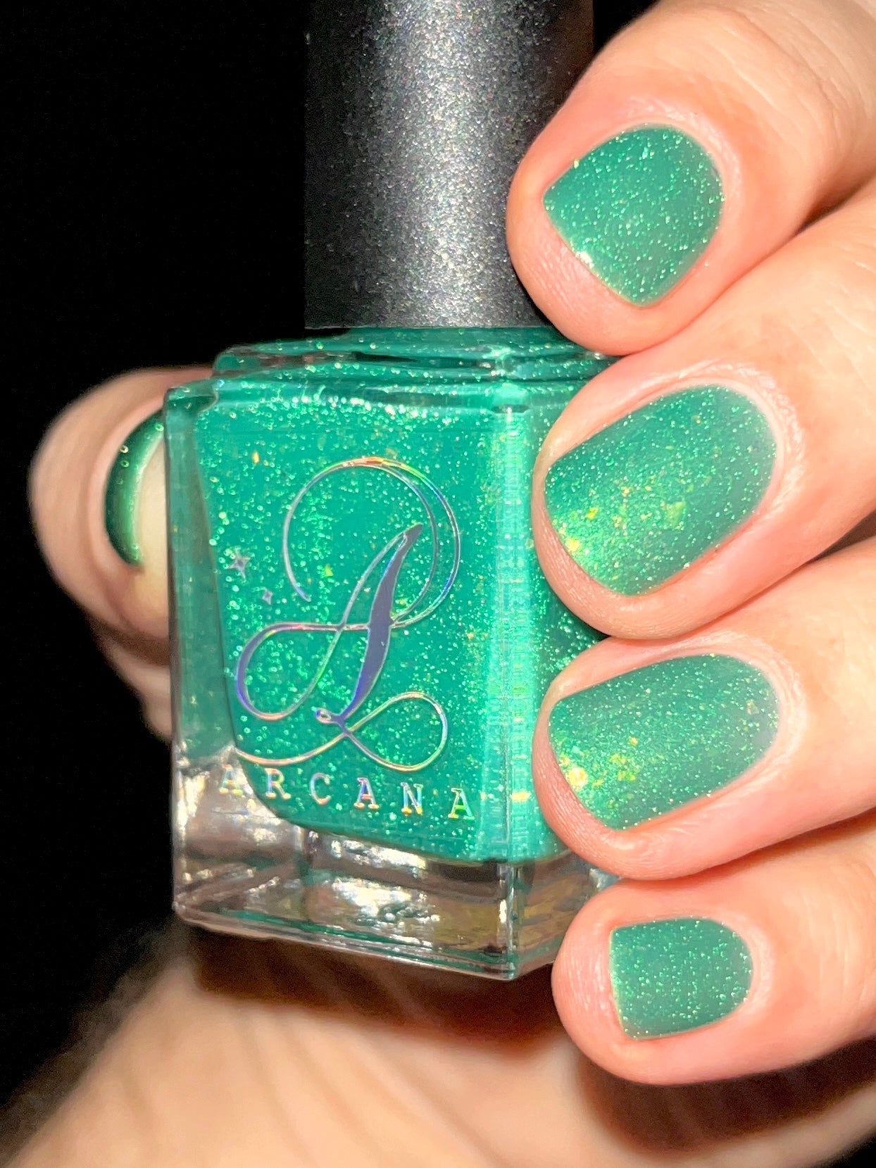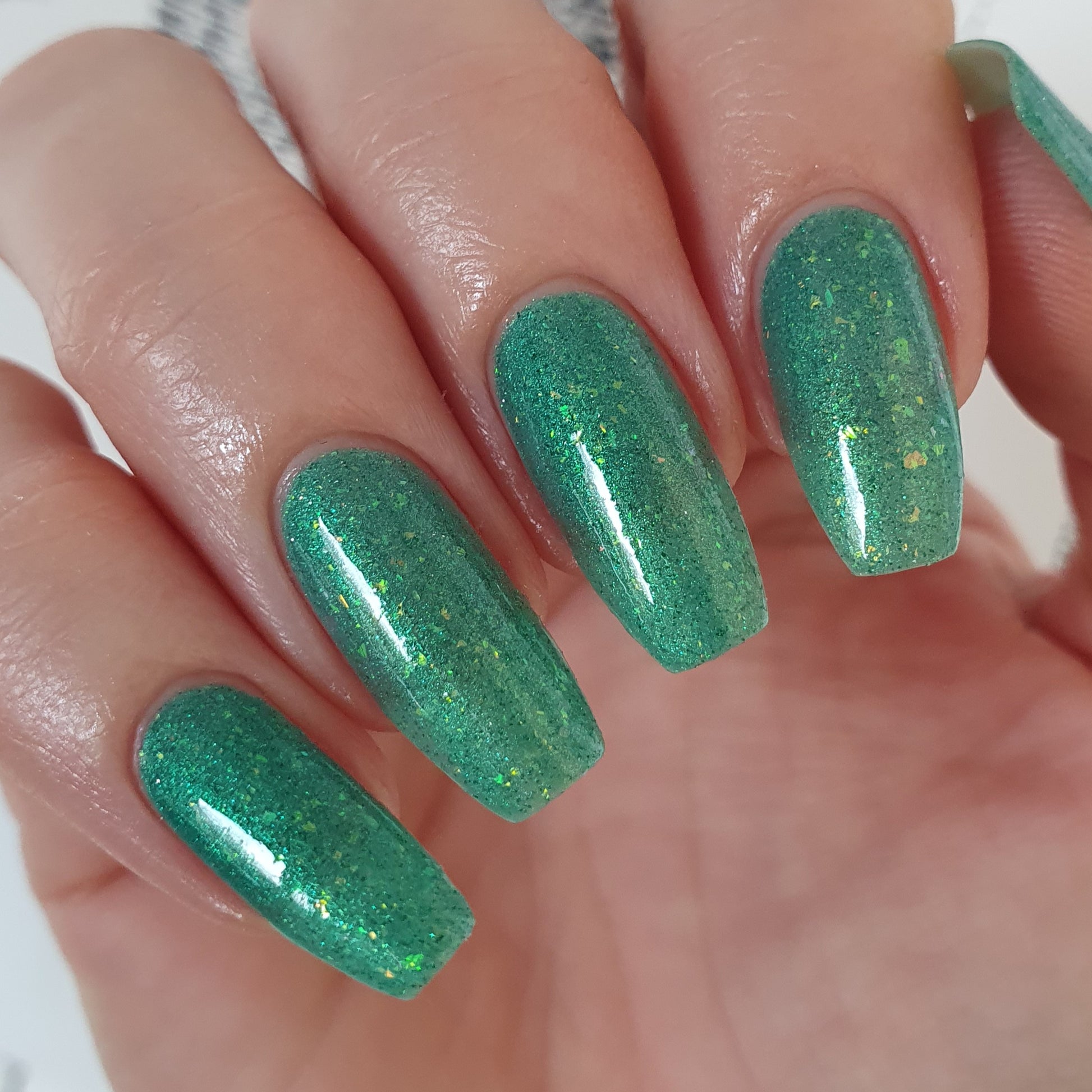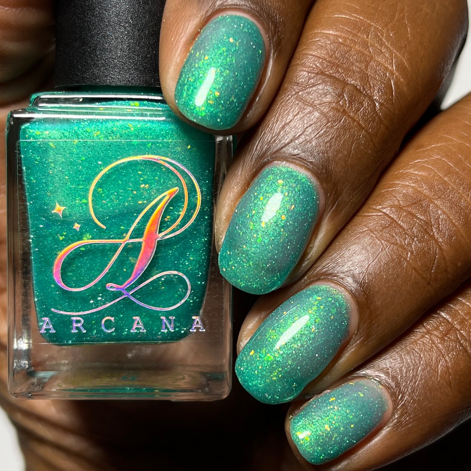 Razor Leaf has a teal base with green to blue to yellow metallic shimmer, green to yellow flakes, and green reflective glitter! This polish is inspired by Bulbasaur!