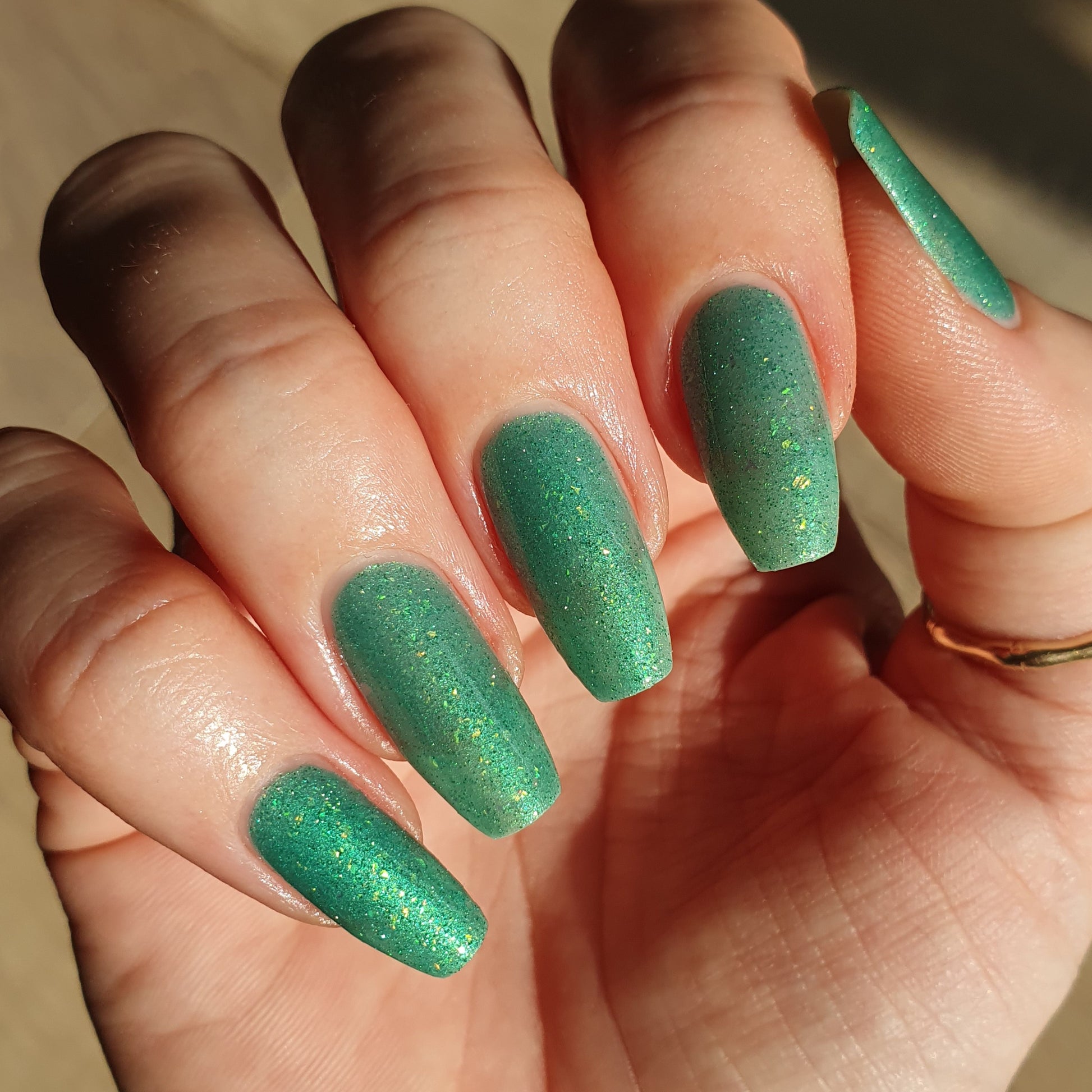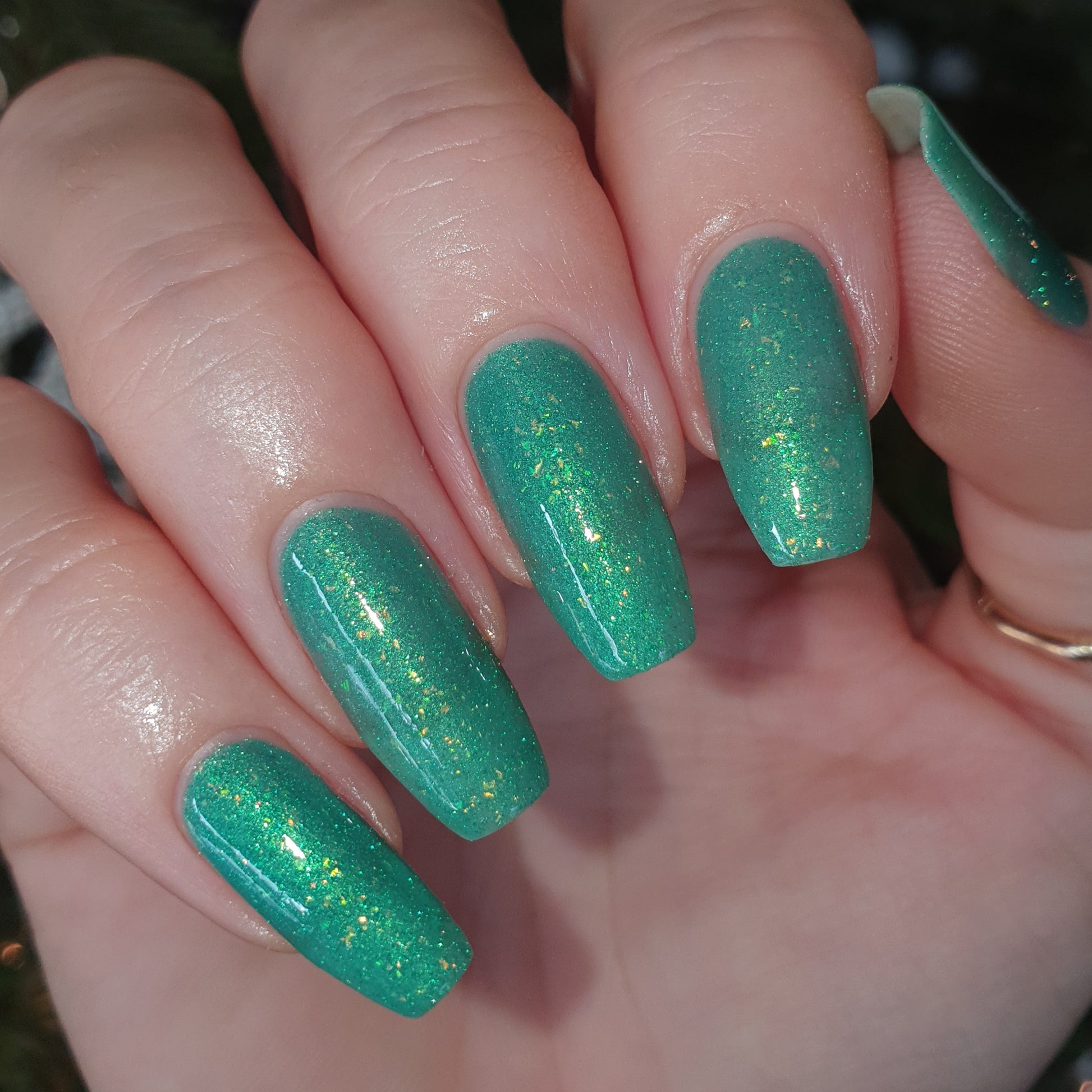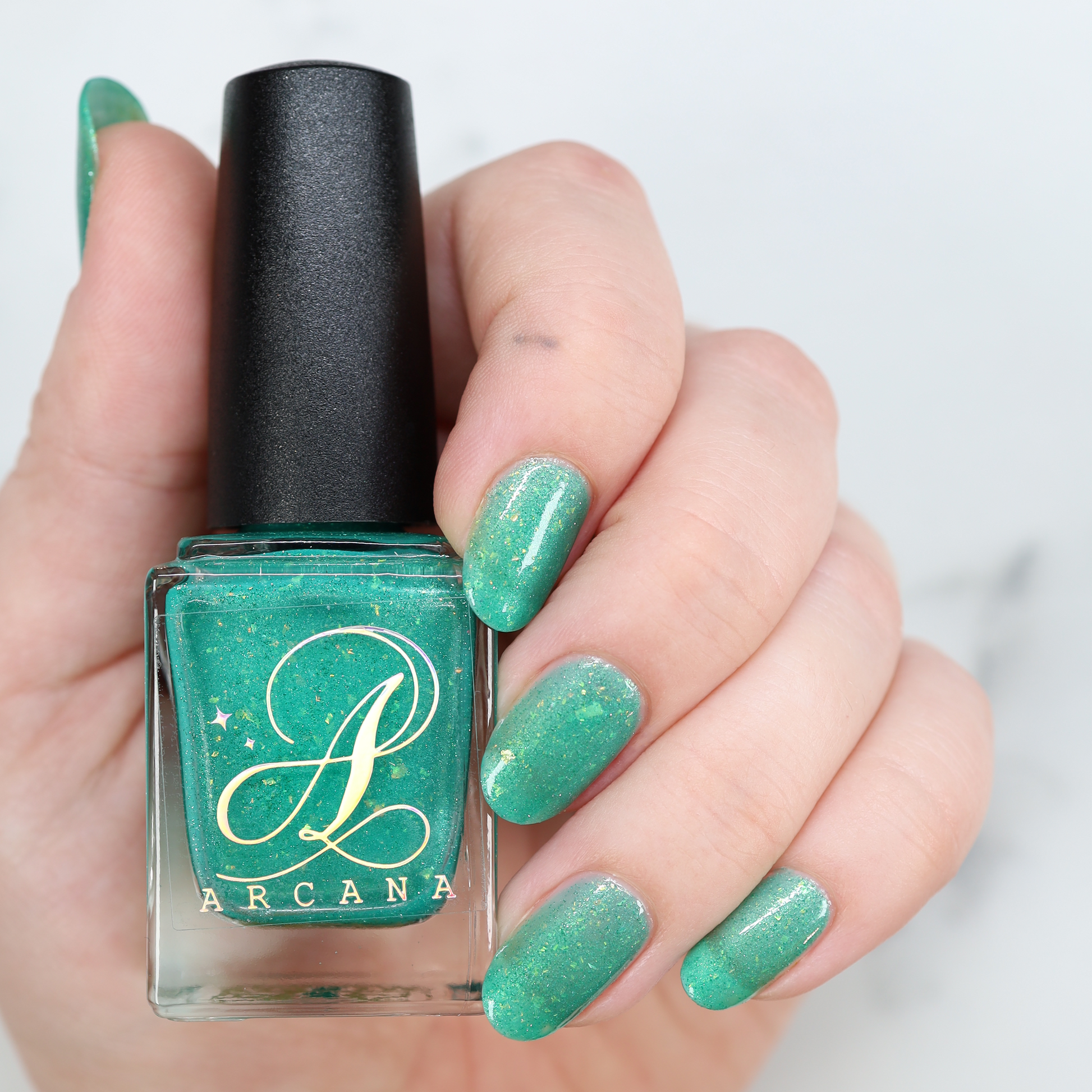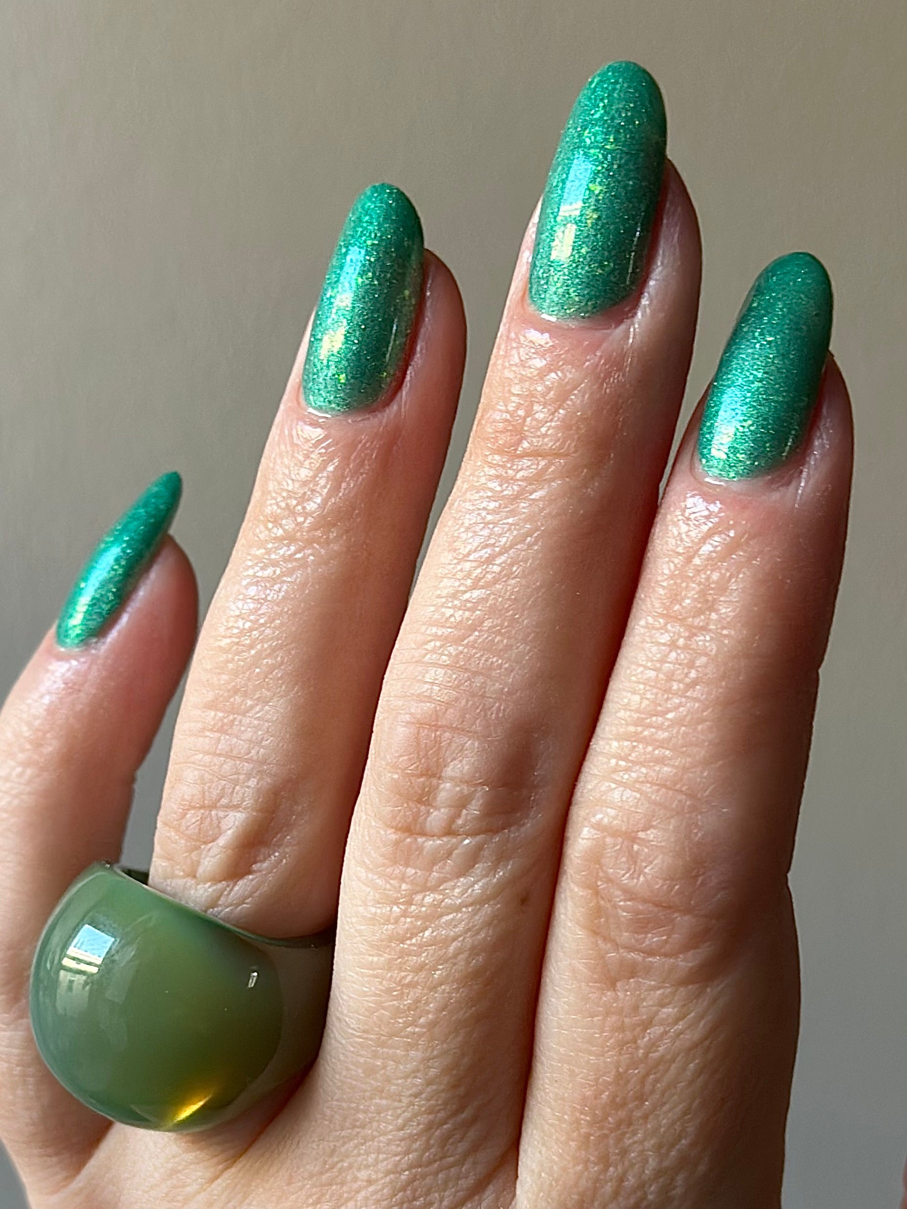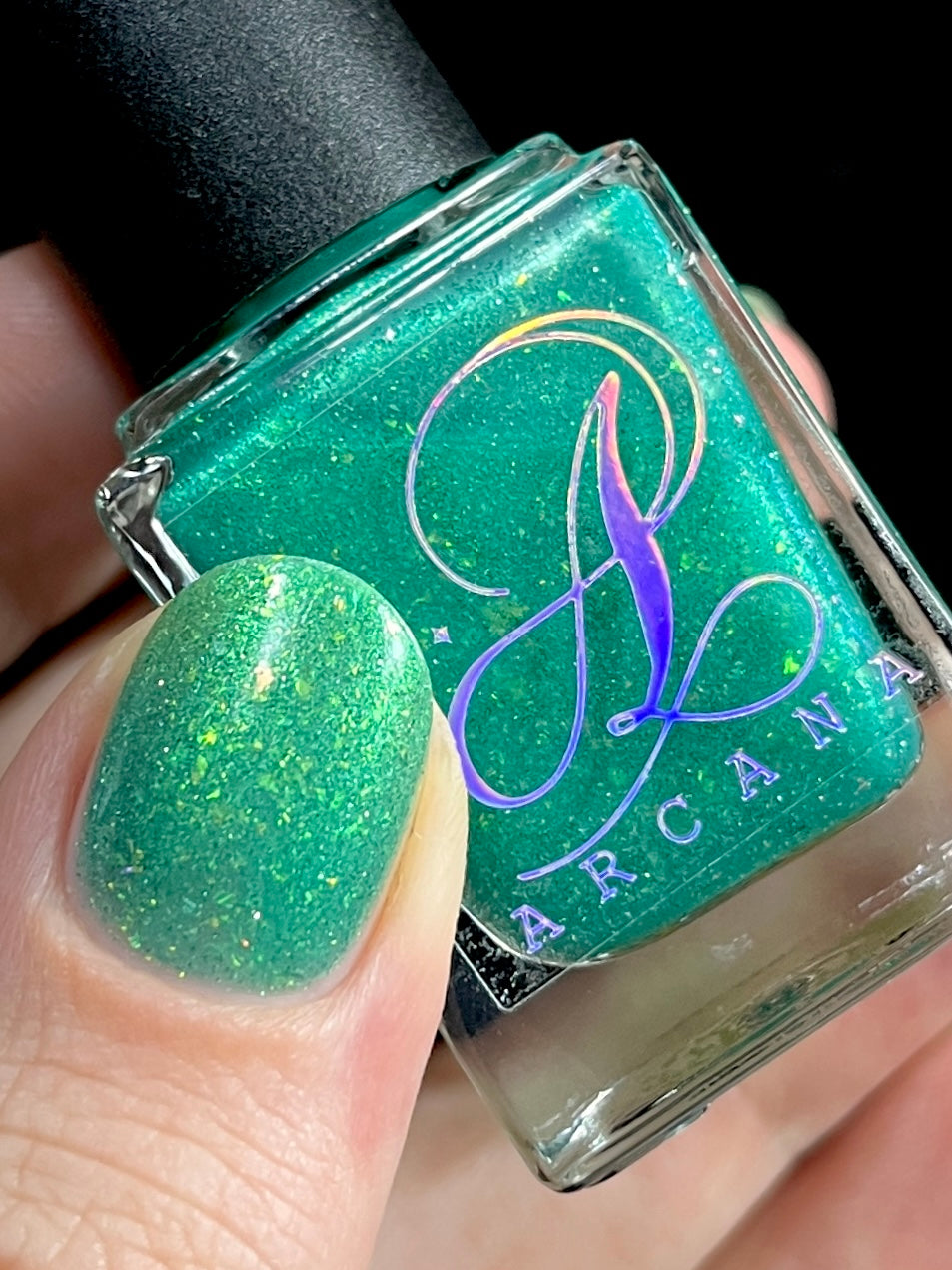 Razor Leaf has a teal base with green to blue to yellow metallic shimmer, green to yellow flakes, and green reflective glitter! This polish is inspired by Bulbasaur!