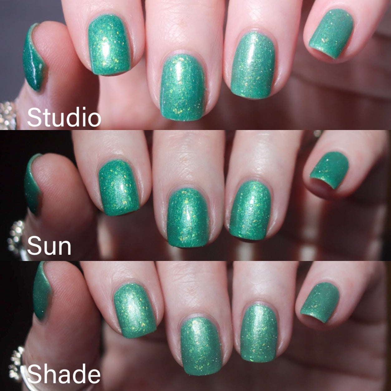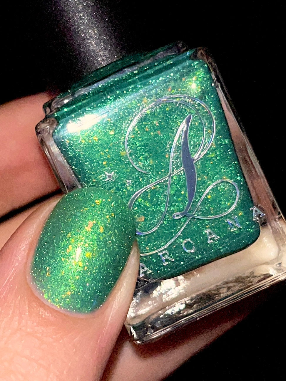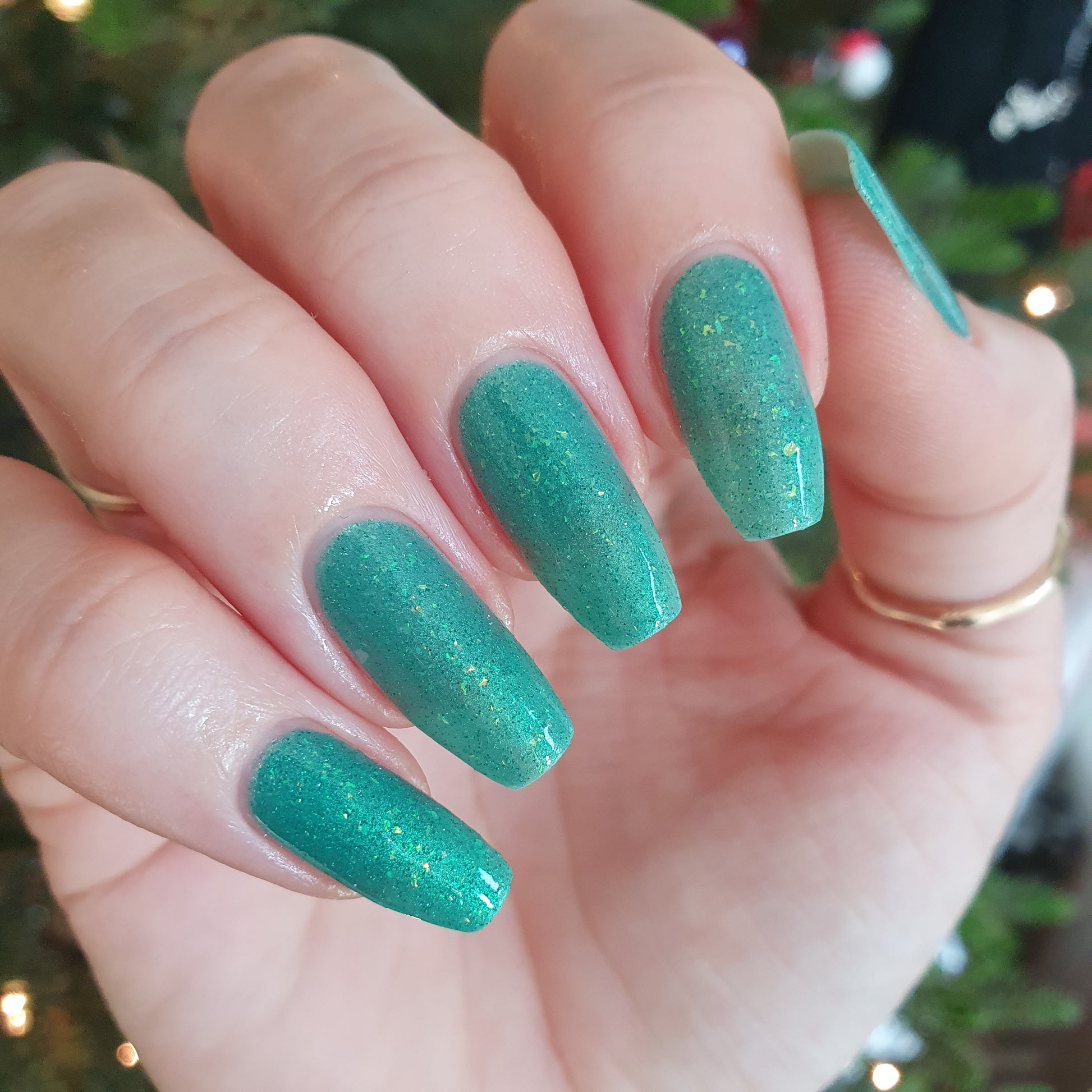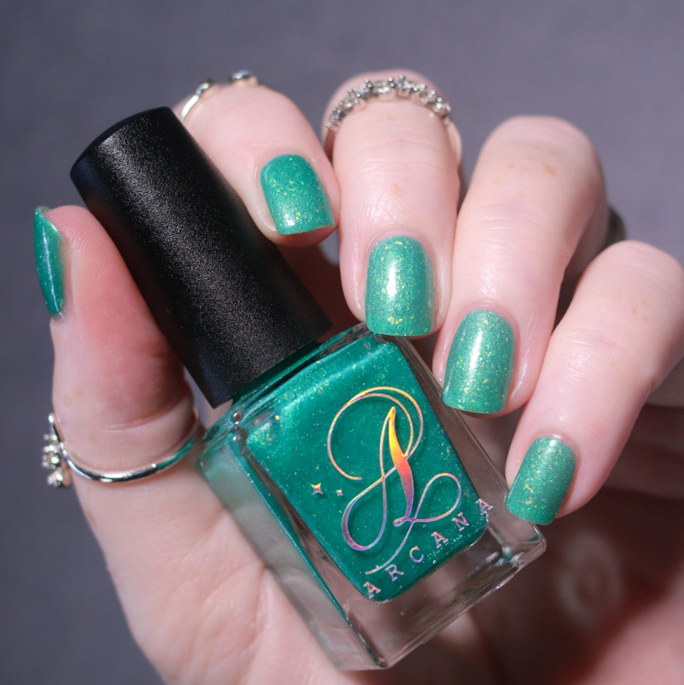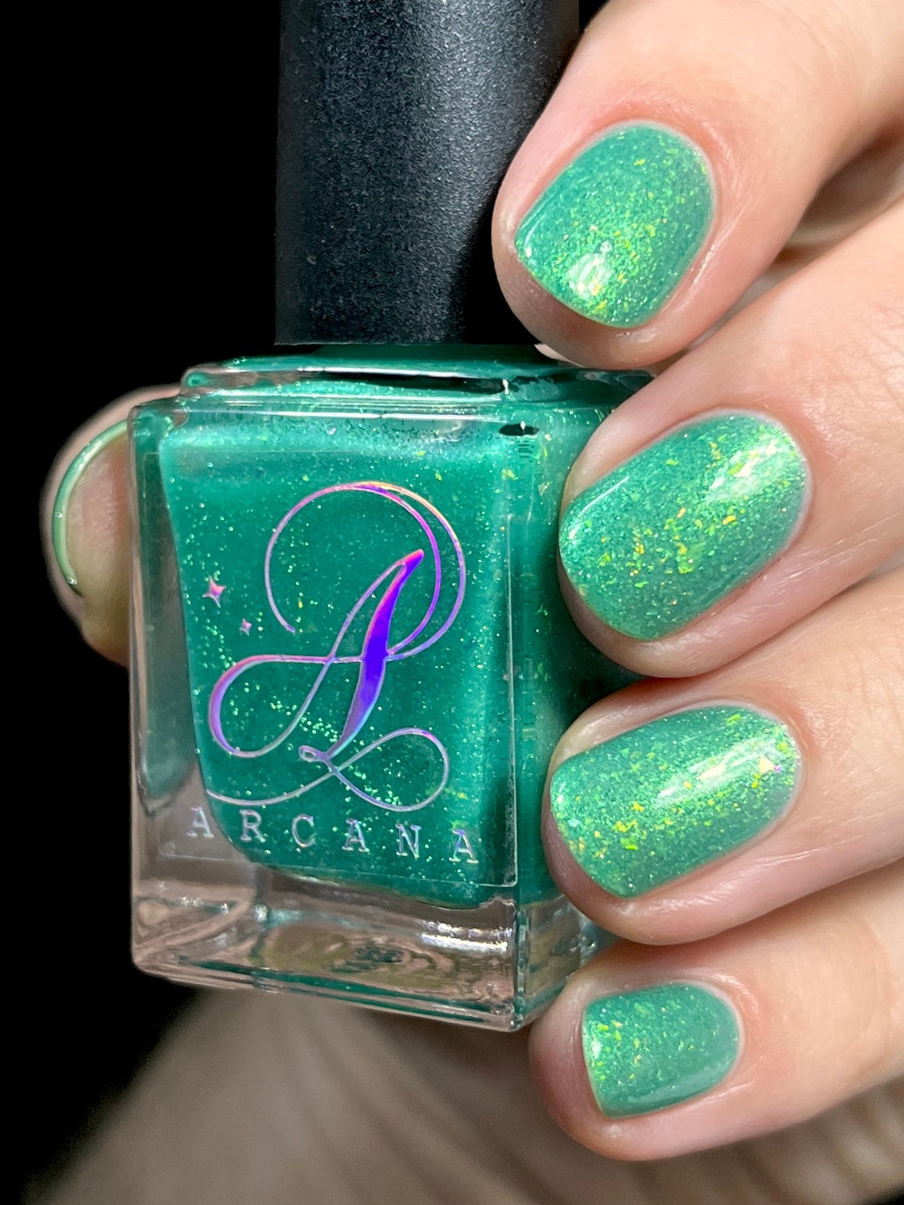 Razor Leaf has a teal base with green to blue to yellow metallic shimmer, green to yellow flakes, and green reflective glitter! This polish is inspired by Bulbasaur!