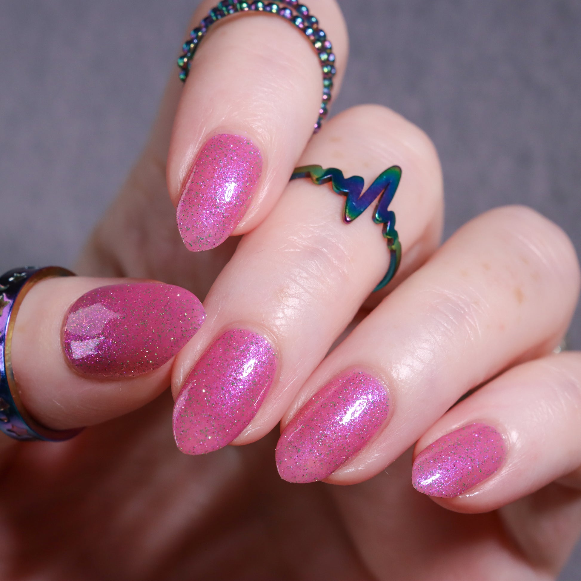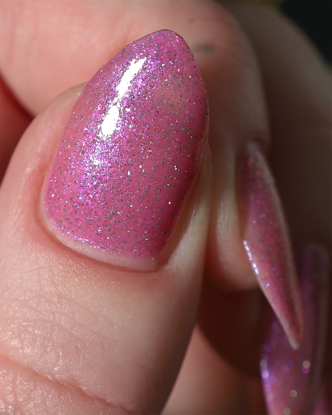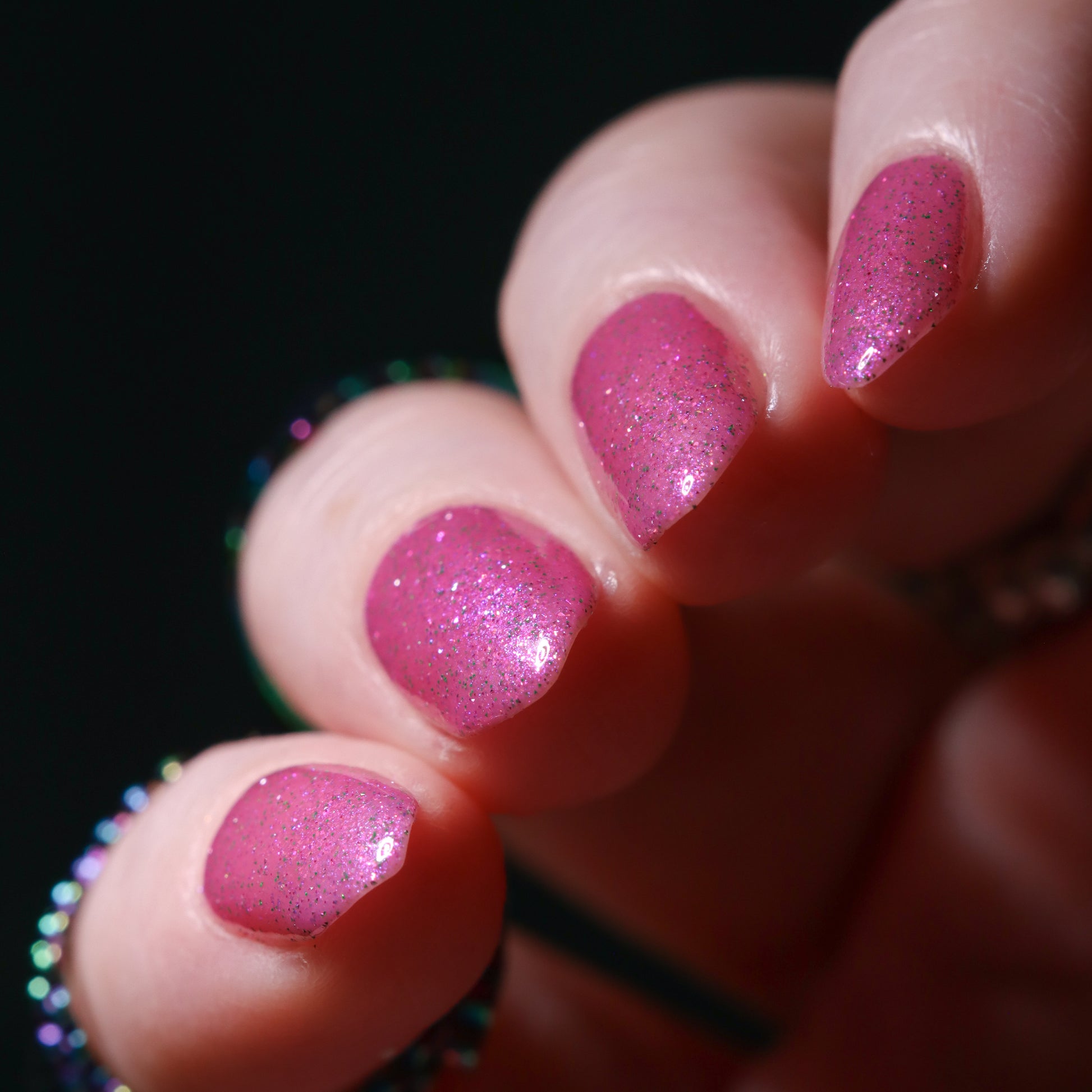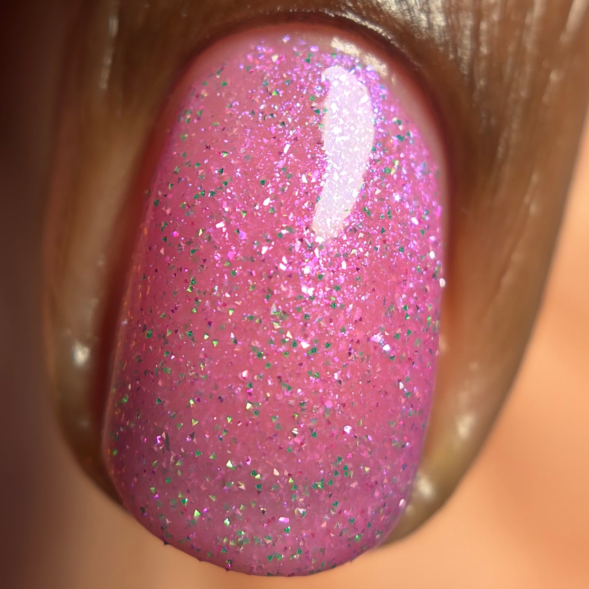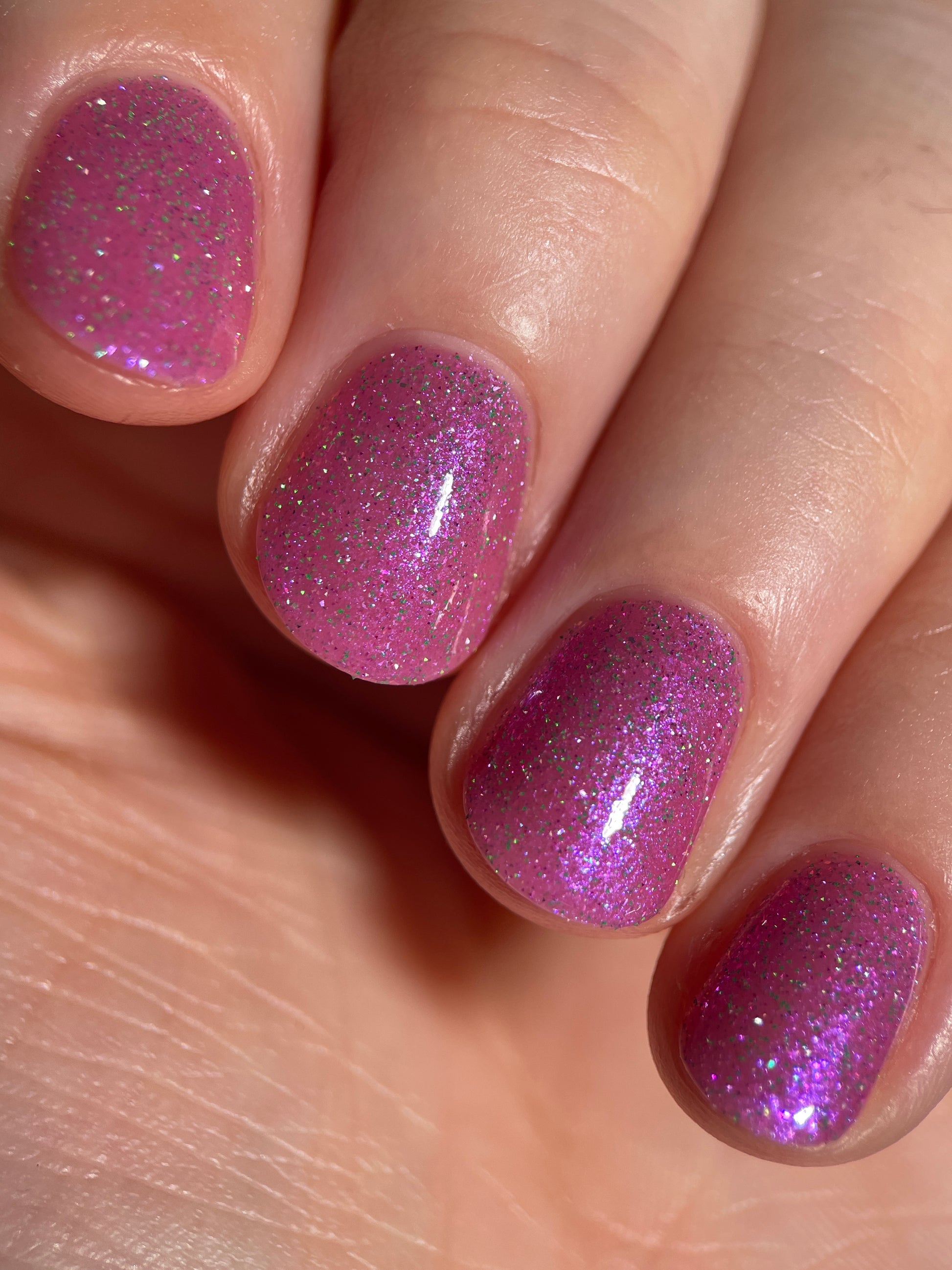 Rose-vel is a soft pink base with green and pink reflective glitter and blue-purple shimmers.