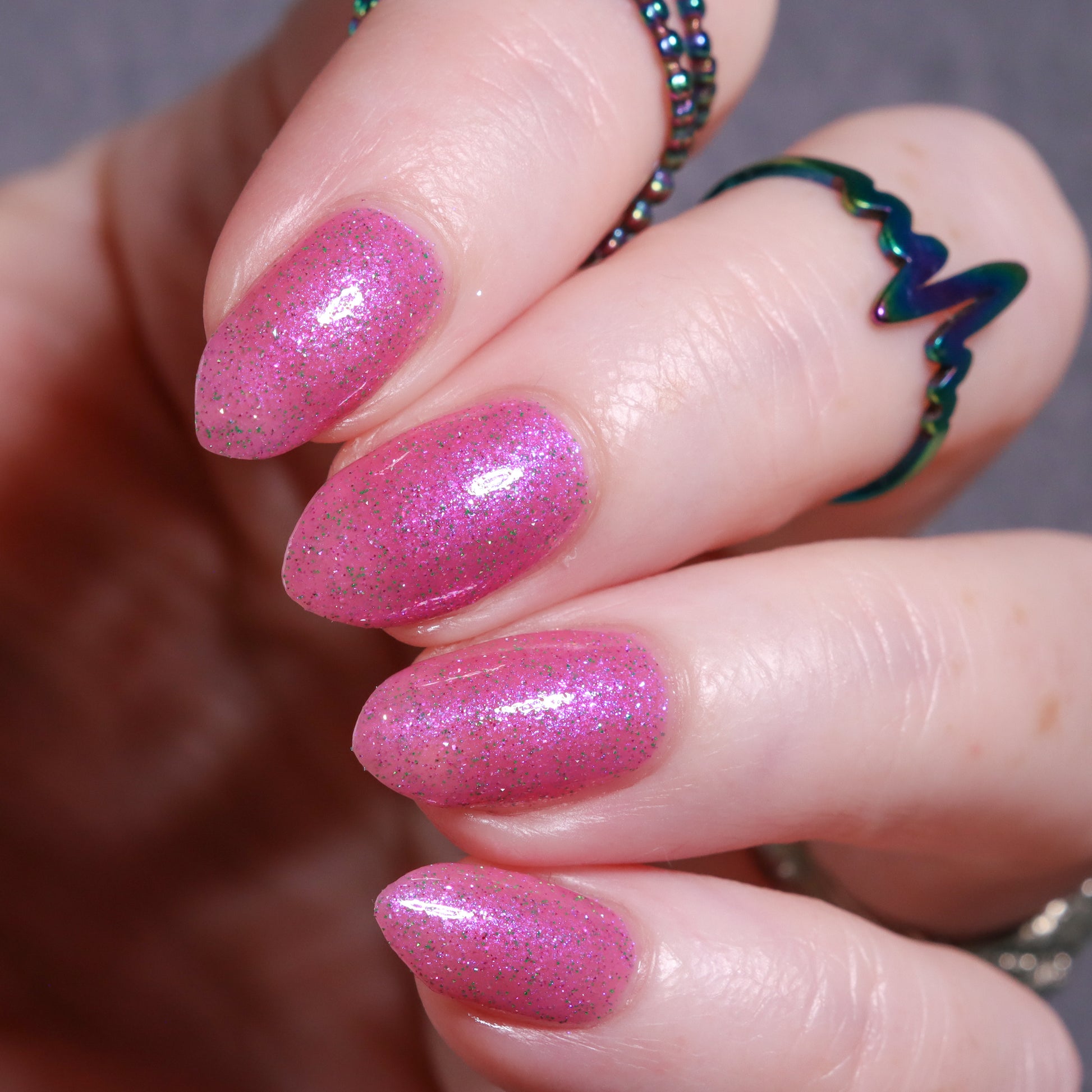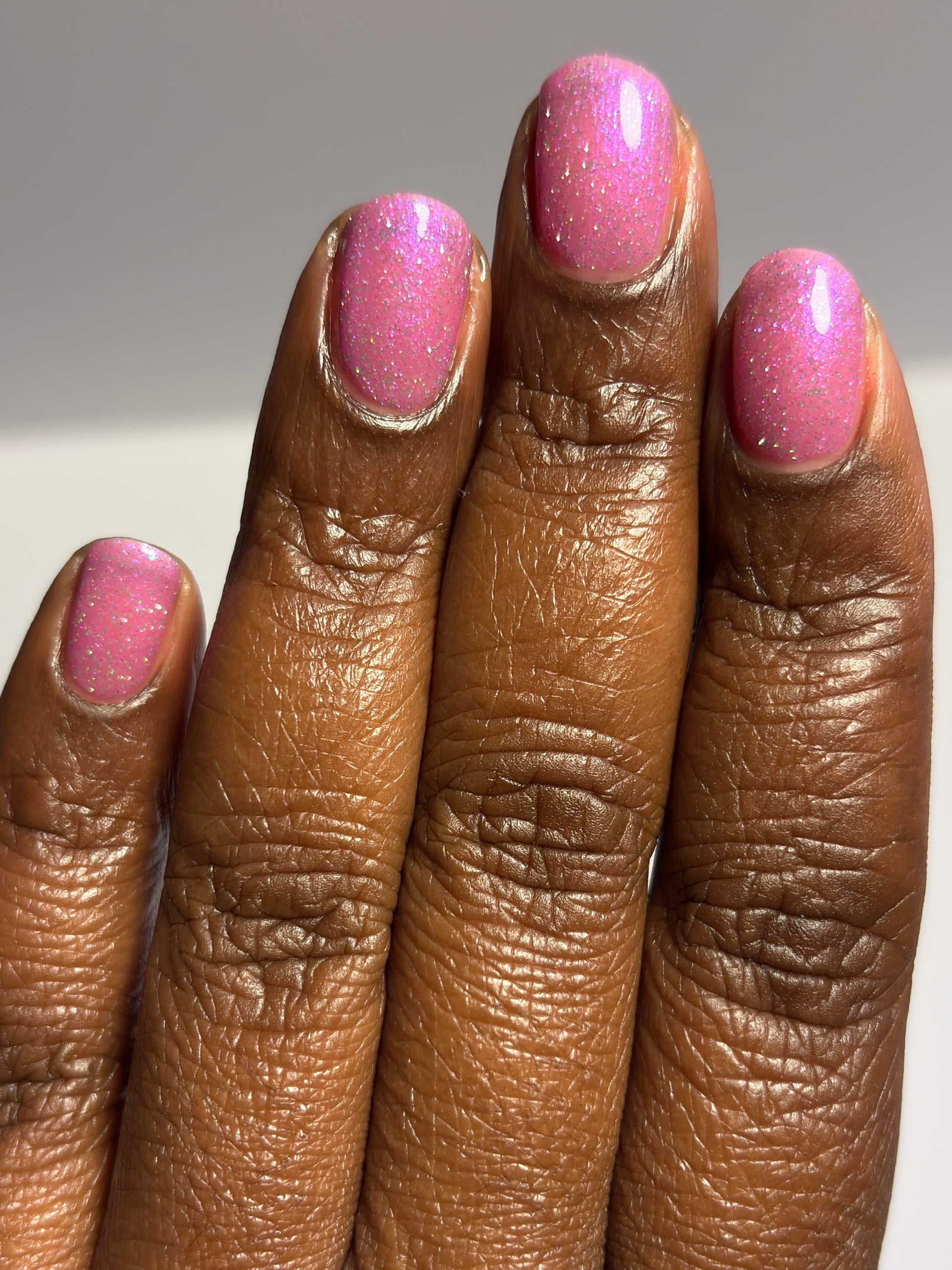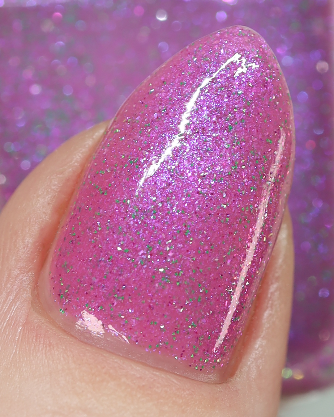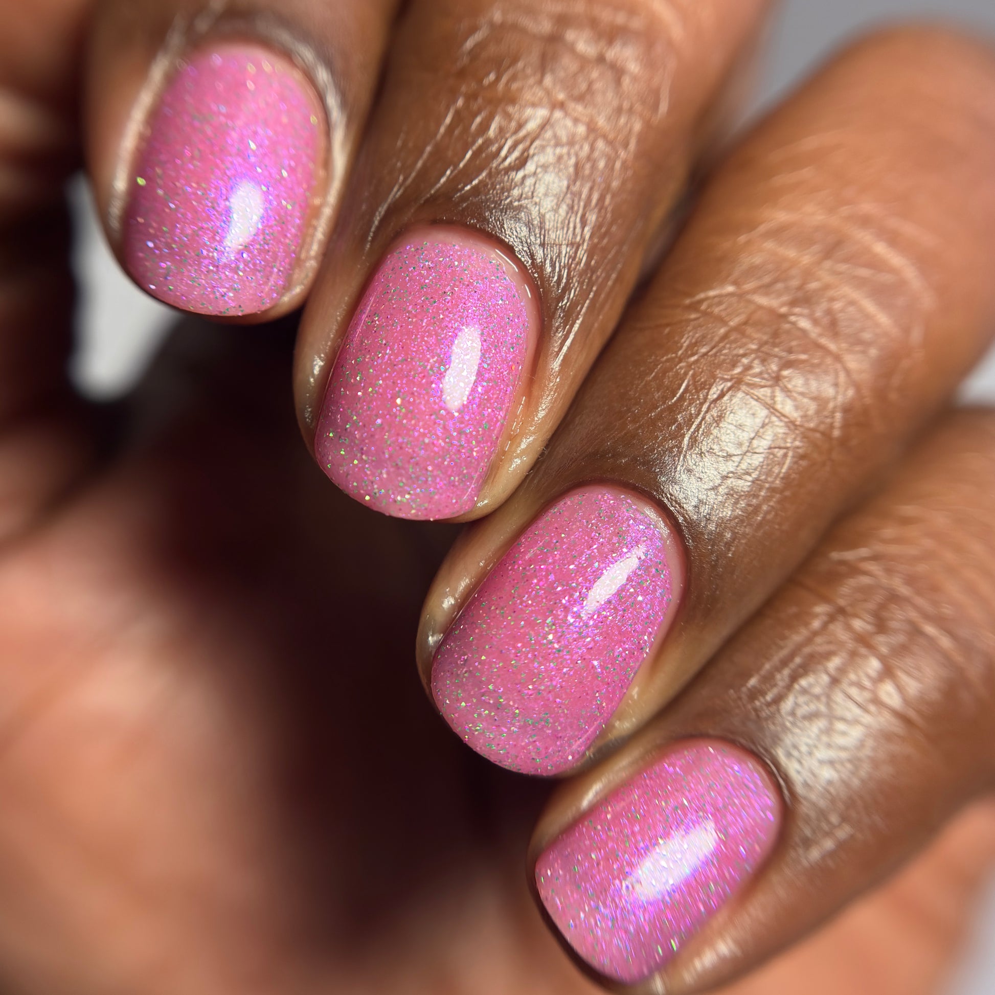 Rose-vel is a soft pink base with green and pink reflective glitter and blue-purple shimmers.