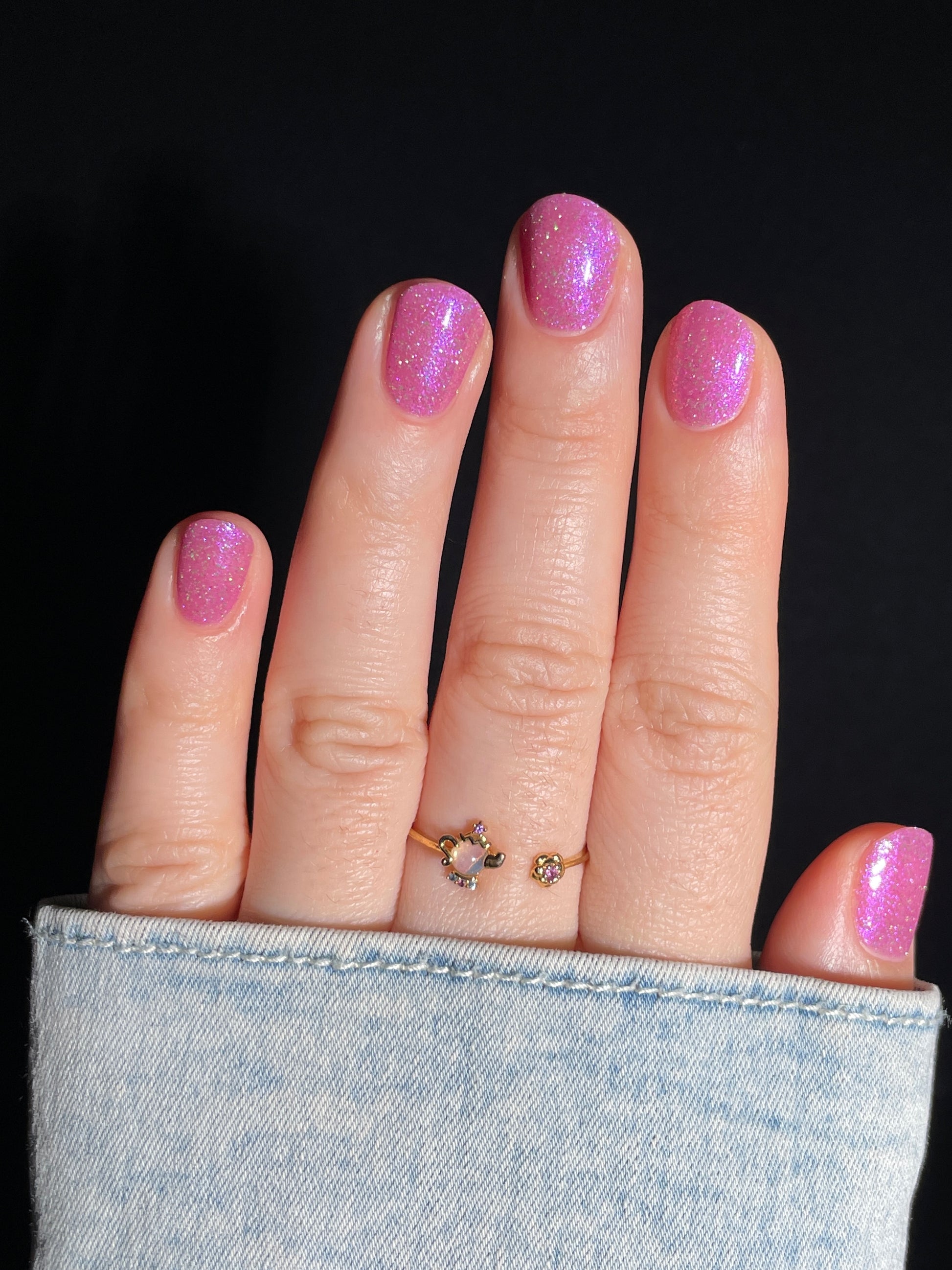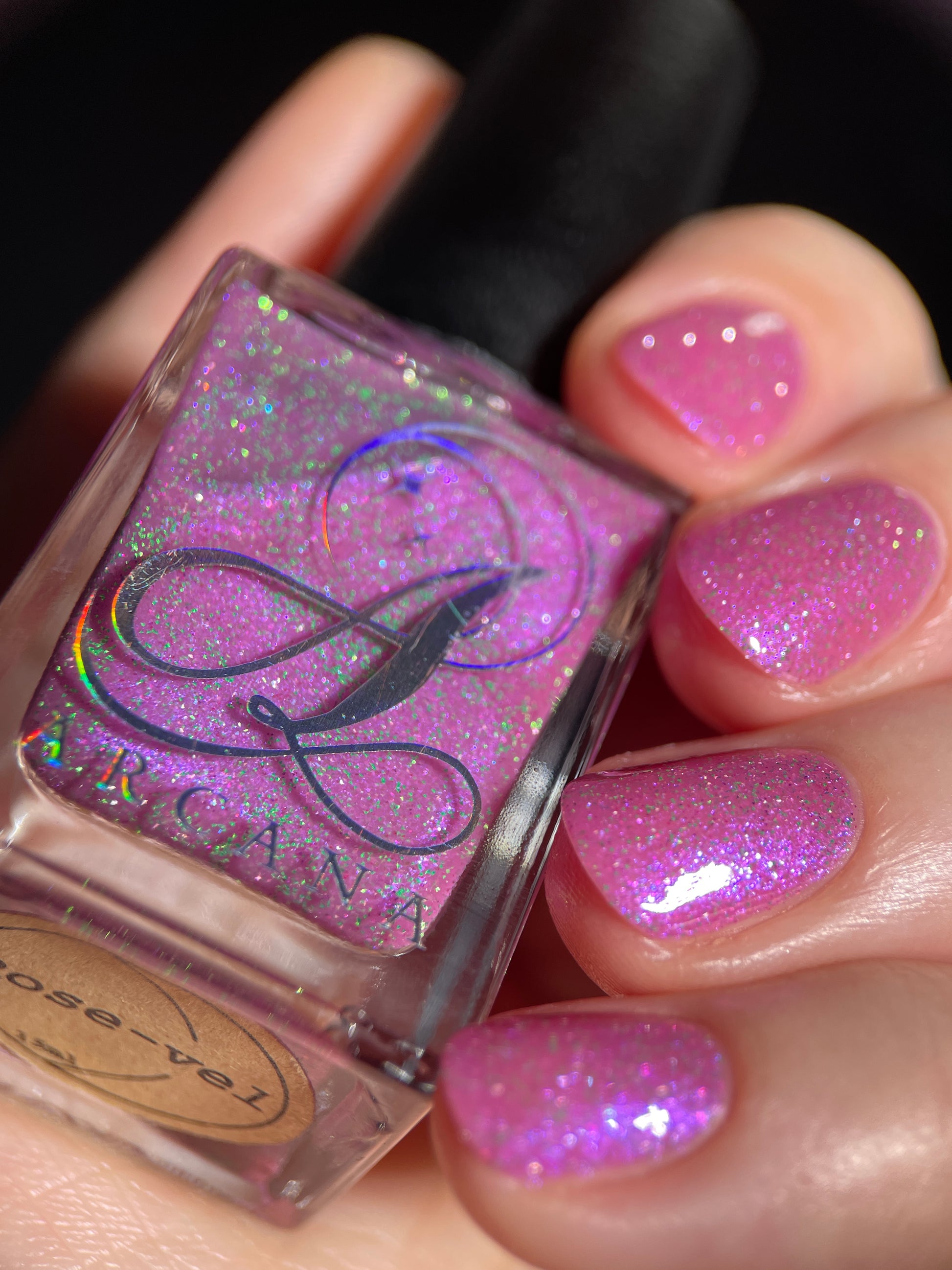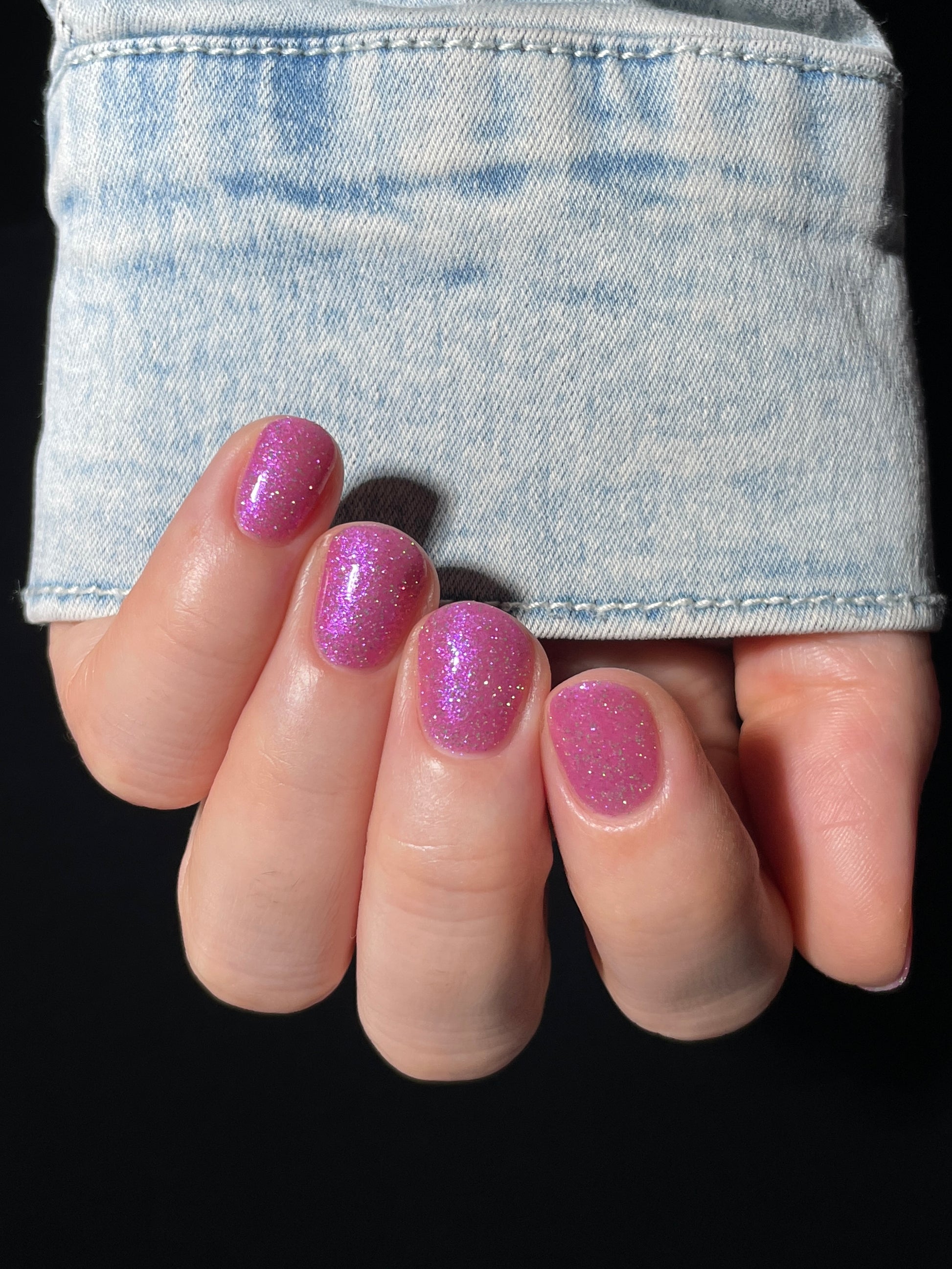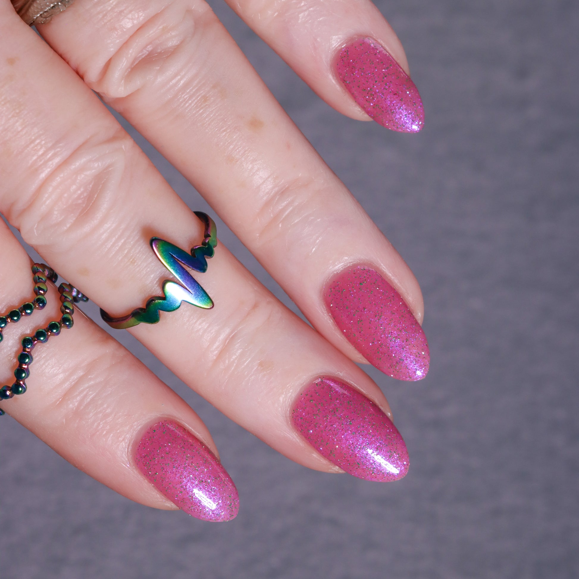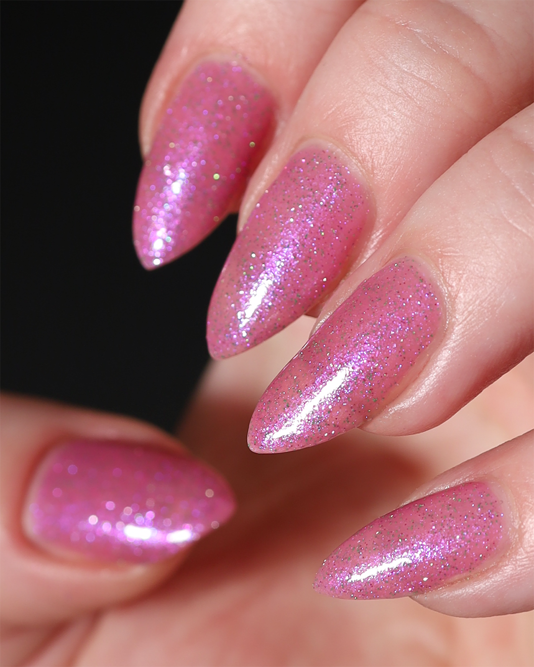 Rose-vel is a soft pink base with green and pink reflective glitter and blue-purple shimmers.