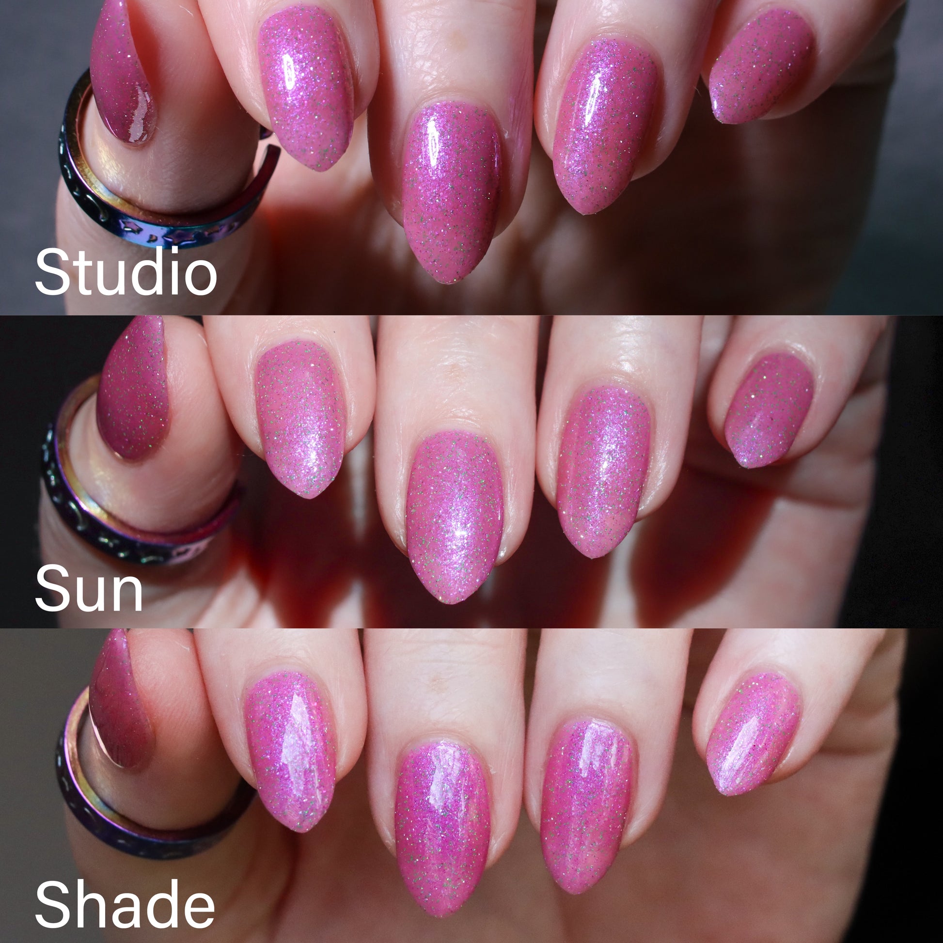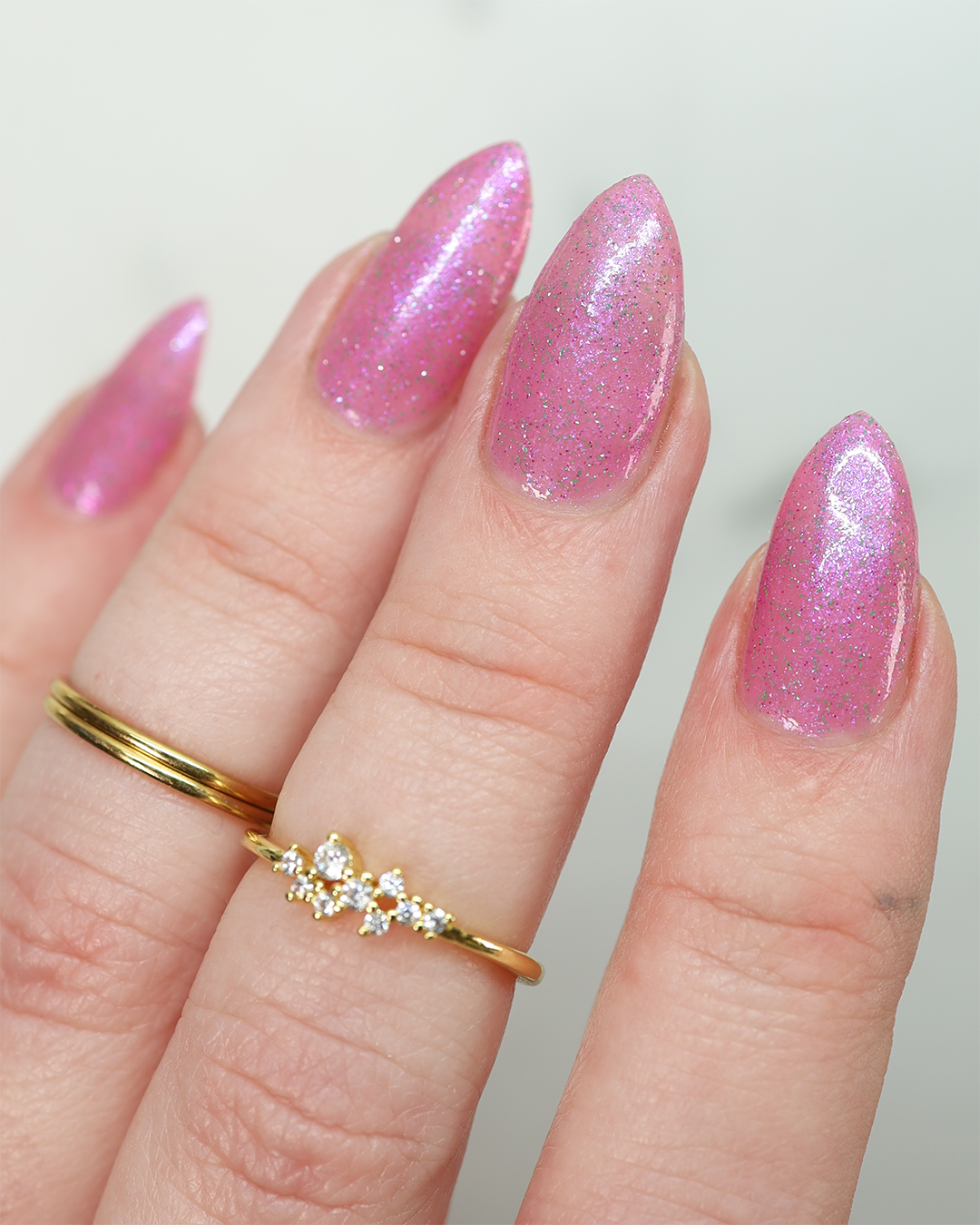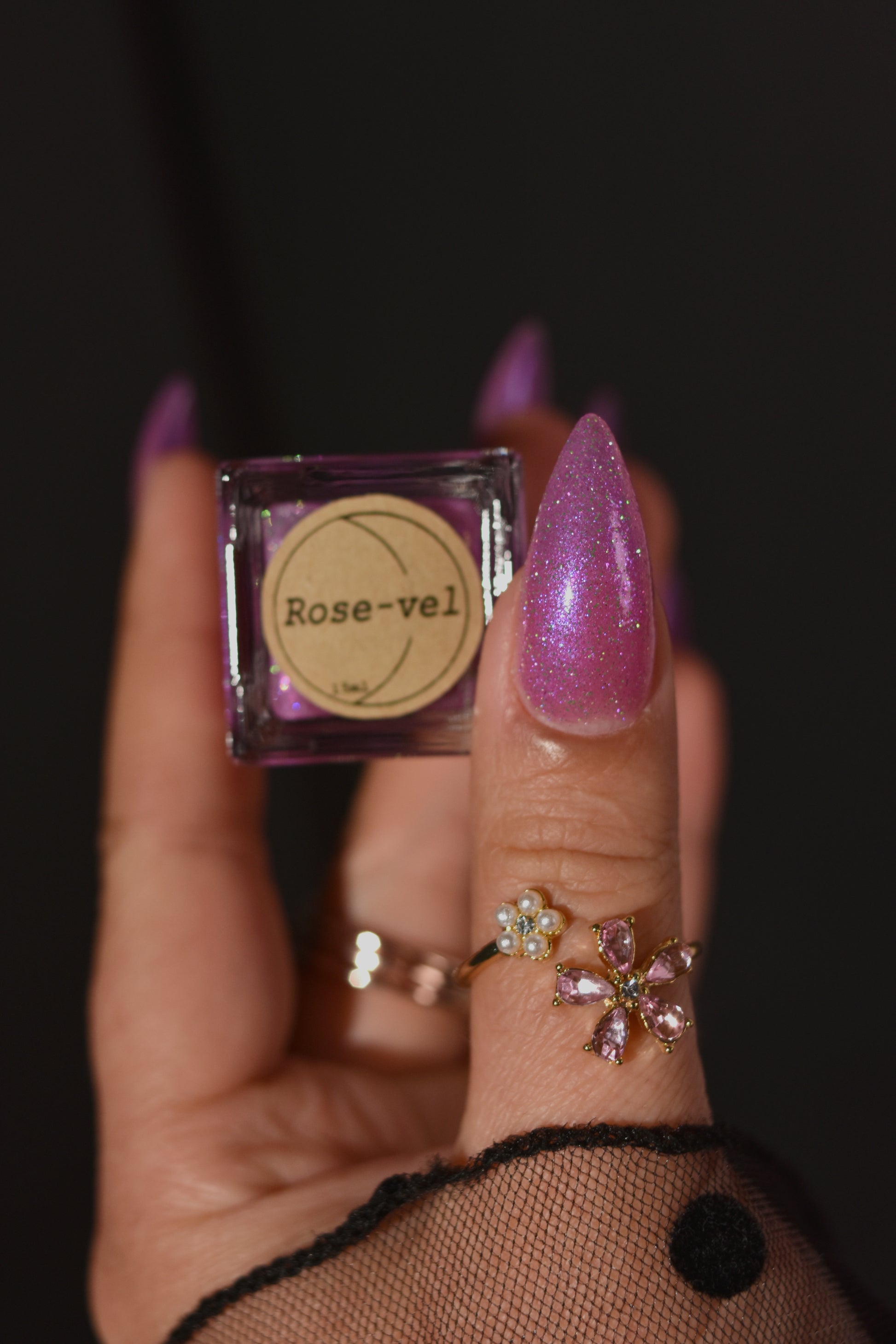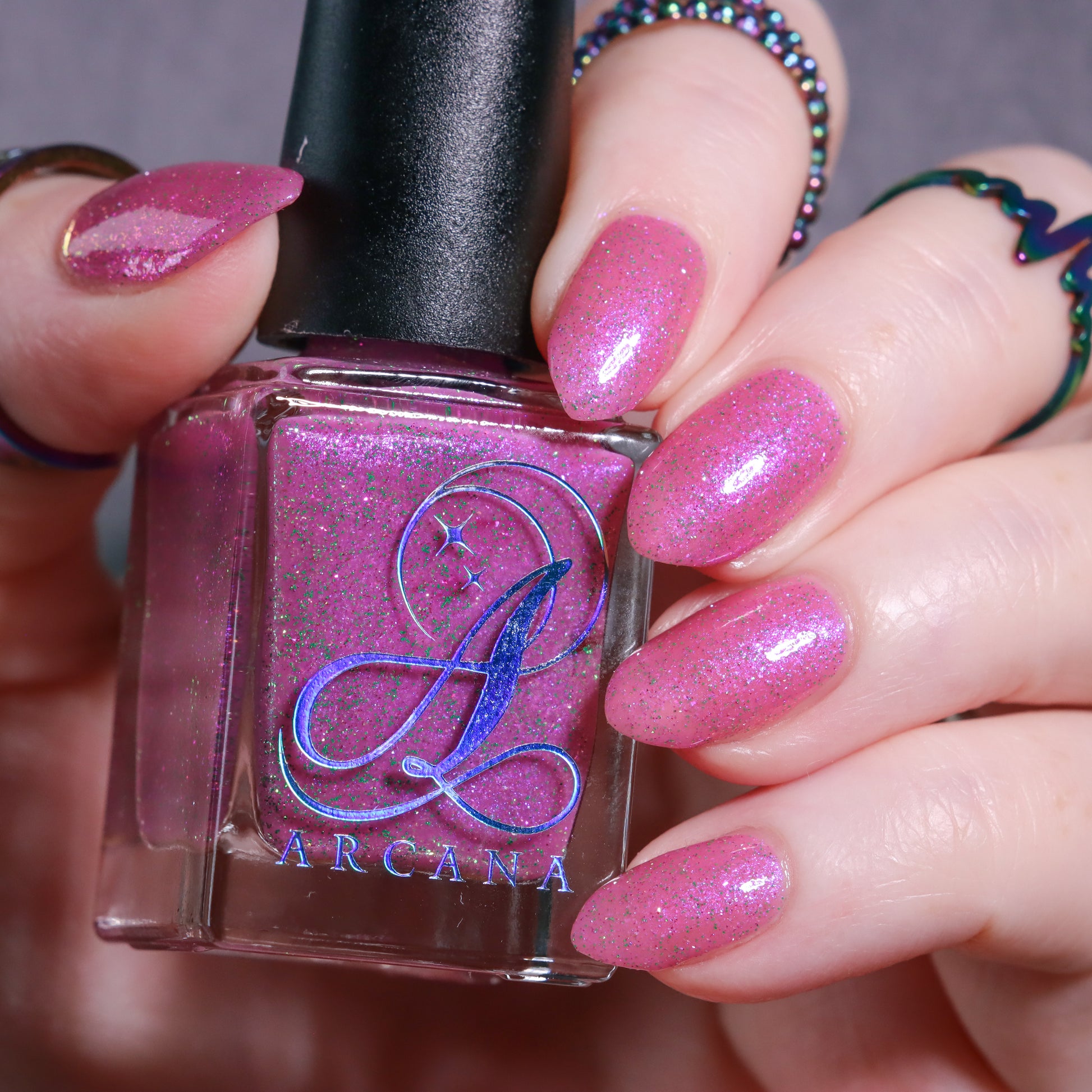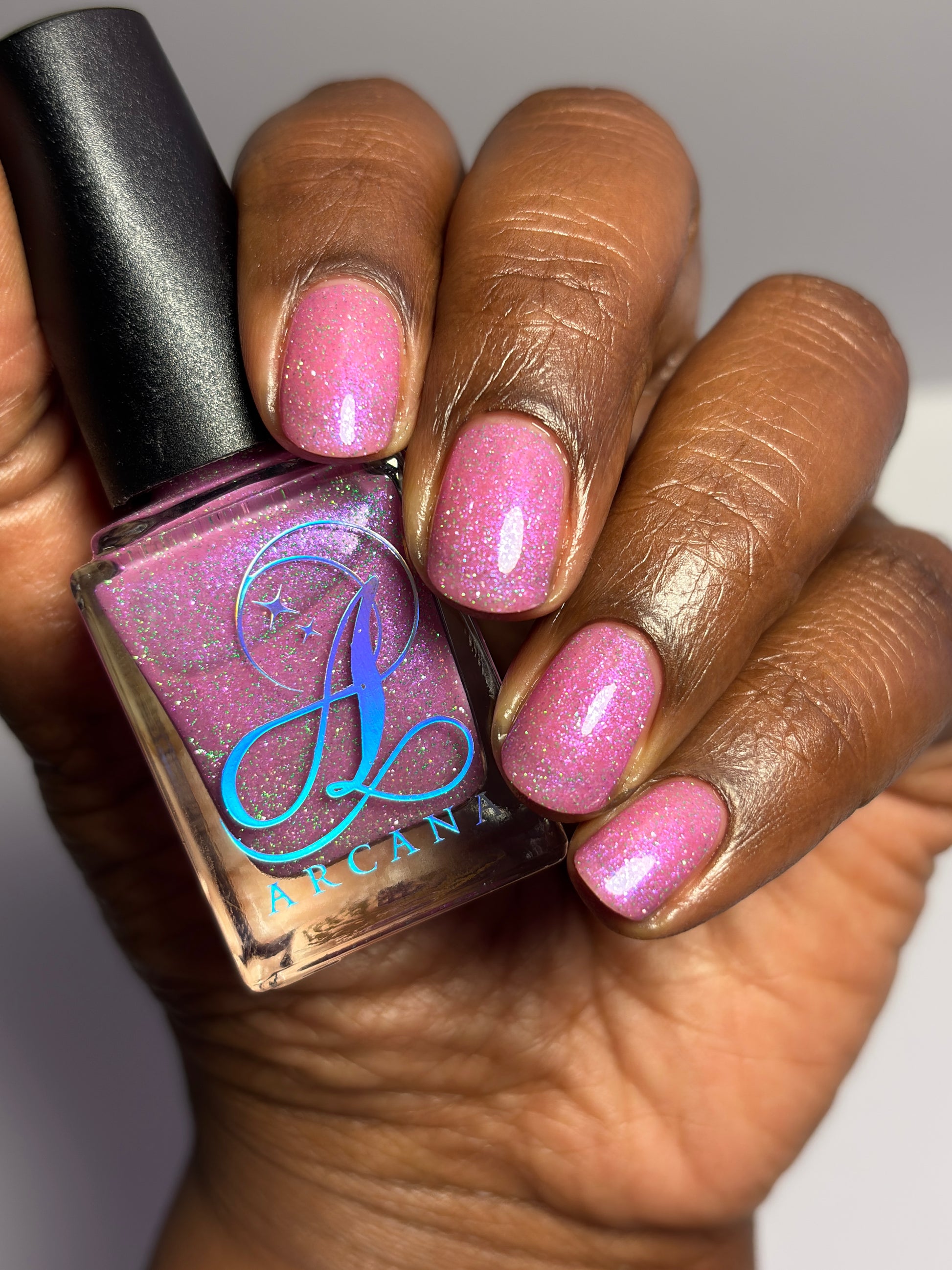 Rose-vel is a soft pink base with green and pink reflective glitter and blue-purple shimmers.