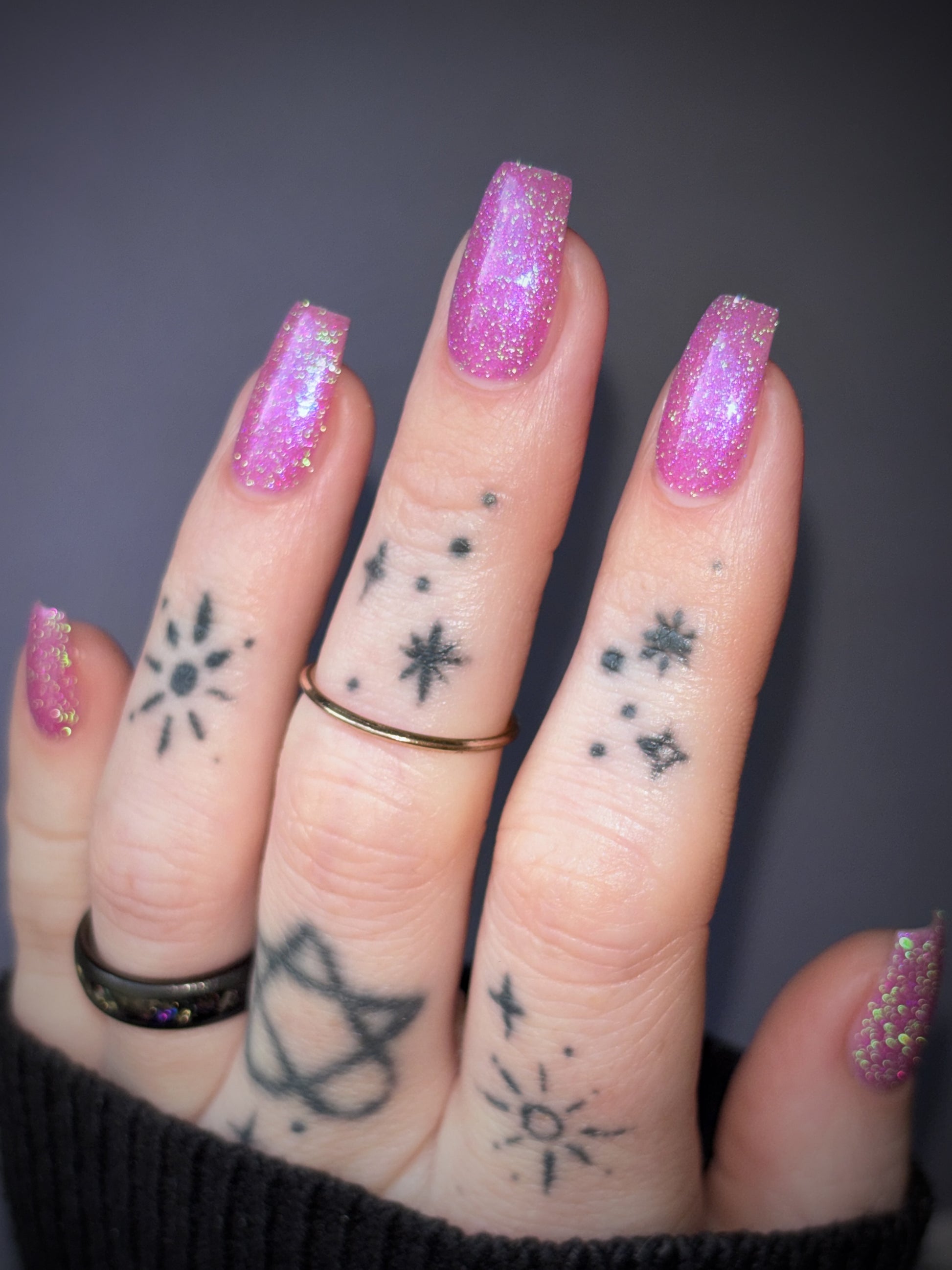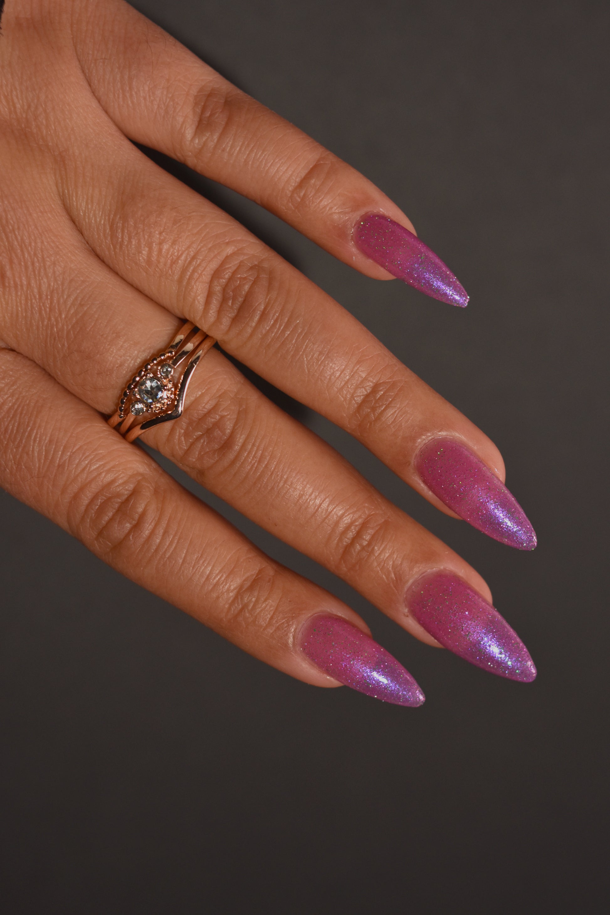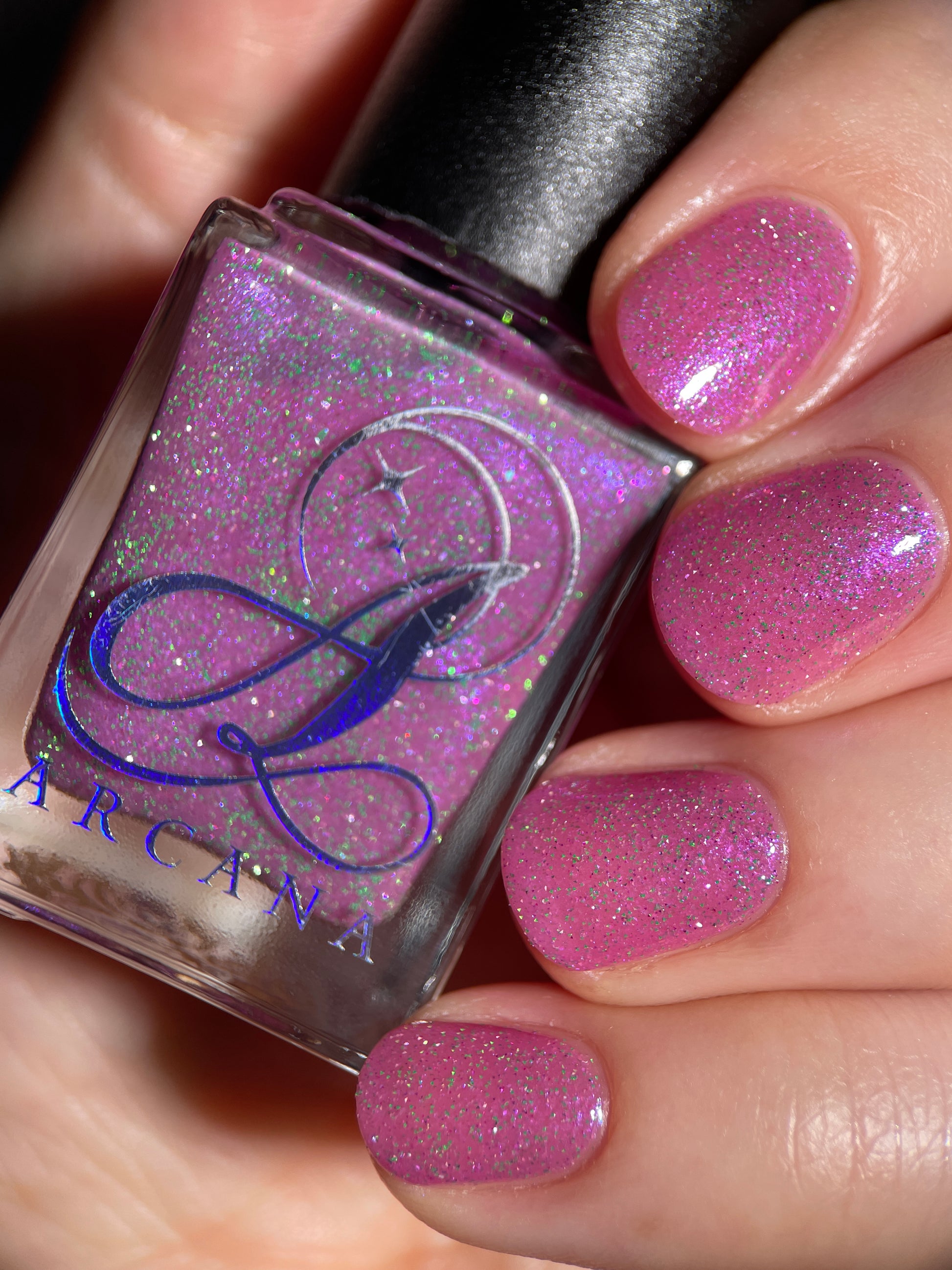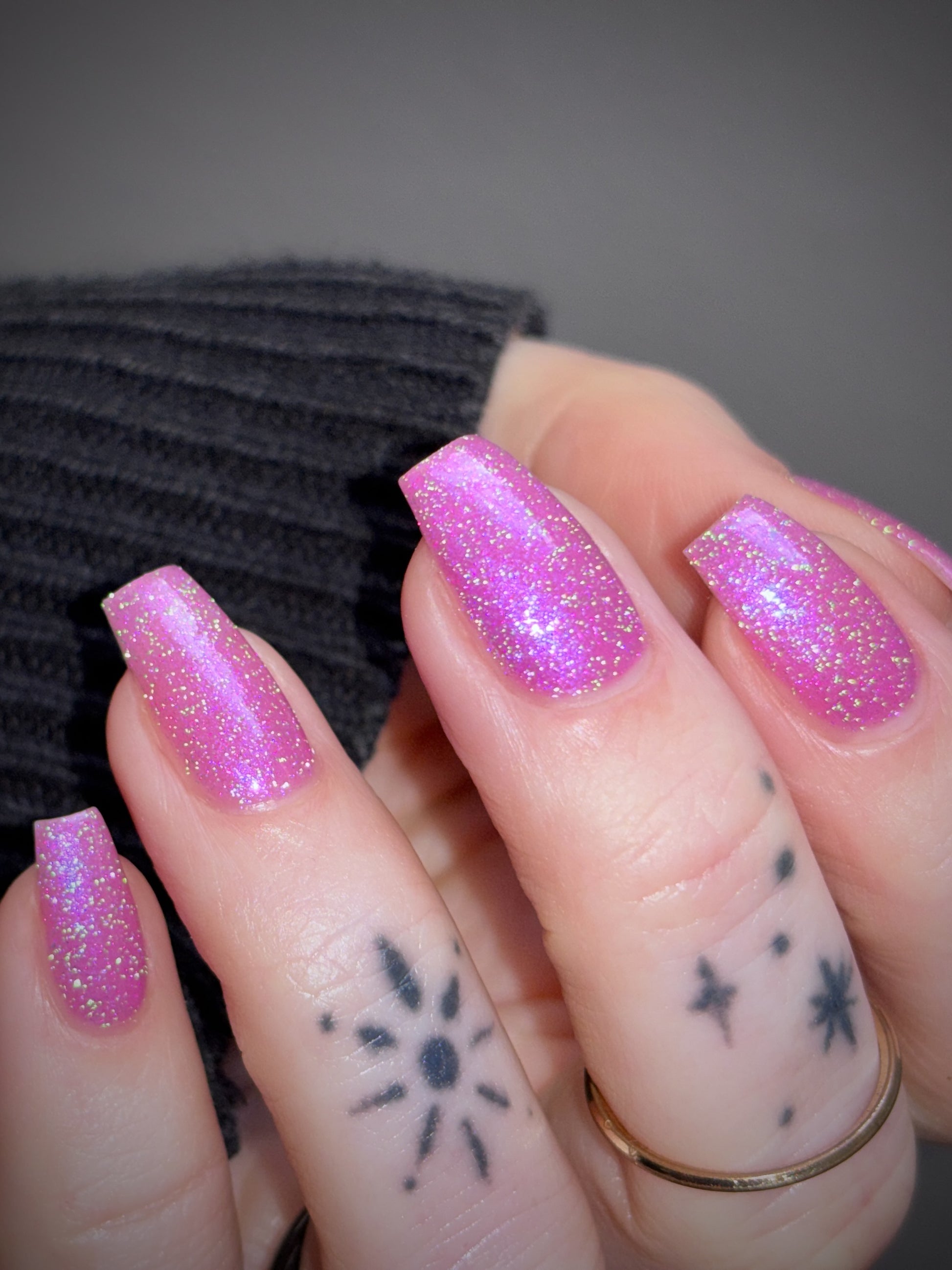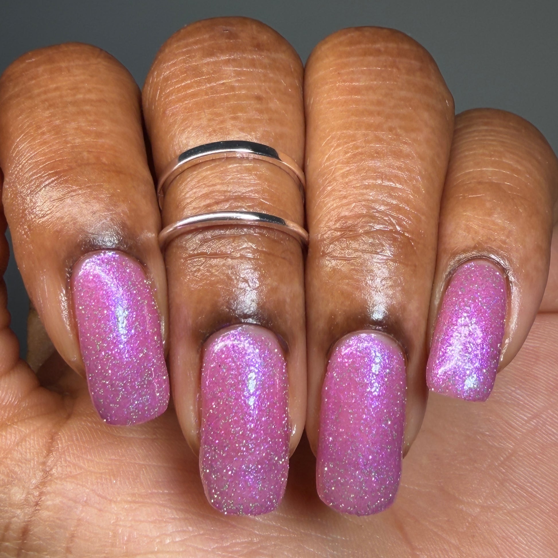 Rose-vel is a soft pink base with green and pink reflective glitter and blue-purple shimmers.