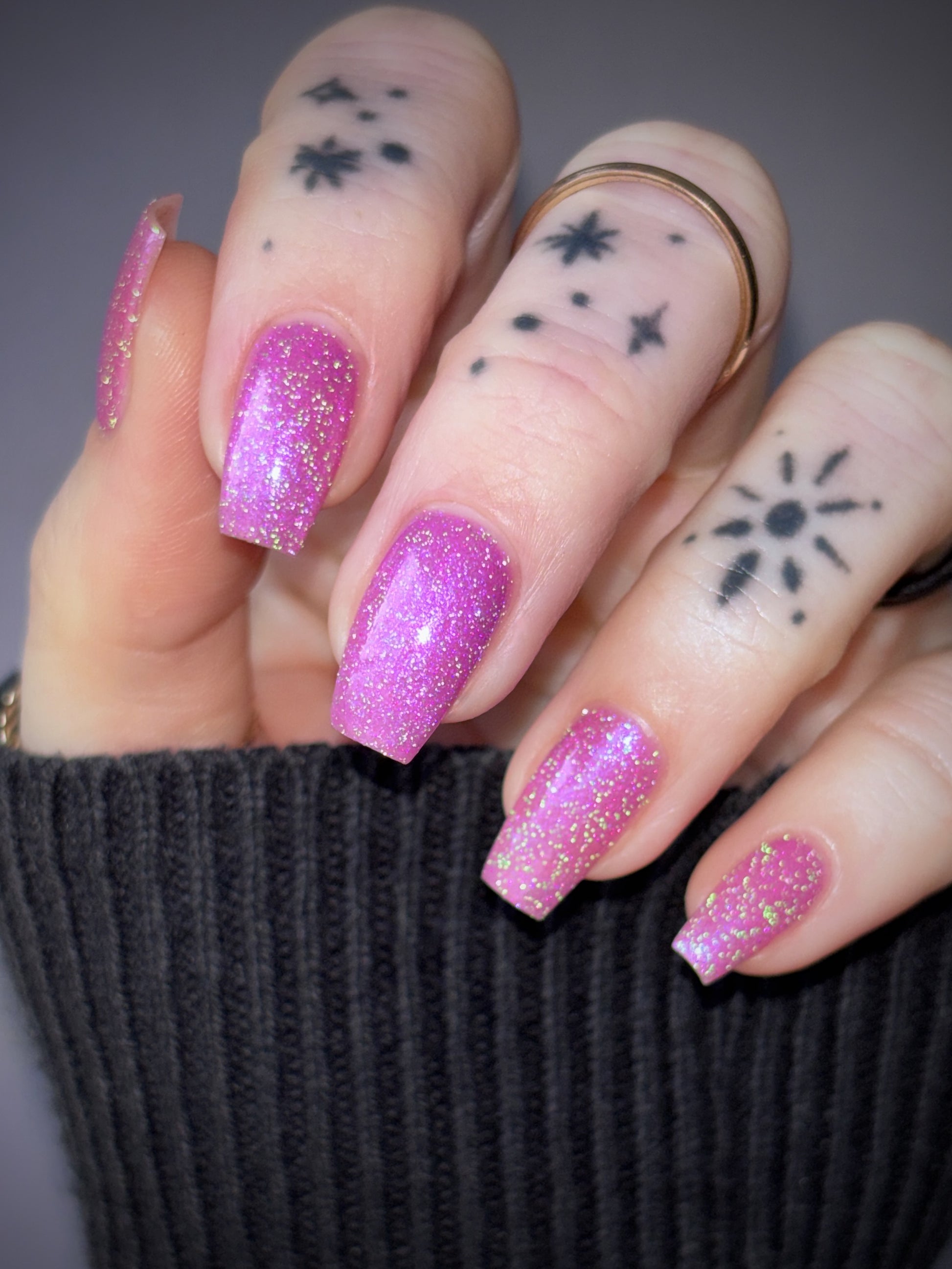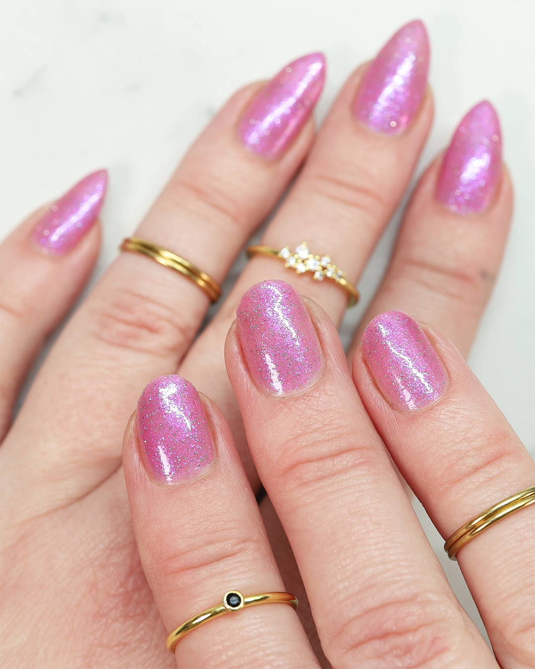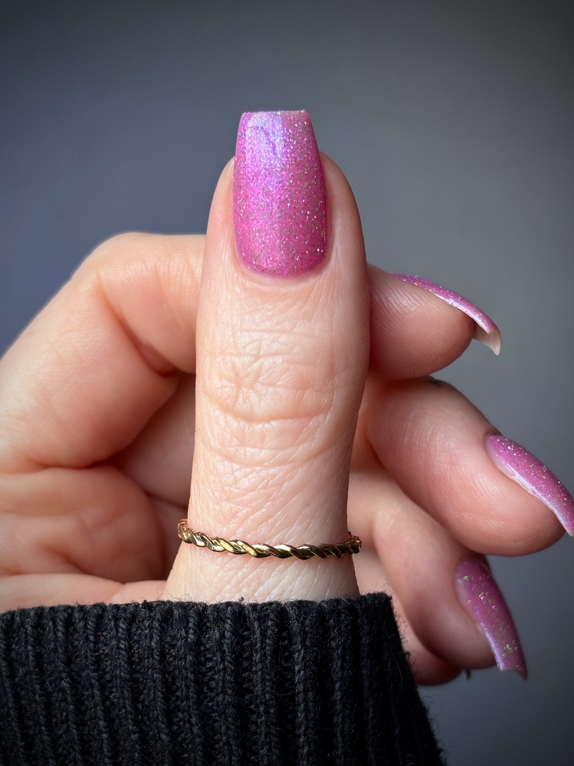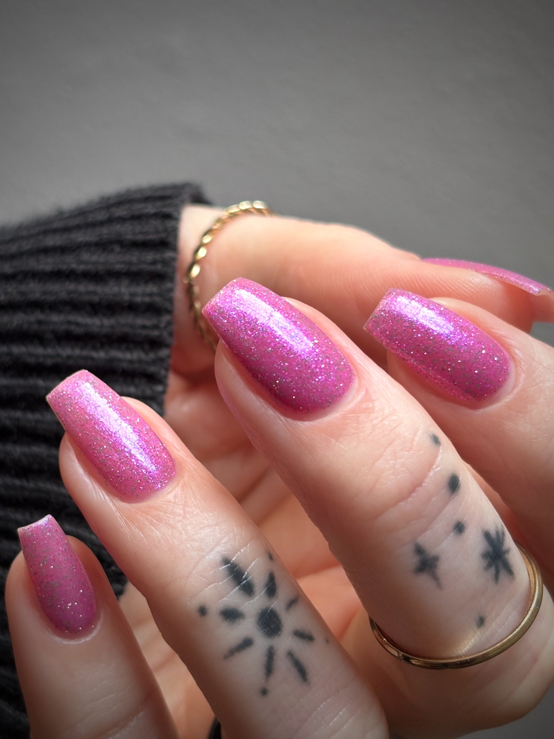 Rose-vel is a soft pink base with green and pink reflective glitter and blue-purple shimmers.
