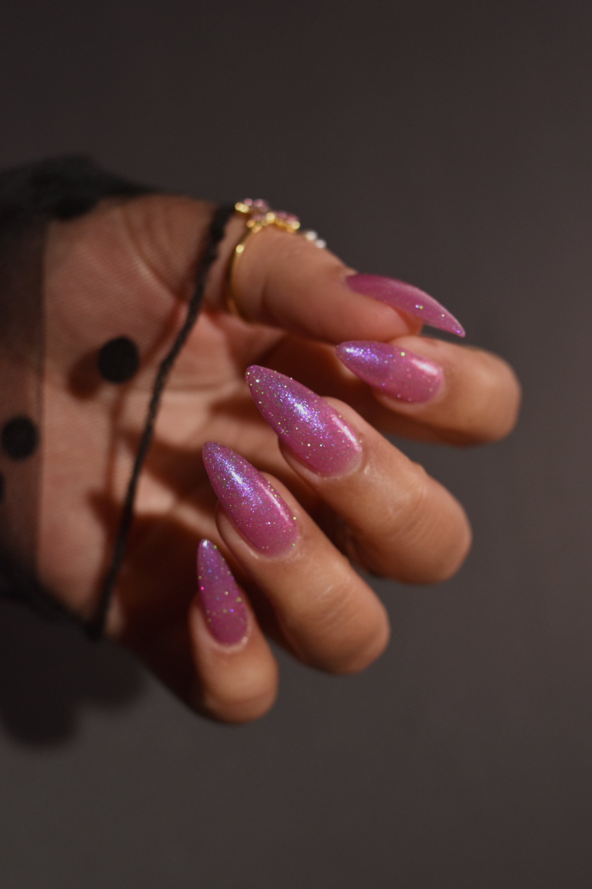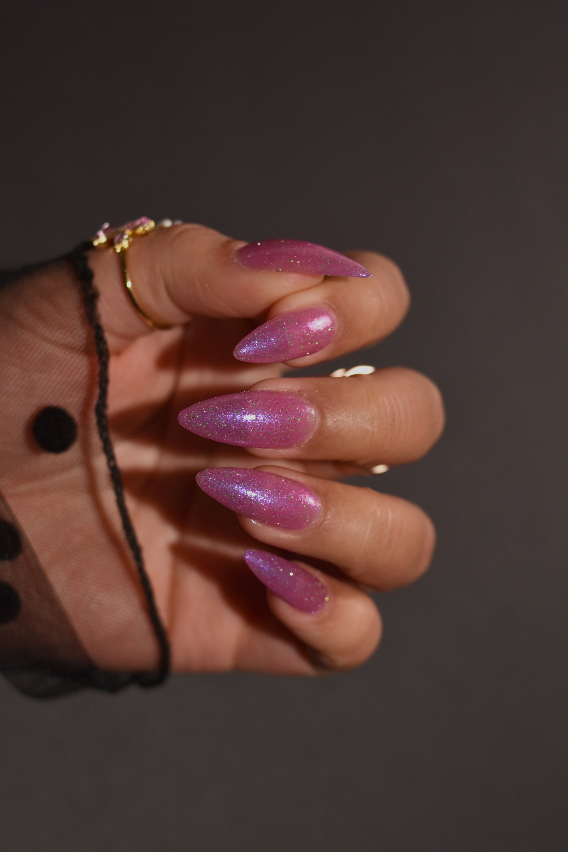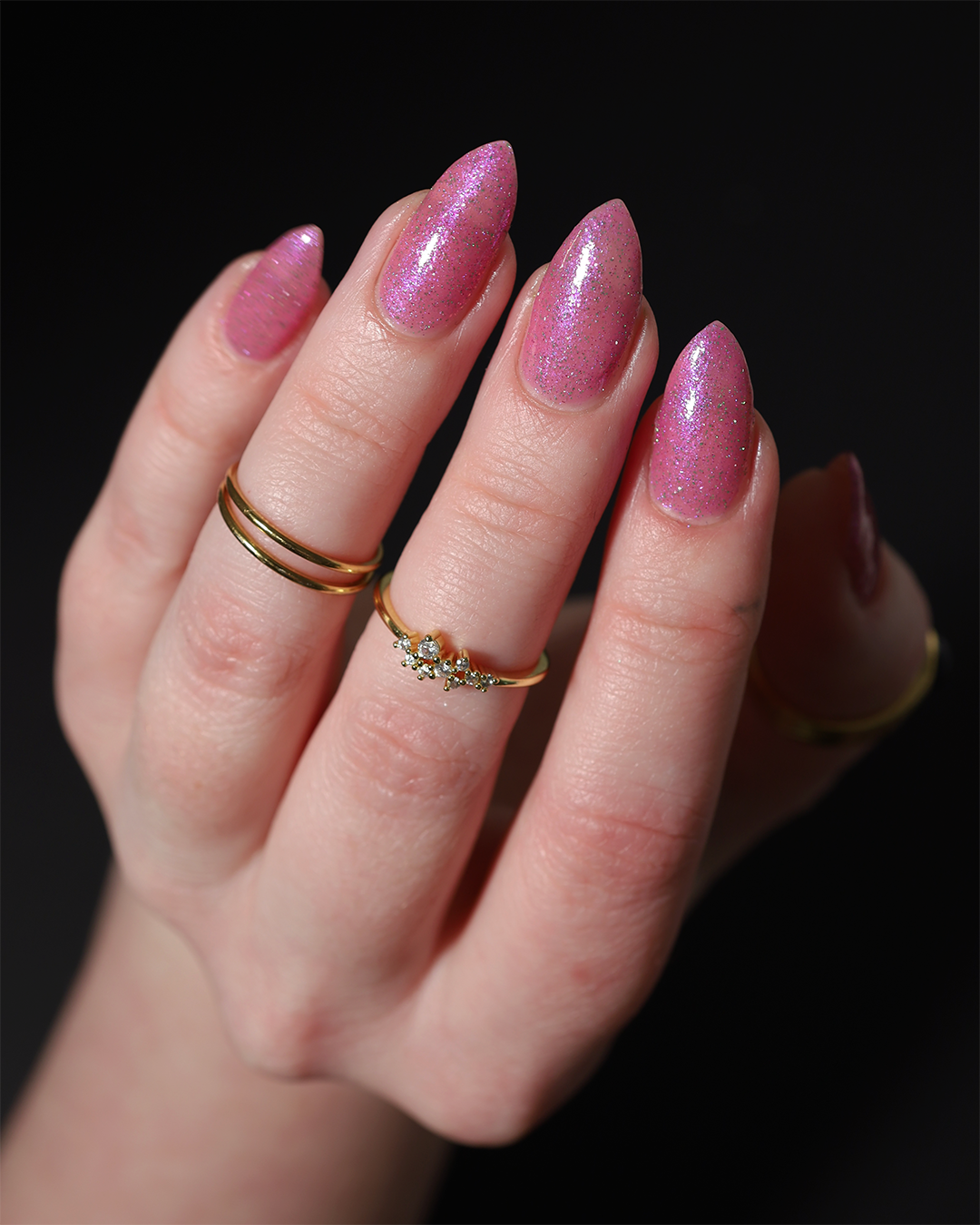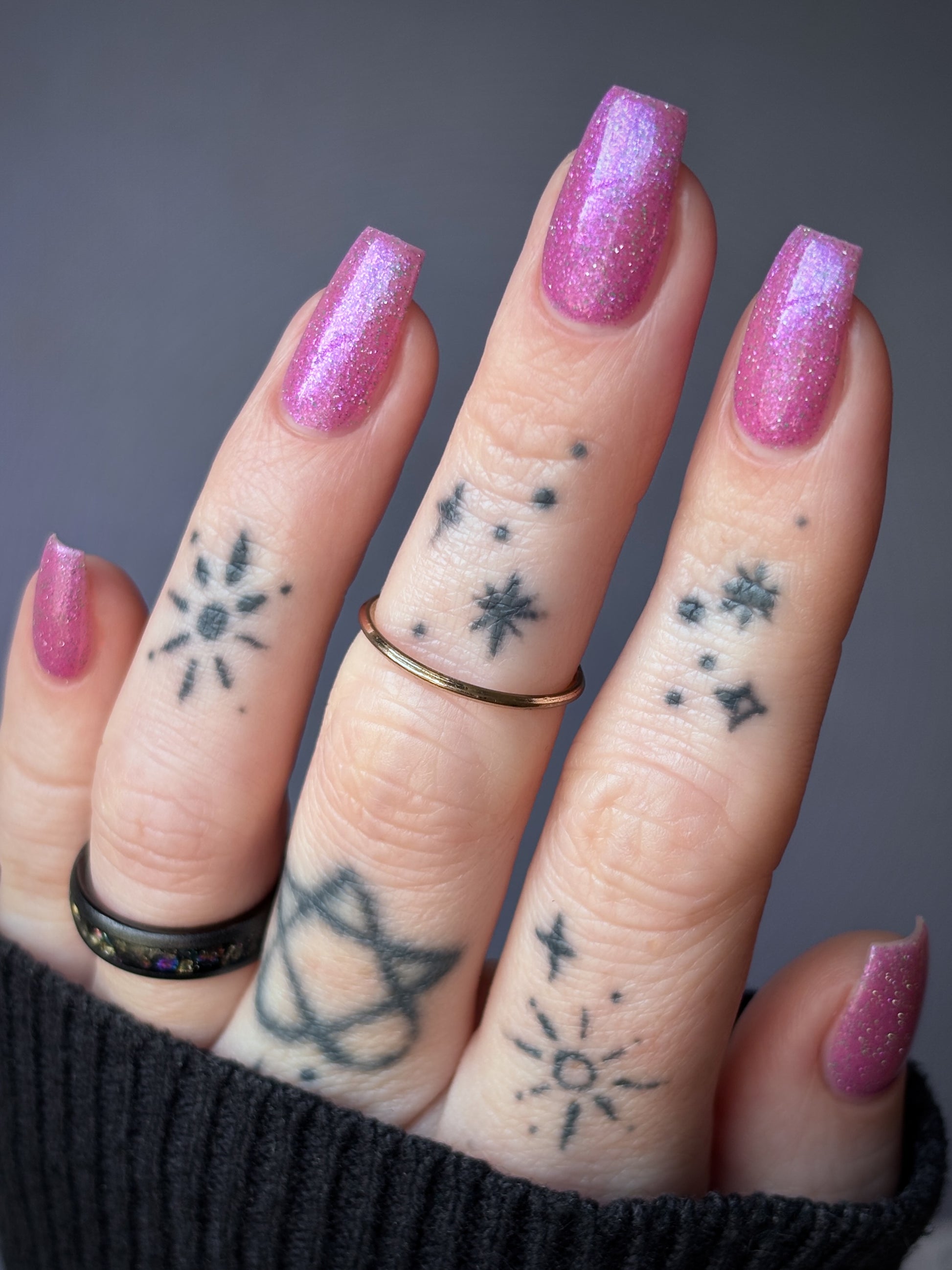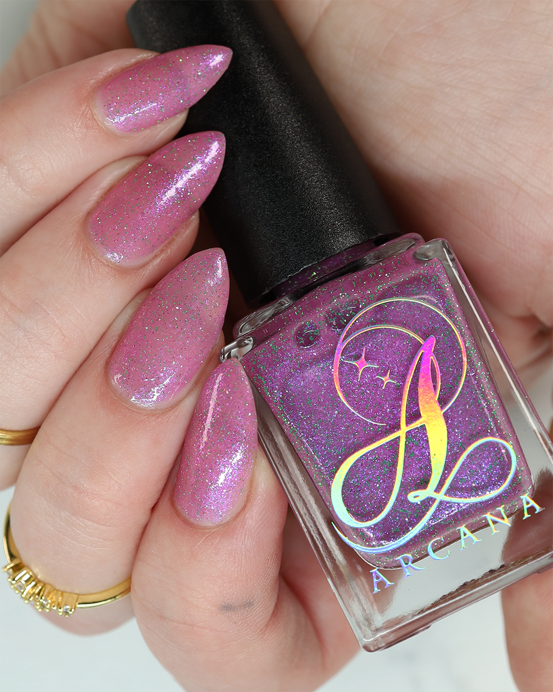 Rose-vel is a soft pink base with green and pink reflective glitter and blue-purple shimmers.