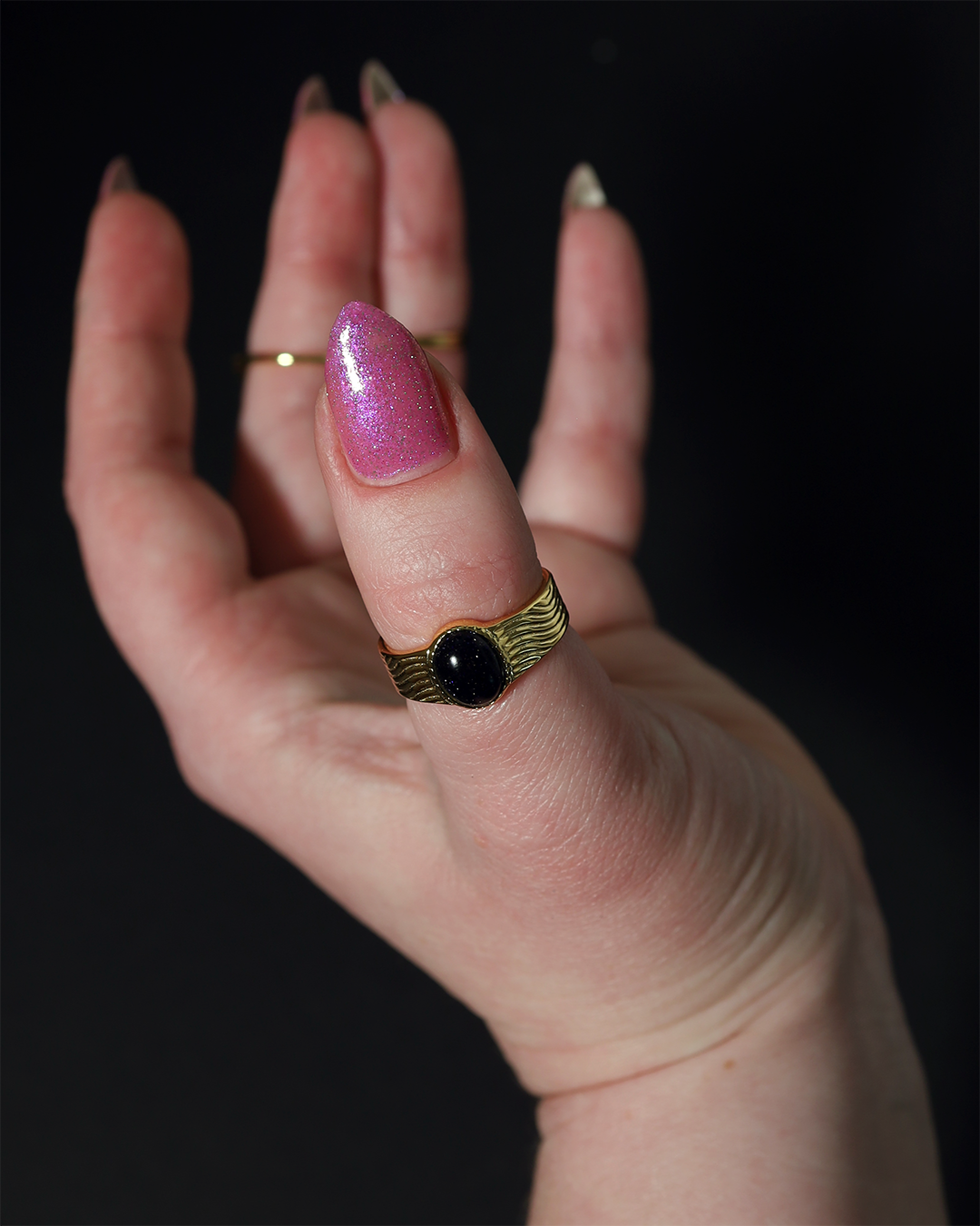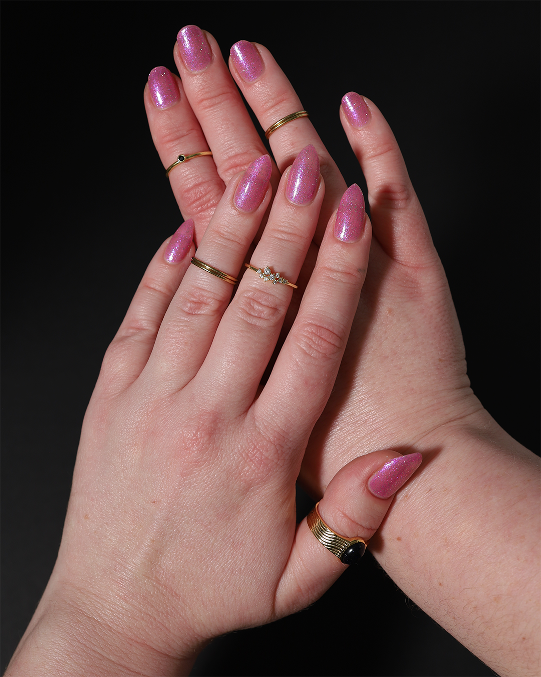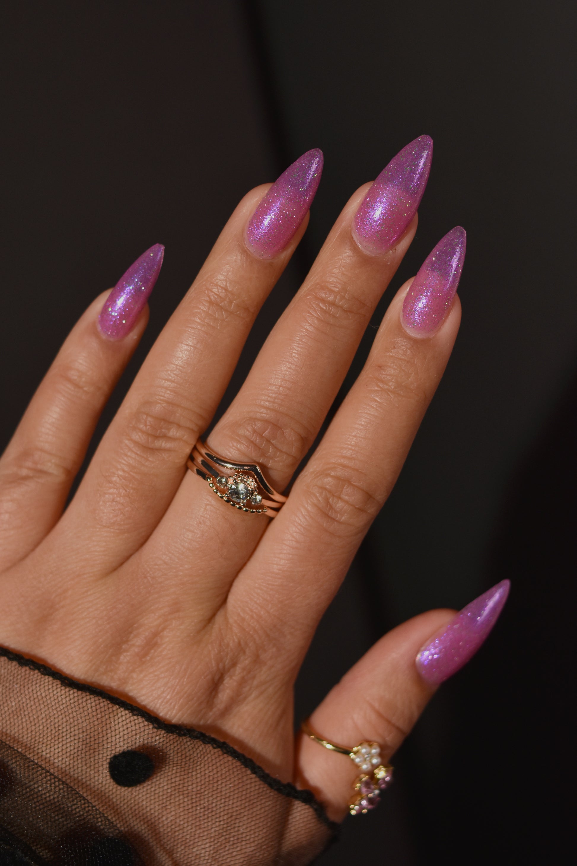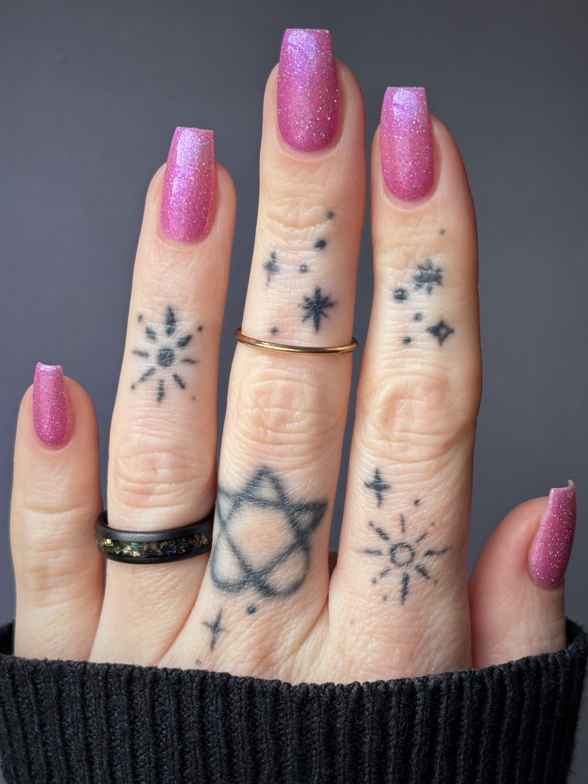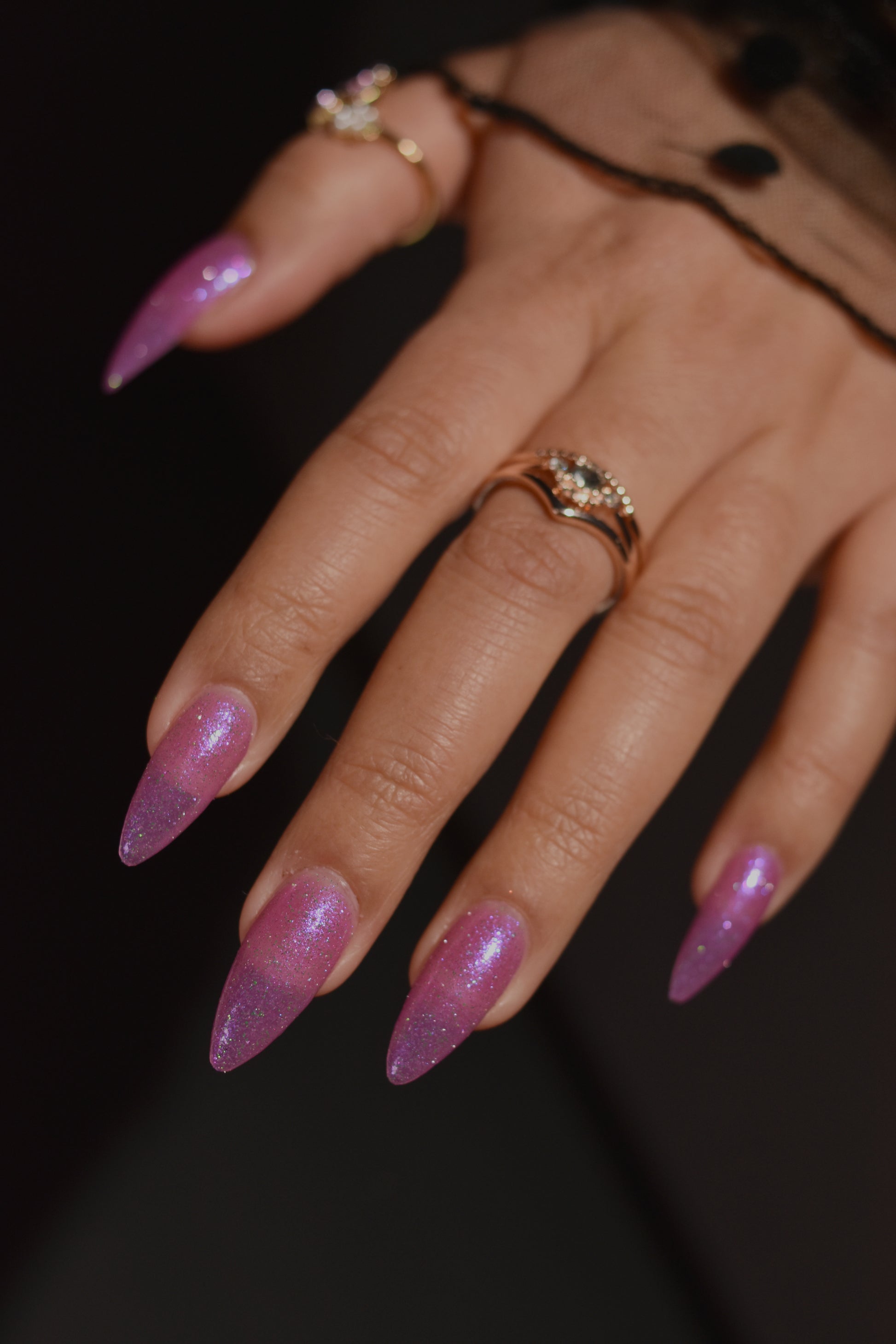 Rose-vel is a soft pink base with green and pink reflective glitter and blue-purple shimmers.