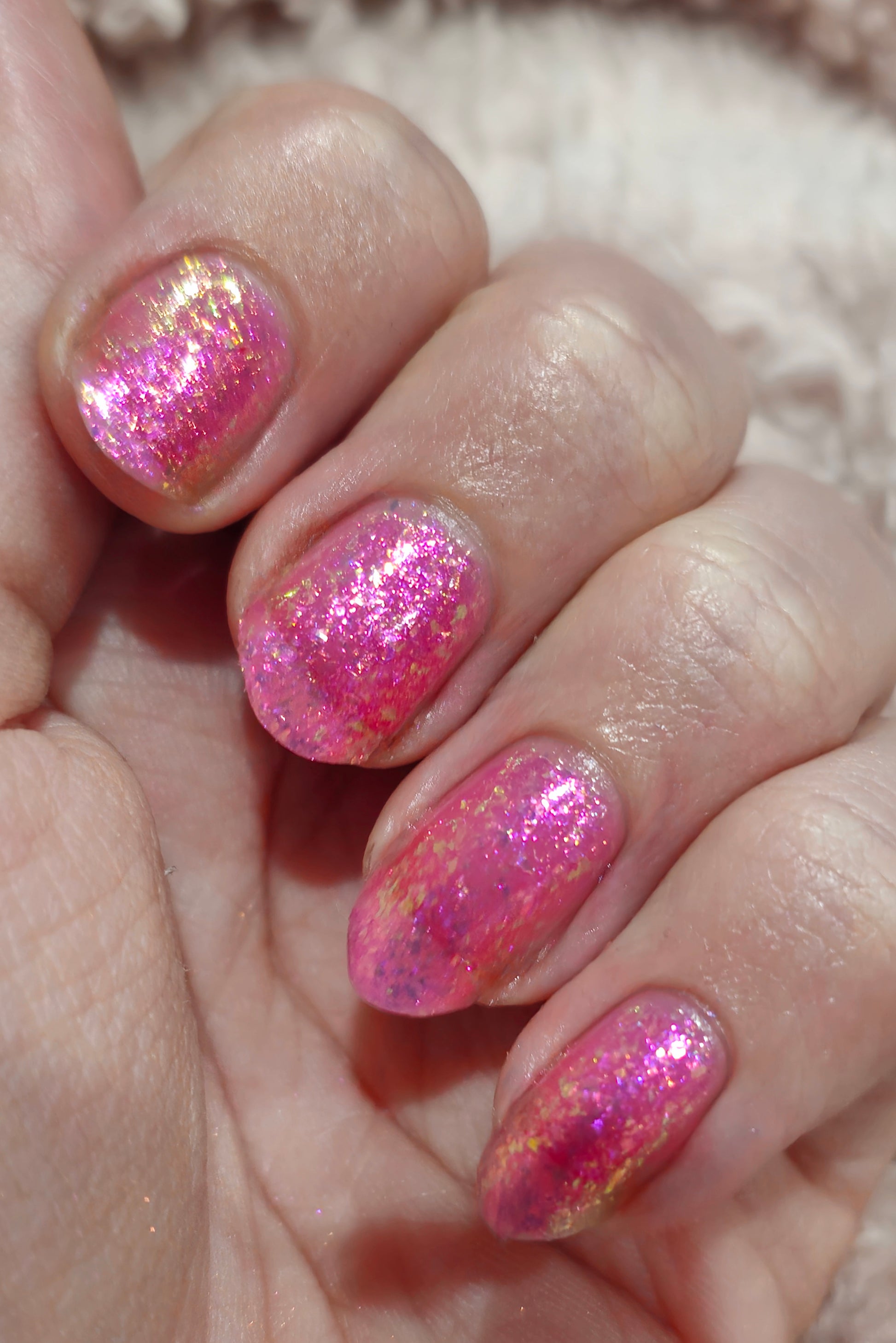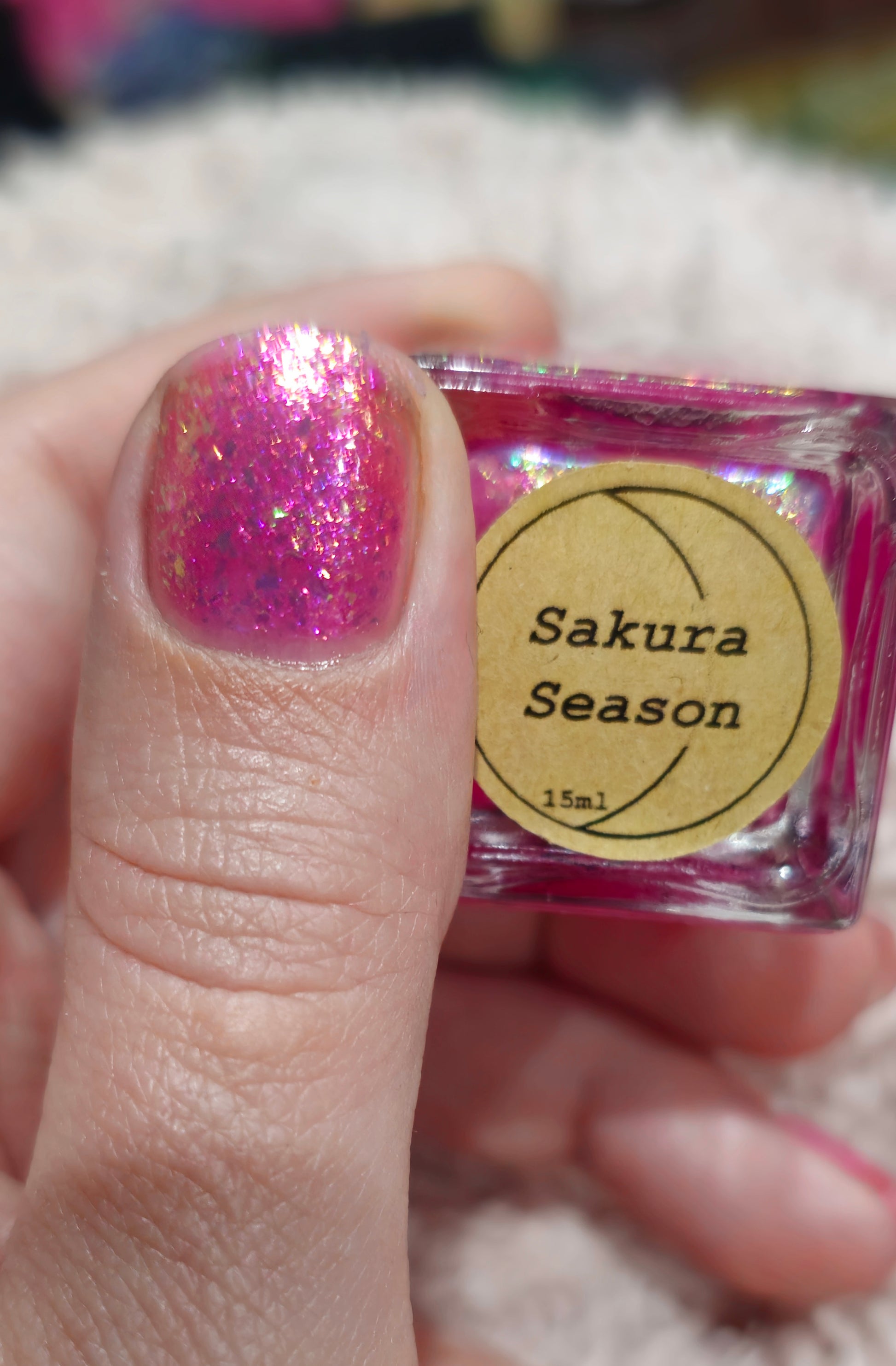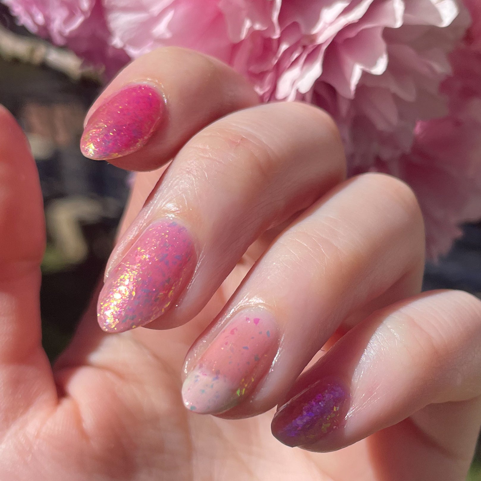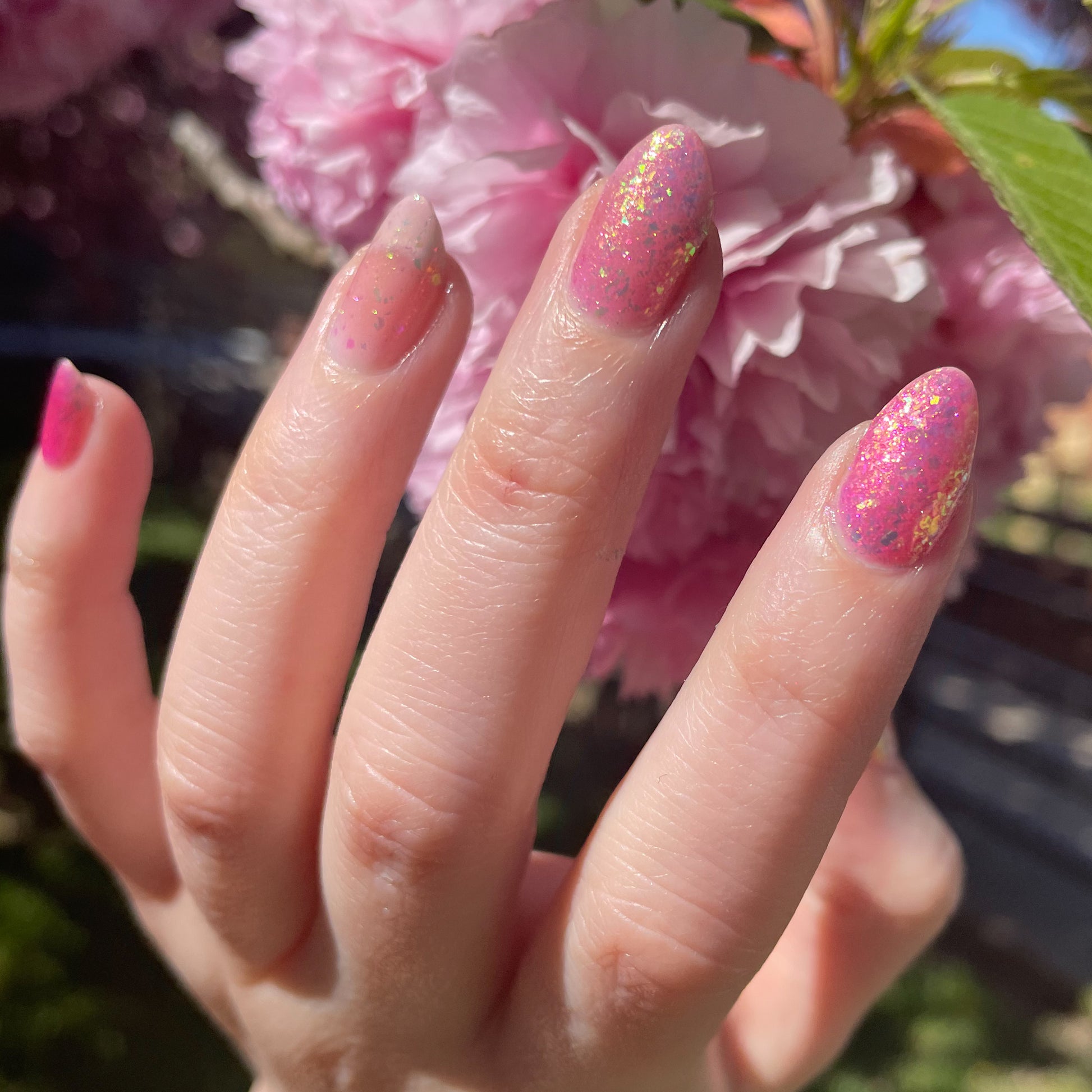 Sakura Season is a pink jelly base with pink to purple shimmer and pink to yellow to green flakies. This works well on it's own or as a topper! Try pairing with our other spring polishes for a truly seasonal effect! 🌸