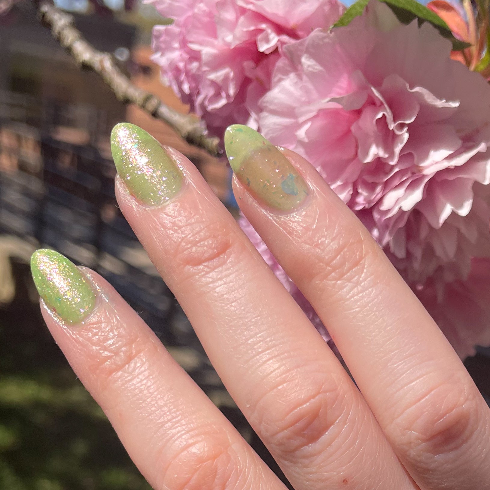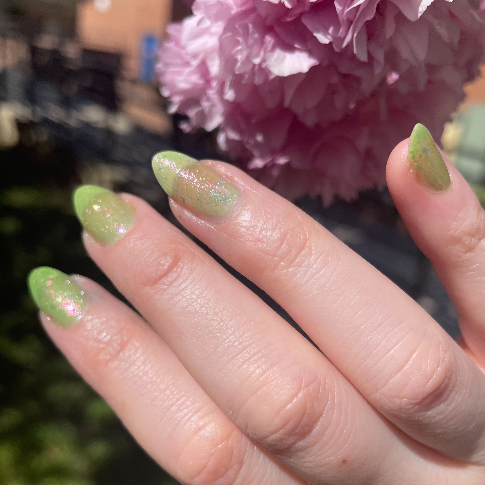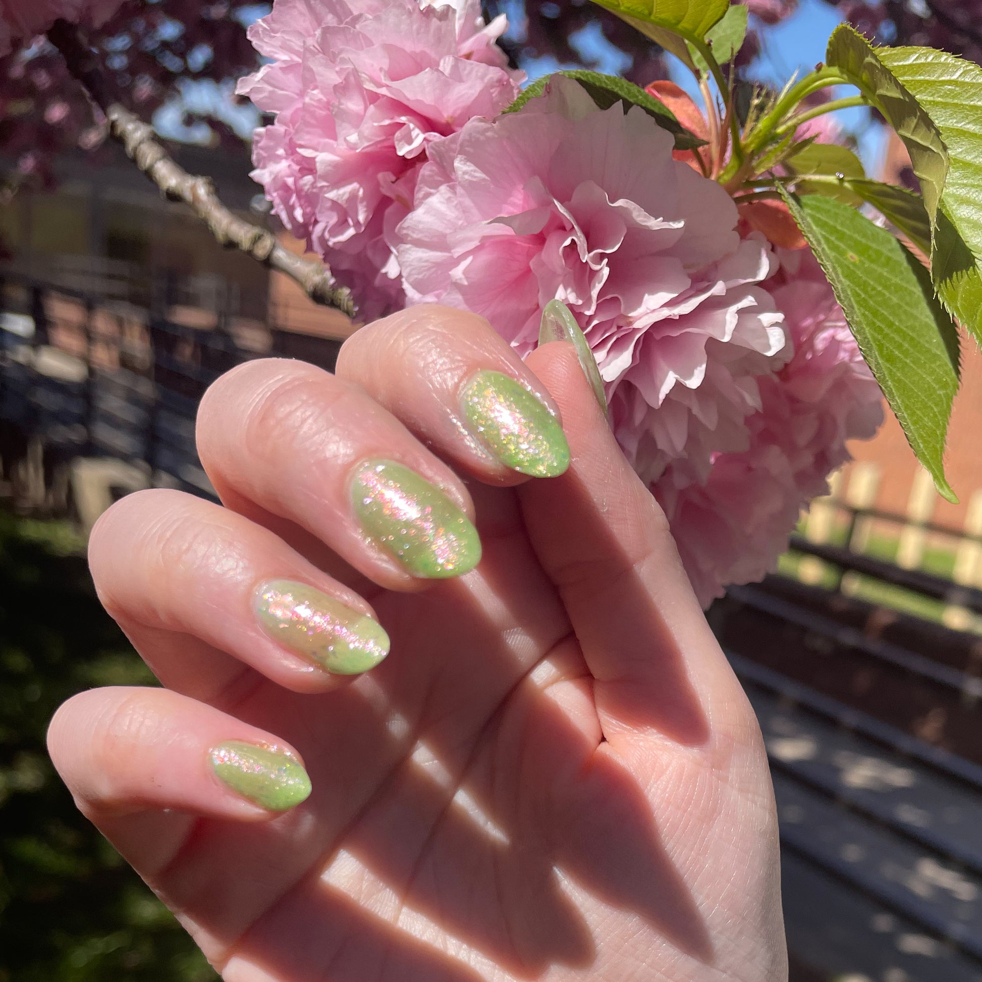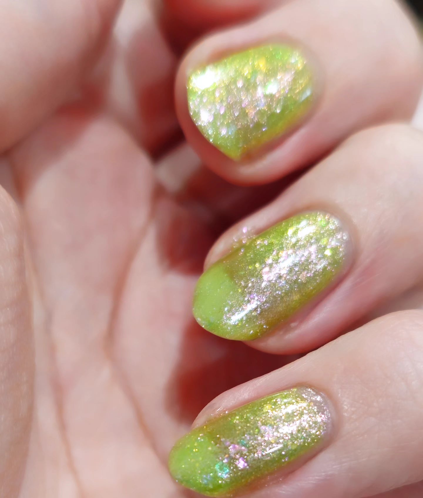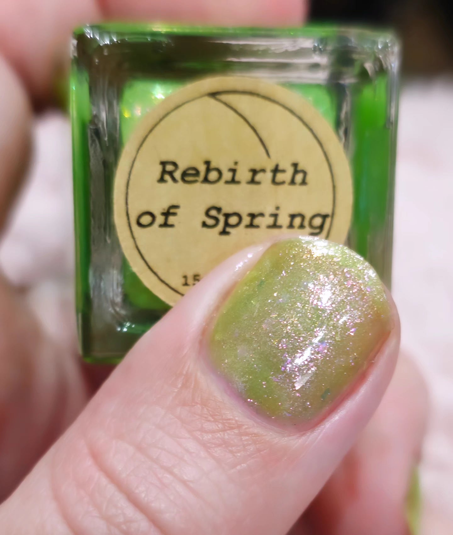 Rebirth of Spring is an ode to the first flowers to pop up after a long winter. The bright green crelly base is accented with both pink to gold shimmer and iridescent flakies!