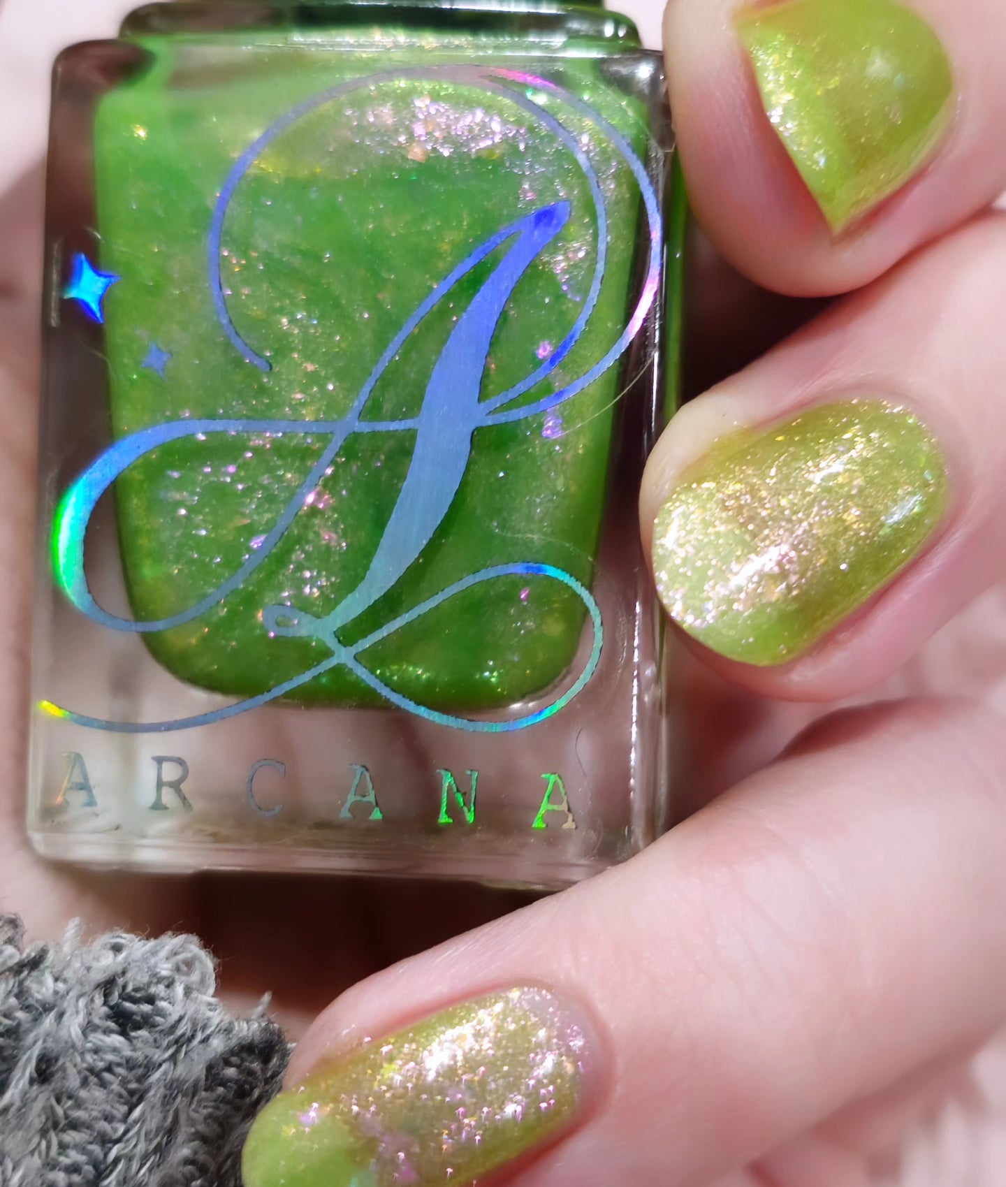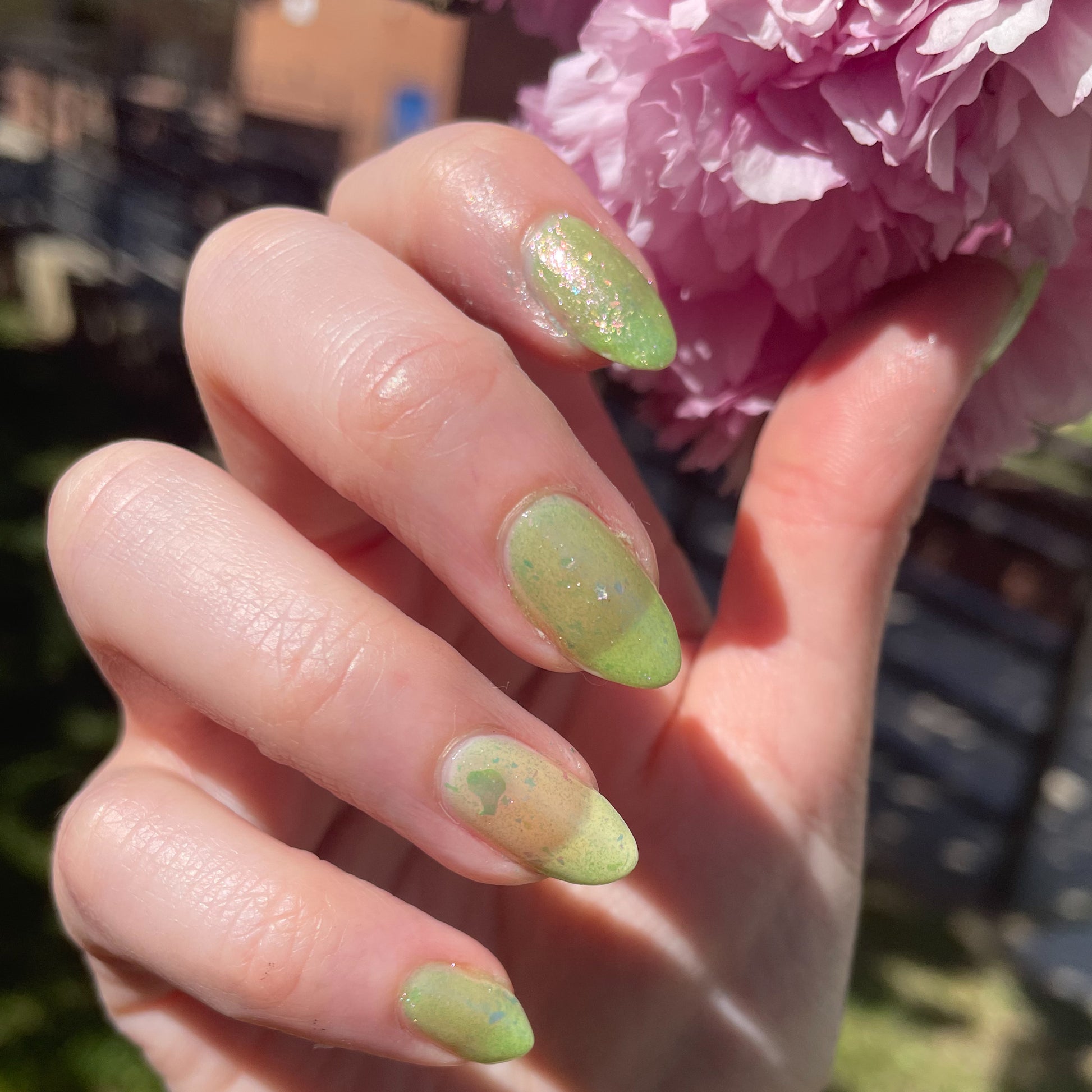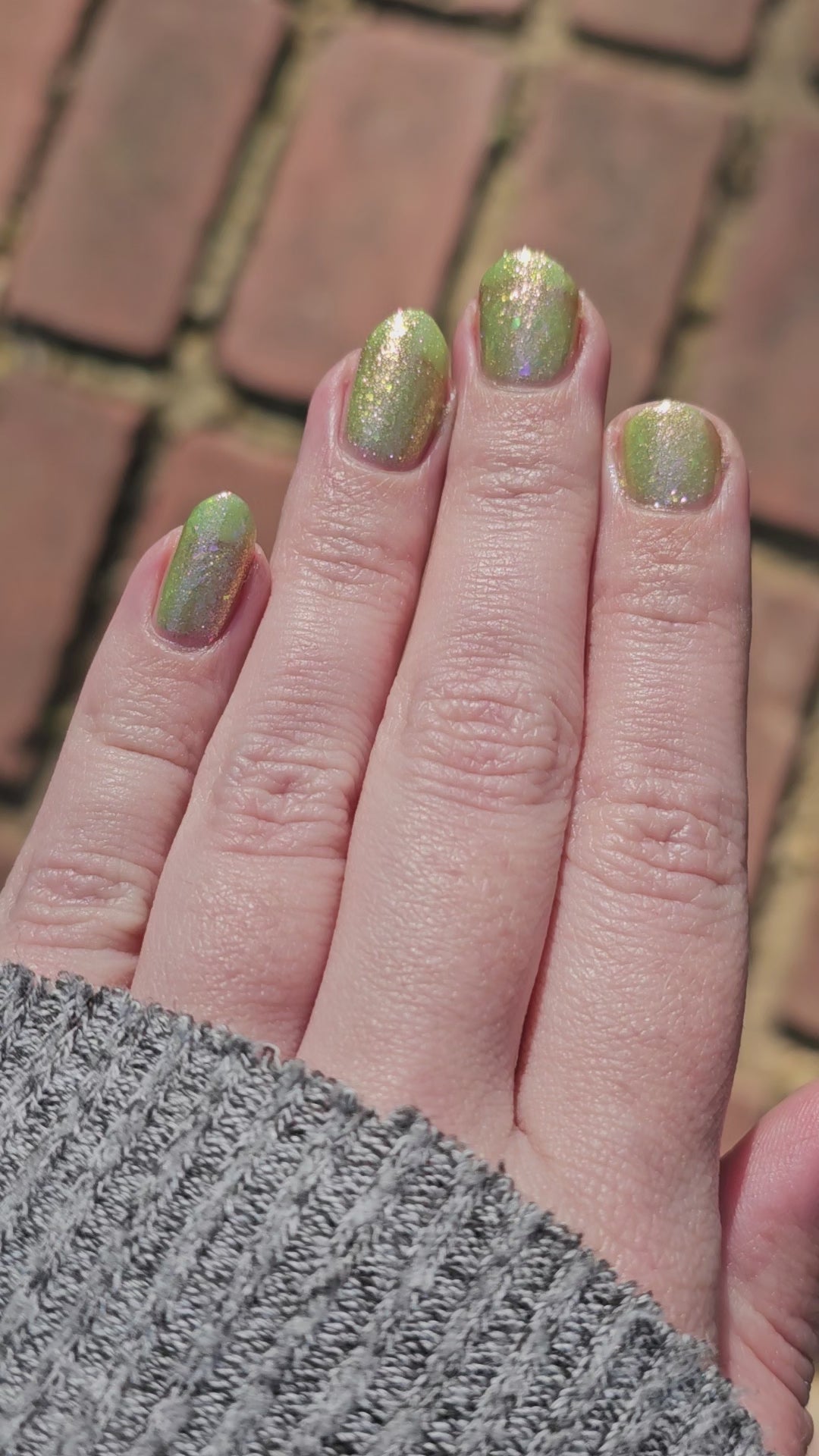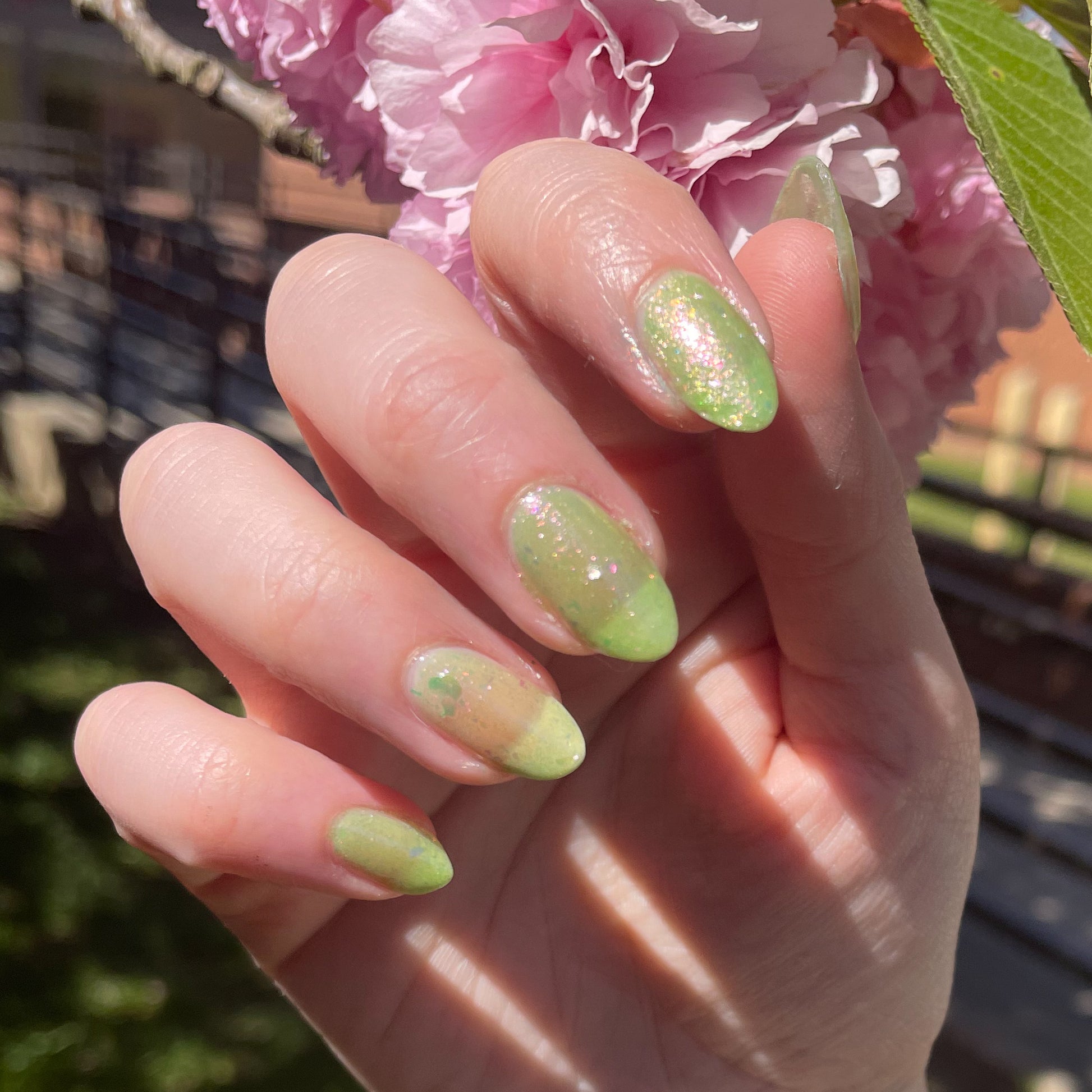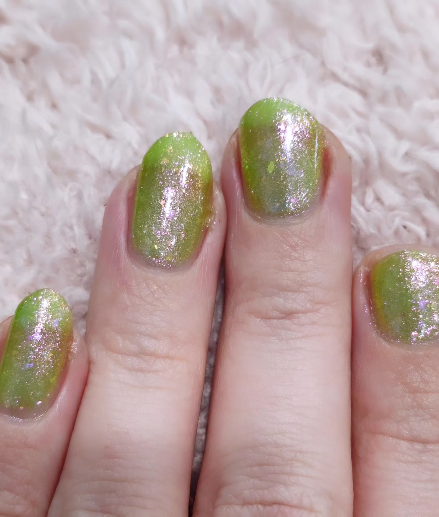 Rebirth of Spring is an ode to the first flowers to pop up after a long winter. The bright green crelly base is accented with both pink to gold shimmer and iridescent flakies!