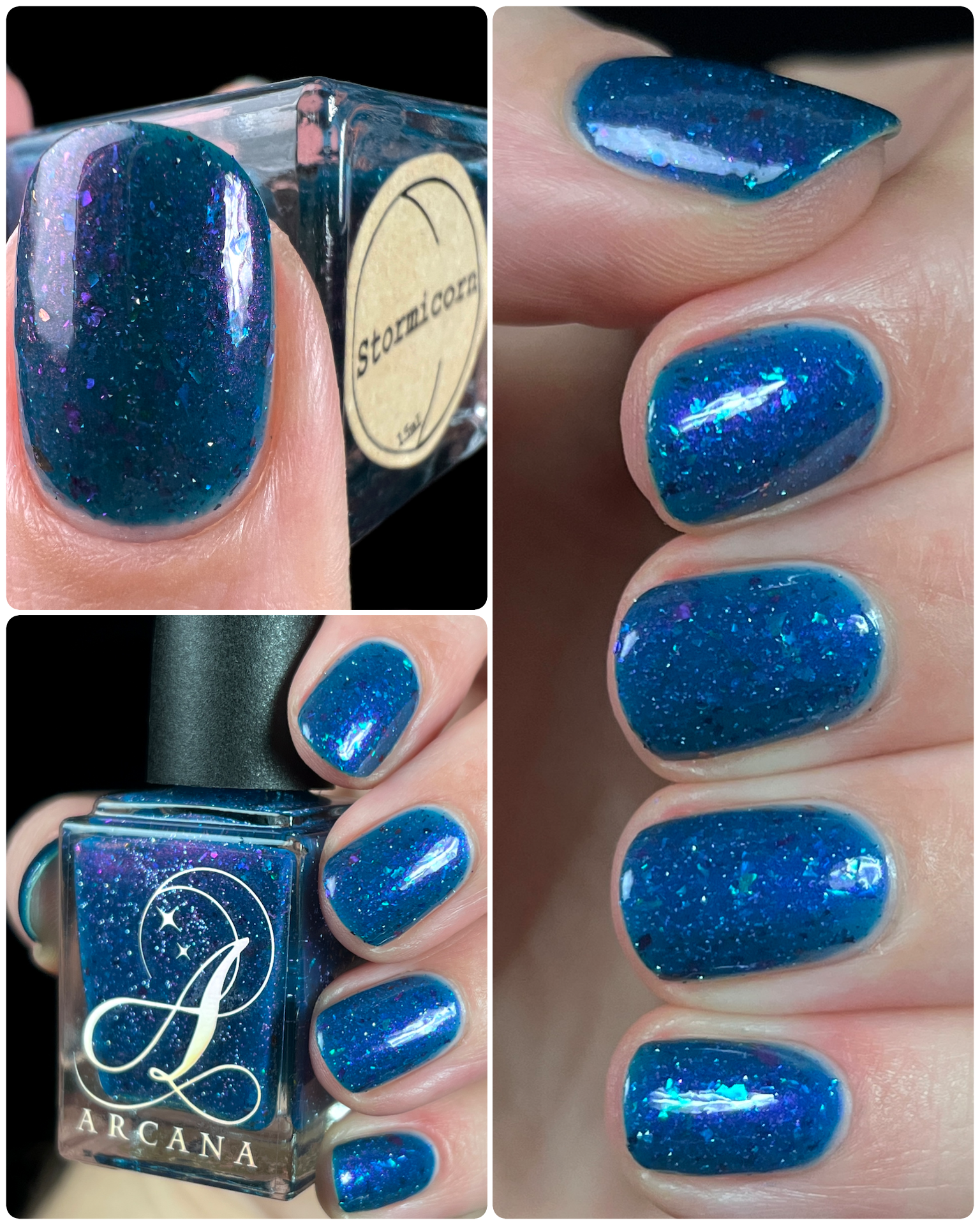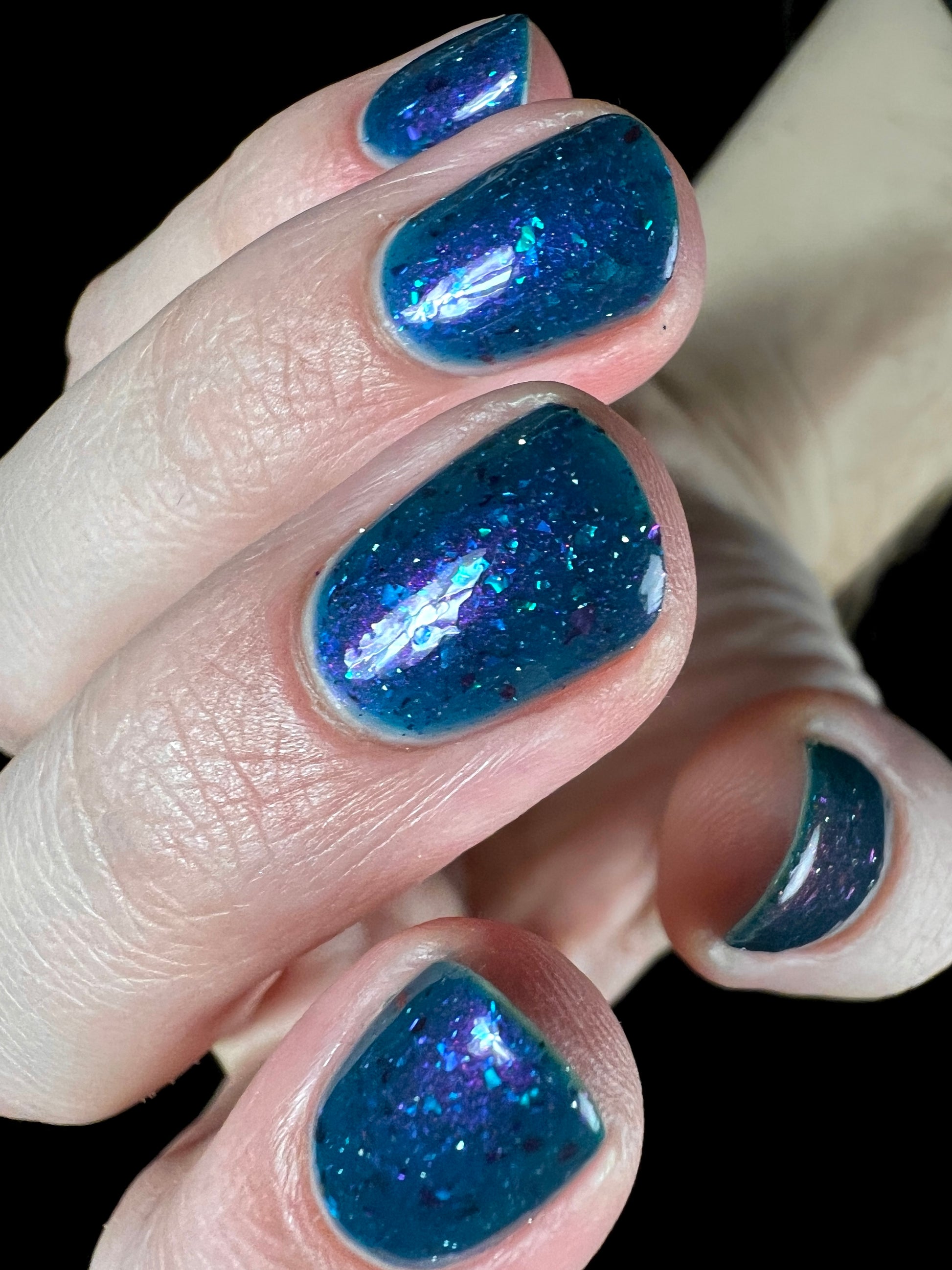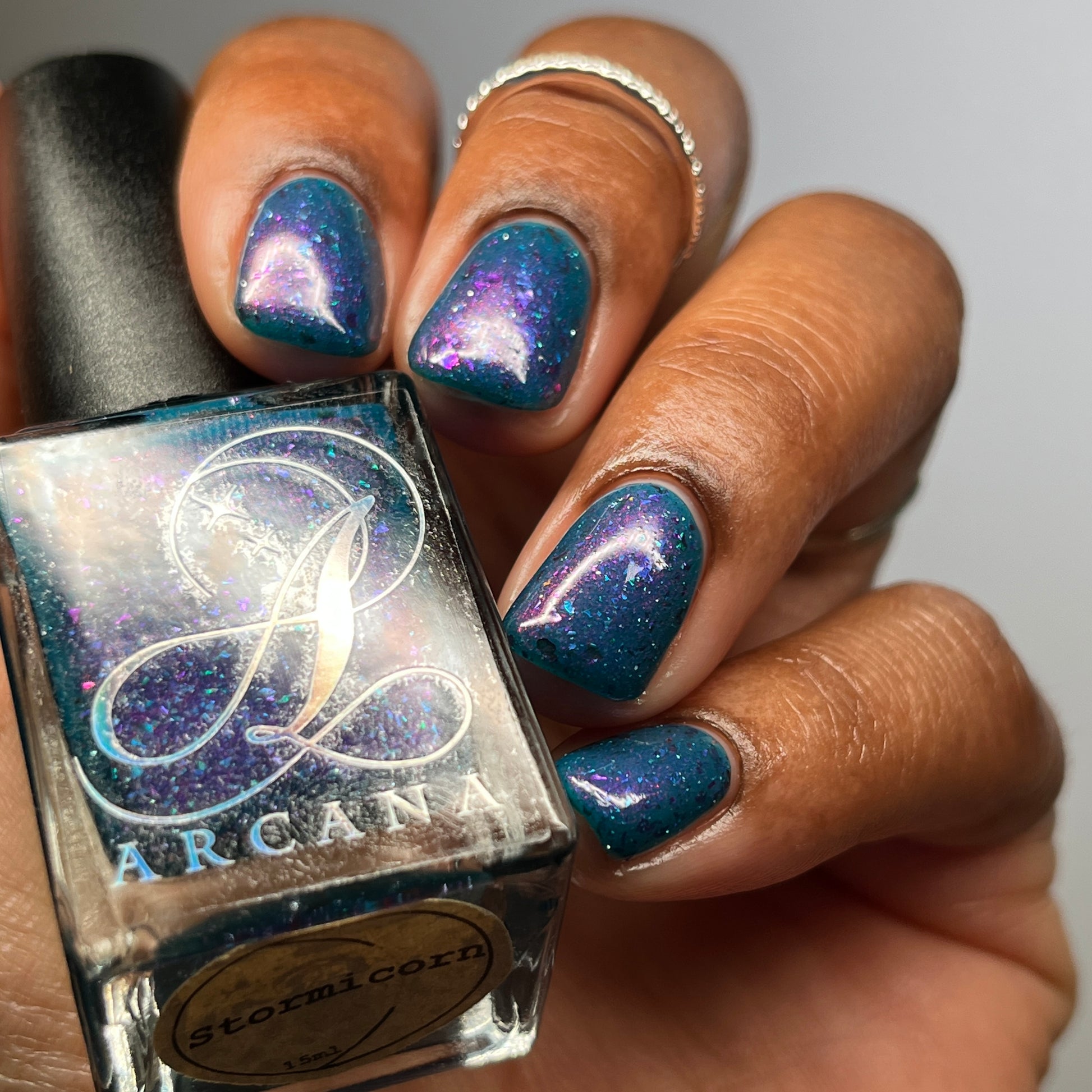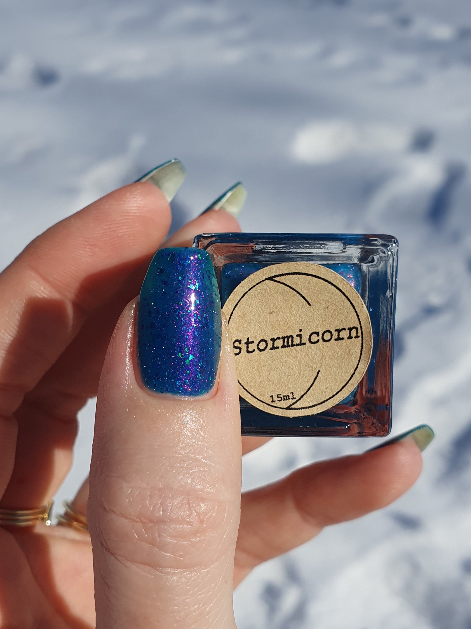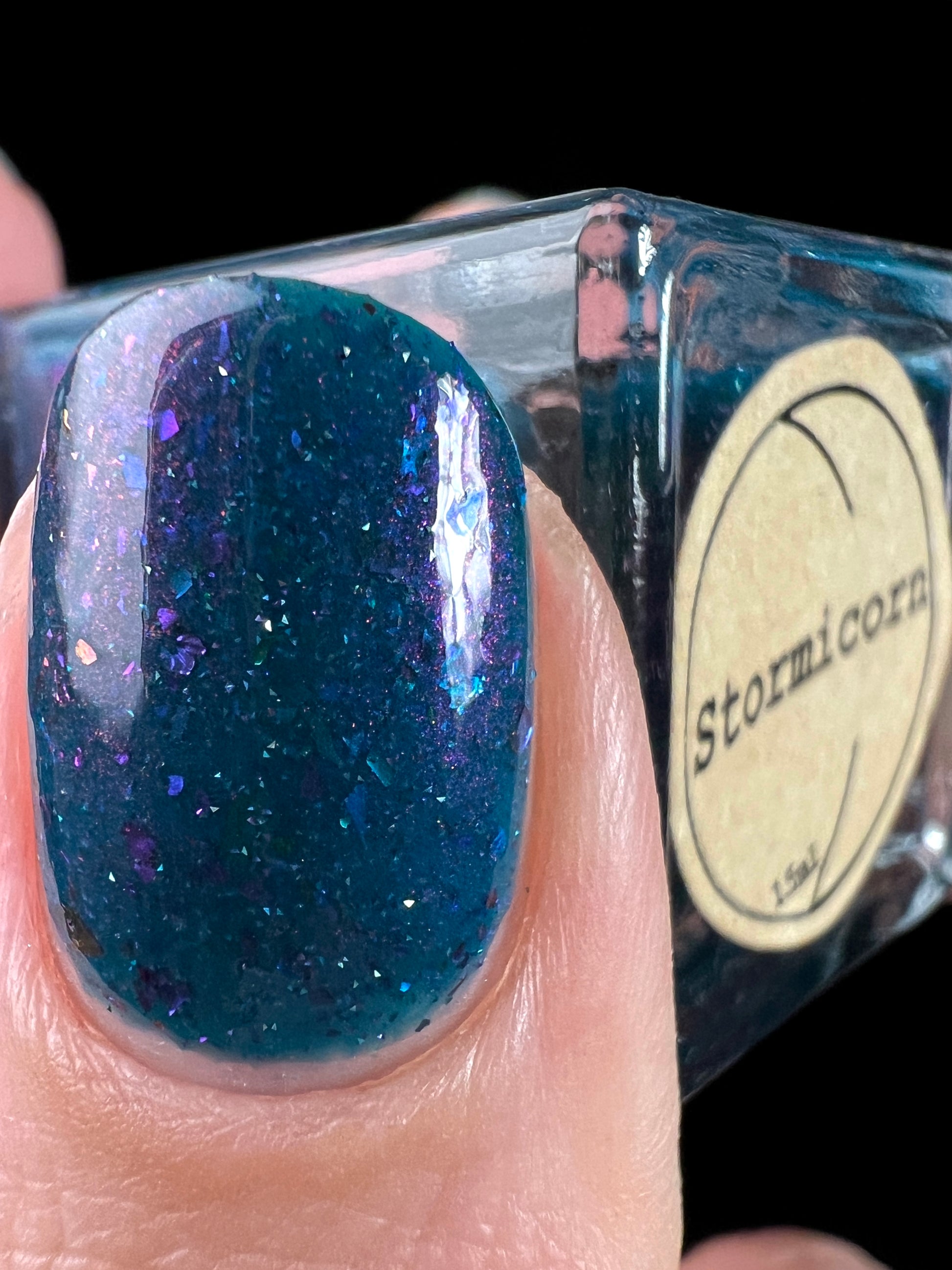 Stormicorn has as dark blue-green jelly base with purple and green metallic flakes, purple to red shimmer, and purple reflective glitter!