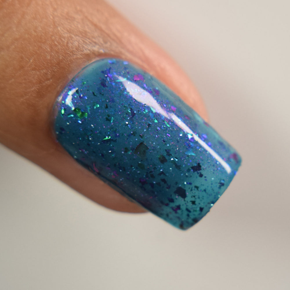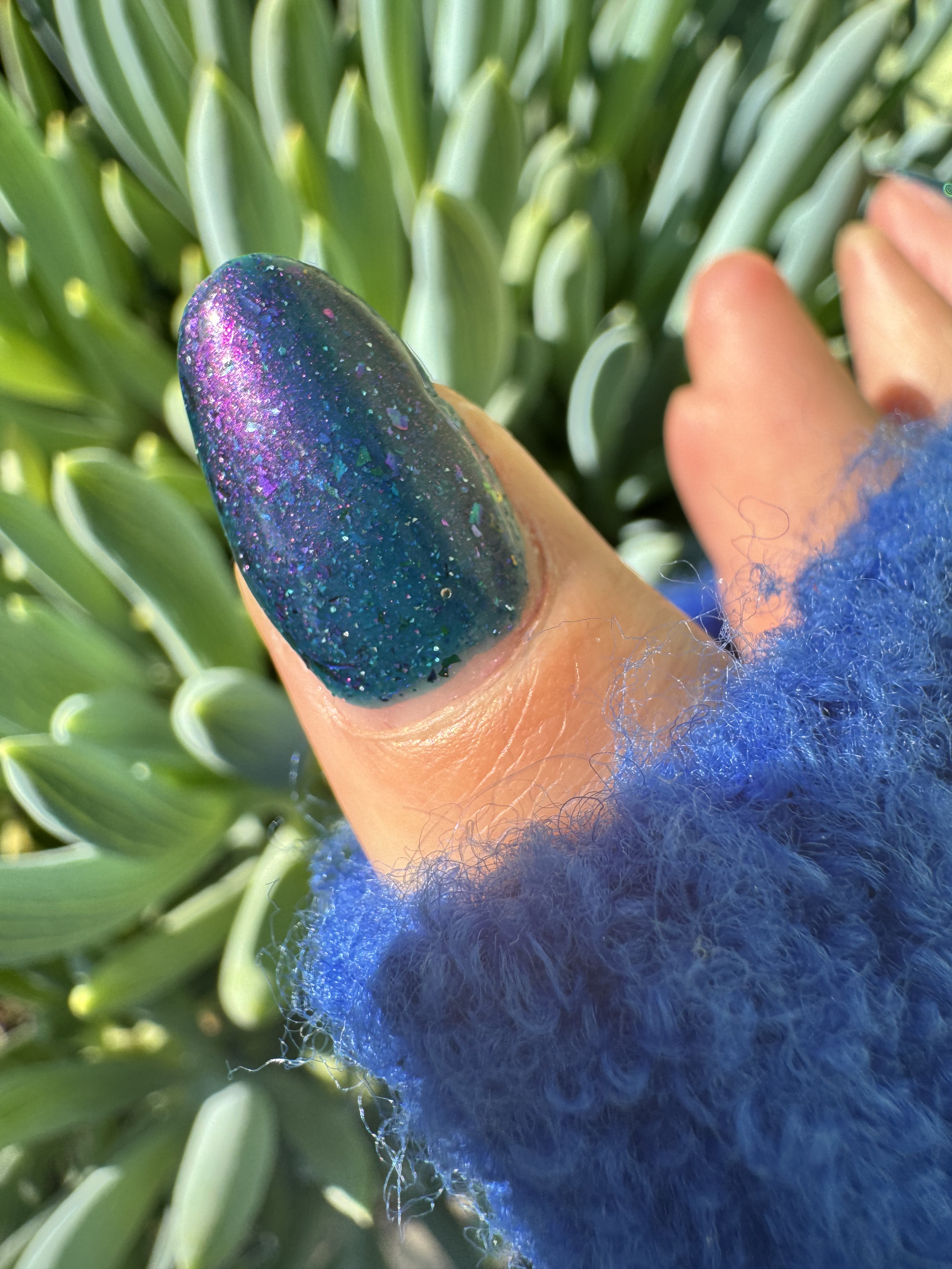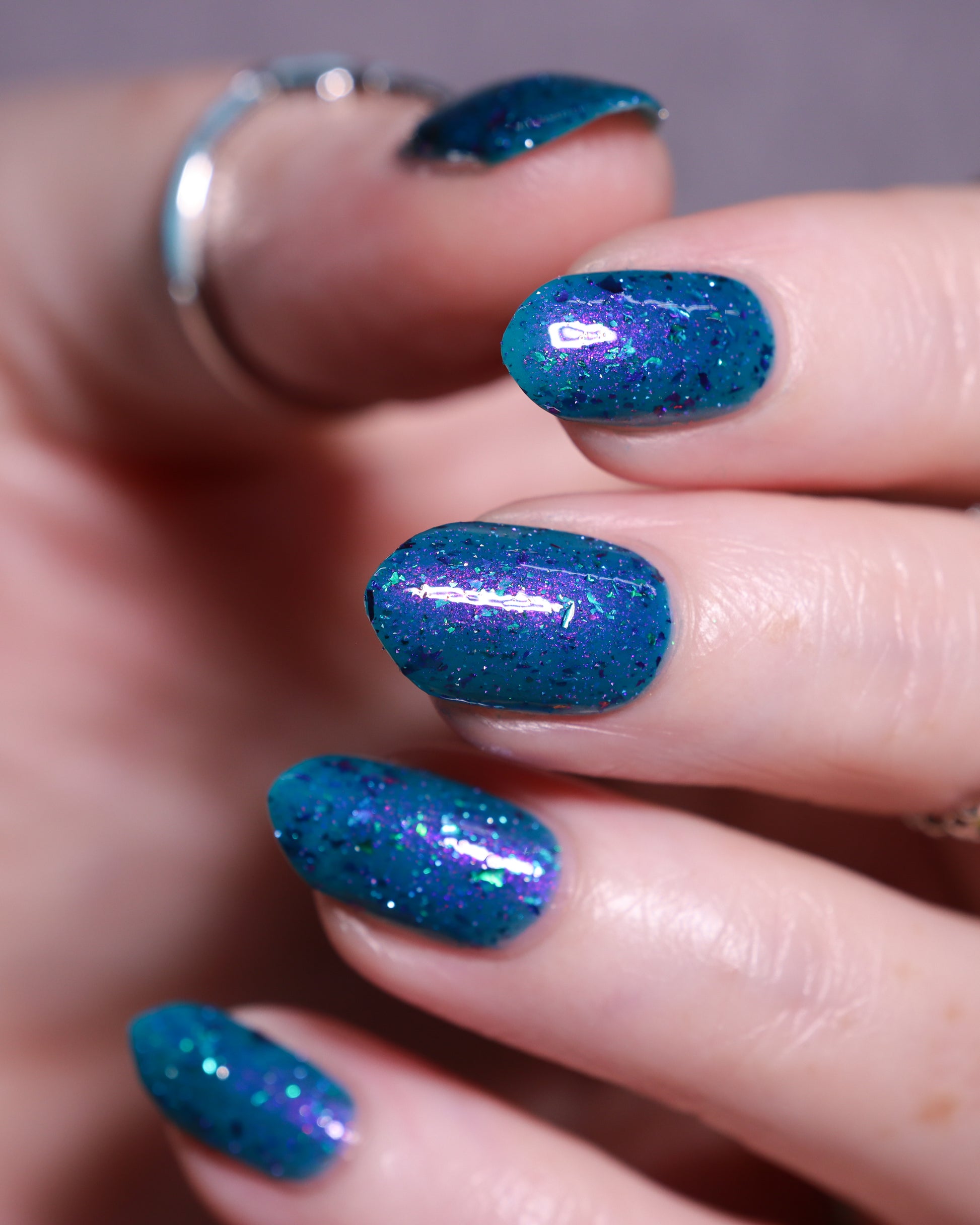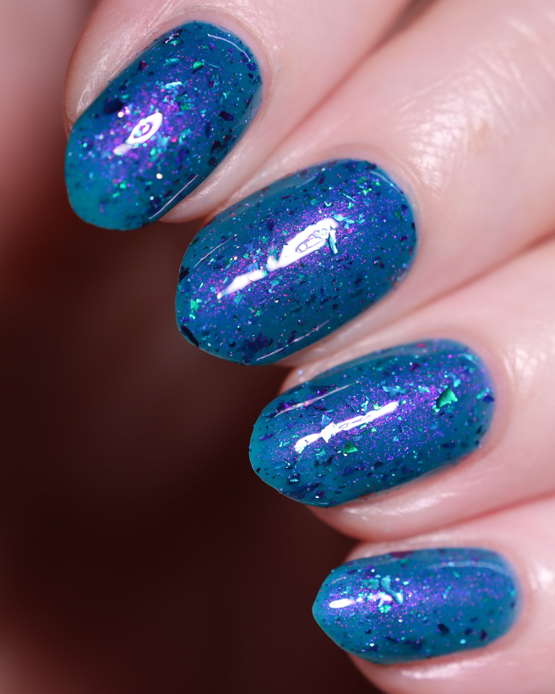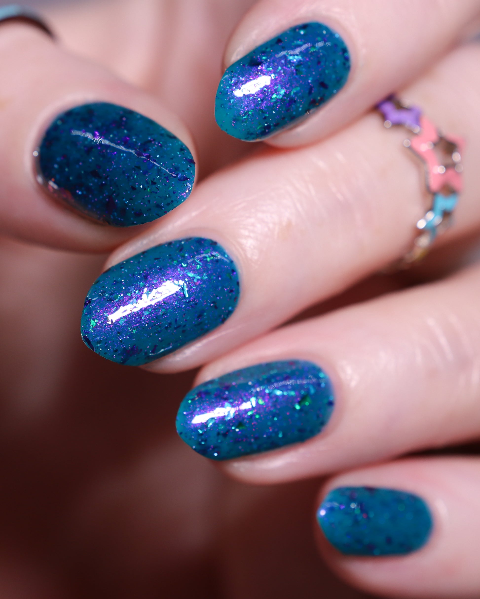 Stormicorn has as dark blue-green jelly base with purple and green metallic flakes, purple to red shimmer, and purple reflective glitter!