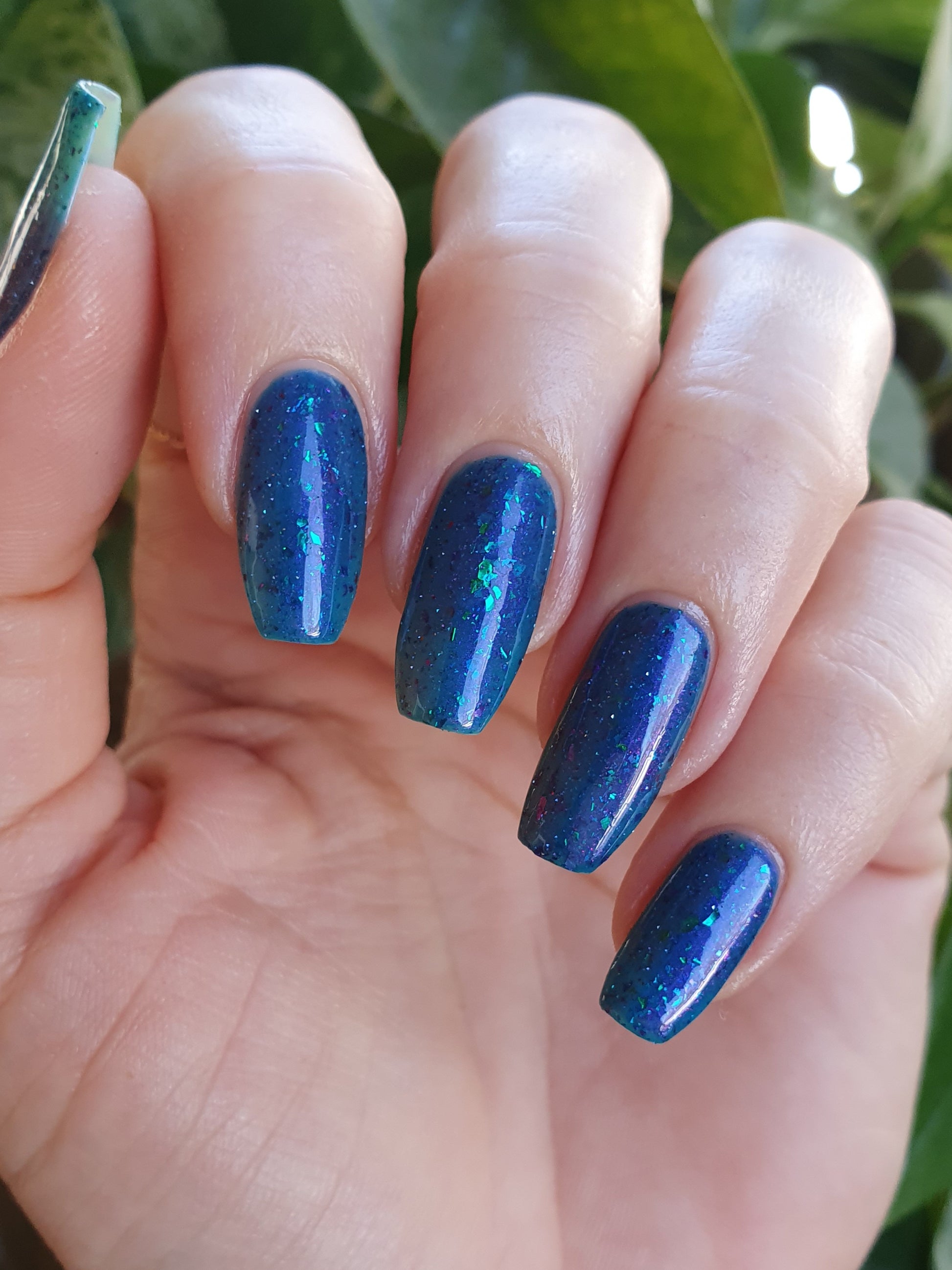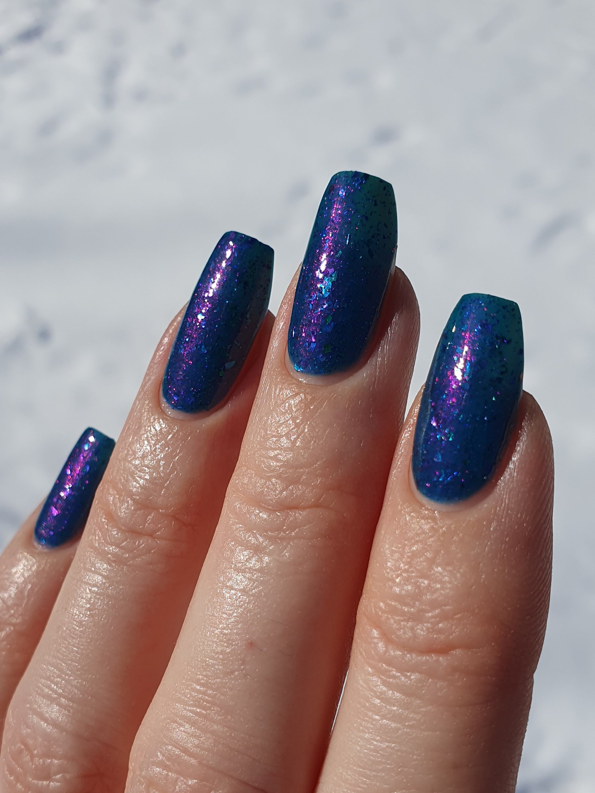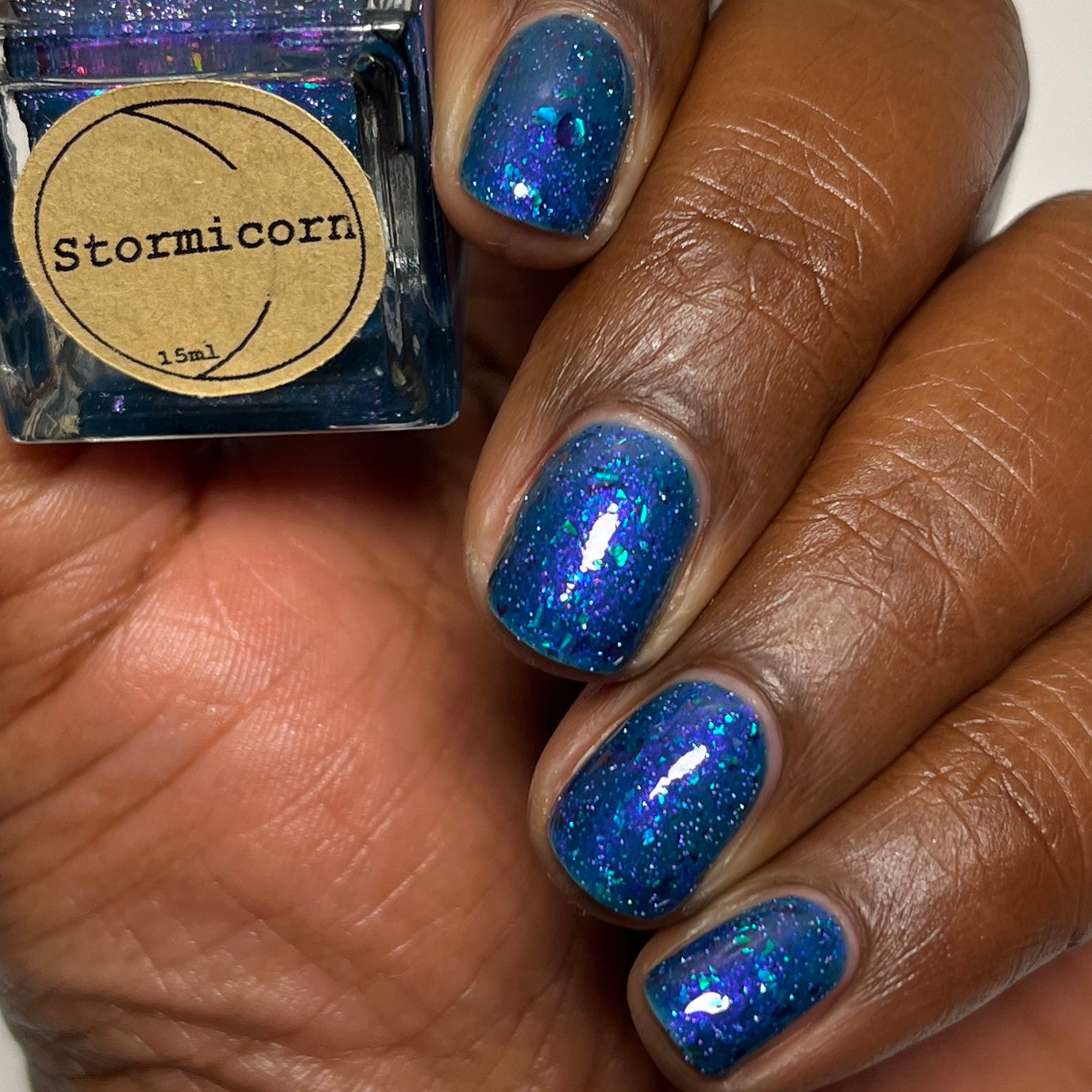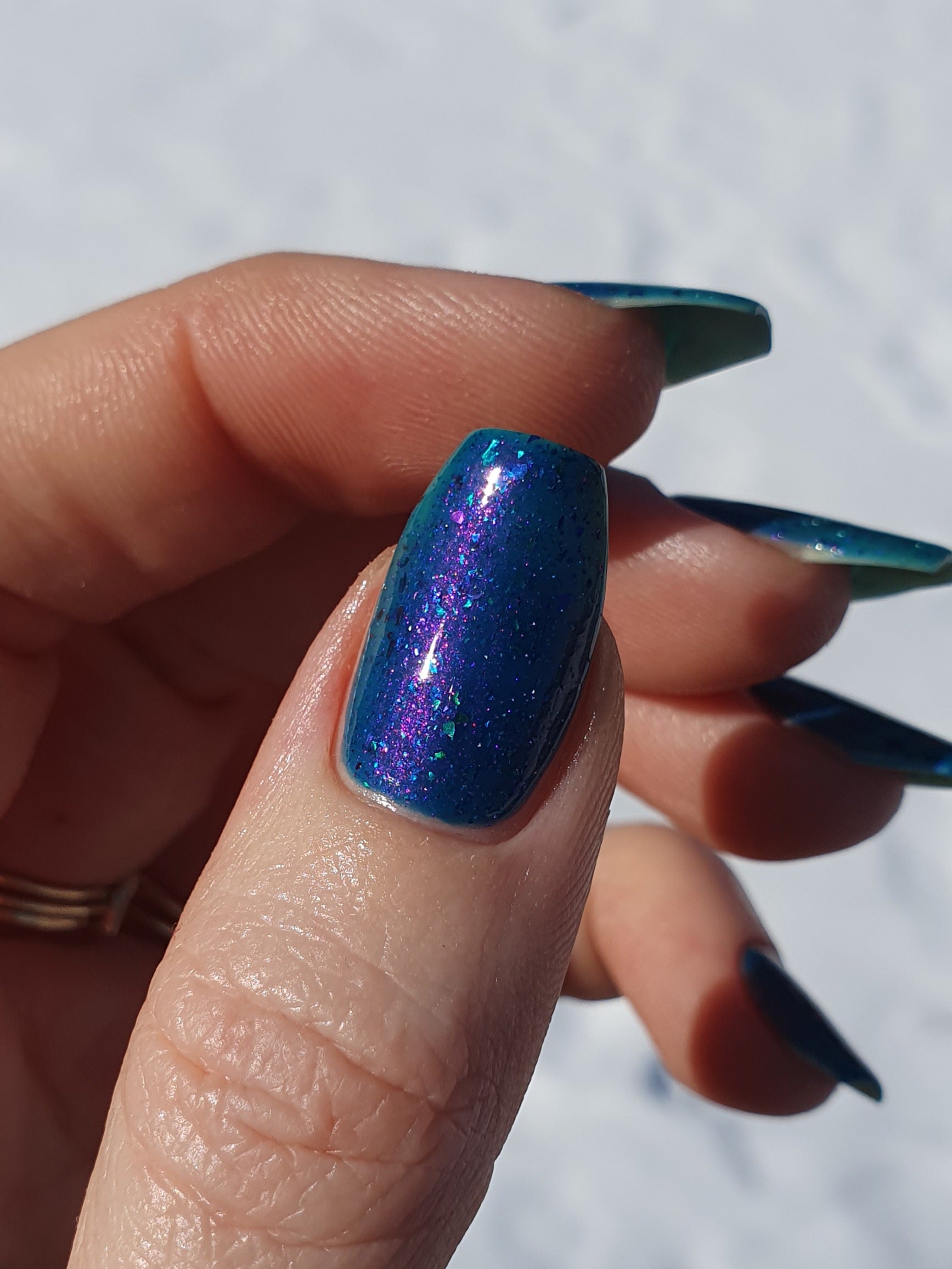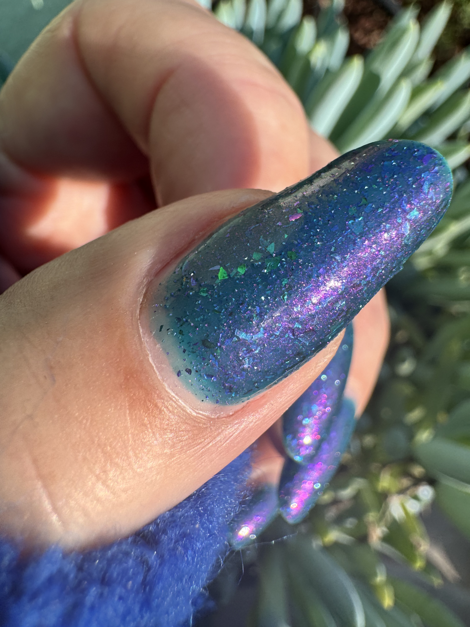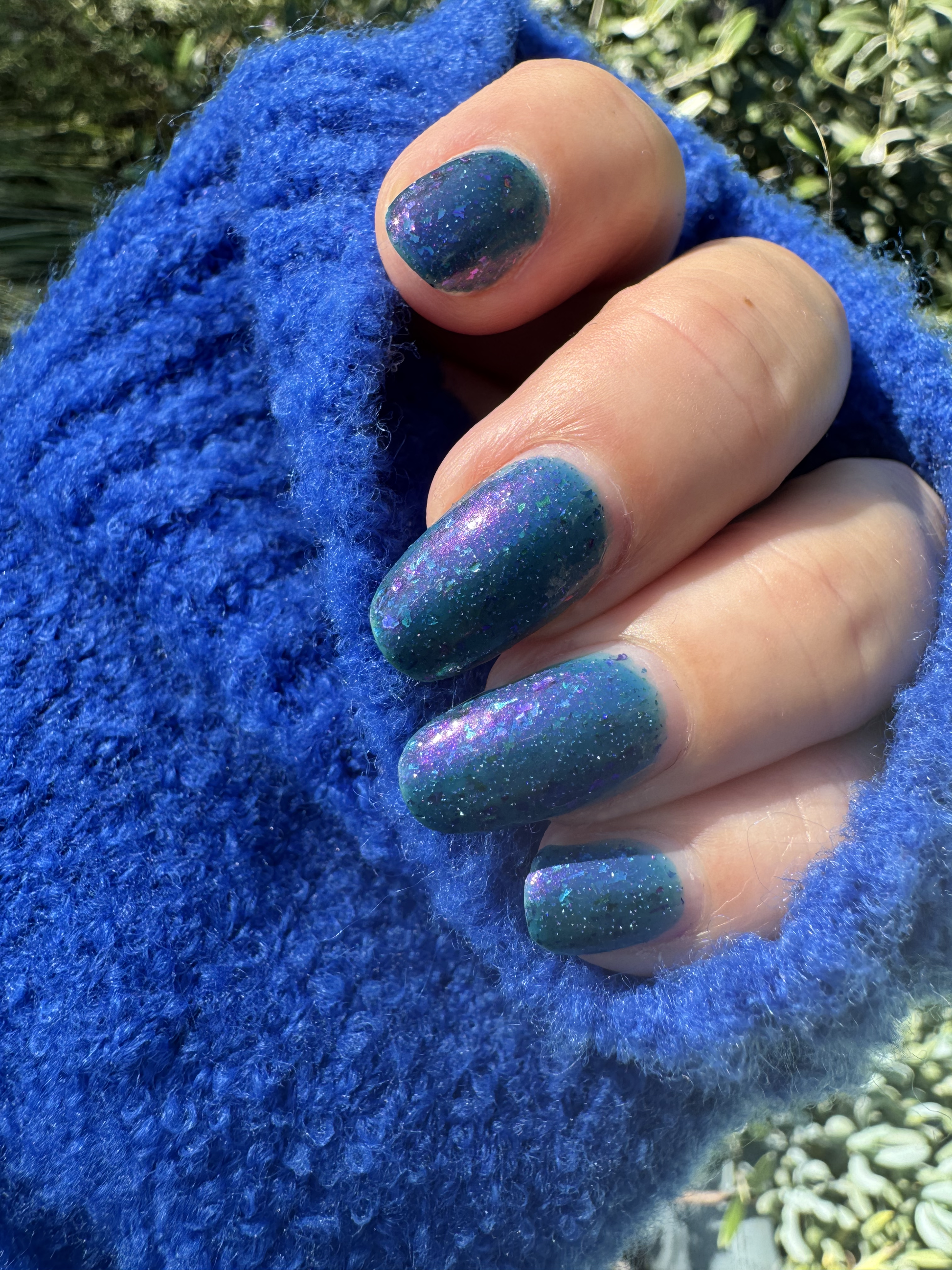 Stormicorn has as dark blue-green jelly base with purple and green metallic flakes, purple to red shimmer, and purple reflective glitter!