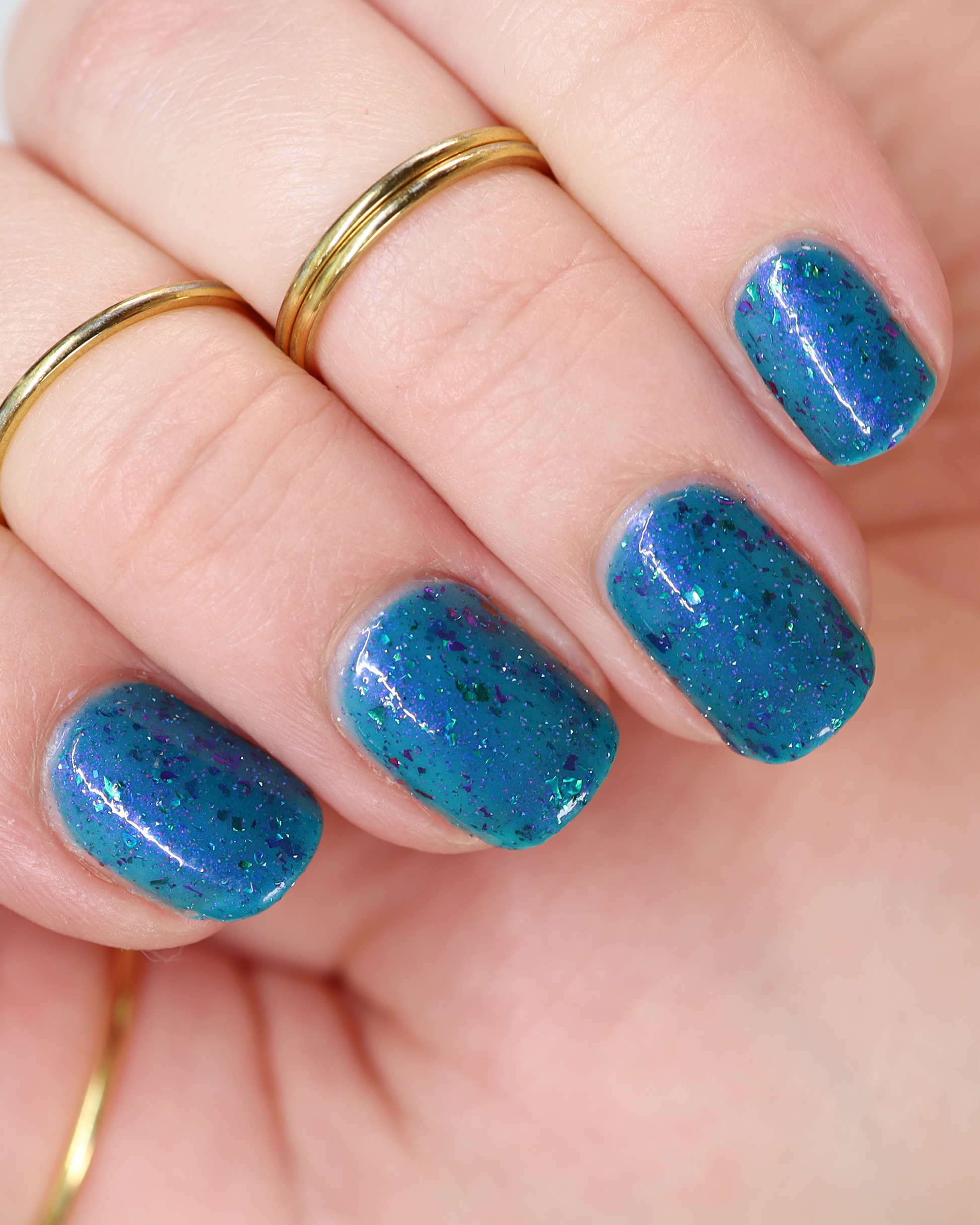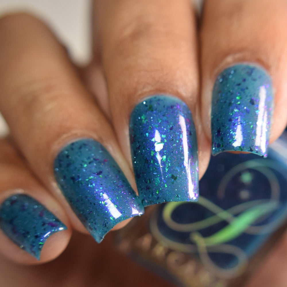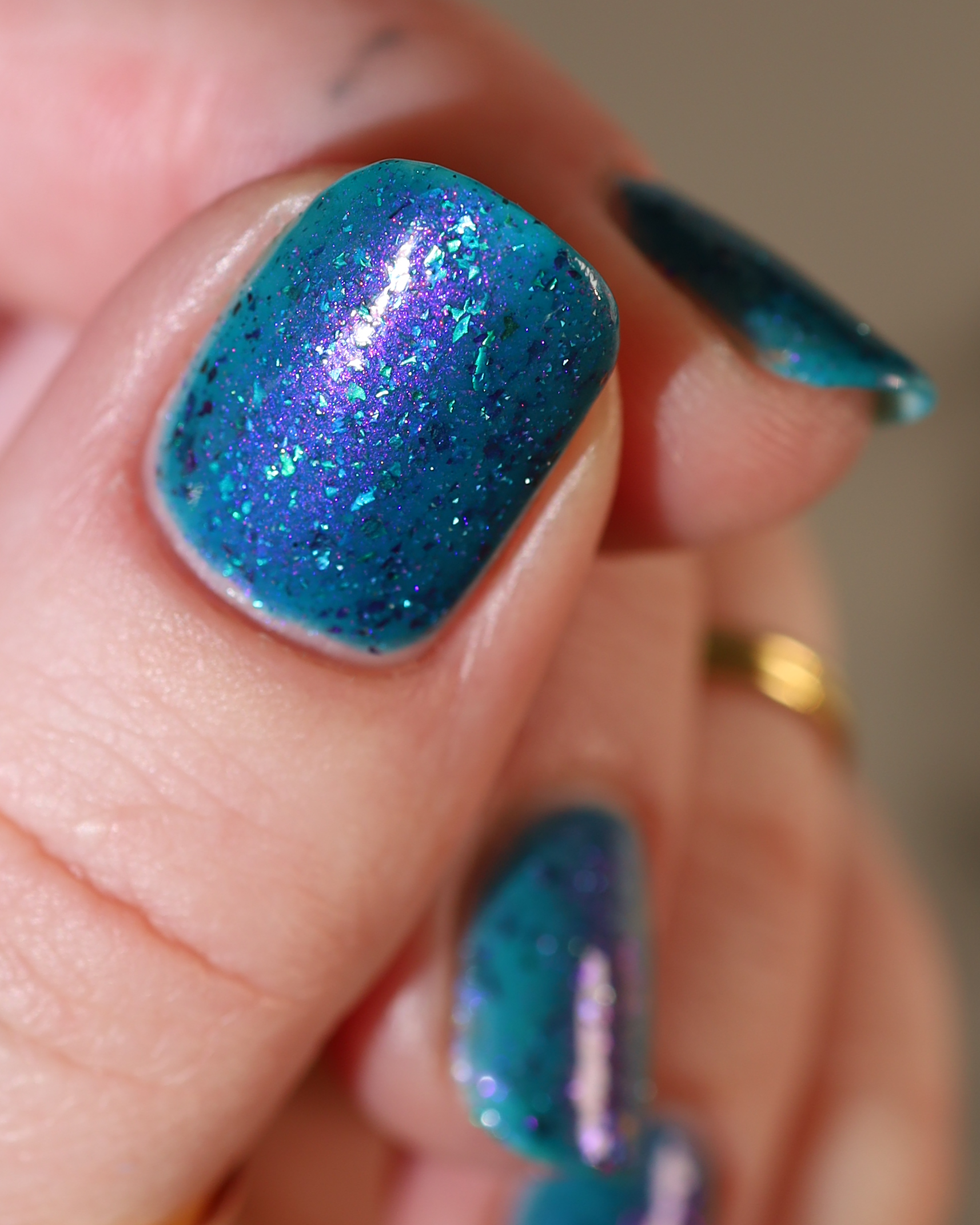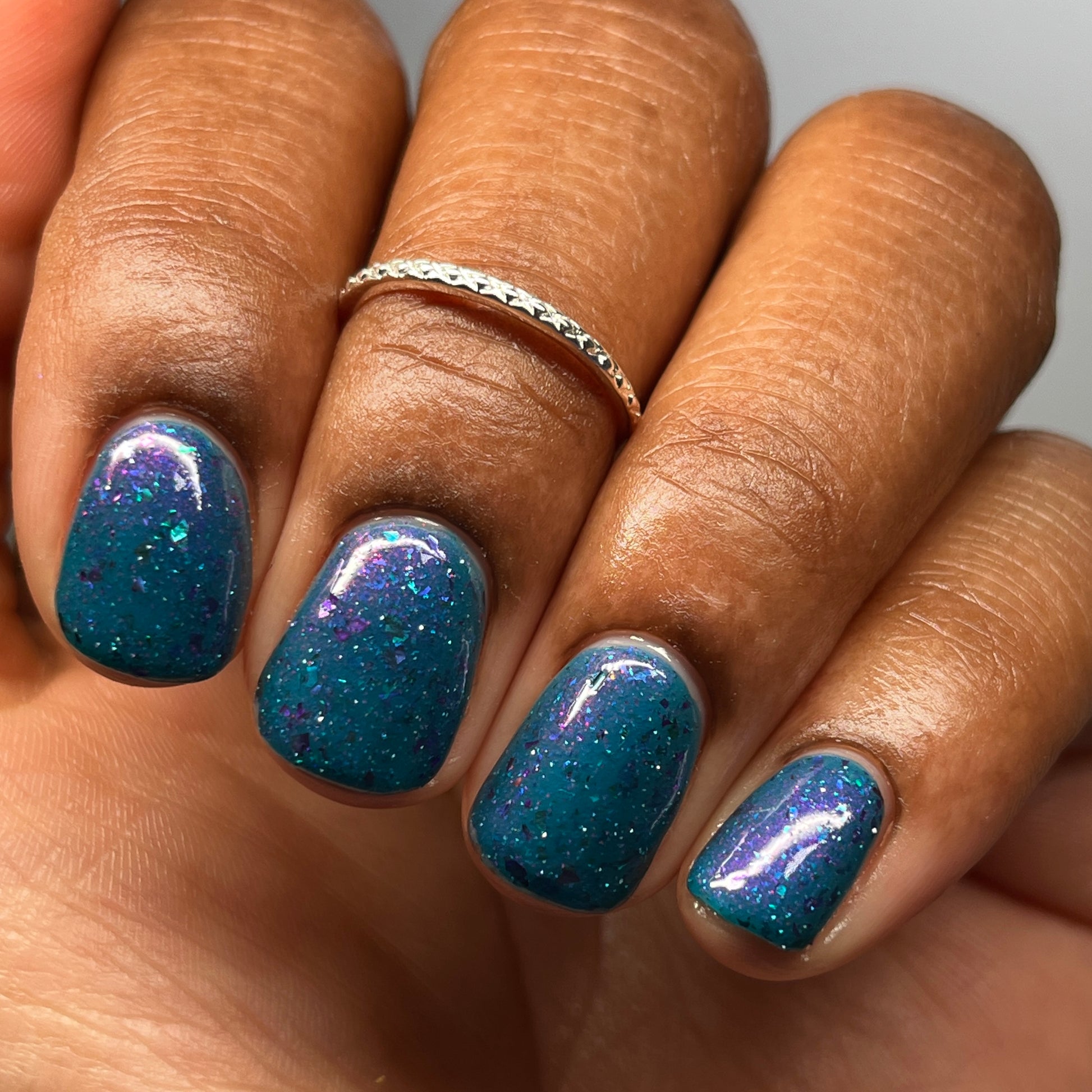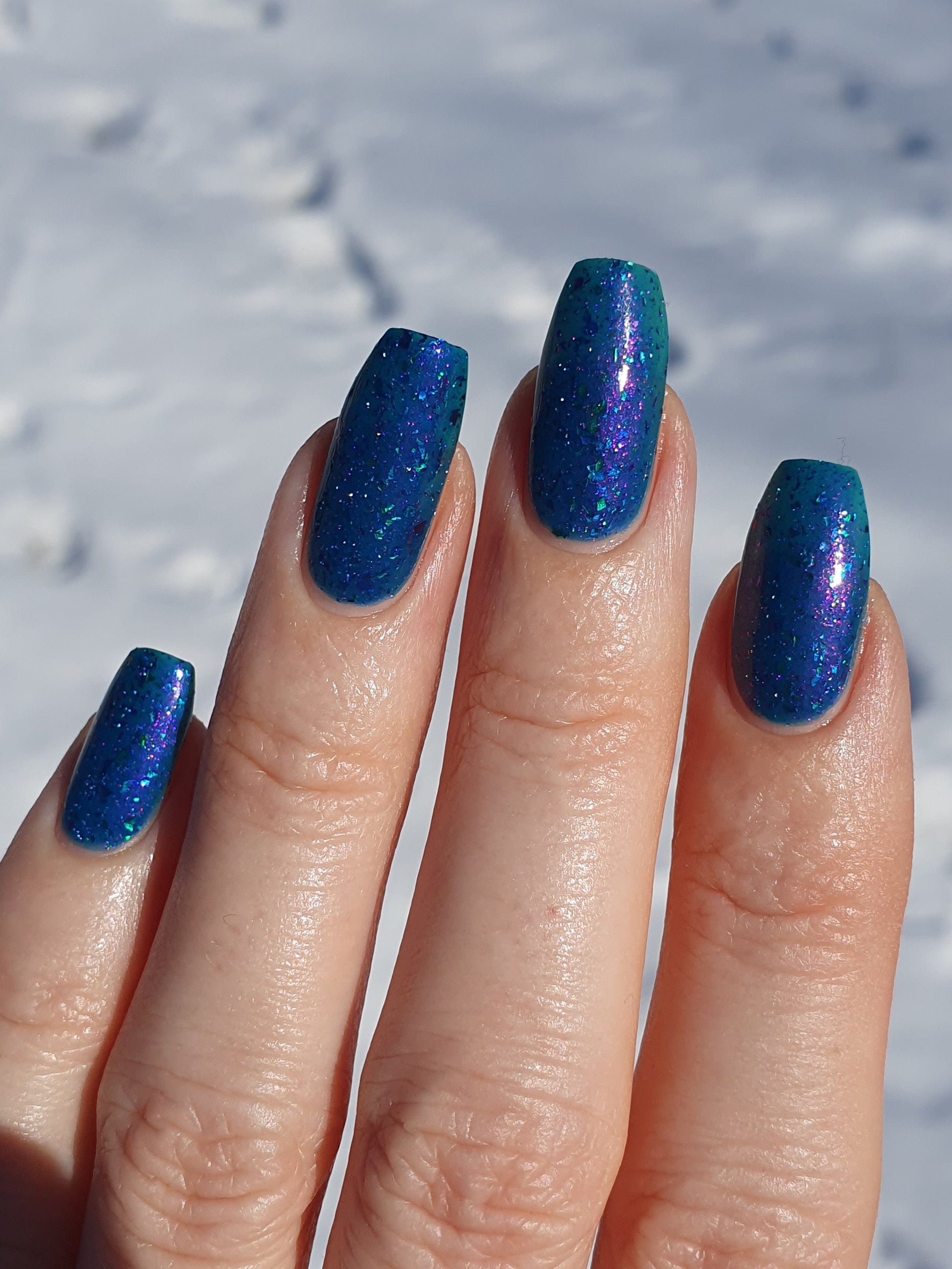 Stormicorn has as dark blue-green jelly base with purple and green metallic flakes, purple to red shimmer, and purple reflective glitter!