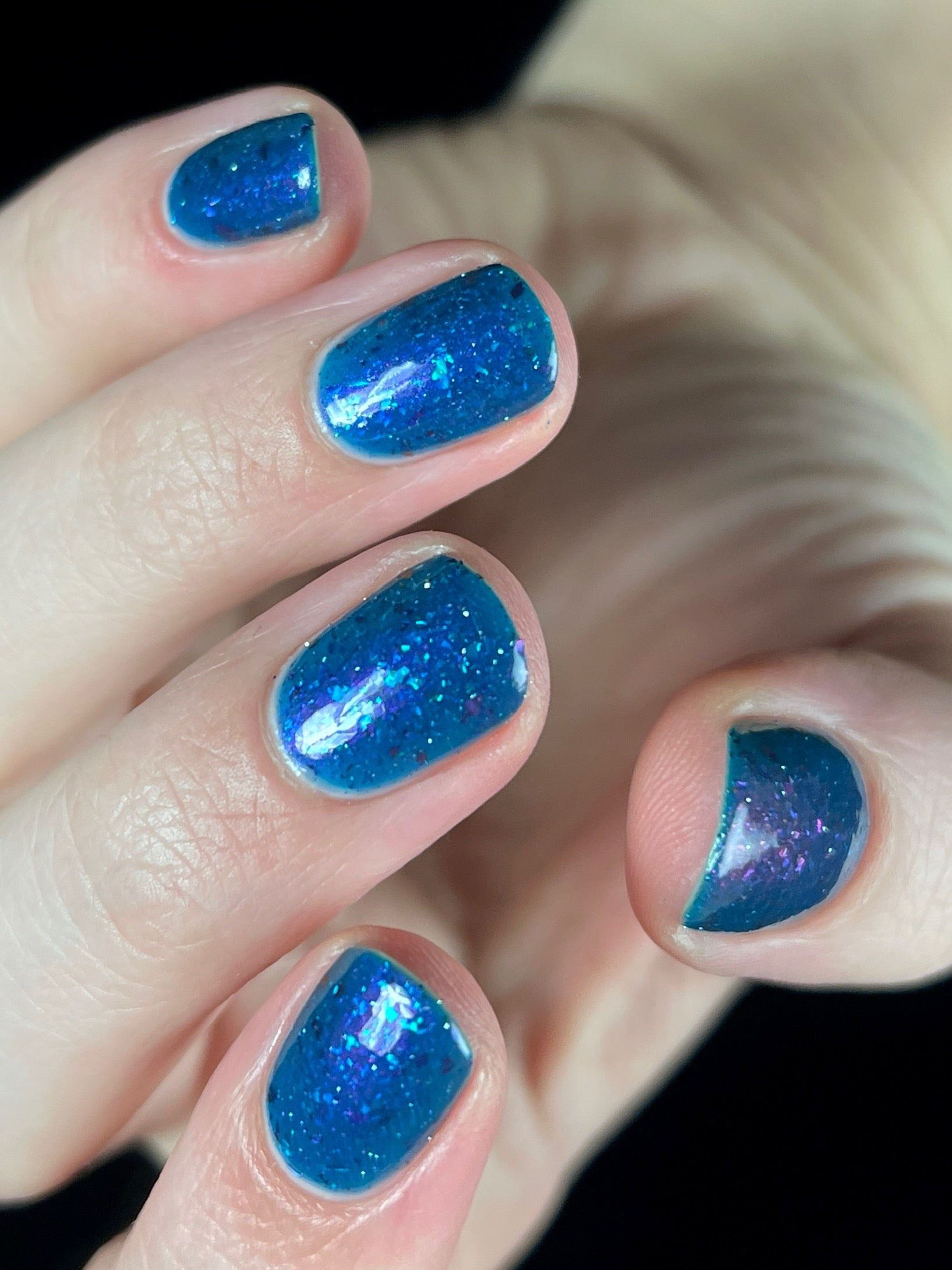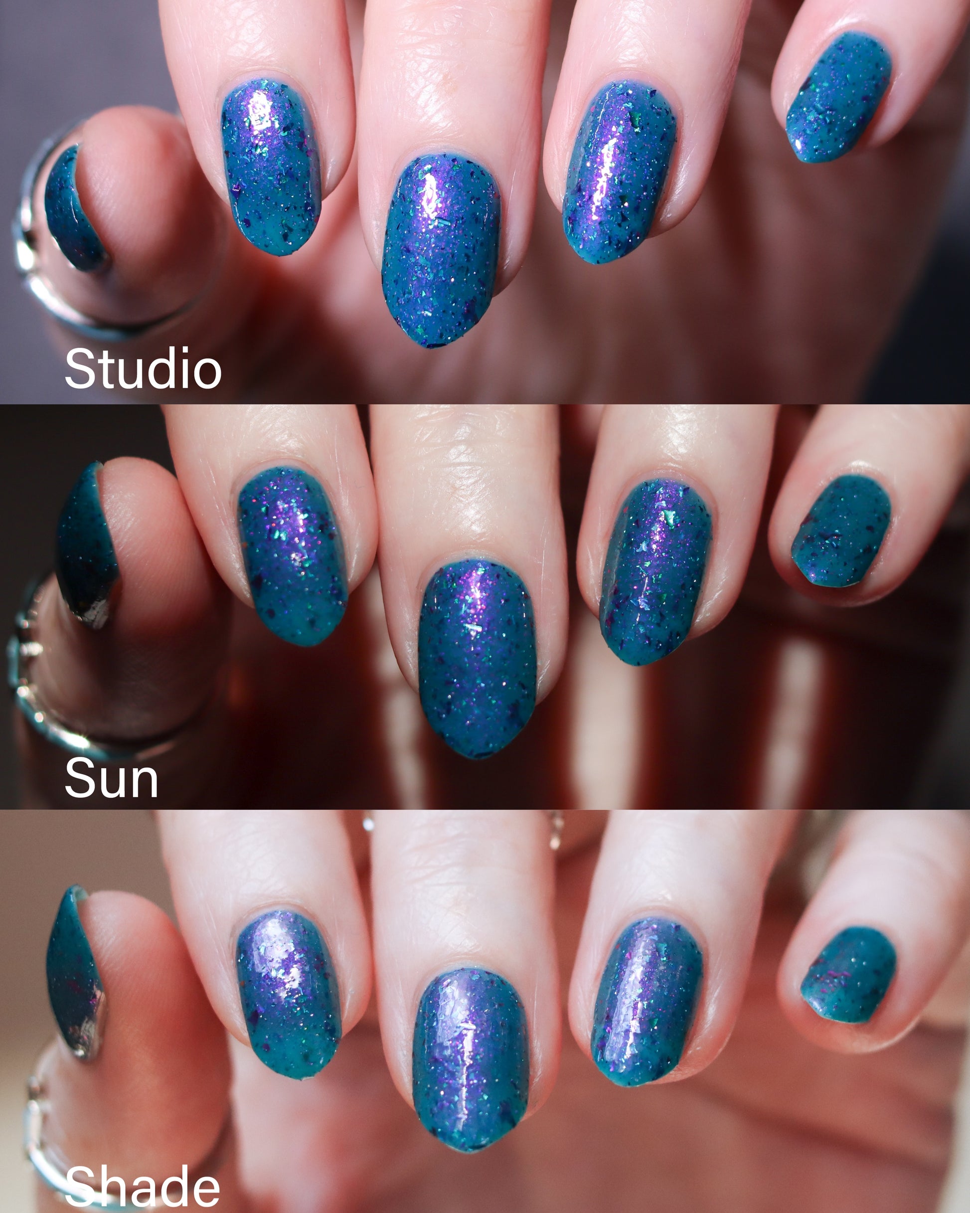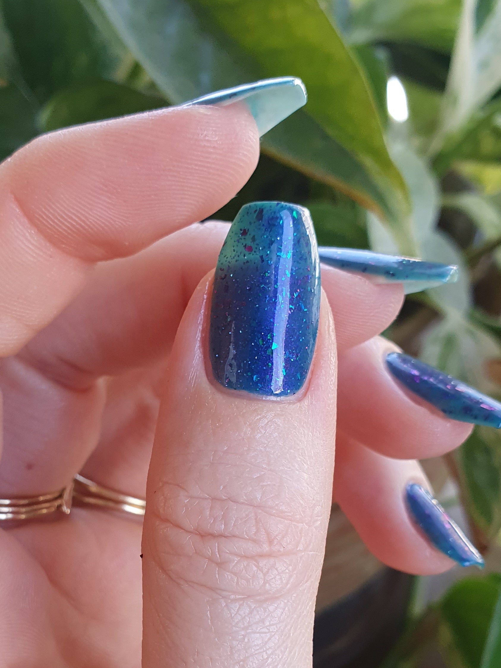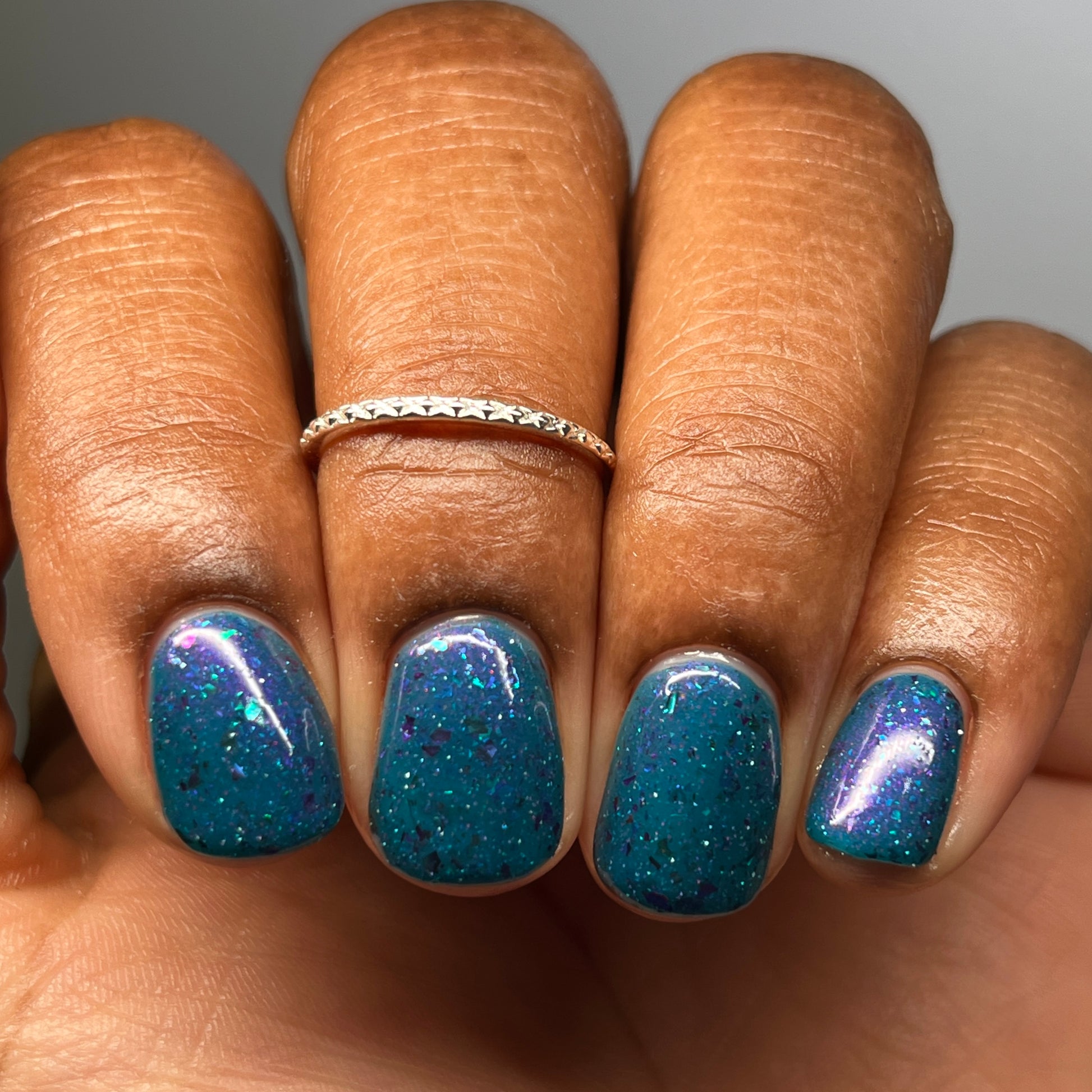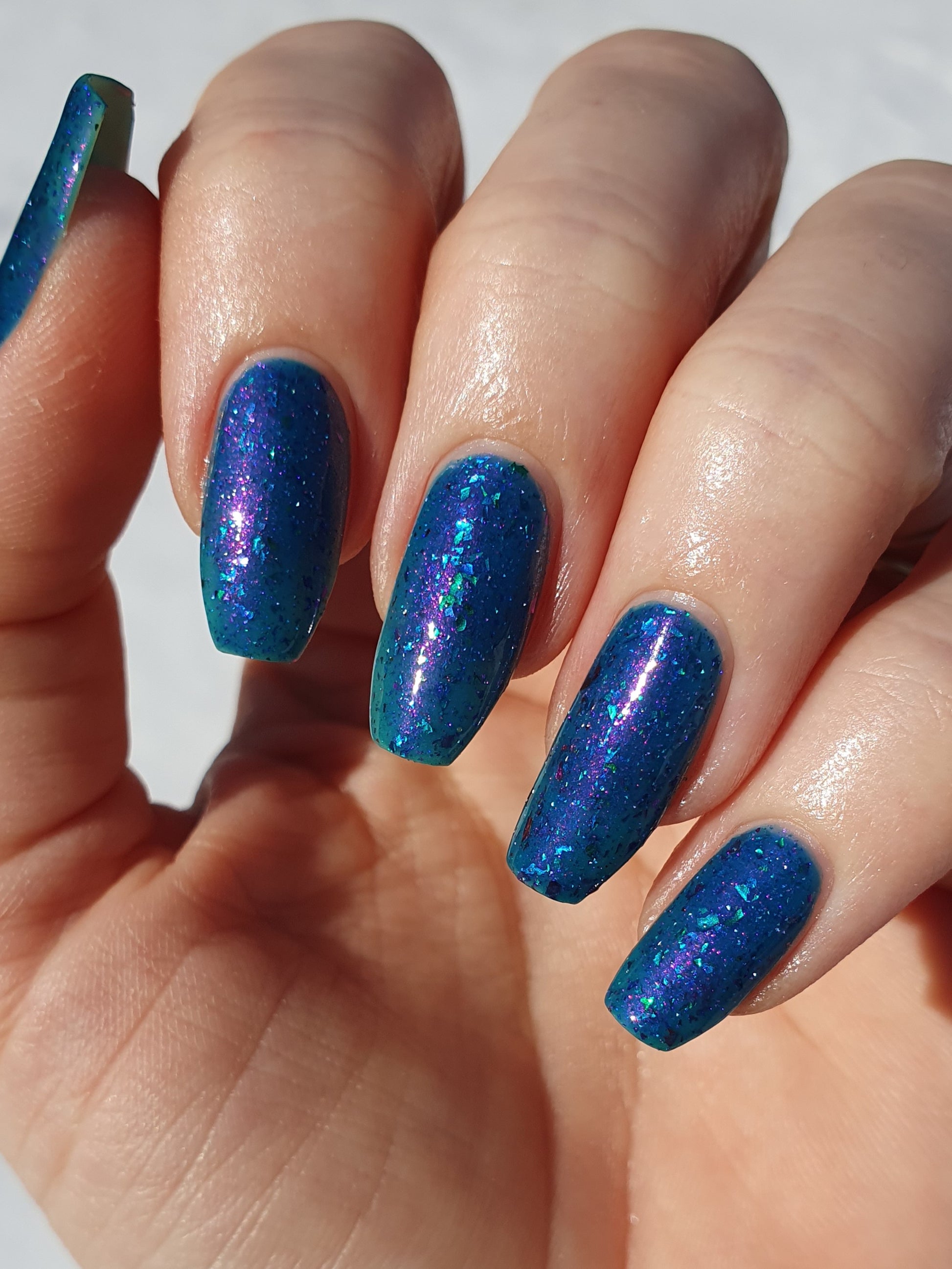 Stormicorn has as dark blue-green jelly base with purple and green metallic flakes, purple to red shimmer, and purple reflective glitter!