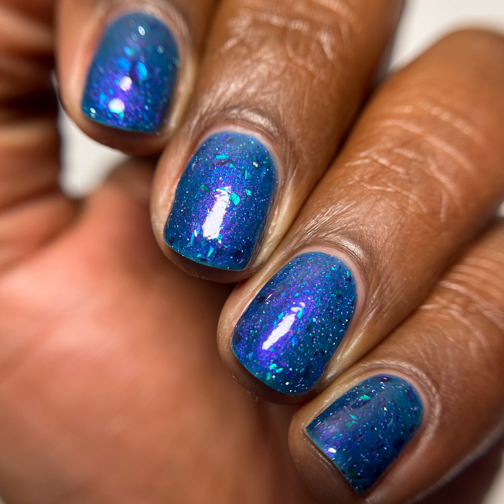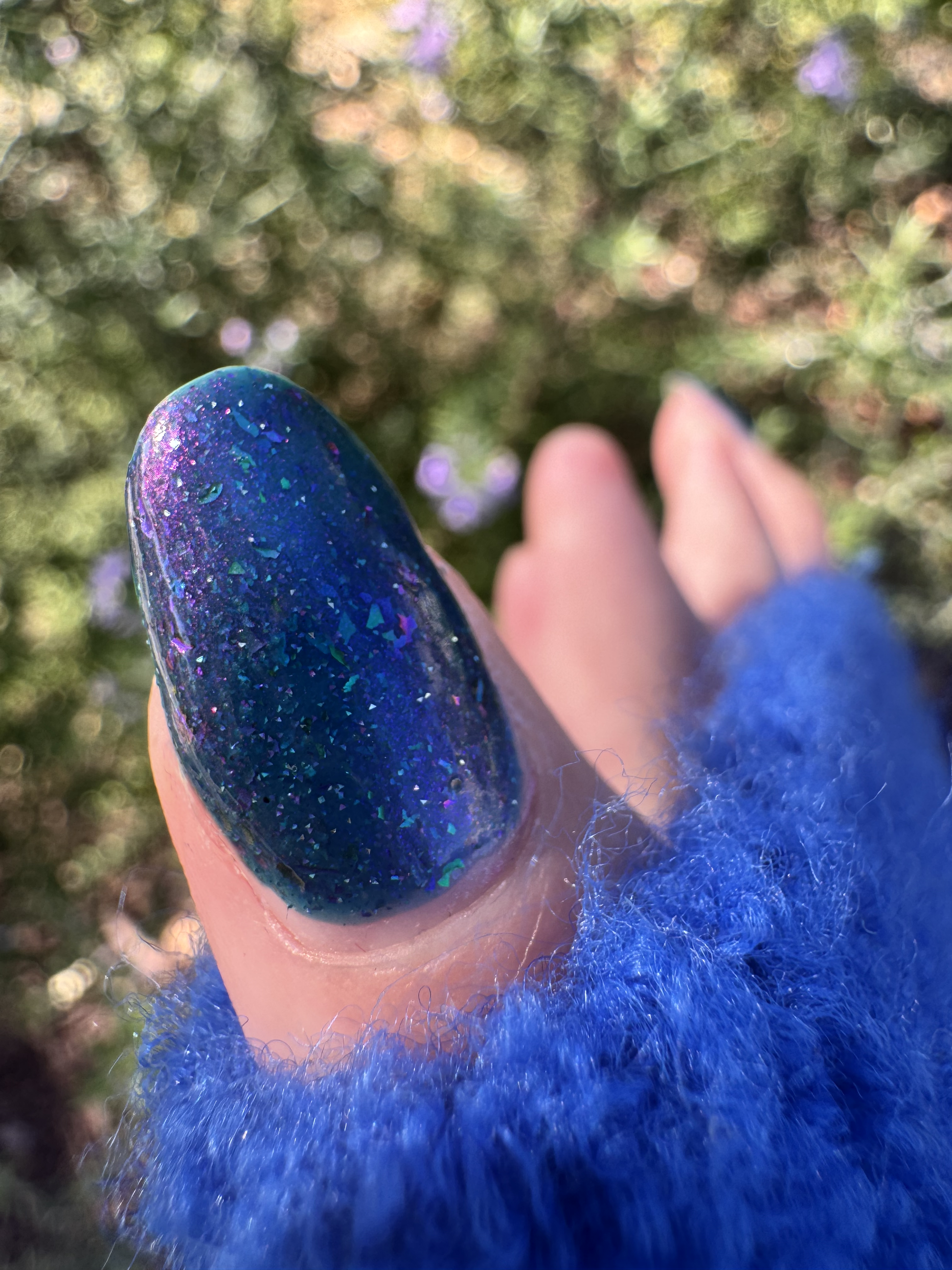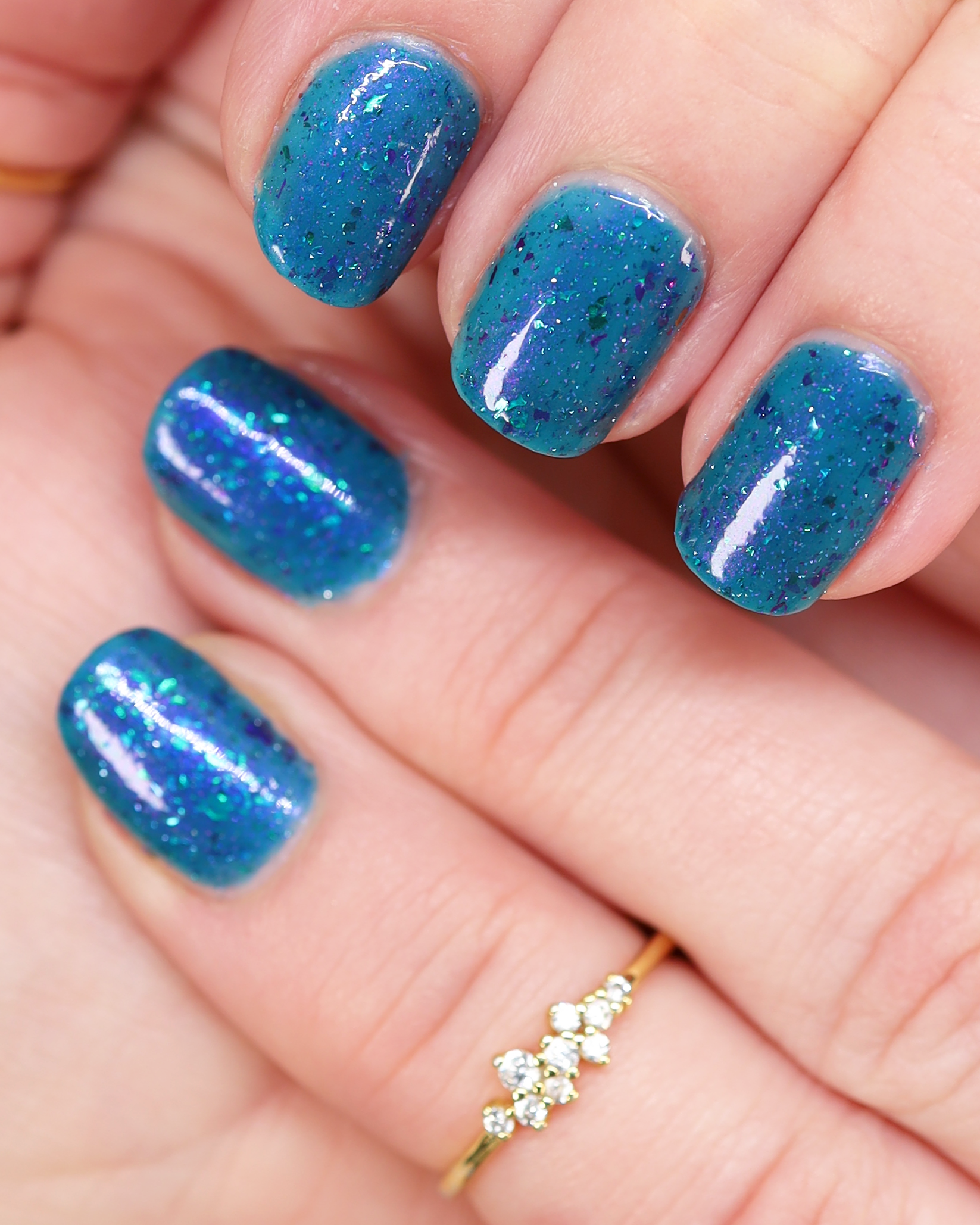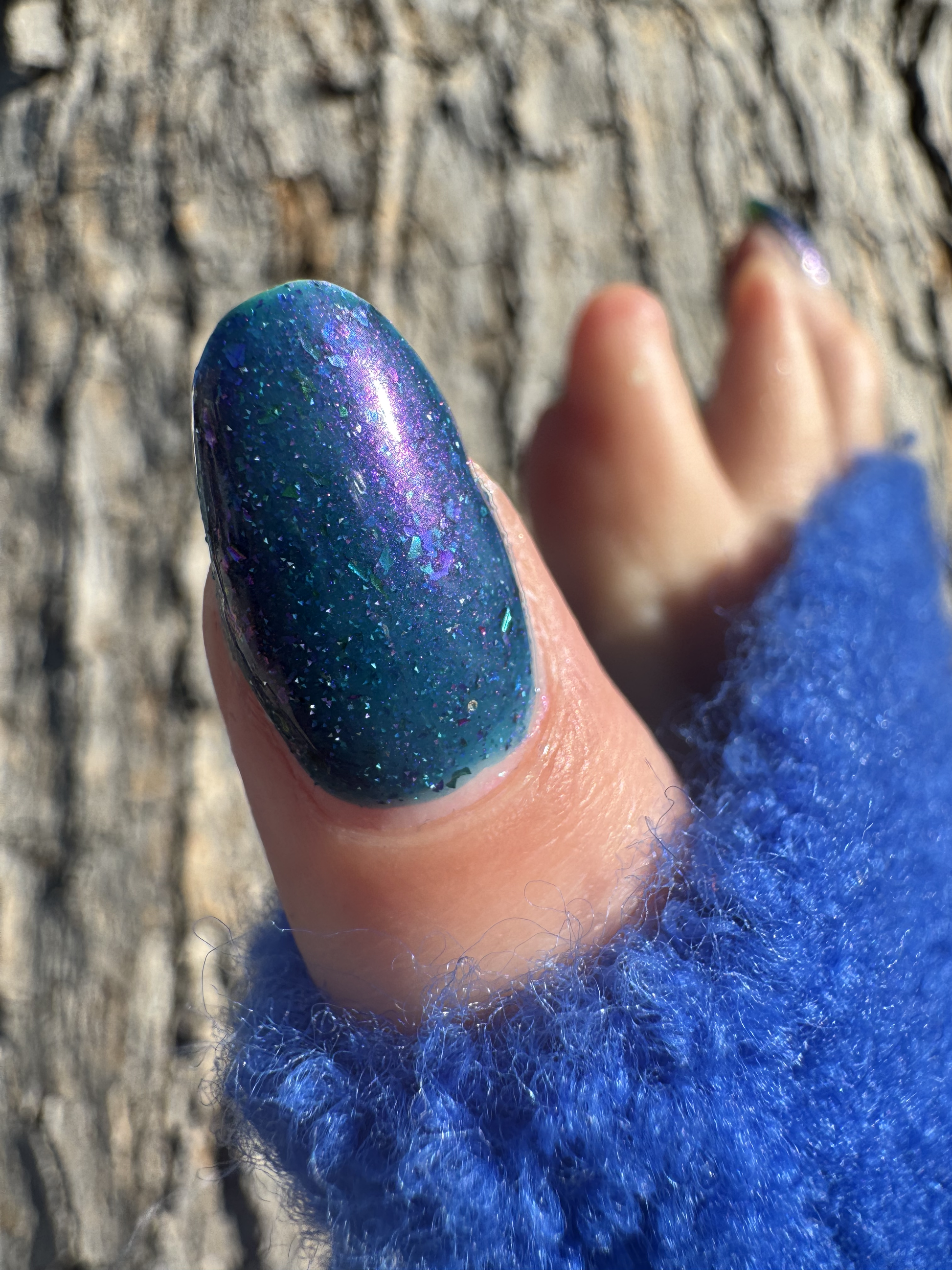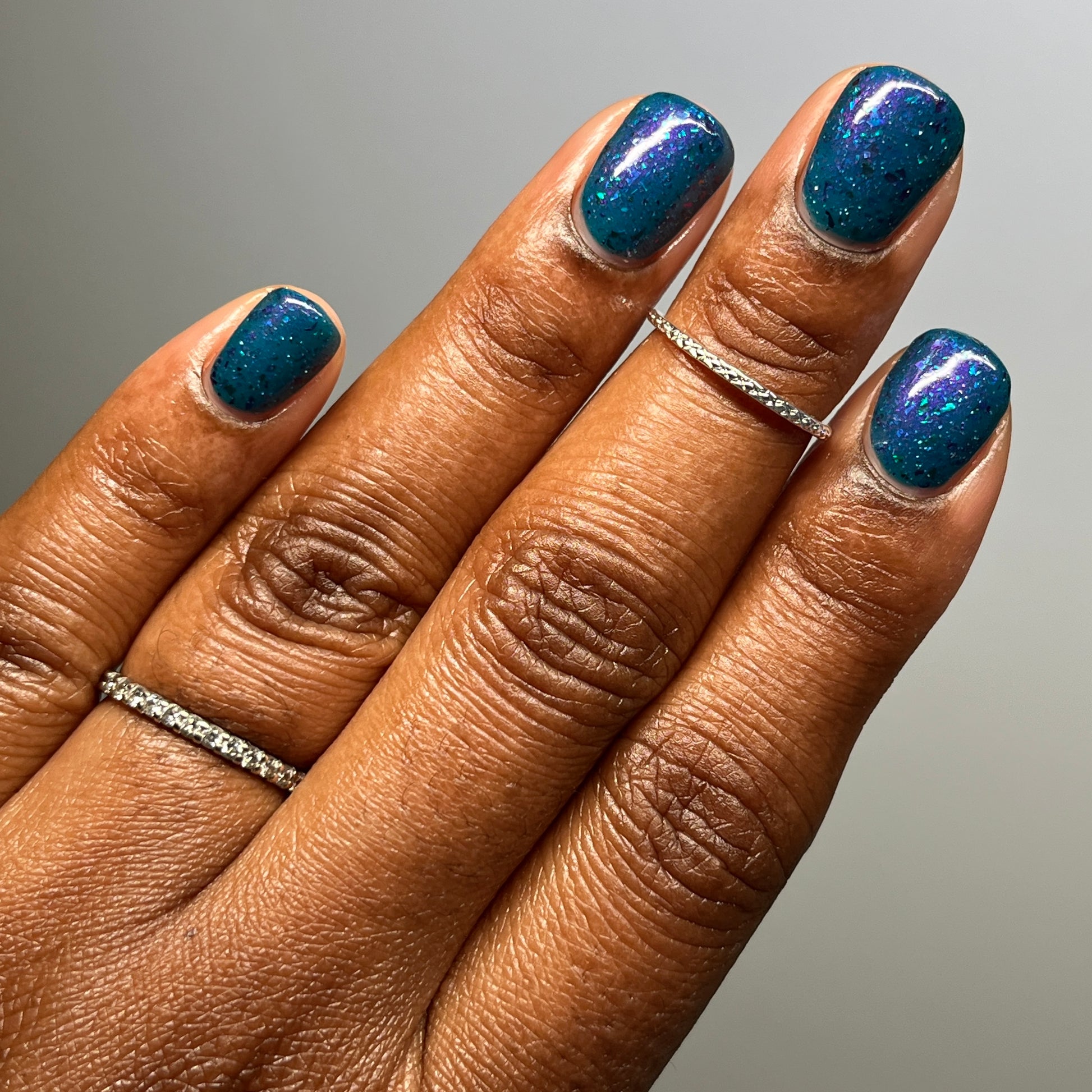 Stormicorn has as dark blue-green jelly base with purple and green metallic flakes, purple to red shimmer, and purple reflective glitter!