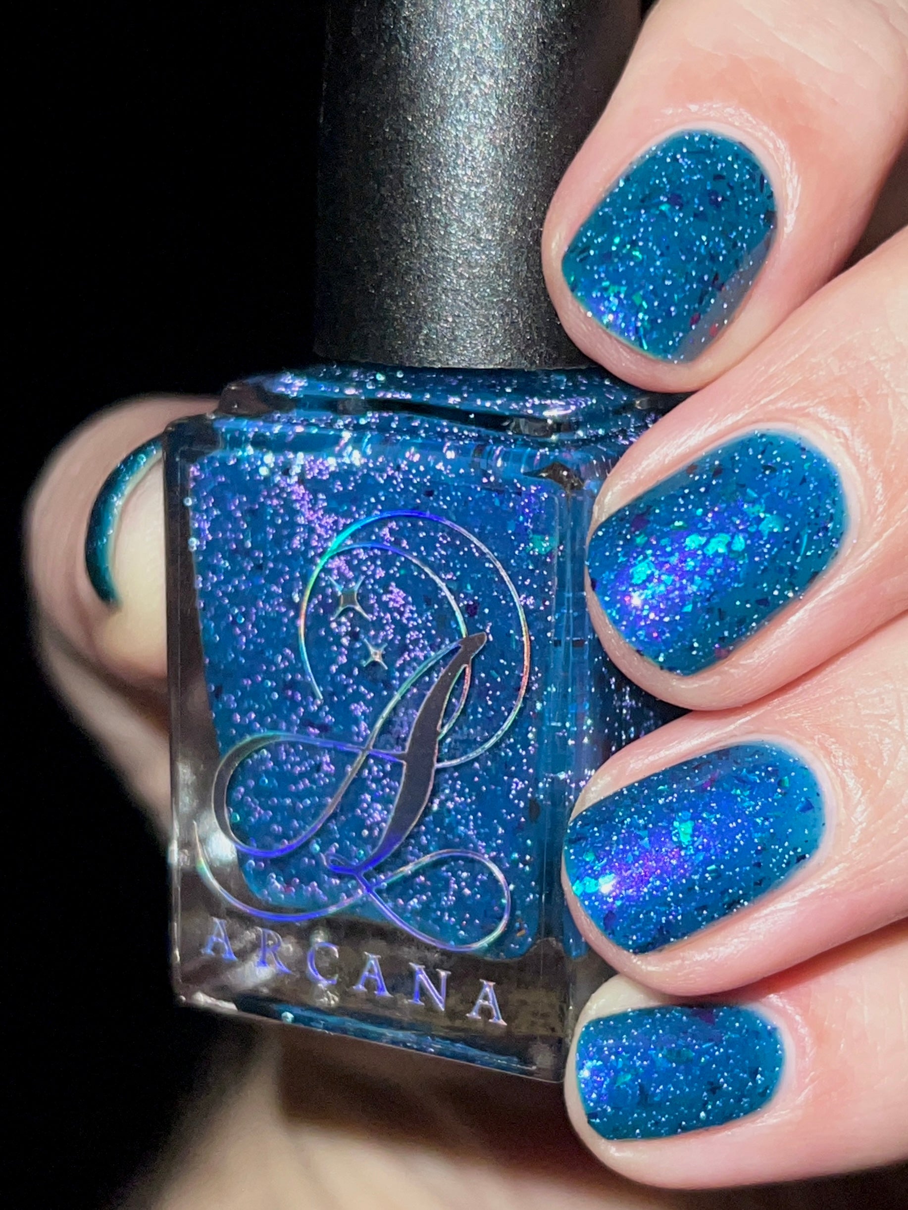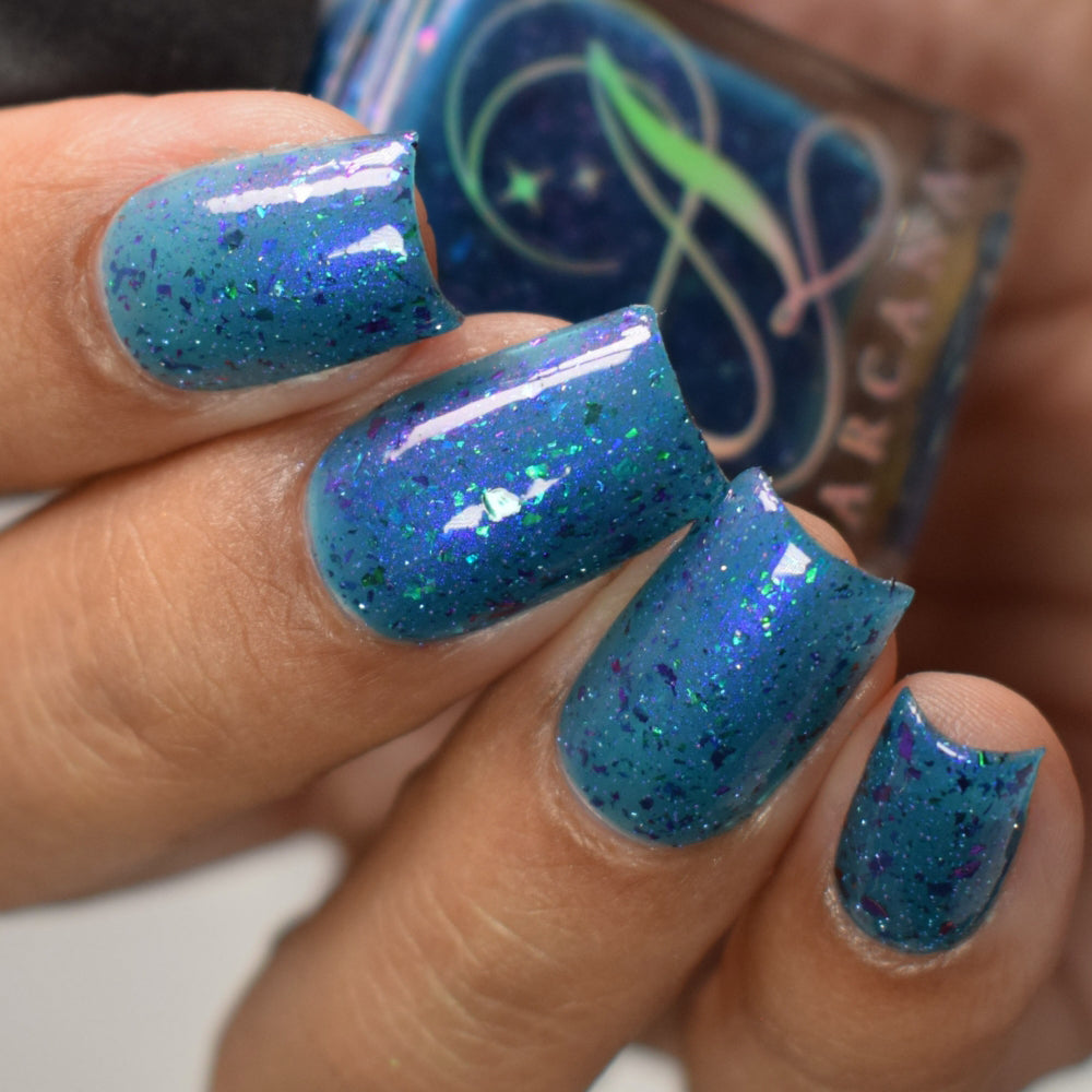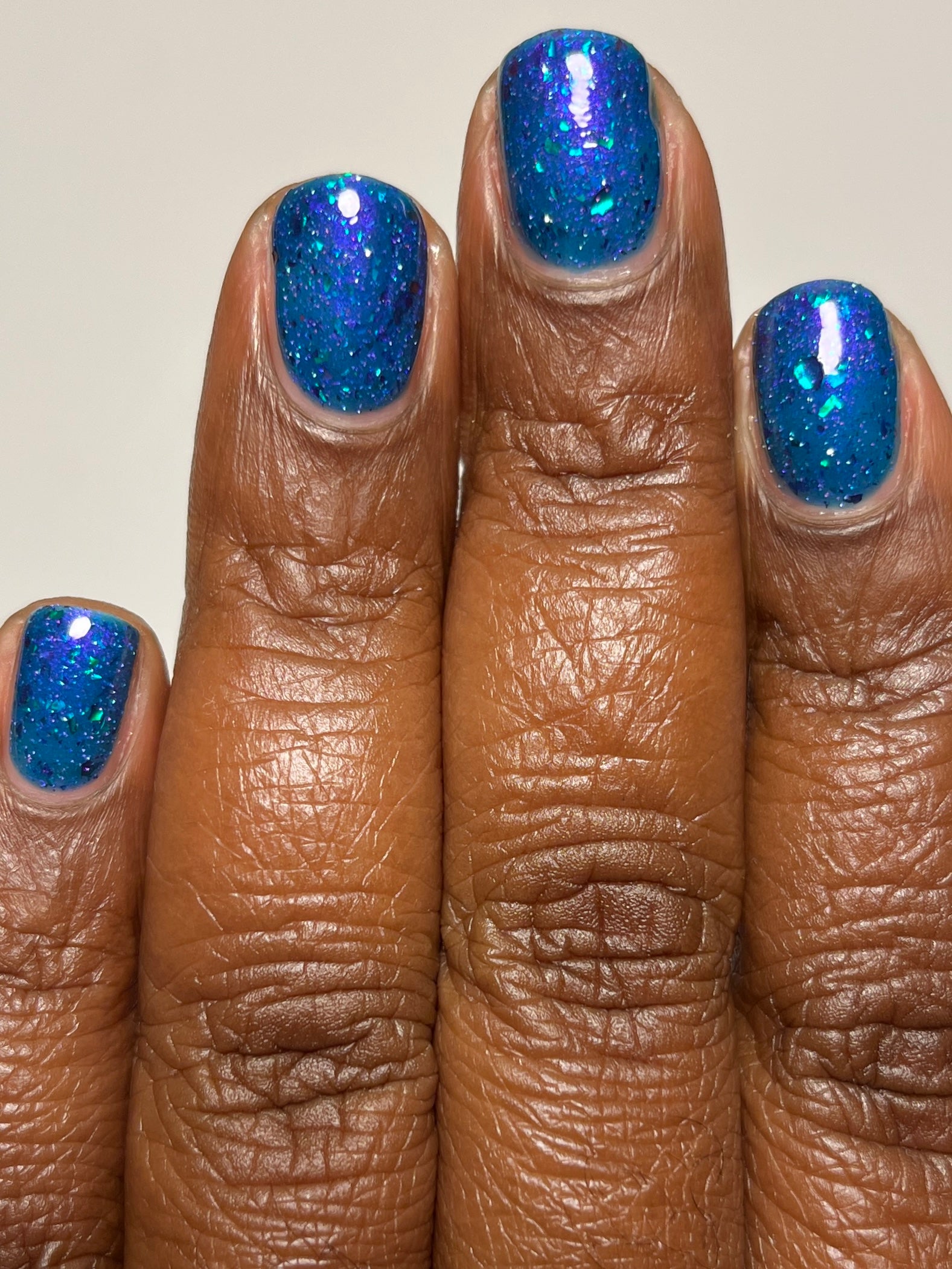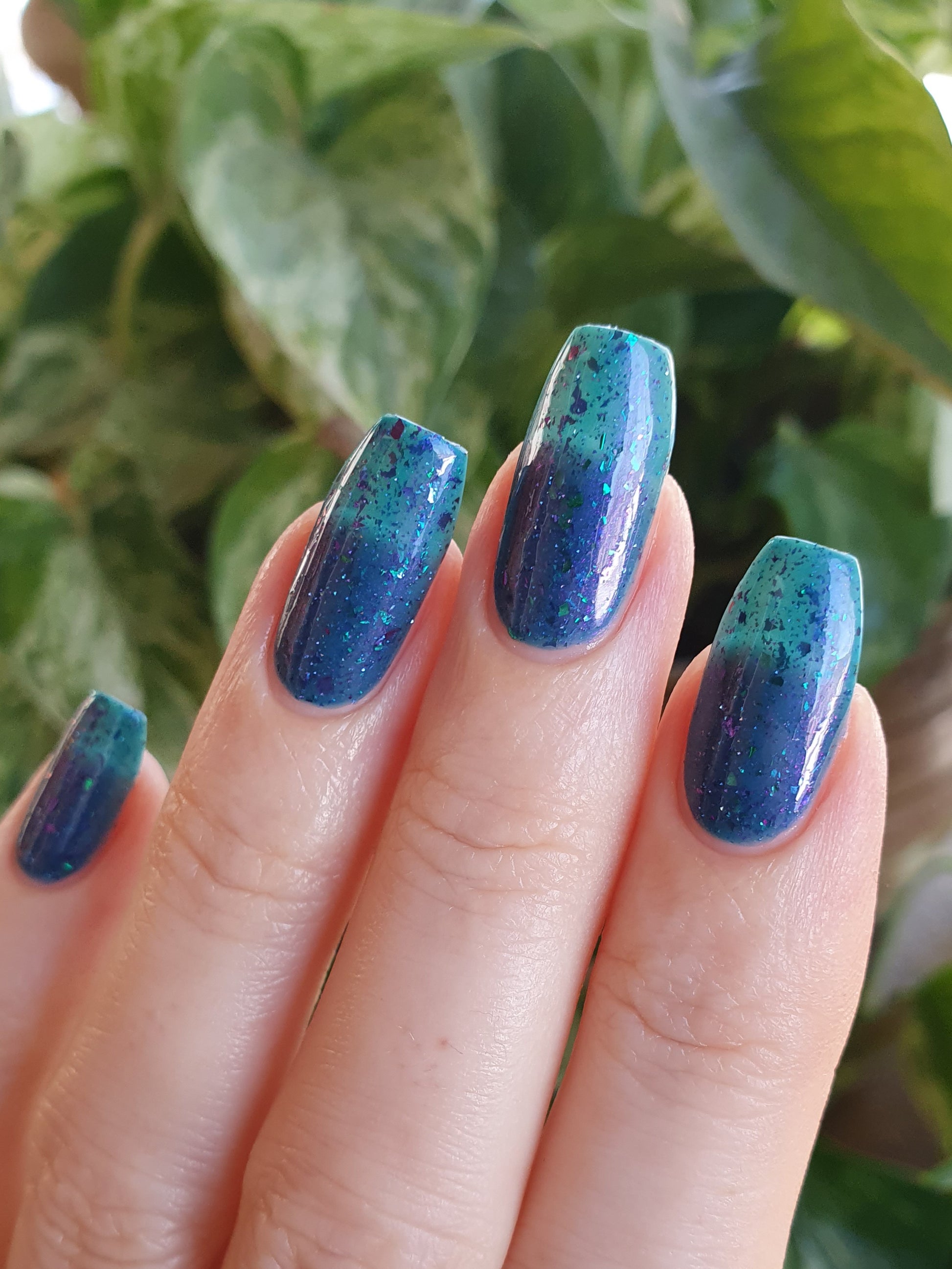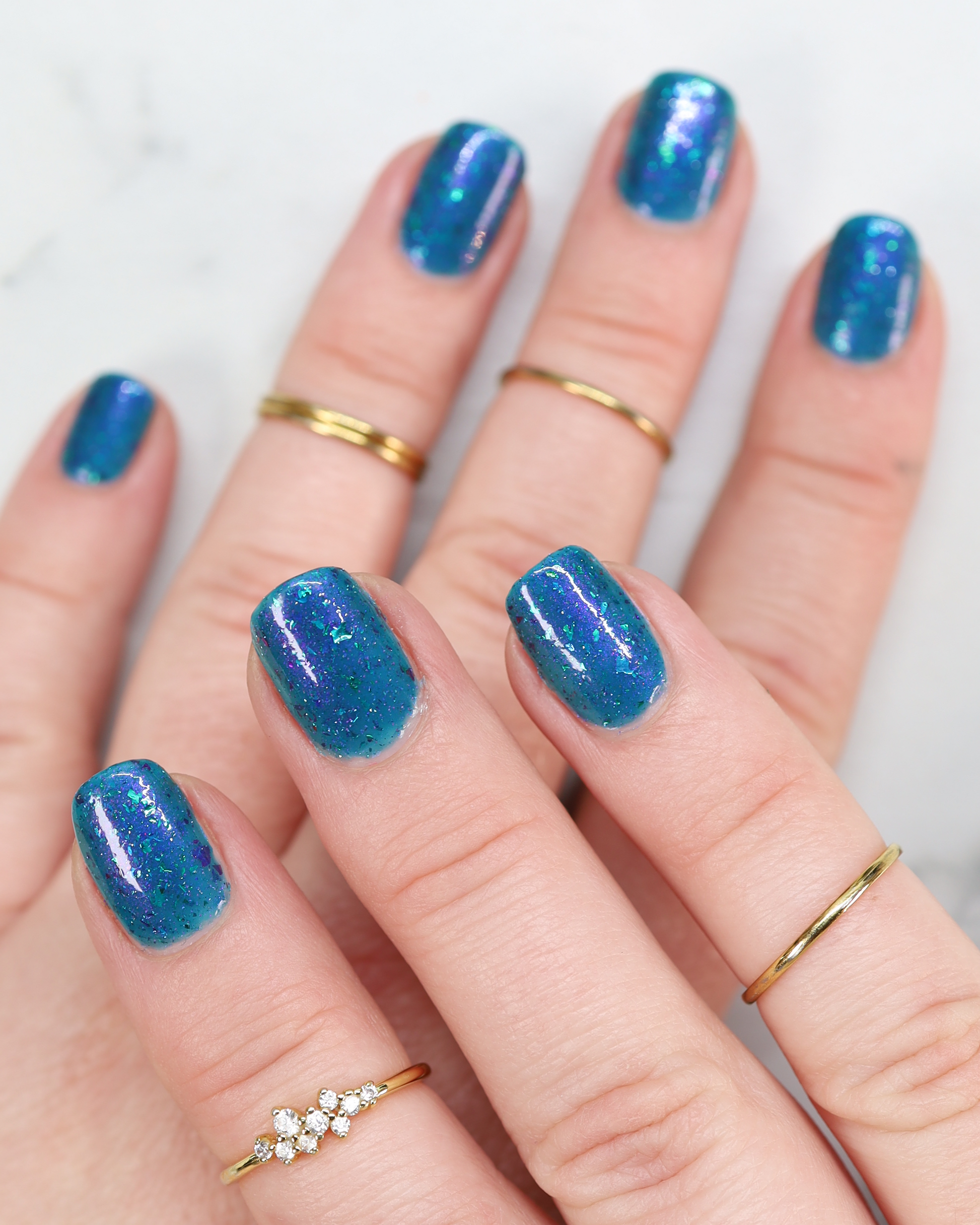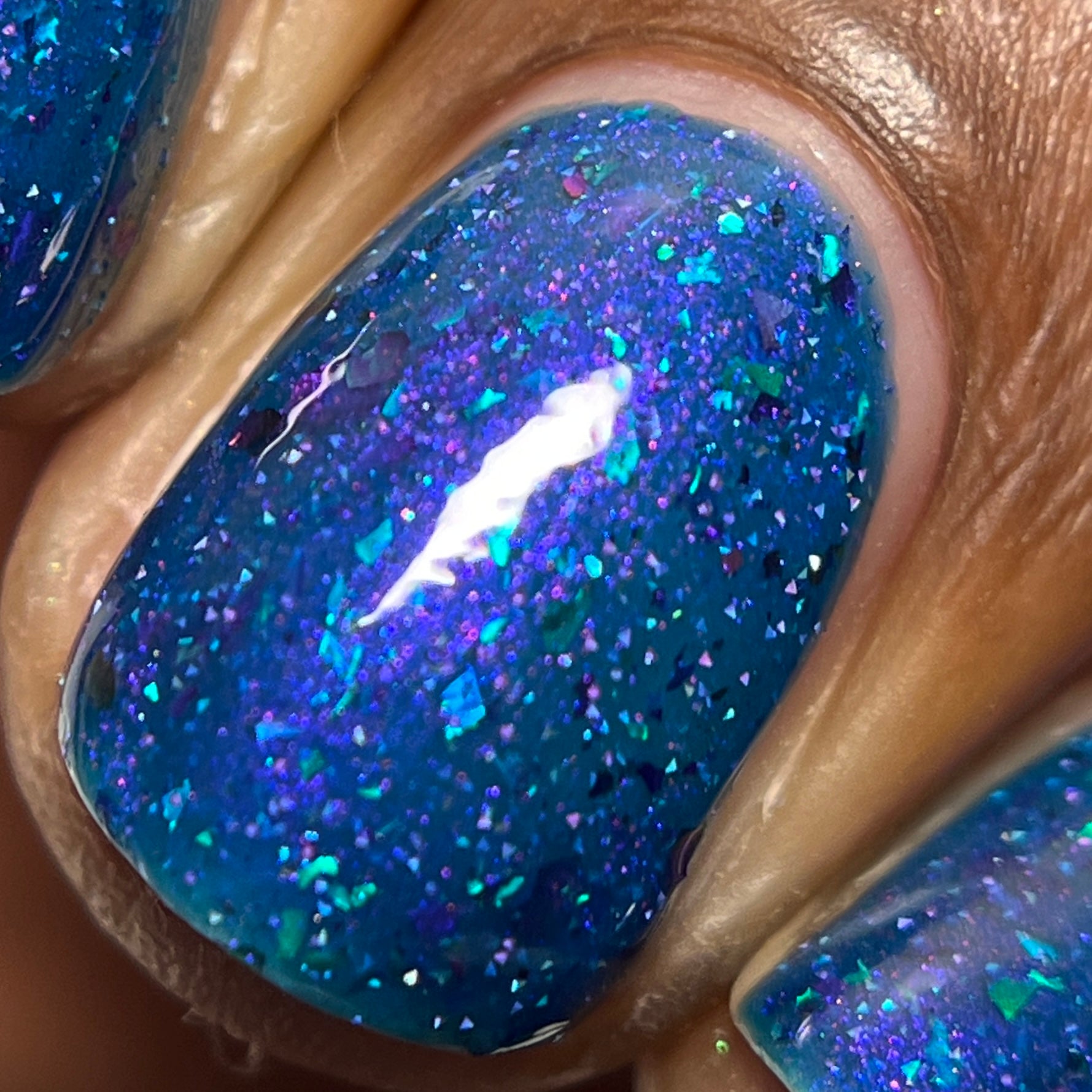 Stormicorn has as dark blue-green jelly base with purple and green metallic flakes, purple to red shimmer, and purple reflective glitter!